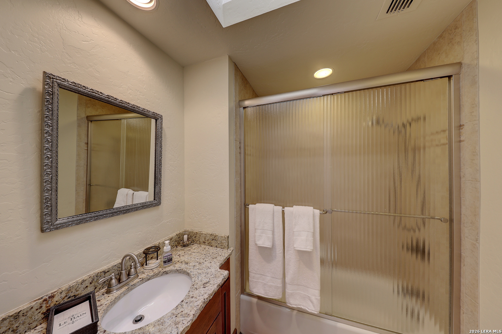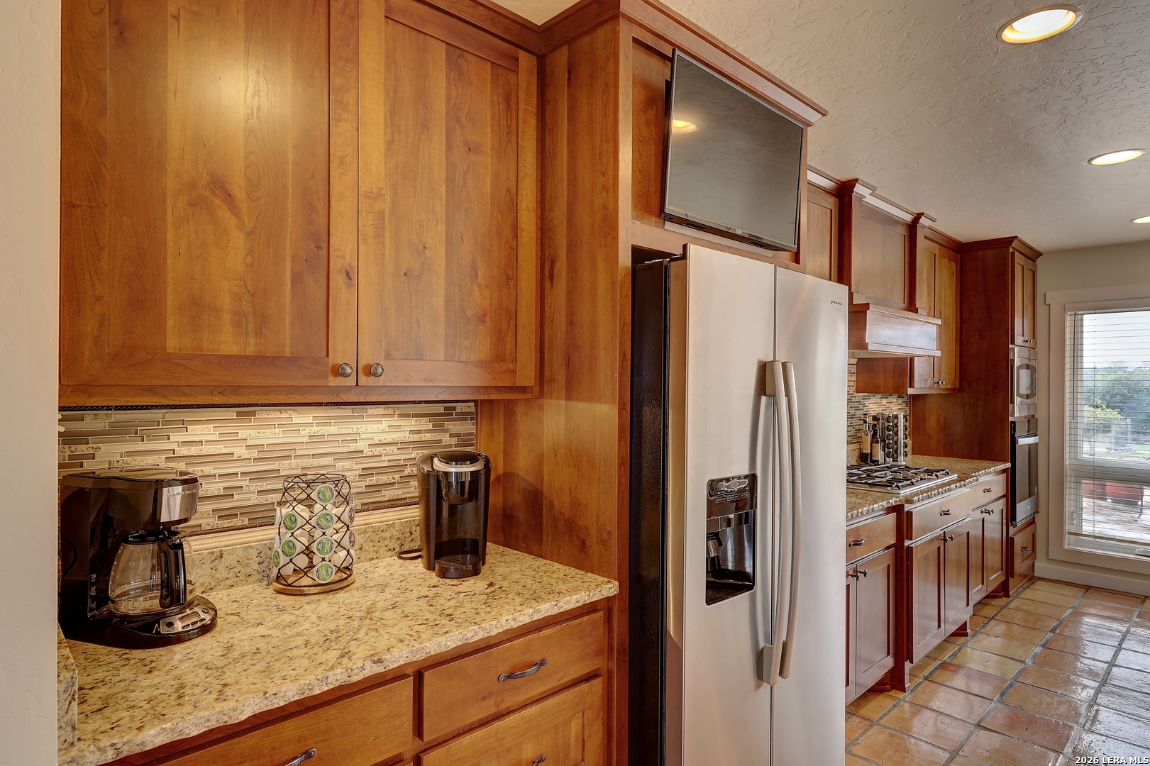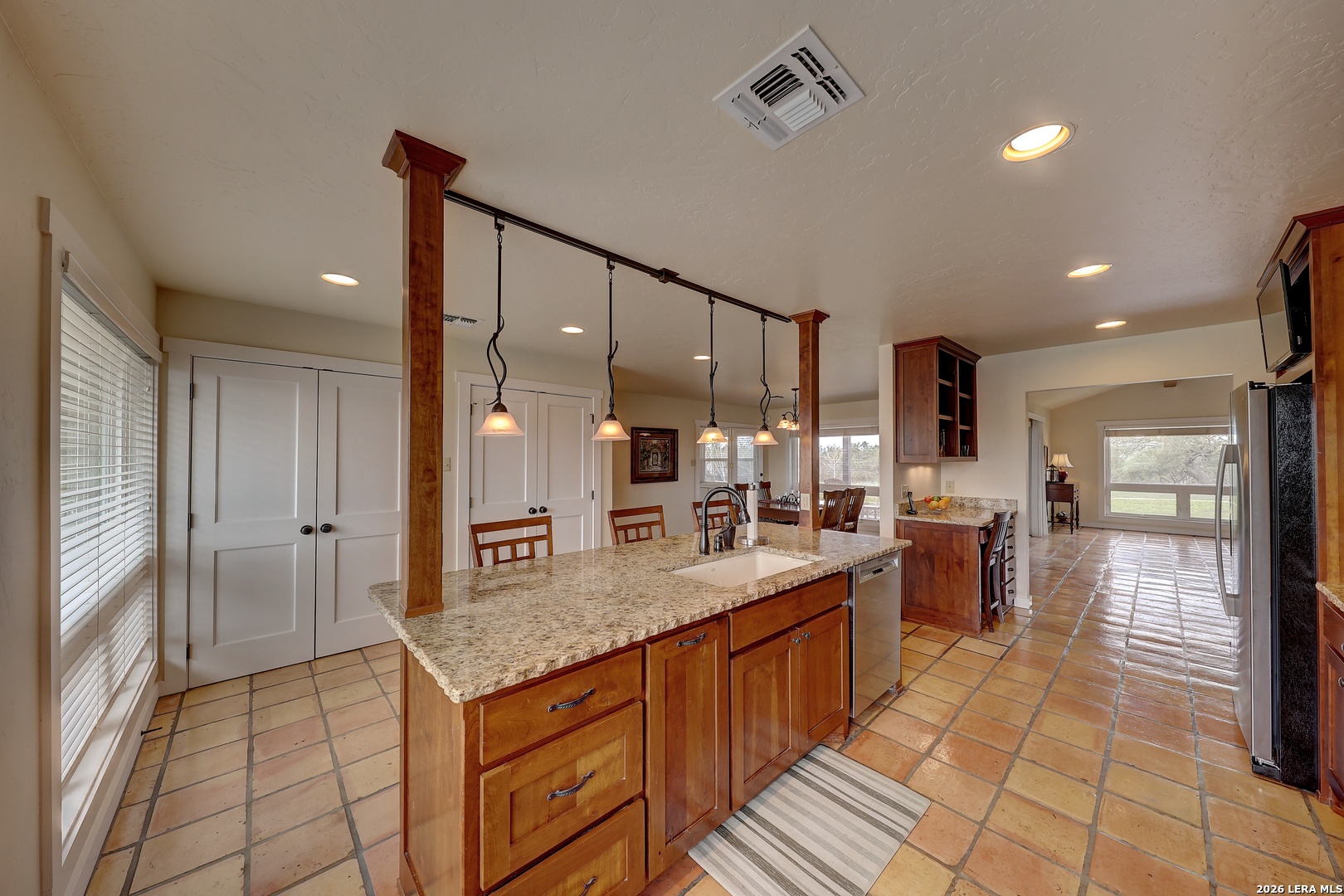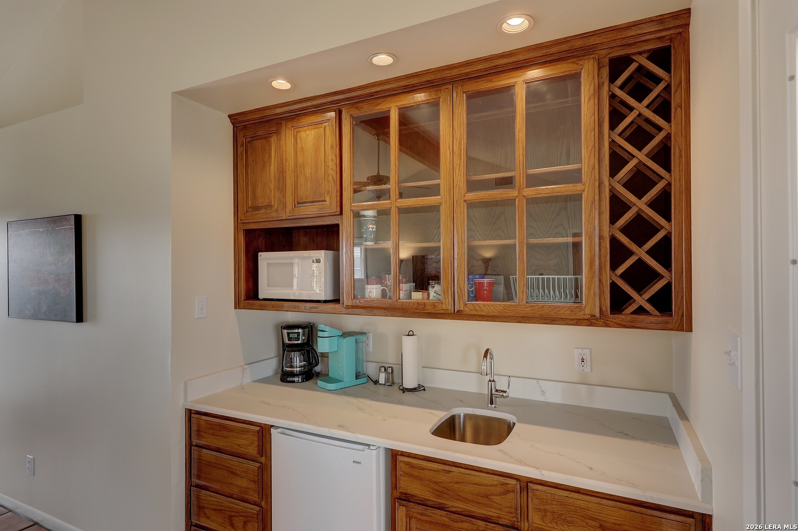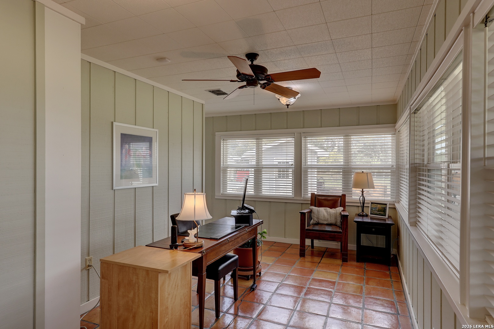 Beautifully updated and well maintained home and guest home on 12.31 acres in Tierra Linda Ranch. The park like setting features a 2425 sf, 3 bedroom, 2.5 bath home, with custom cabinetry, Saltillo tile floors, raw-edge granite countertops, picture windows, built-ins and a spacious, yet comfortable floor plan. The primary bedroom features direct exterior access near the hot tub, as well as a nicely updated ensuite with double vanity and walk in shower. The great room has lots of natural light, a wood burning fireplace and vaulted ceilings with wood beams. There's also an office/sunroom and a large covered back porch. The guest house is 846 sf, 2 bedrooms and 2 full baths, has a living room, kitchenette and private porch. Both homes have been freshly painted inside. The property has two water wells, one into the Trinity aquifer, and the other into the Edwards, which also has a functional windmill. The homes are within a couple acres of high fencing, with the remaining acreage having Ag exemption. Tierra Linda is a unique HOA community, with a swimming pool, airstrip, tennis courts, fishing lakes, trails and horseback riding.