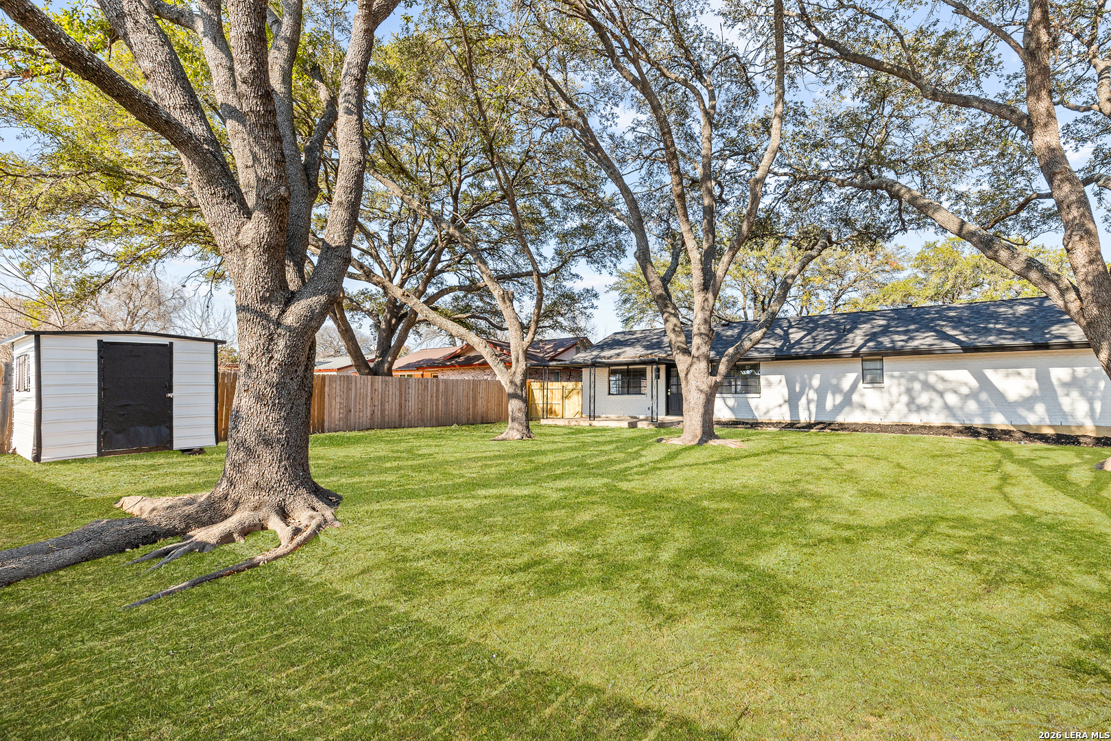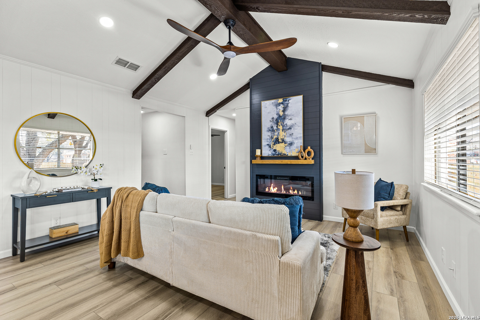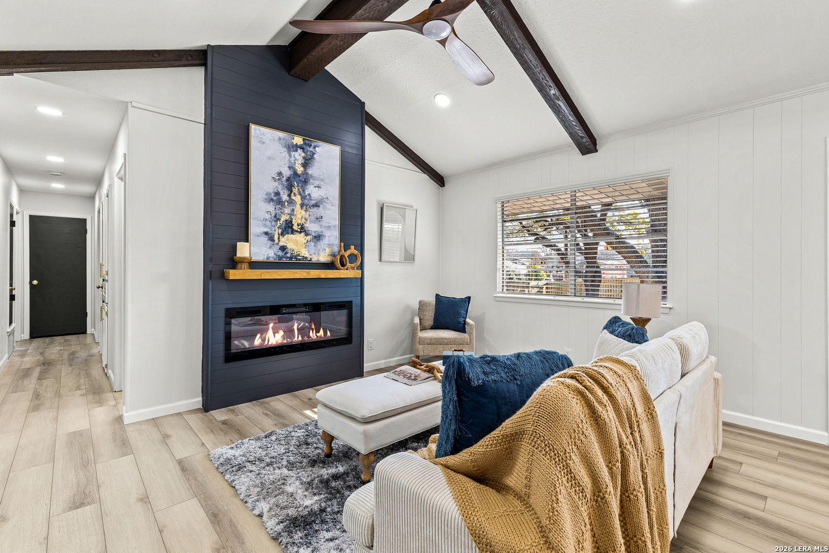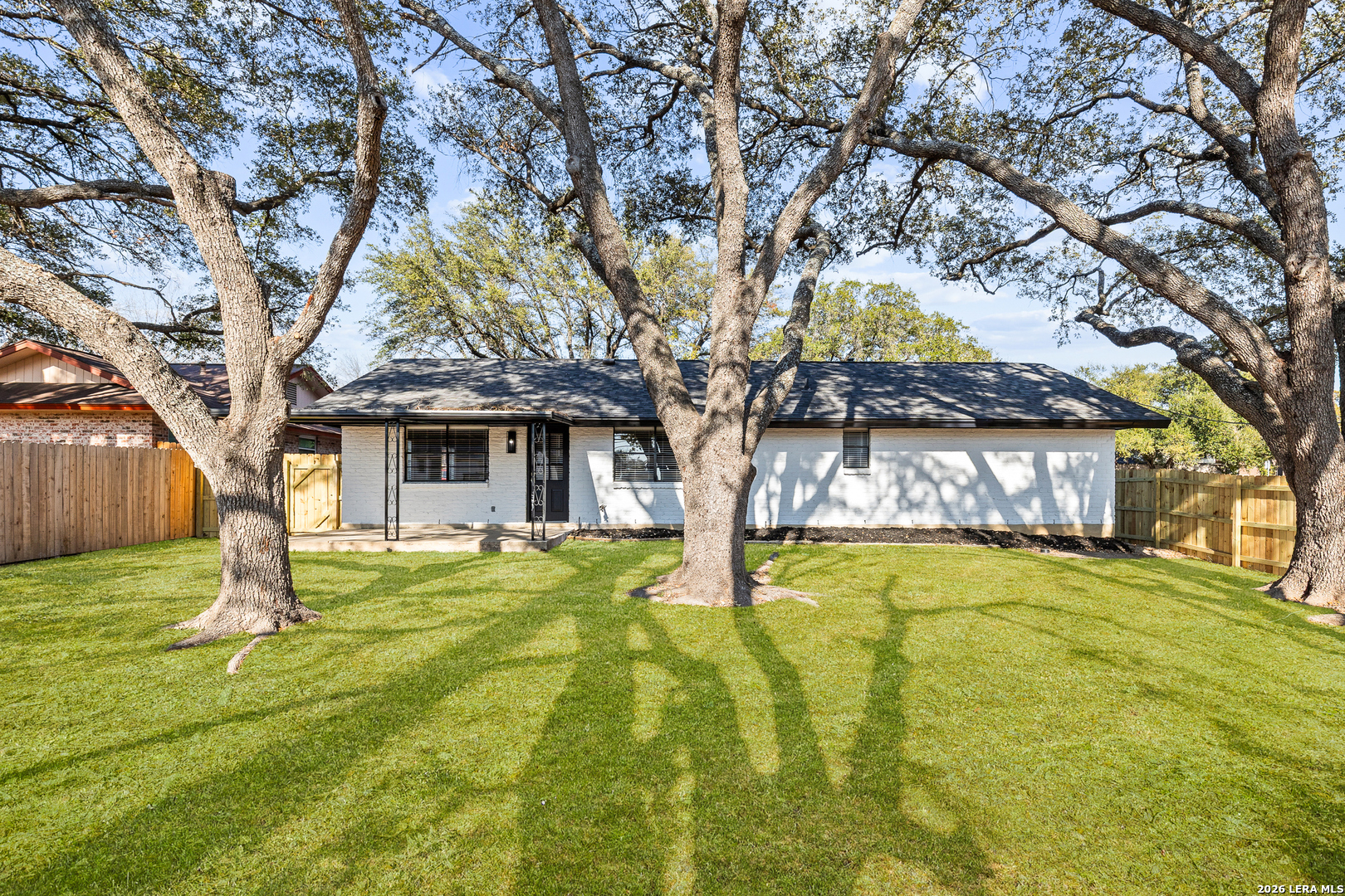 Welcome to 6526 Forest Grove a fully updated 4-bedroom, 2-bath home on a spacious corner lot in a convenient San Antonio location. From the moment you step inside, the open layout and vaulted ceilings with exposed wood beams make a statement. The living, dining, and kitchen areas flow seamlessly together, creating a bright, inviting space that feels both modern and comfortable. The dark accent fireplace wall adds character, while the updated flooring throughout ties everything together beautifully. The kitchen has been refreshed with clean white cabinetry, stylish backsplash, and updated finishes that complement the home's light, airy feel. Whether you're hosting friends or enjoying a quiet evening in, the open floor plan makes everyday living easy. Both bathrooms have been thoughtfully remodeled with contemporary touches. The walk-in shower with sleek tilework, gold fixtures, and built-in niche gives the primary bath a high-end feel. Every detail has been carefully selected to create a clean, modern look without losing warmth. Step outside to a large covered patio overlooking a generous backyard shaded by mature trees perfect for weekend barbecues, pets, or simply relaxing in the evenings. The corner lot provides extra space and added privacy, plus excellent curb appeal. Location is another highlight. You're just minutes from major highways for an easy commute, along with nearby schools, shopping, dining, and everyday conveniences. If you're looking for a move-in ready home with character, updates, and a great layout in a well-connected part of San Antonio, 6526 Forest Grove is one you won't want to miss.