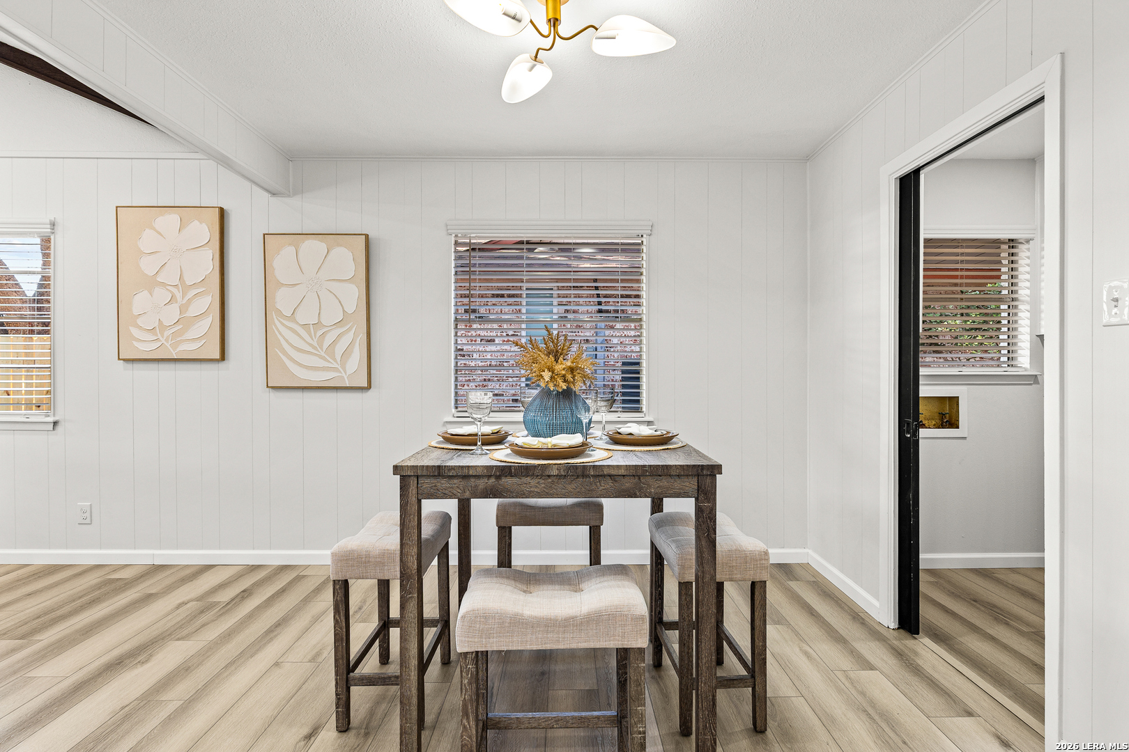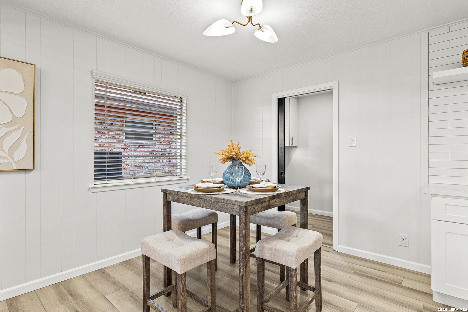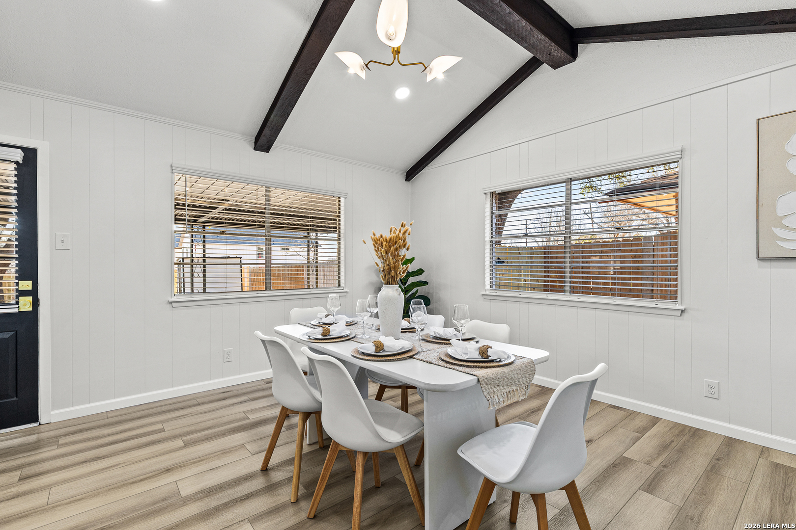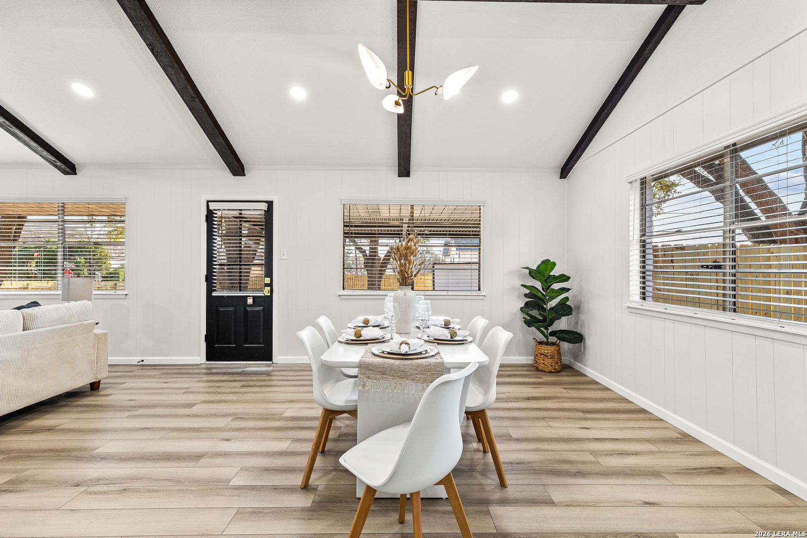 Welcome to 6526 Forest Grove a fully updated 4-bedroom, 2-bath home on a spacious corner lot in a convenient San Antonio location. From the moment you step inside, the open layout and vaulted ceilings with exposed wood beams make a statement. The living, dining, and kitchen areas flow seamlessly together, creating a bright, inviting space that feels both modern and comfortable. The dark accent fireplace wall adds character, while the updated flooring throughout ties everything together beautifully. The kitchen has been refreshed with clean white cabinetry, stylish backsplash, and updated finishes that complement the home's light, airy feel. Whether you're hosting friends or enjoying a quiet evening in, the open floor plan makes everyday living easy. Both bathrooms have been thoughtfully remodeled with contemporary touches. The walk-in shower with sleek tilework, gold fixtures, and built-in niche gives the primary bath a high-end feel. Every detail has been carefully selected to create a clean, modern look without losing warmth. Step outside to a large covered patio overlooking a generous backyard shaded by mature trees perfect for weekend barbecues, pets, or simply relaxing in the evenings. The corner lot provides extra space and added privacy, plus excellent curb appeal. Location is another highlight. You're just minutes from major highways for an easy commute, along with nearby schools, shopping, dining, and everyday conveniences. If you're looking for a move-in ready home with character, updates, and a great layout in a well-connected part of San Antonio, 6526 Forest Grove is one you won't want to miss.