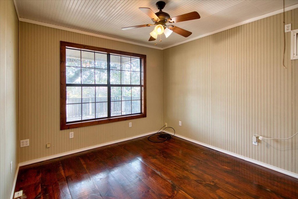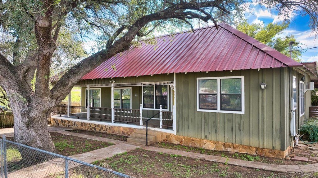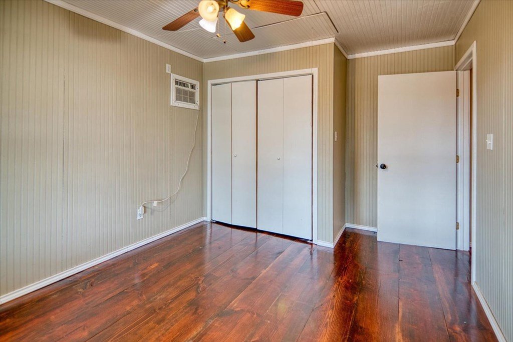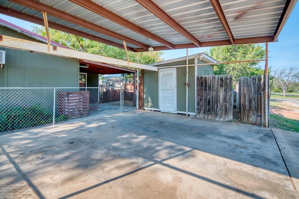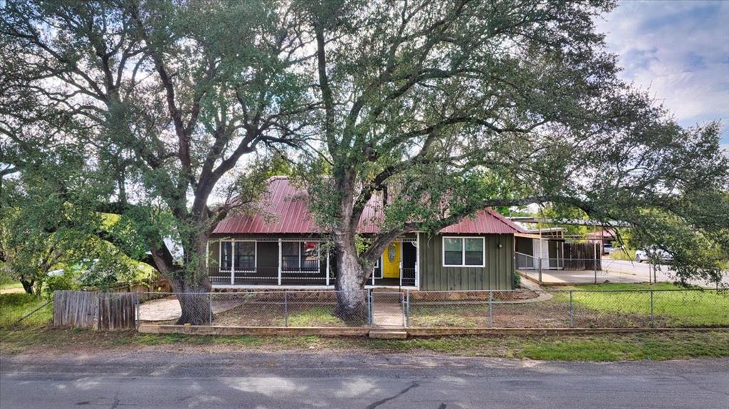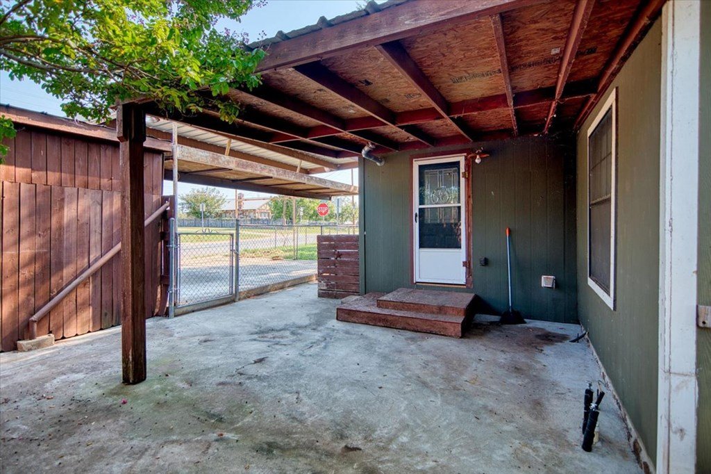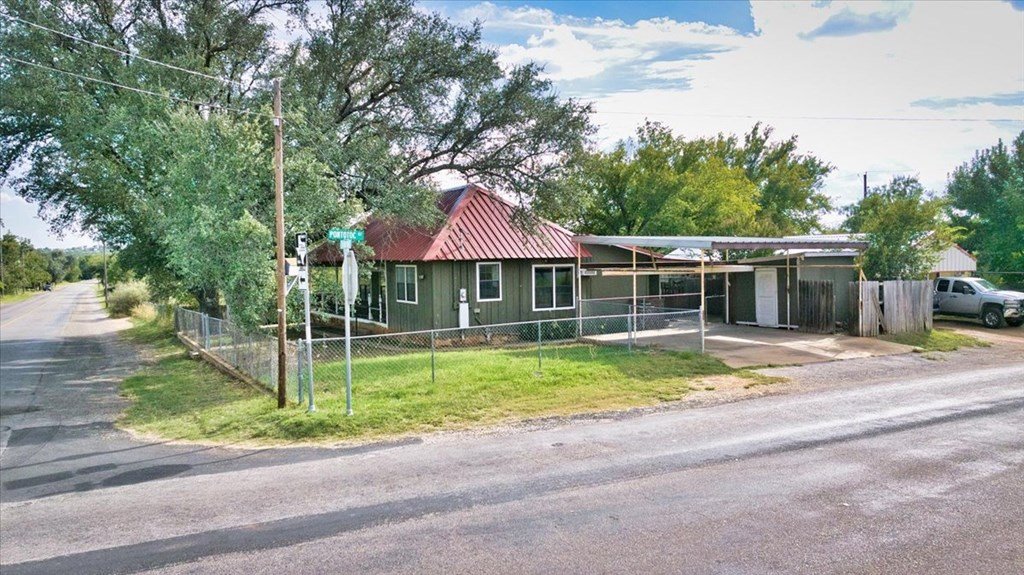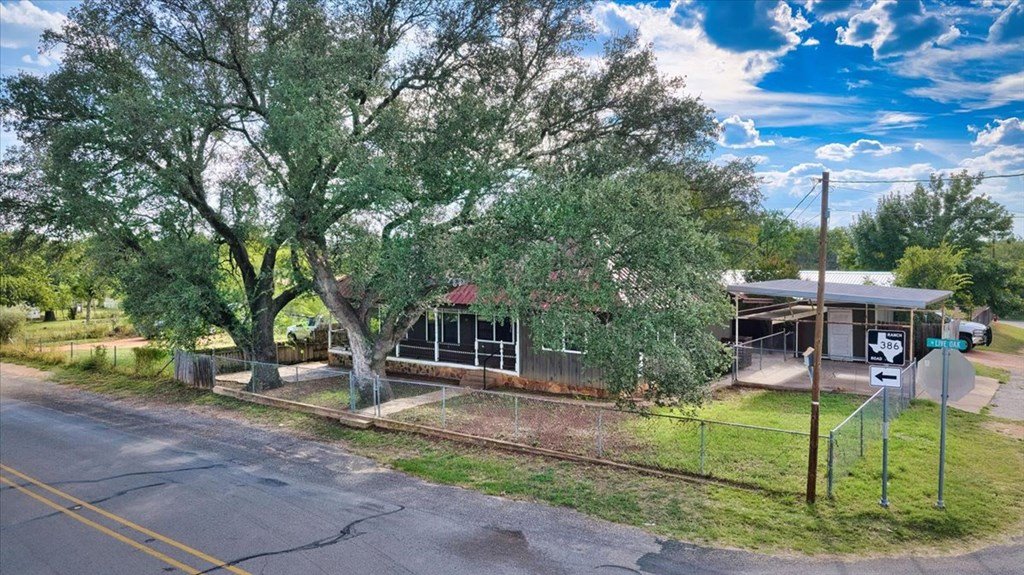 This charming 1940s residence features four bedrooms and 1.5 bathrooms. The kitchen is designed with ample cabinet space, built-in features, and a connection for a gas range, complemented by a bar area for additional seating. The front yard is adorned with two majestic live oak trees and a plum tree, along with a traditional front porch that adds to its curb appeal. Accessed from a side street, the property includes a spacious covered double carport with a paved driveway. Additional highlights of the home include a covered back patio, two storage buildings, multiple large closets, a privacy fence in the backyard, and chain link fencing in the front yard.