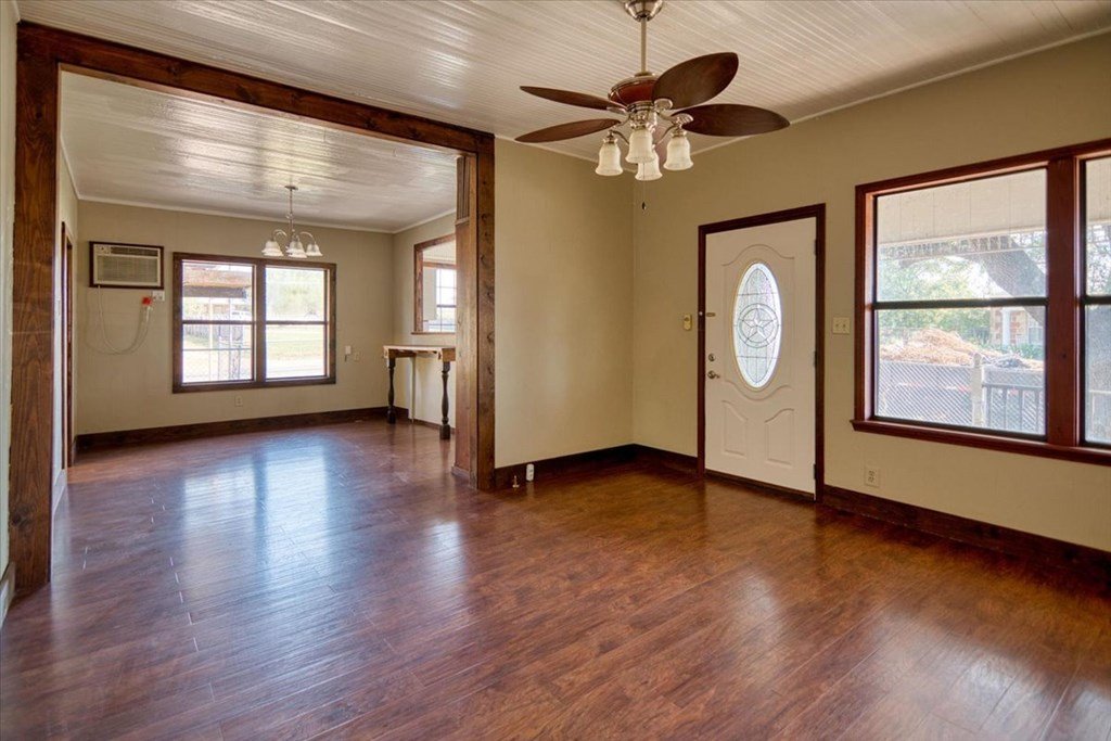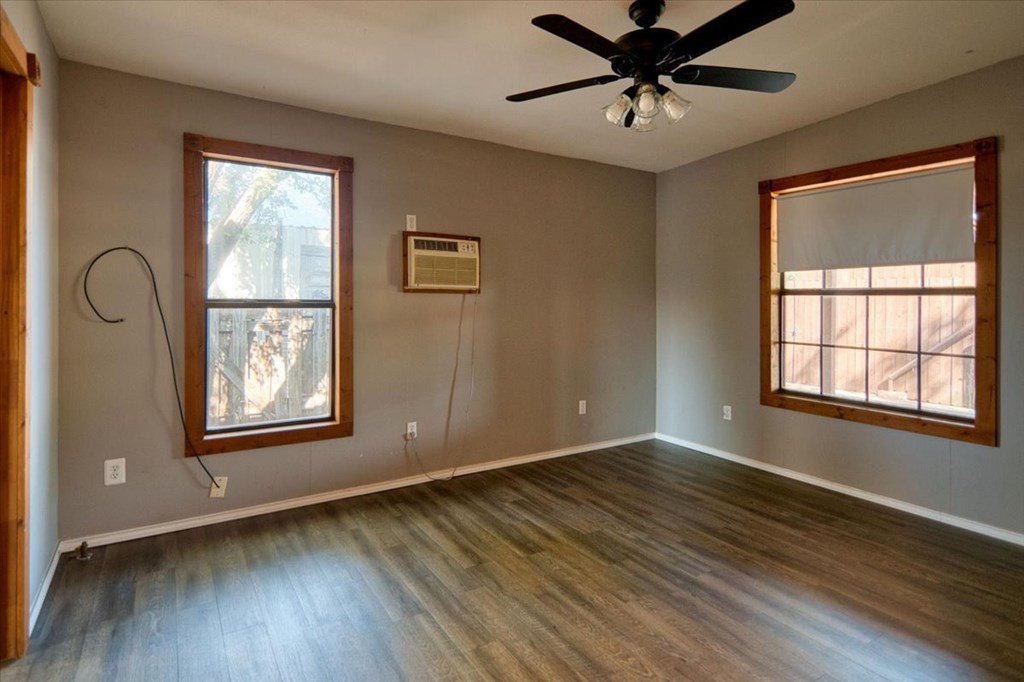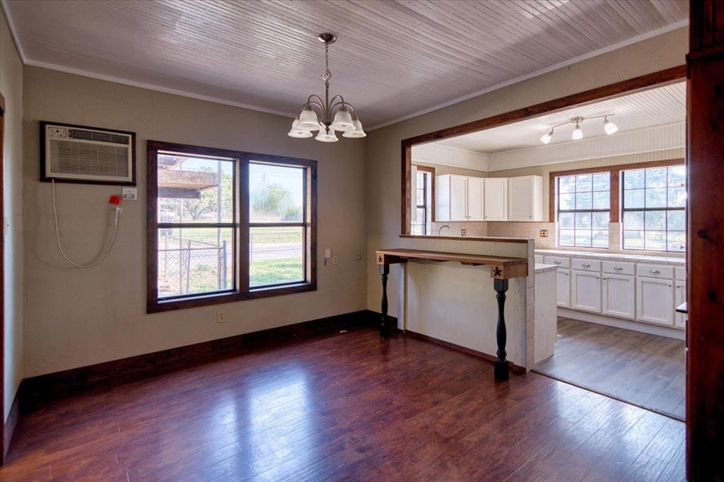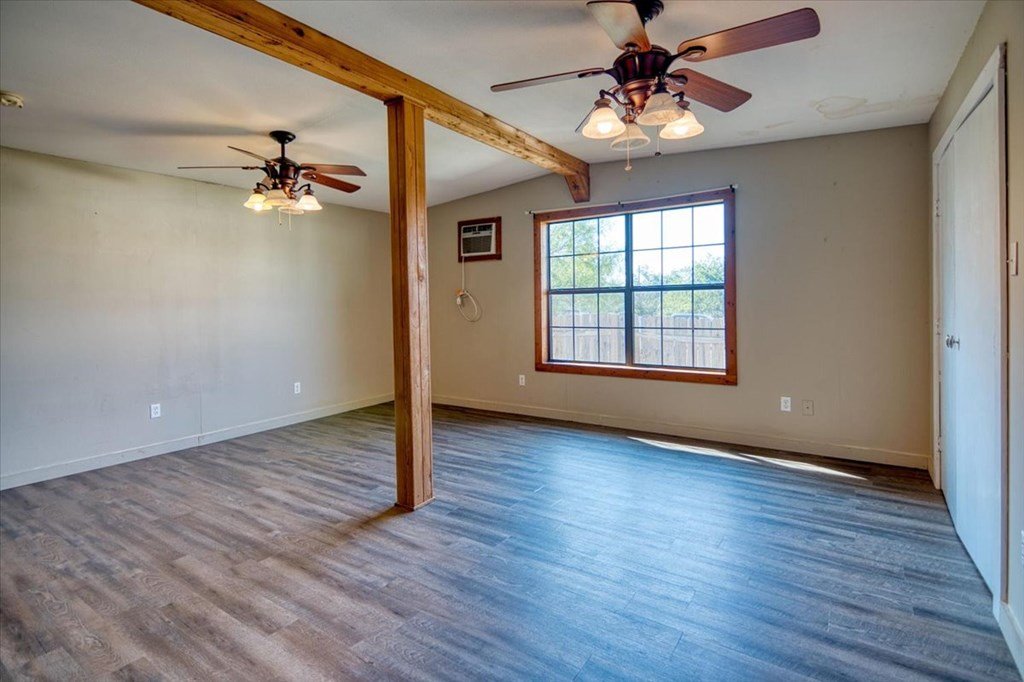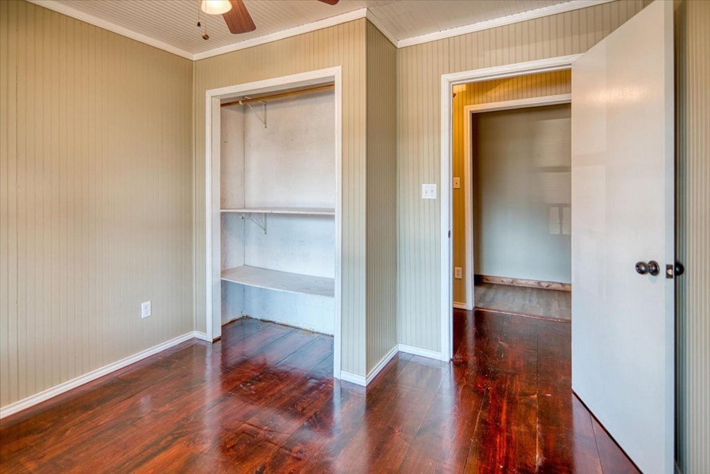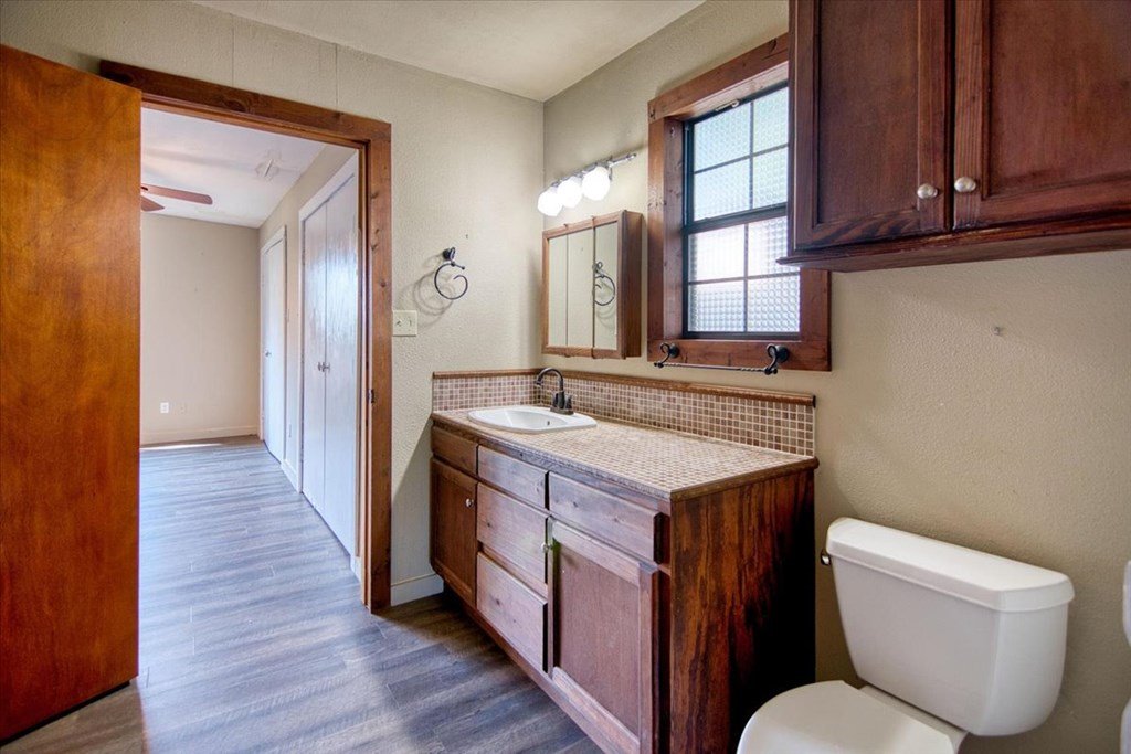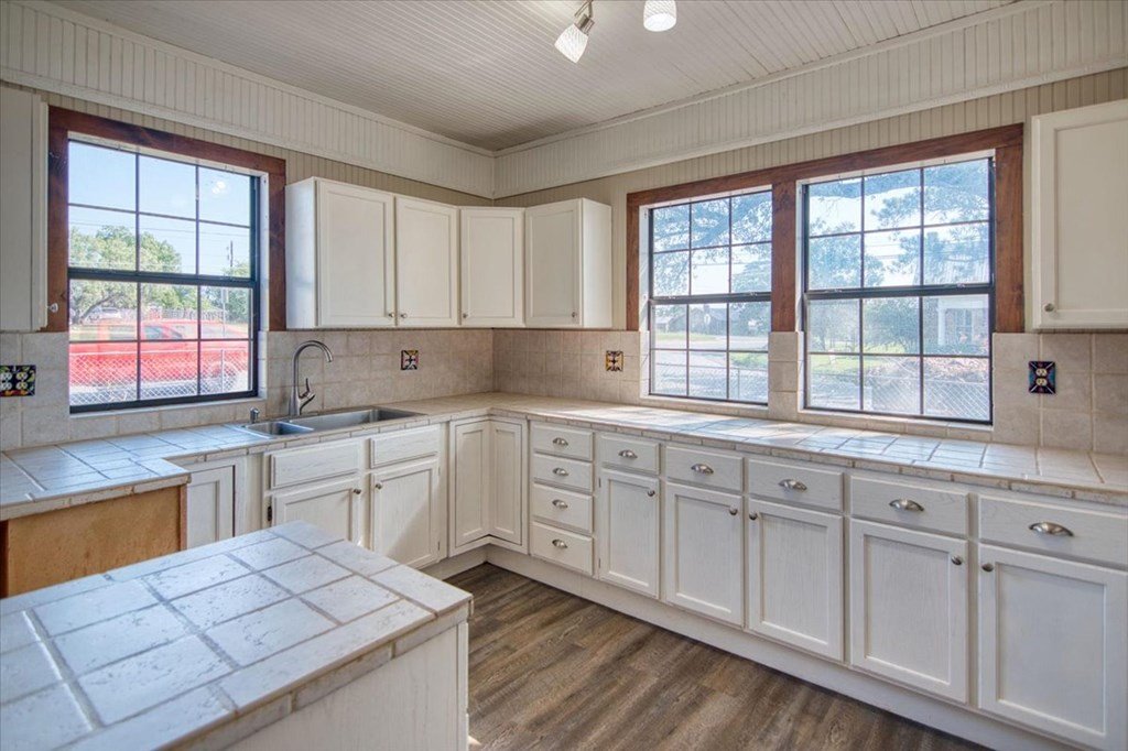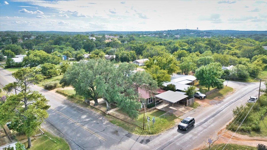 This charming 1940s residence features four bedrooms and 1.5 bathrooms. The kitchen is designed with ample cabinet space, built-in features, and a connection for a gas range, complemented by a bar area for additional seating. The front yard is adorned with two majestic live oak trees and a plum tree, along with a traditional front porch that adds to its curb appeal. Accessed from a side street, the property includes a spacious covered double carport with a paved driveway. Additional highlights of the home include a covered back patio, two storage buildings, multiple large closets, a privacy fence in the backyard, and chain link fencing in the front yard.