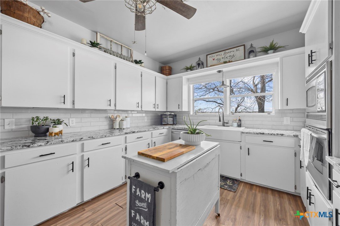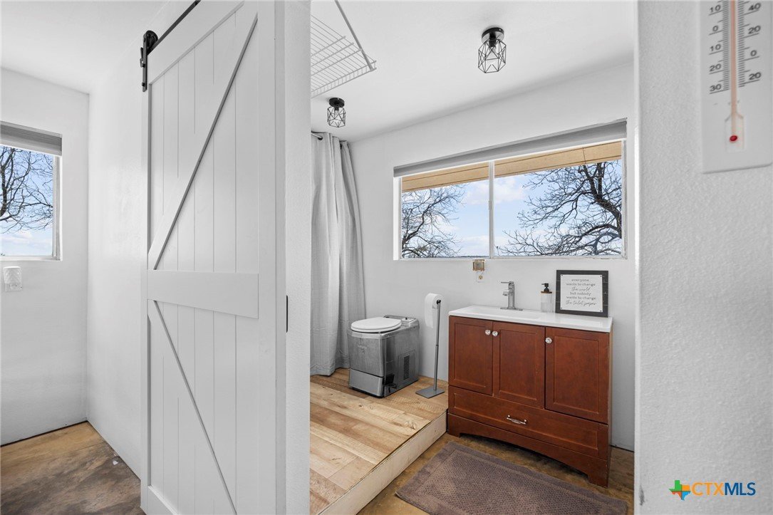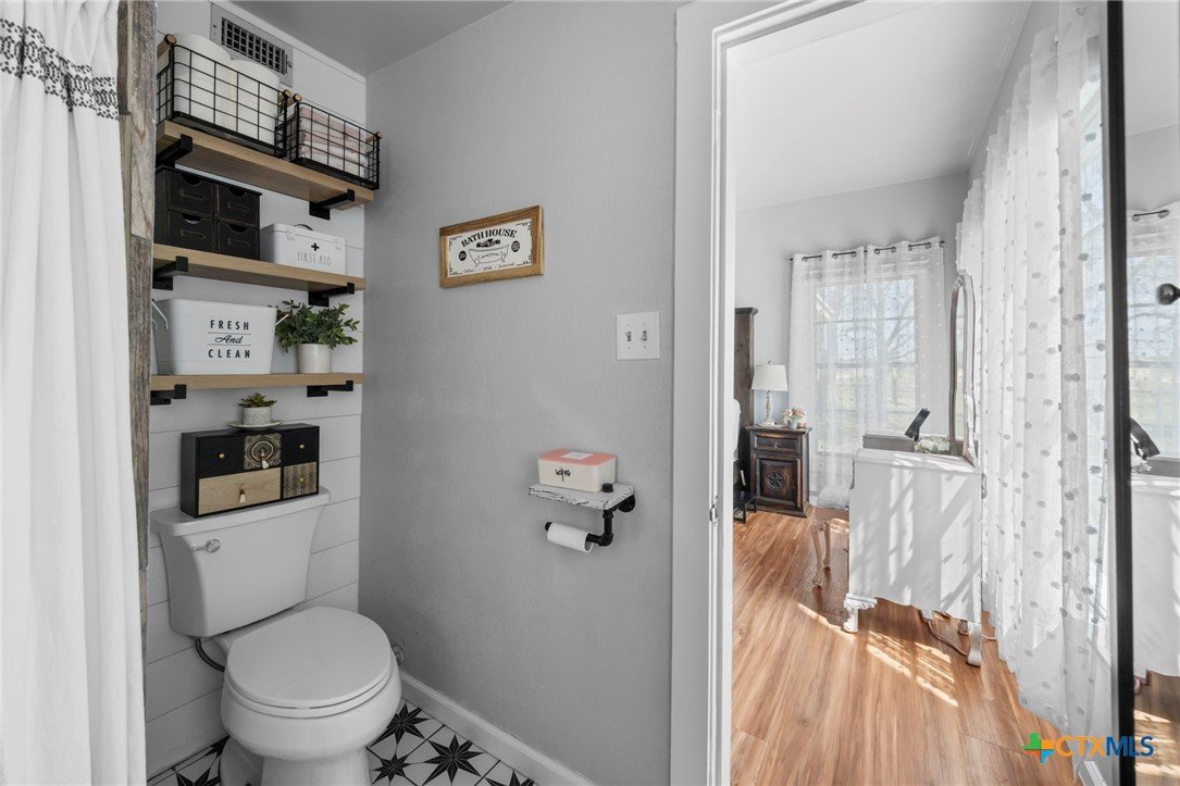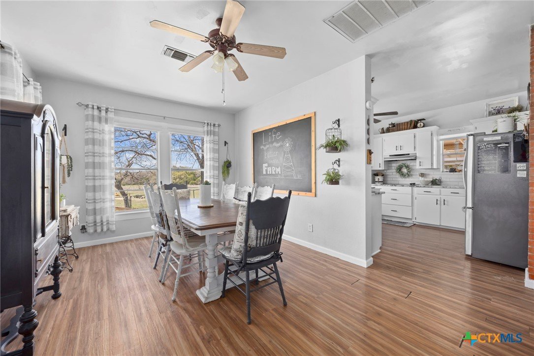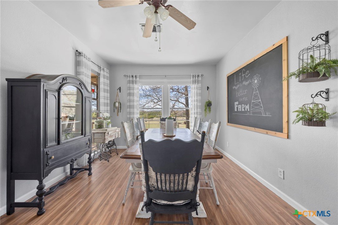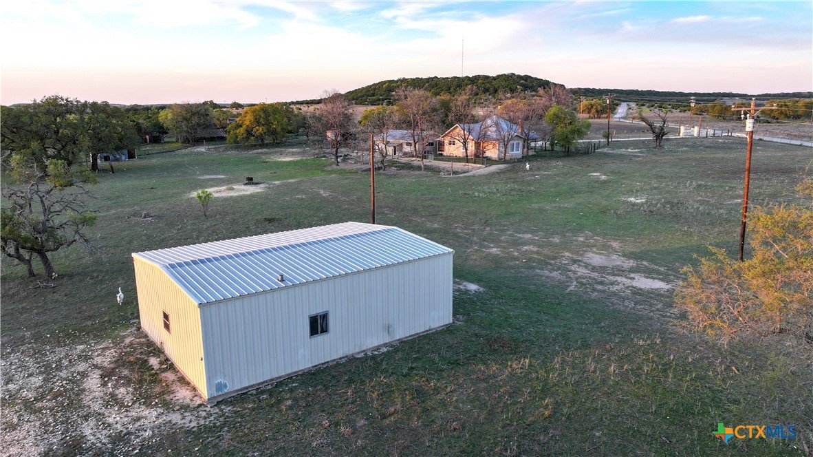 Magazine-worthy design meets refined country living—just minutes from town. Set on 7.95 picturesque acres, this beautifully restored early 1900s farmhouse delivers a rare blend of timeless character and elevated modern comfort. The 1,473 sq ft residence offers 2 bedrooms and 2 full bathrooms, thoughtfully designed with light-filled spaces and curated finishes throughout. The heart of the home features a sun-drenched kitchen, formal dining space, and an inviting living room—creating an ideal setting for both quiet evenings and effortless entertaining. A spacious laundry/mudroom adds convenience with style. Outdoors, the property transforms into a private retreat. Mature hardwood trees, sweeping pasture views, and breathtaking sunrises and sunsets define the landscape. Fully perimeter and cross-fenced, the acreage is turnkey for horses, livestock, or a refined hobby farm. Enhancing the property’s versatility is a 390 sq ft detached studio suite with a full bathroom—perfect for guests, short-term rental income, or a private office. Additional improvements include a large metal shop with bathroom, detached garage, barn, goat house, and chicken coop—blending luxury living with functional ranch amenities. Abundant wildlife, peaceful surroundings, and close proximity to Lampasas make this a rare opportunity to own a truly elevated Hill Country escape. List of upgrades upon request.