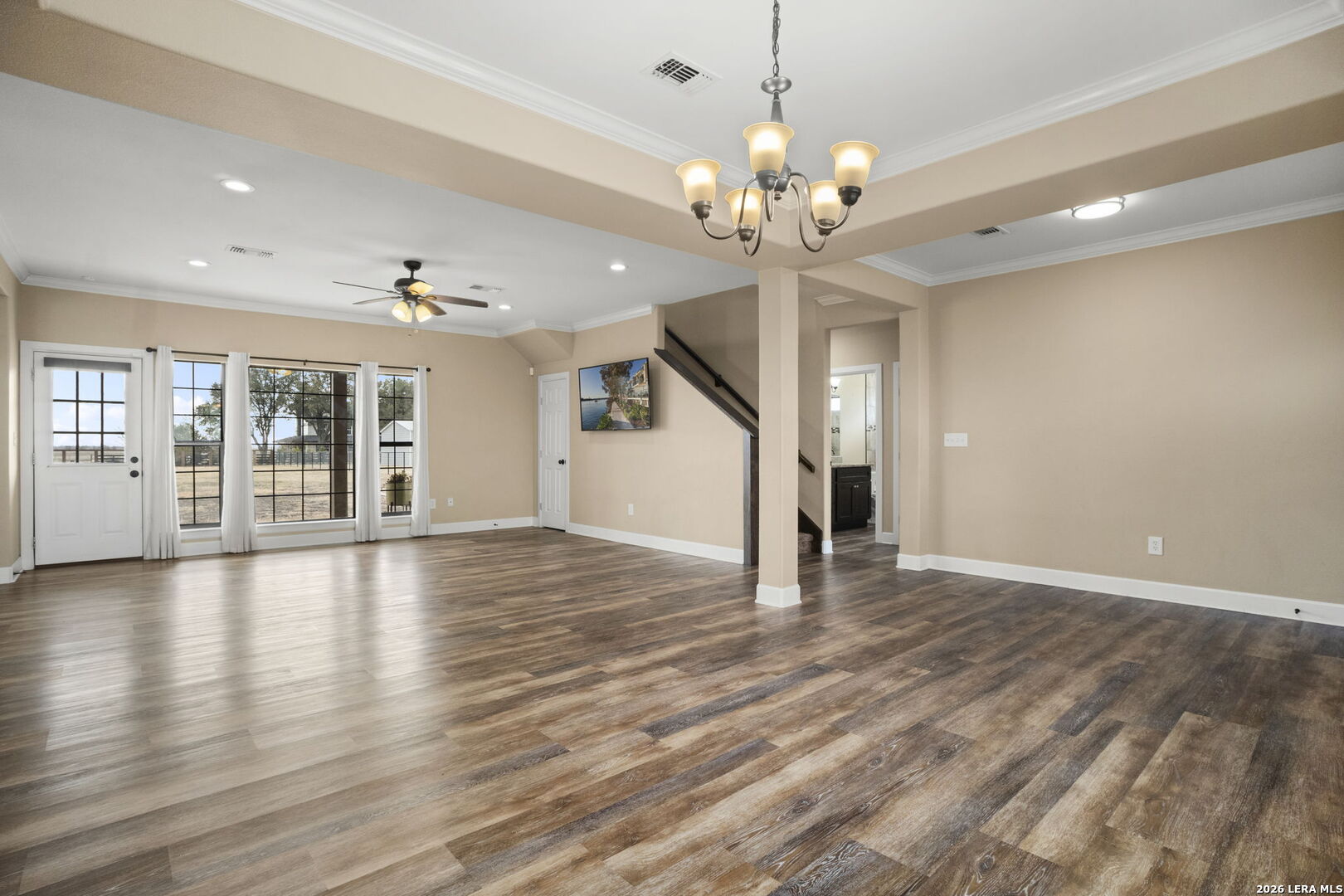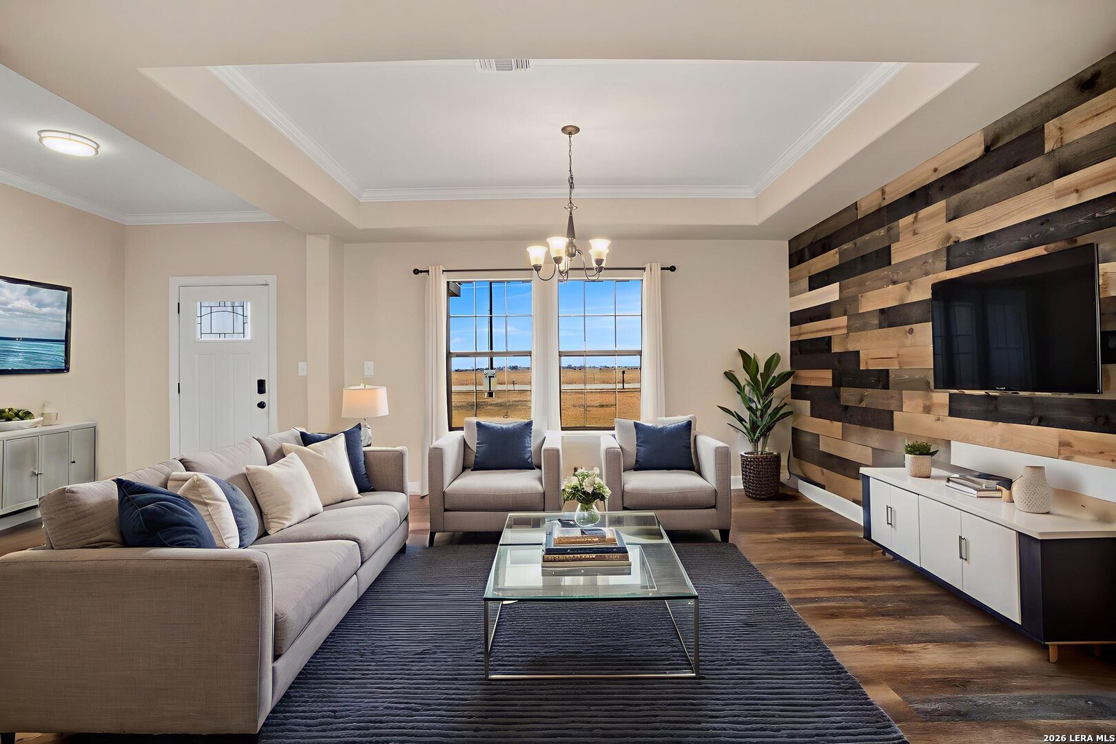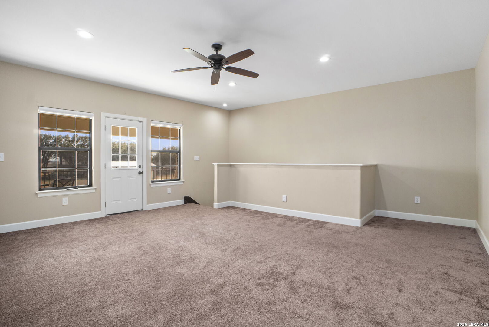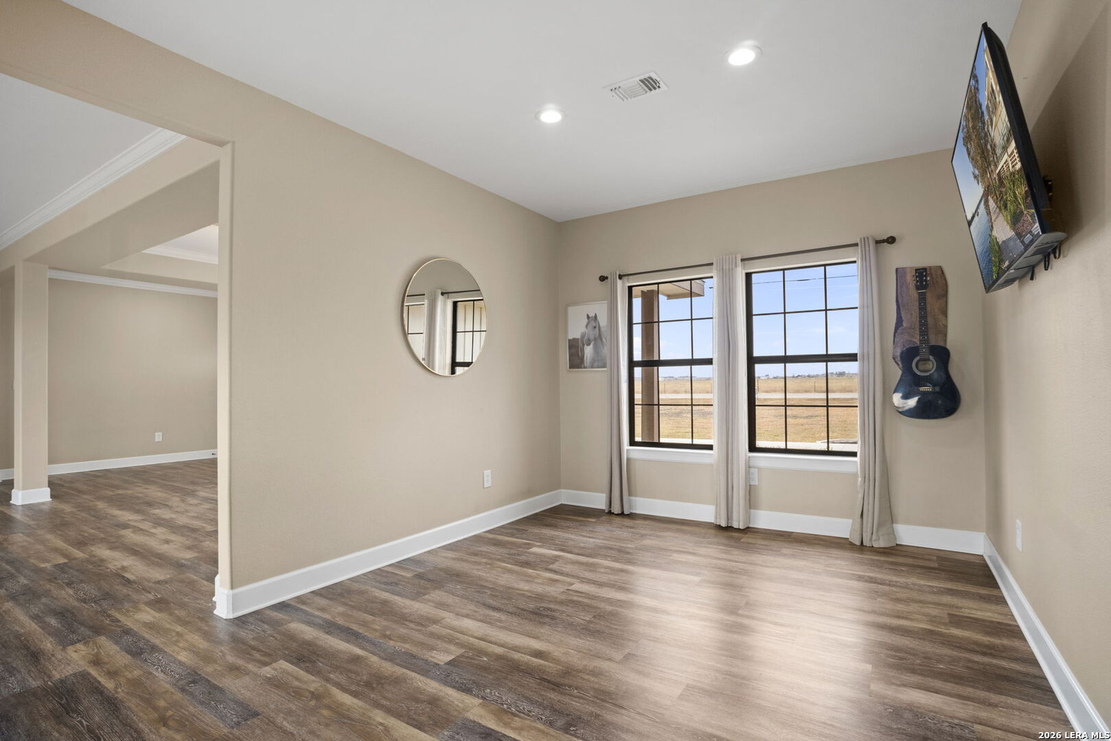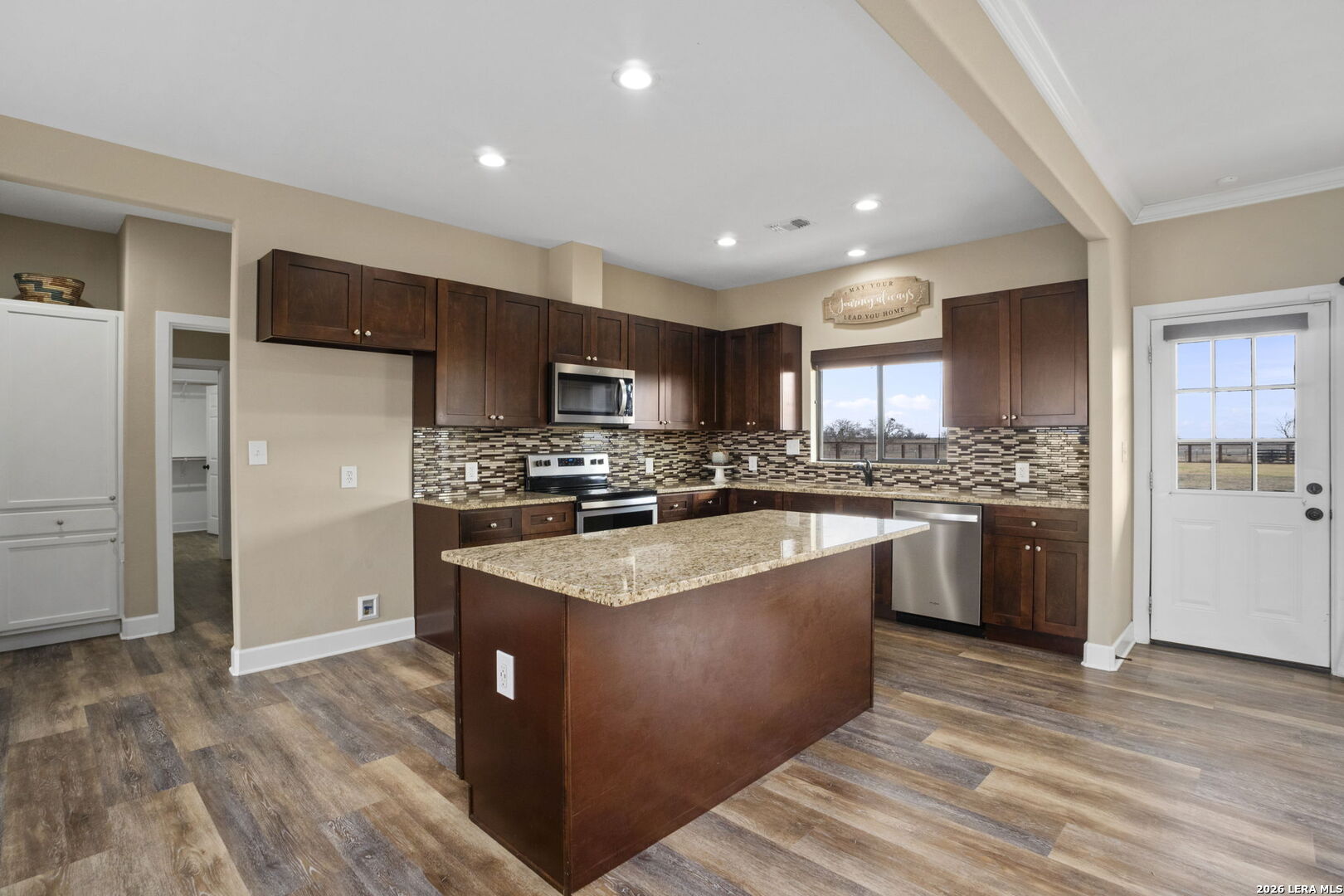 Country living at its finest! Situated on .79 acres backing to a peaceful greenbelt, this charming farmhouse-style home offers wide open spaces and room to breathe. Featuring 4 bedrooms and 2 bathrooms, the open-concept floorplan is perfect for everyday living and entertaining, with luxury vinyl flooring throughout the main level and a spacious living area that flows seamlessly into the kitchen complete with granite countertops and custom cabinetry. The main level offers 3 bedrooms, including a private primary suite with a walk-in shower and generous walk-in closets. Upstairs, the flexible space can serve as an additional bedroom, game room, or playroom and features an open balcony overlooking the beautiful countryside. Step outside to enjoy a fully fenced backyard with a fire pit and raised garden beds ready for planting - ideal for relaxing evenings or weekend gatherings. Conveniently located within the highly sought-after Navarro ISD, this property blends country charm with everyday comfort.