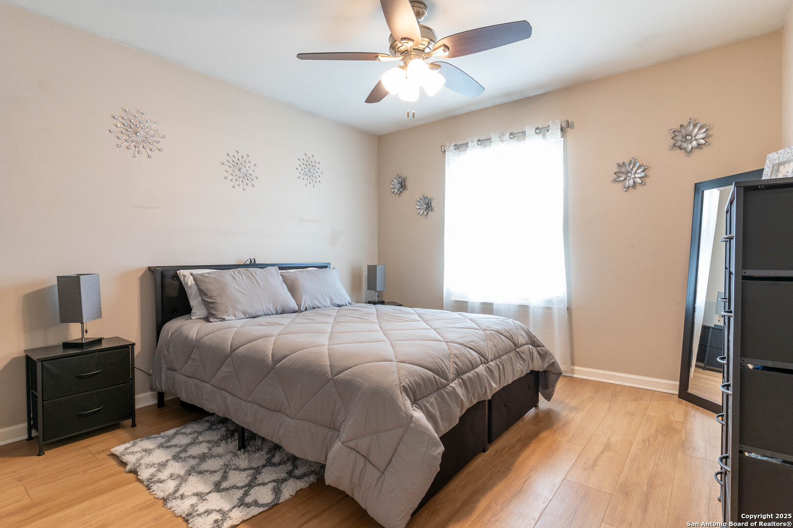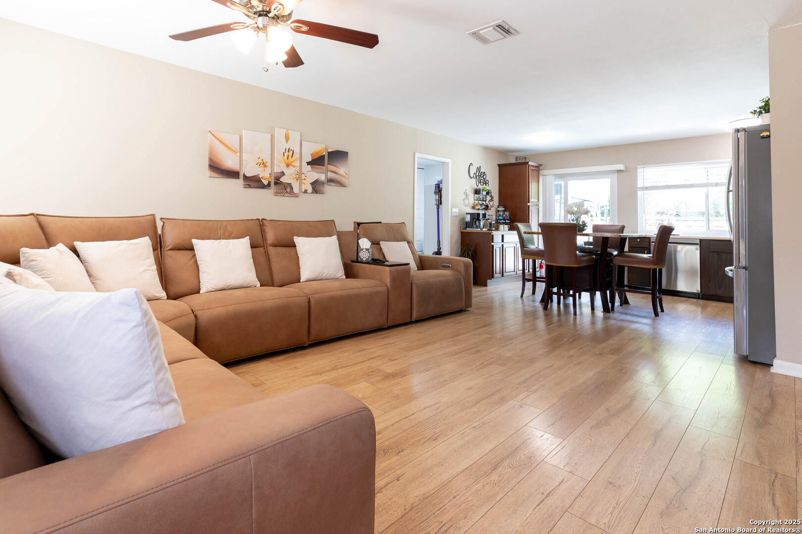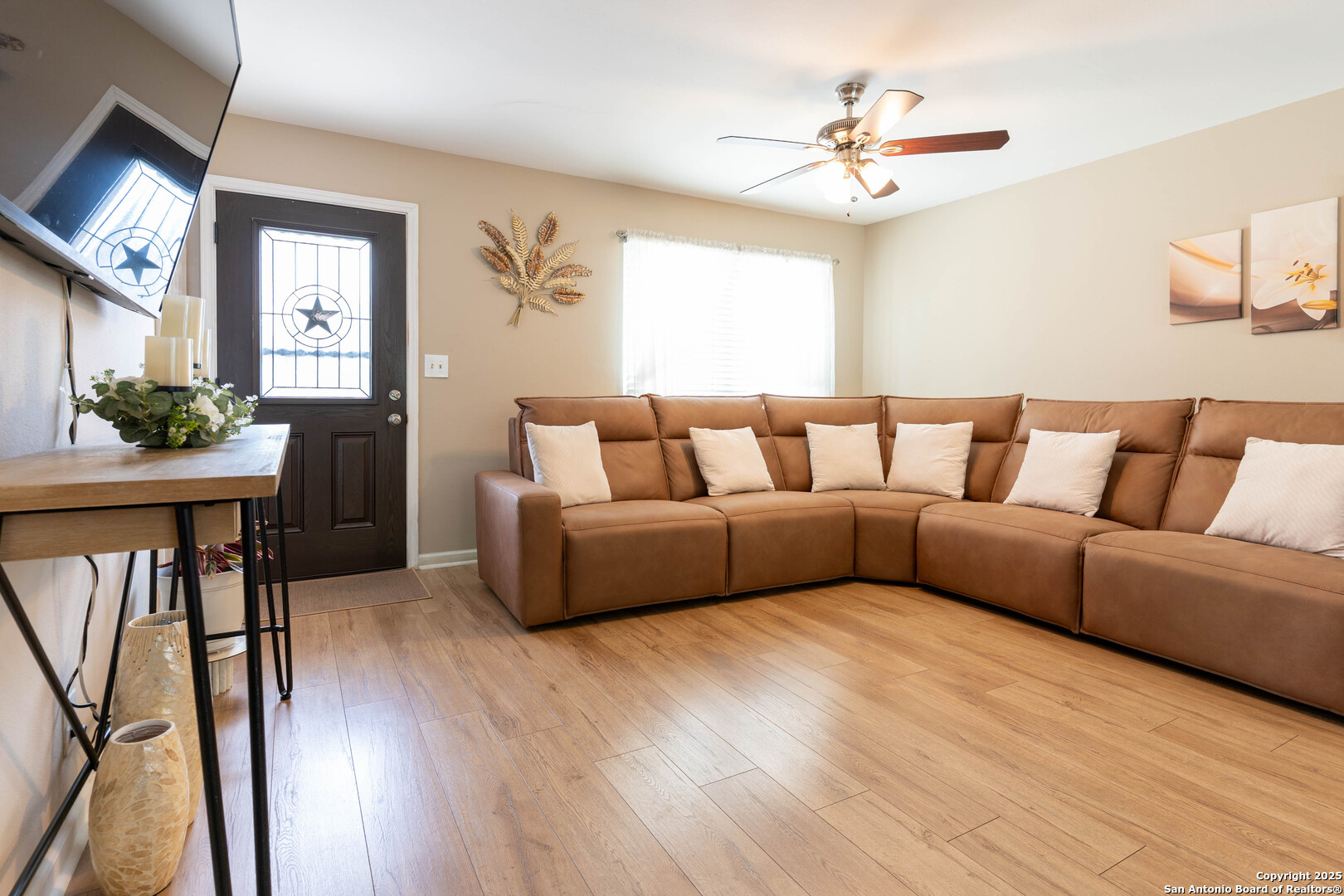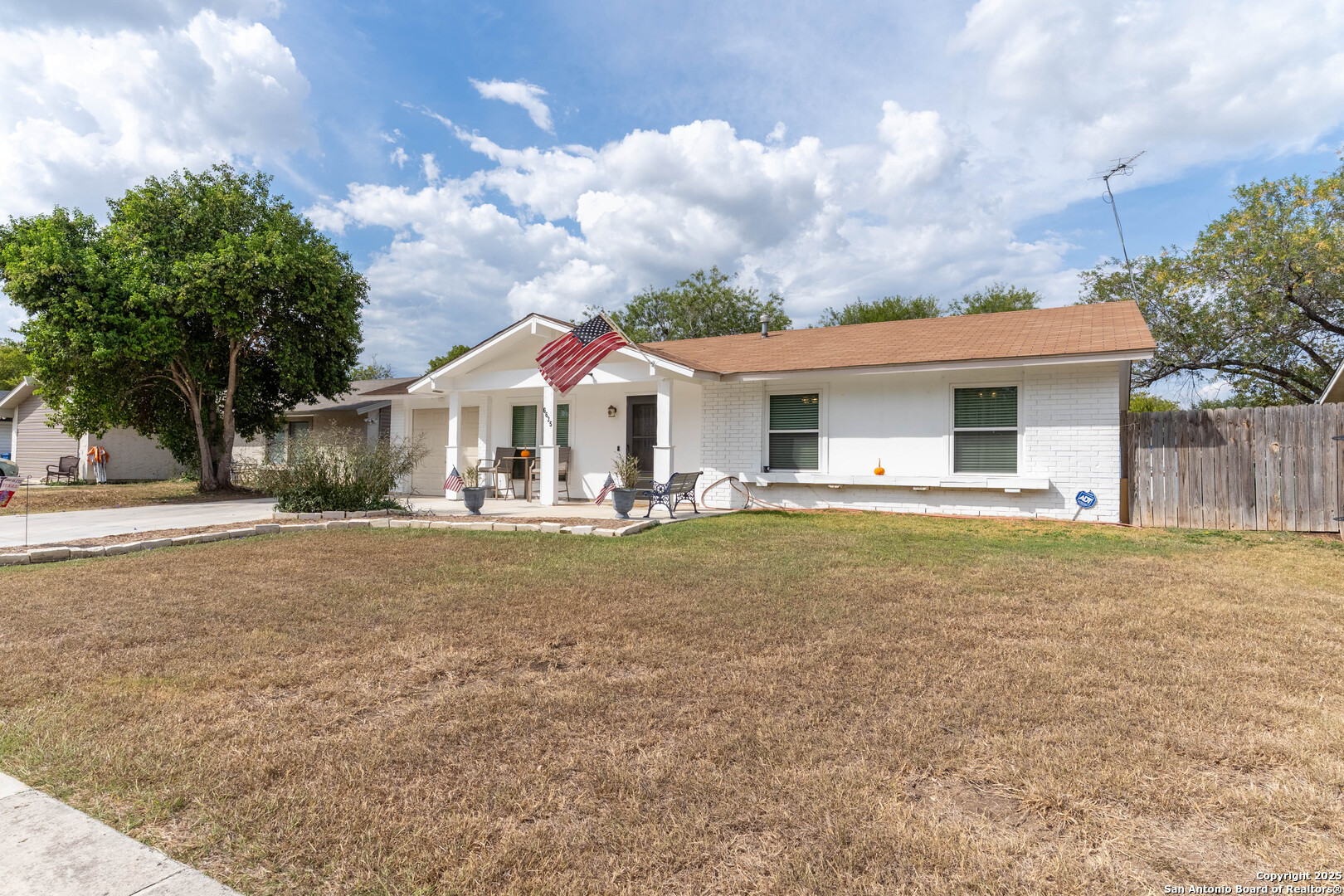 STUNNING SINGLE STORY!! Beautifully maintained single-story ranch offering comfort, efficiency, and style! This move-in ready home features all new vinyl windows (2021) and a 14 SEER HVAC (2022) for peace of mind and energy savings. The open floor plan showcases laminate flooring throughout (no carpet), LED lighting, and ceiling fans in every room. The kitchen impresses with gas cooking, pot filler, abundant cabinetry, and a stainless-steel appliance package including refrigerator. Enjoy a spacious family room with flat-screen TV, oversized utility room with washer and dryer, and amply sized secondary bedrooms-one with a walk-in shower. Outside, entertain on the expanded patio, benefit from an extended driveway, and relax behind a privacy fence with oversized gates and storage shed. Additional highlights include dusk-to-dawn exterior lighting, covered entry, and a programmable thermostat. This home perfectly blends thoughtful updates and easy living! See this one TODAY!!