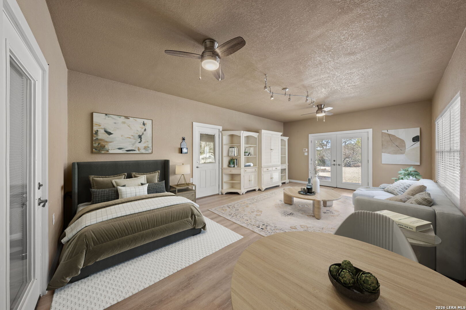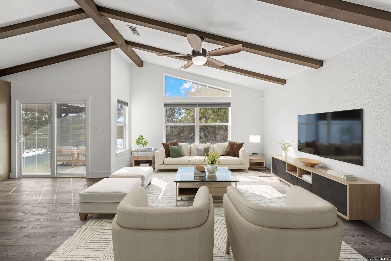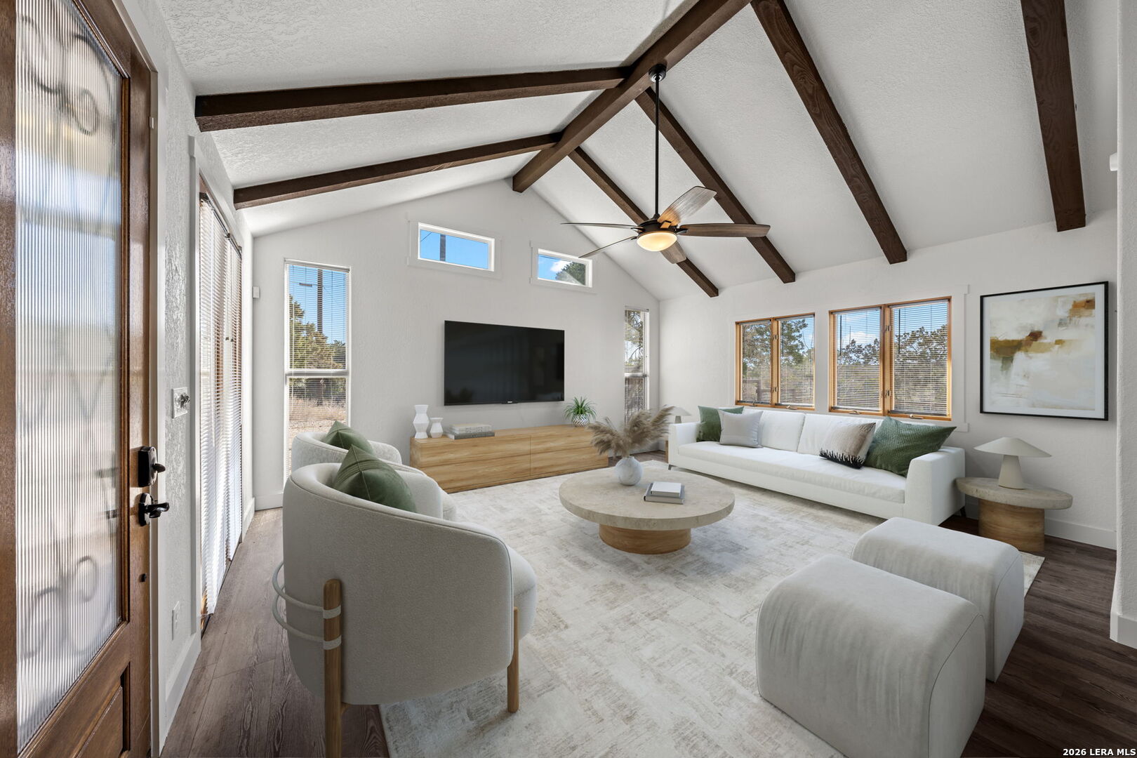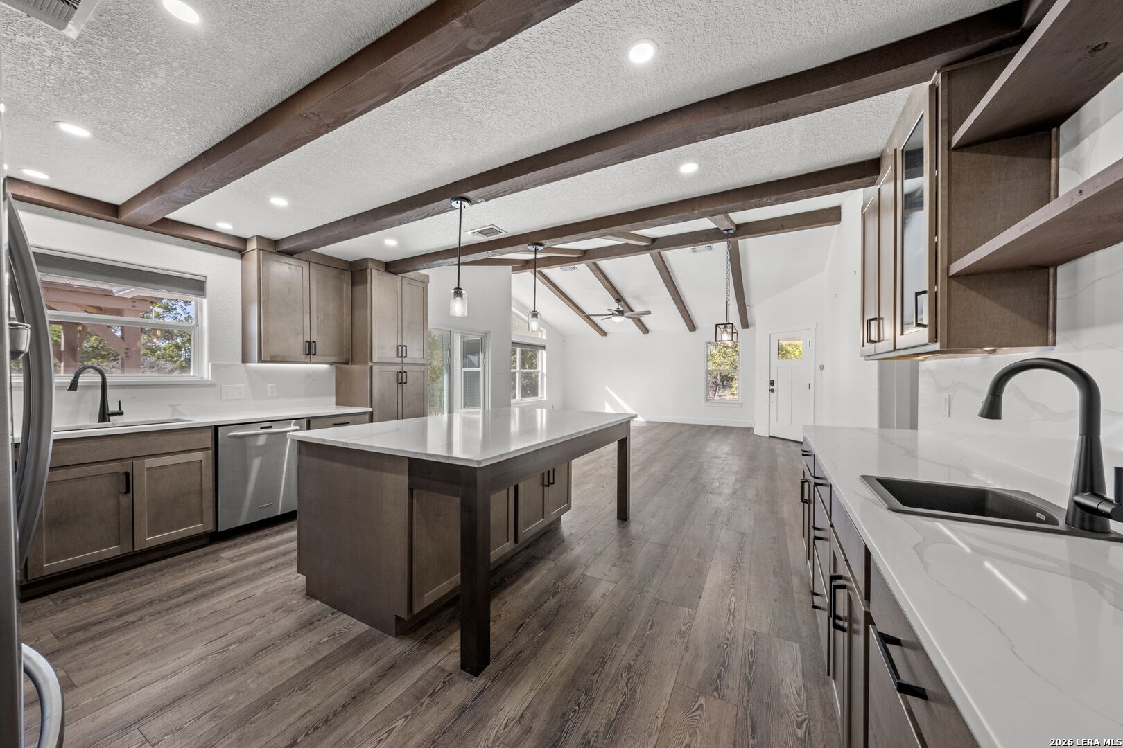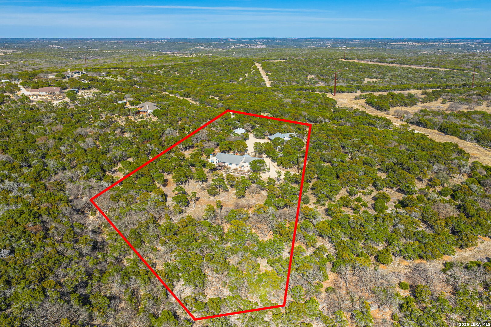 HILLTOP VIEWS- this private retreat offers sweeping views & a complete remodel (10/2024). Designed as a true compound, the home blends style, flexibility, & function-ideal for multi-generational living, hosting guests, or working fm home. A custom kitchen anchors the main living space w/quartz counters & backsplash, under-counter lighting, breakfast bar, & an combined dining area. The main area incl prim suite, 2 add'l bedrms, 2 full bths, kitchen, living room, & laundry. Down the hall is a full bath, large bedrm, & 2nd living area - perfect guest or extended-family wing. Upgrades incl flooring, hardware, quartz counter-tops, doors & vaulted ceilings highlighted w/wood beams. Sliding doors open to a vast back porch w/covr'd area. Enjoy an impressive 80-ft front porch w/fans & lighting overlooking lush green AstroTurf-ideal for putting practice & games. Terrace garden spaces on both sides are fenced w/drip system. Add'l features: 24'x40' 3-bay metal garage; wrkshp/shed; 1.5 bay garage w/attached studio living space, office & activity space (perfect for podcasts, yoga, or a game room), fenced side yard for animals; 26-kW generator; 1,000-gallon propane tank; & an 8-camera sec syst