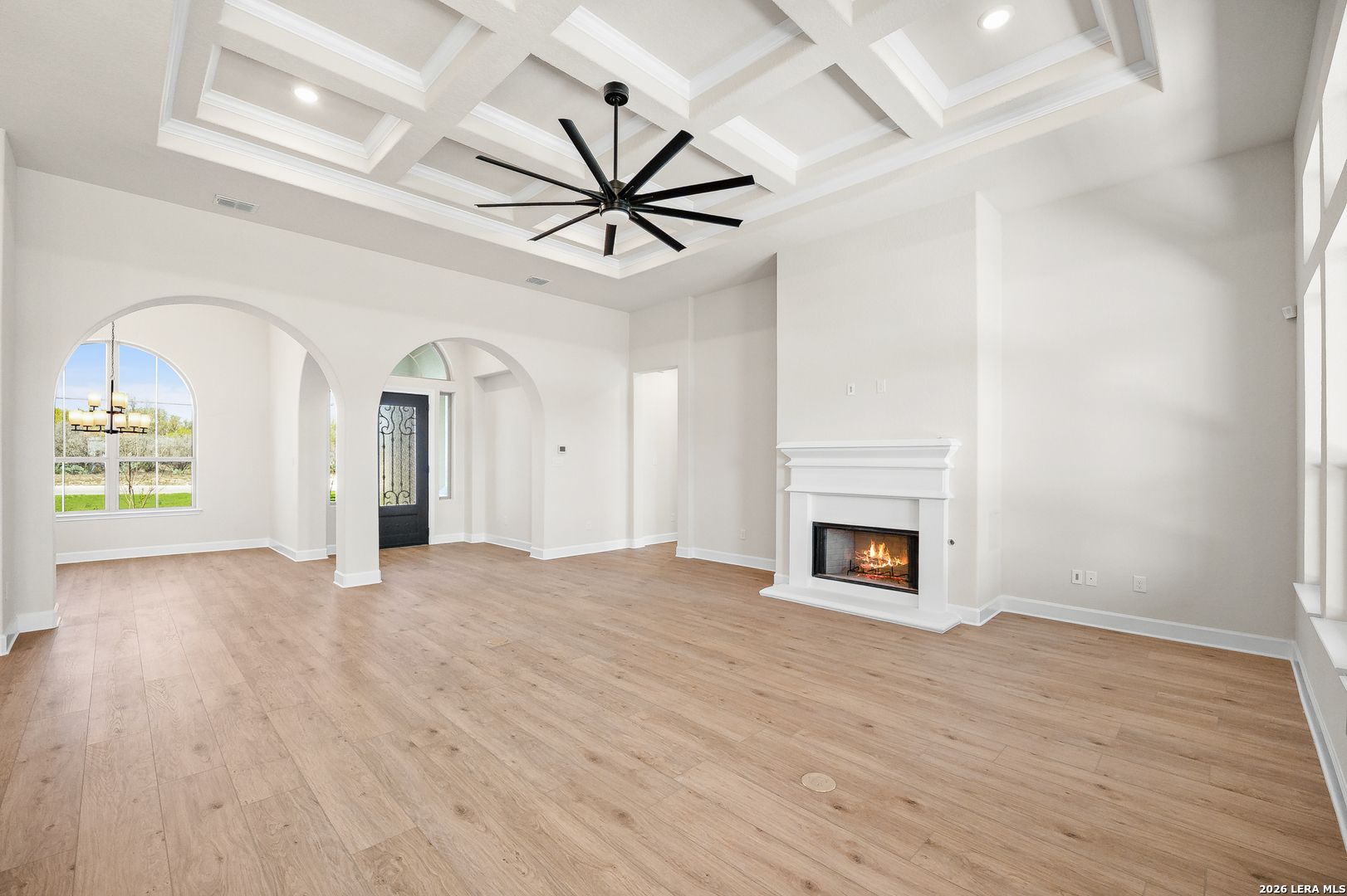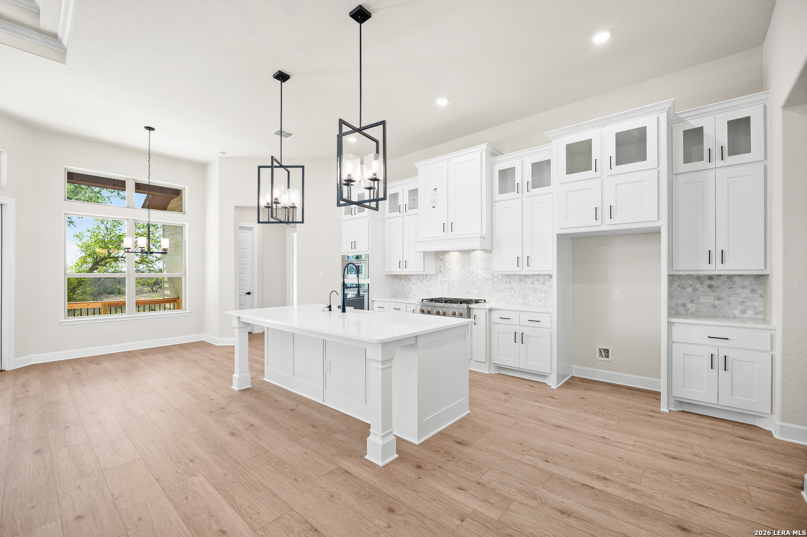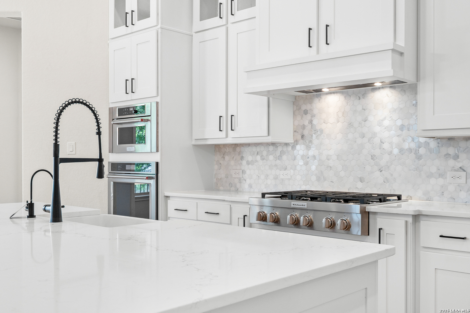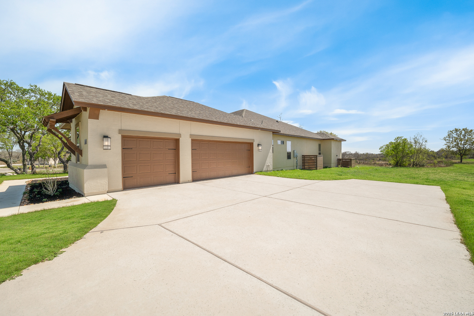 Legend Park is a new small gated community with only 34 homesites ranging from 1.25 to 2.45 acres, and is just 2.3 miles from charming and historical downtown Castroville! Private, cul-de-sac lot. Open and spacious single story with 2674 sq ft. Gorgeous home on a 1.94 acre treed homesite. 3 Bedrooms, 3 baths, study / dining room. Lots of LVP and tile flooring throughout. Voluminous Family Room with a 13.5' waffle ceiling with crown molding. Large windows overlook a spacious 30' covered patio that is perfect for entertaining! 8' iron entry door opening into a large foyer with a trey ceiling. 42" fireplace Francesca Ill mantel with gas log starter. Mudroom area. 6 panel interior doors all throughout with upgraded door levers. Kitchen & all baths have upgraded quartz counter tops. Primary bath has a tile shower with tile to the ceiling and separate freestanding 6' rectangular tub, spacious walk-in closet & raised vanities with upgraded quartz tops. The kitchen has beautiful white double stack upgraded white cabinets and upgraded quartz counter tops, farmhouse sink, pendant lights, upgraded Kitchen Aid appliances including a gas 6-burner cooktop with S/S built-in microwave and oven, pull out spice racks and trash bin. Also has an oversized, fully finished, 3 car side entry garage with openers and an over-sized Laundry room. Move-in ready!