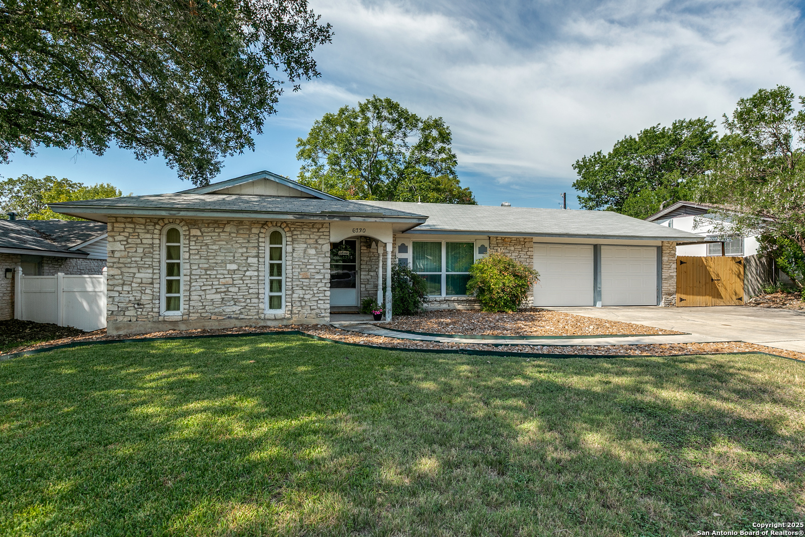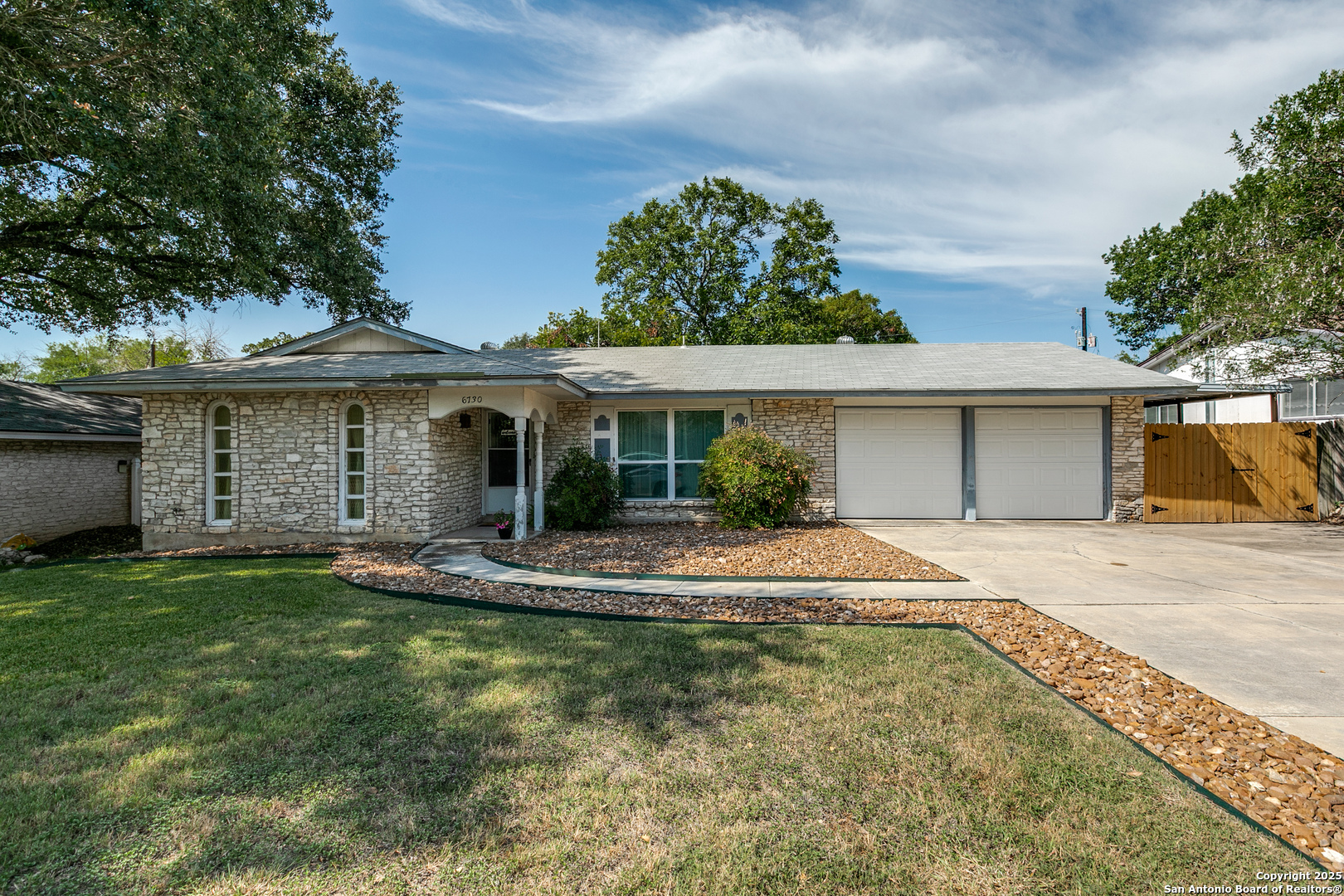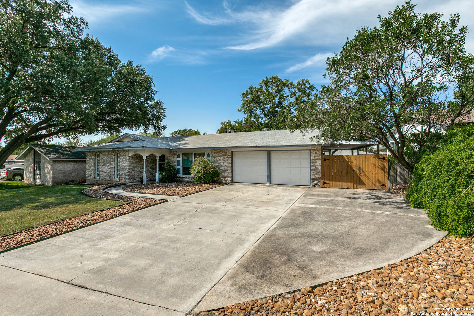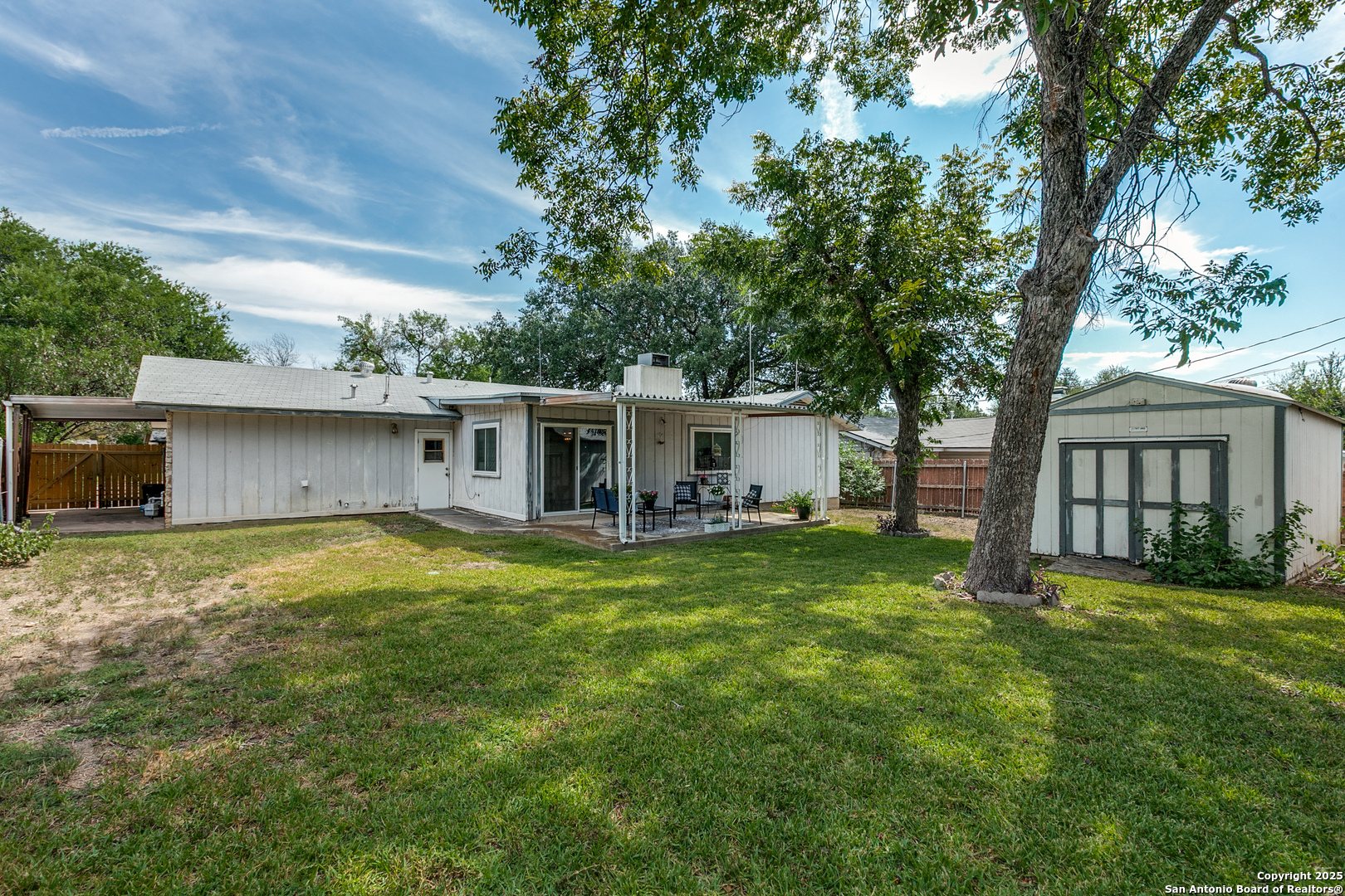 Fall in love with this eye-catching Leon Valley home featuring stone-accented charm and inviting curb appeal. A 2-car garage with an extended driveway and dual open gates provides additional parking and access to the oversized backyard oasis .Inside, you'll find 3 bedrooms, 2 full baths, and 1,529 sq. ft. of well-designed living space. A formal living and dining area welcomes you home and flows to a cozy family room highlighted by a full brick fireplace extending to the ceiling. The kitchen is filled with natural light and opens to a generous breakfast area, enhanced by a decorative vaulted ceiling with wood beams, creating a warm and inviting atmosphere. Enjoy indoor-outdoor living with an oversized covered back patio, perfect for gatherings. A large storage shed with electricity and skylights adds to the abundance of storage already found in the home and generous 2 car garage. Nestled in desirable Leon Valley, it's within walking distance to Raymond Rimkus Park and the community library. Small-town charm with no HOA allows a flexible lifestyle, all while being close to the Medical Center, Loop 410, and I-10. Priced below BCAD appraisal-this spectacular home is ready to be yours!