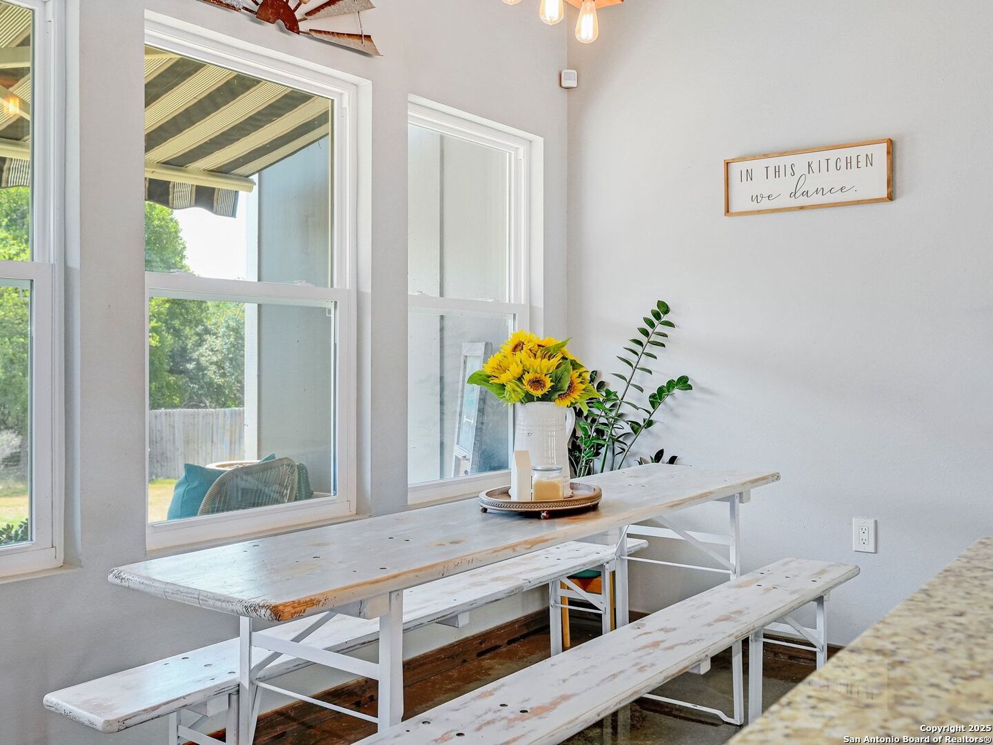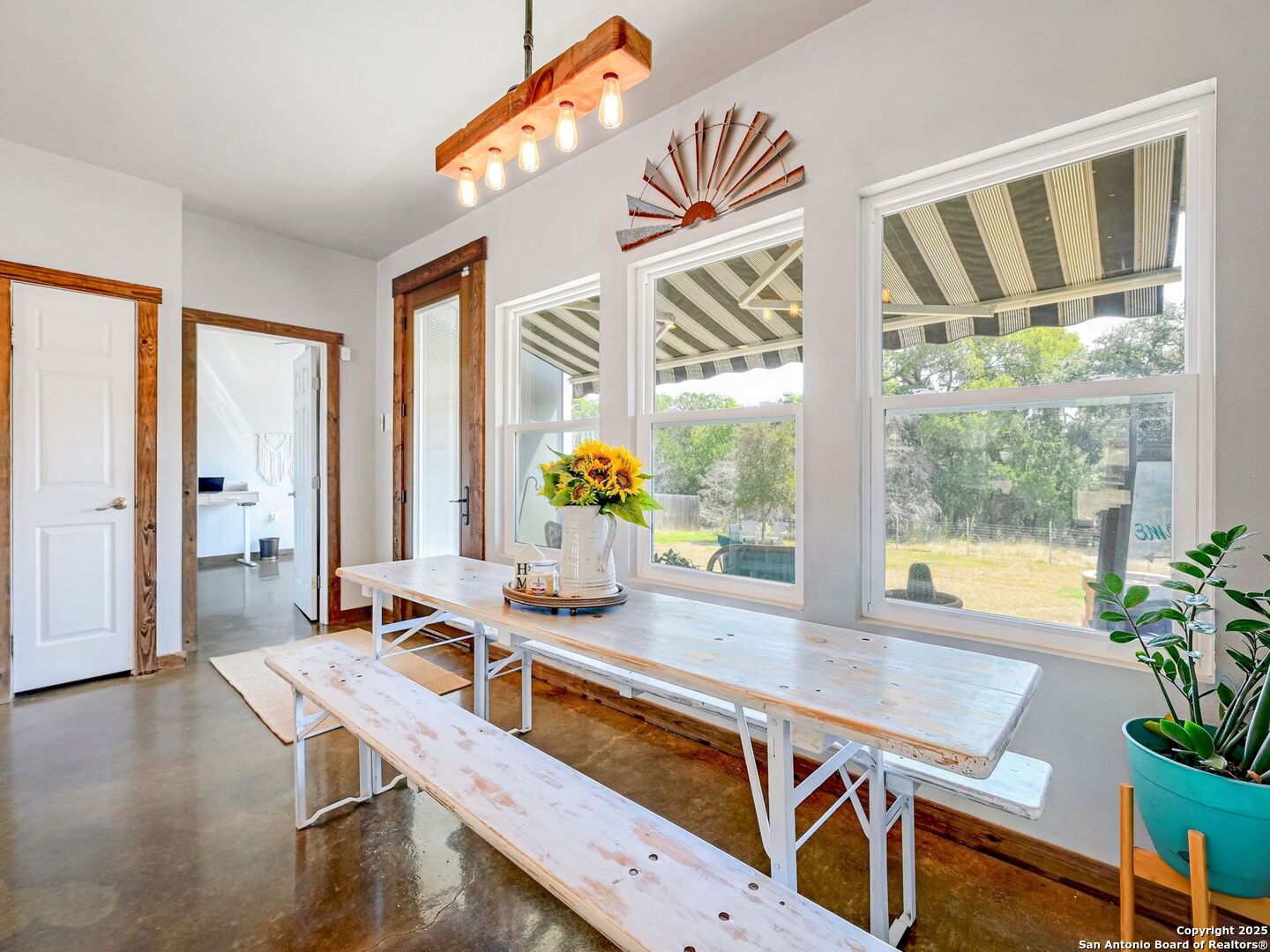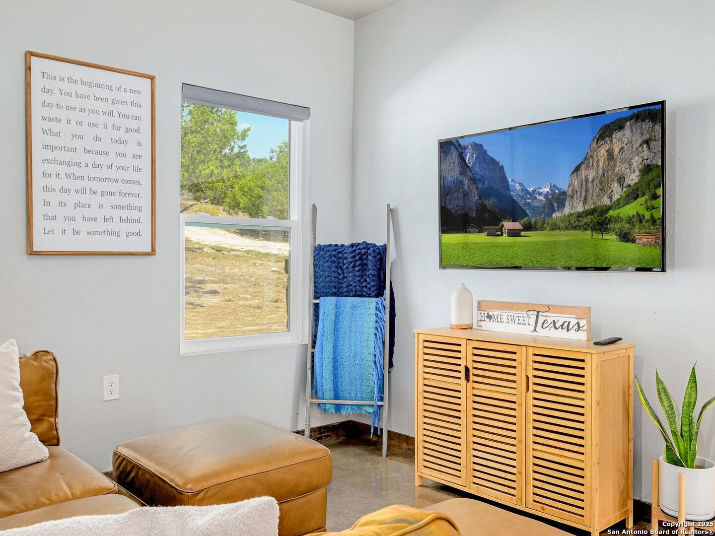One-of-a-Kind Hill Country Retreat! Discover this hidden gem on over half an acre in the desirable Spring Branch/Bulverde area, just minutes from Hwy 281. This contemporary 3-bedroom, 2-bath home offers a turnkey retreat with furnishings negotiable for a seamless move-in. Step inside to beautifully stained concrete floors and an expansive open layout anchored by an oversized granite island, perfect for entertaining. The spacious living room and kitchen seamlessly connect to a private backyard oasis. Relax on the patio overlooking the wooded greenbelt, complete with a sleek hydraulic awning that extends shade at the touch of a button. Neighborhood amenities elevate the lifestyle, featuring three private parks with access to the Guadalupe River, swimming pool, sports courts, trails, and more; All for less than $300 per year. Highlights include: River Park: A six-acre park with 1/4-mile of Guadalupe River frontage, picnic areas, BBQ grills, and restrooms. Community Park (walking distance): Pavilion for gatherings, playground, soccer fields, tennis courts, and basketball hoops.