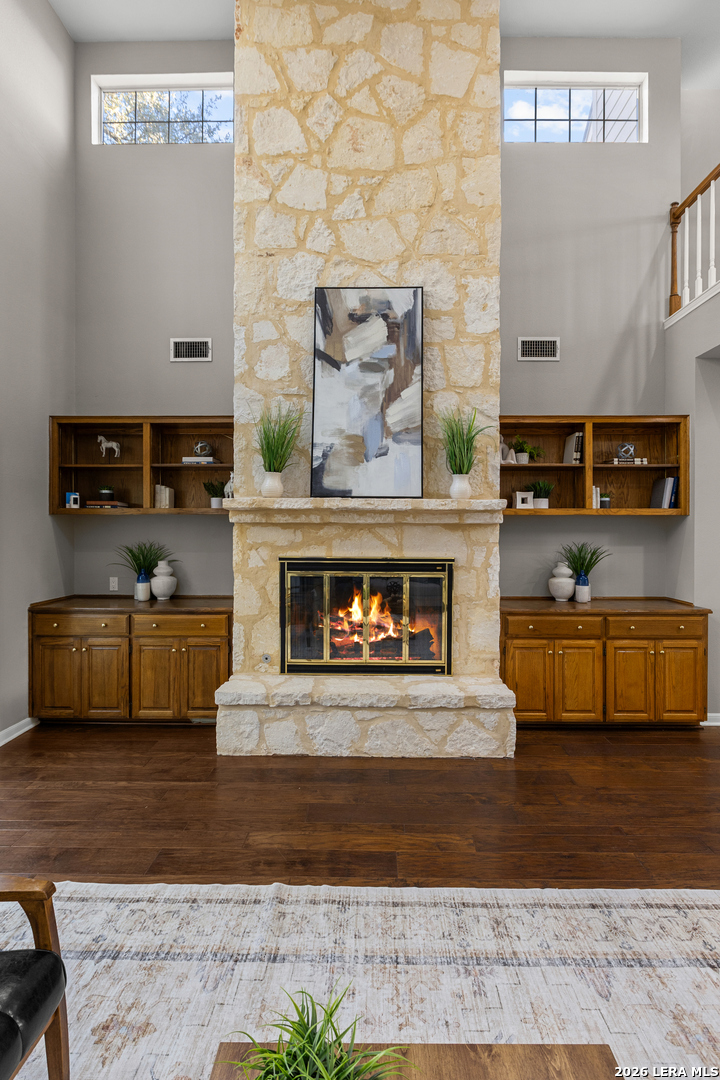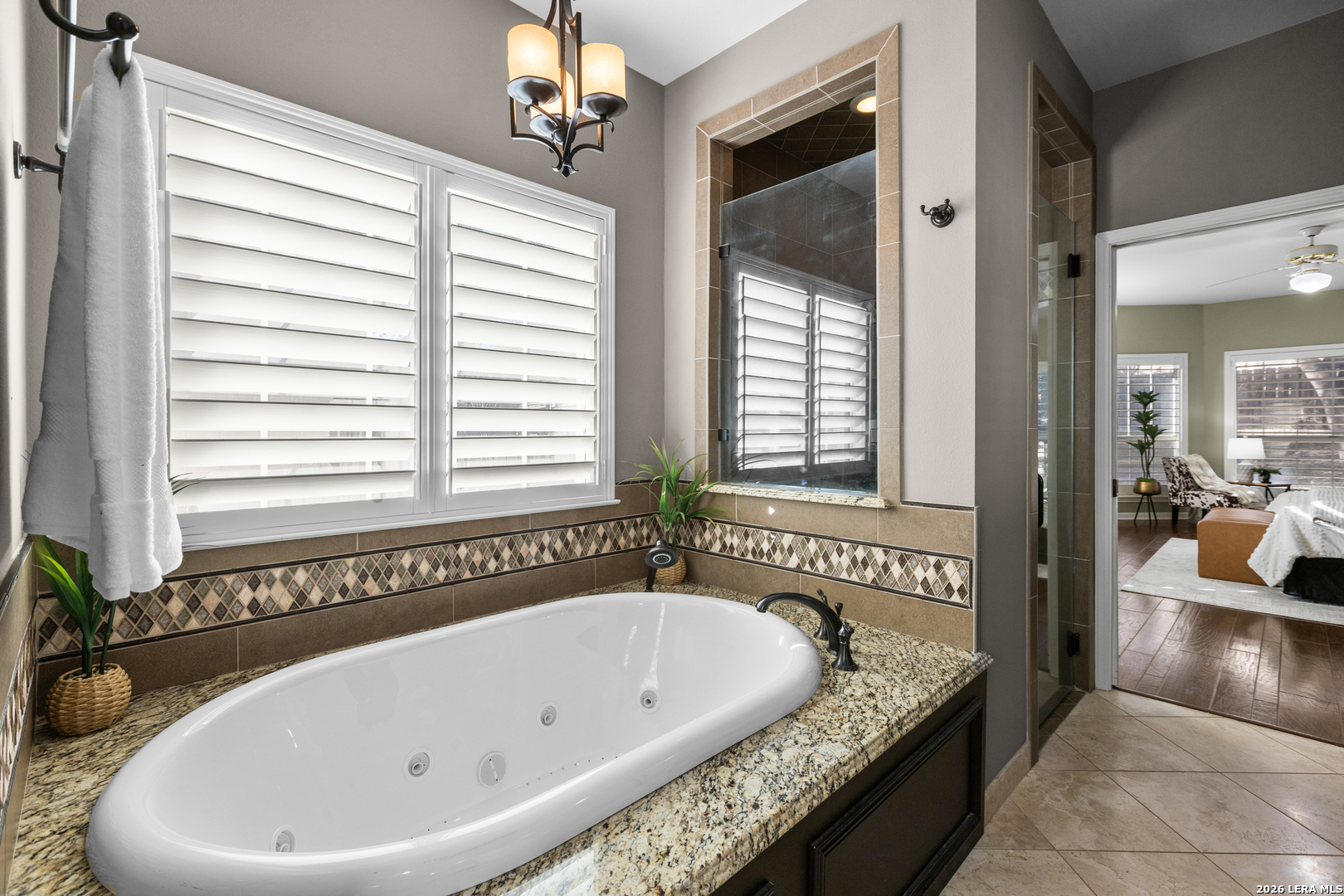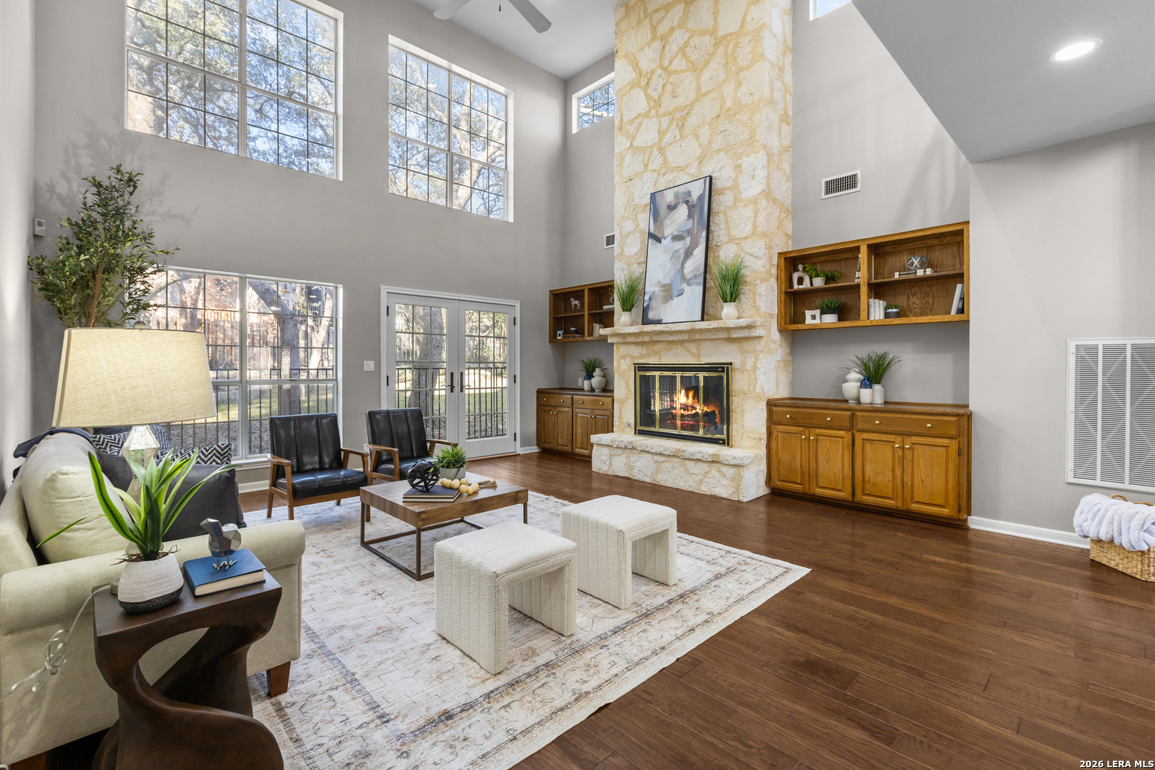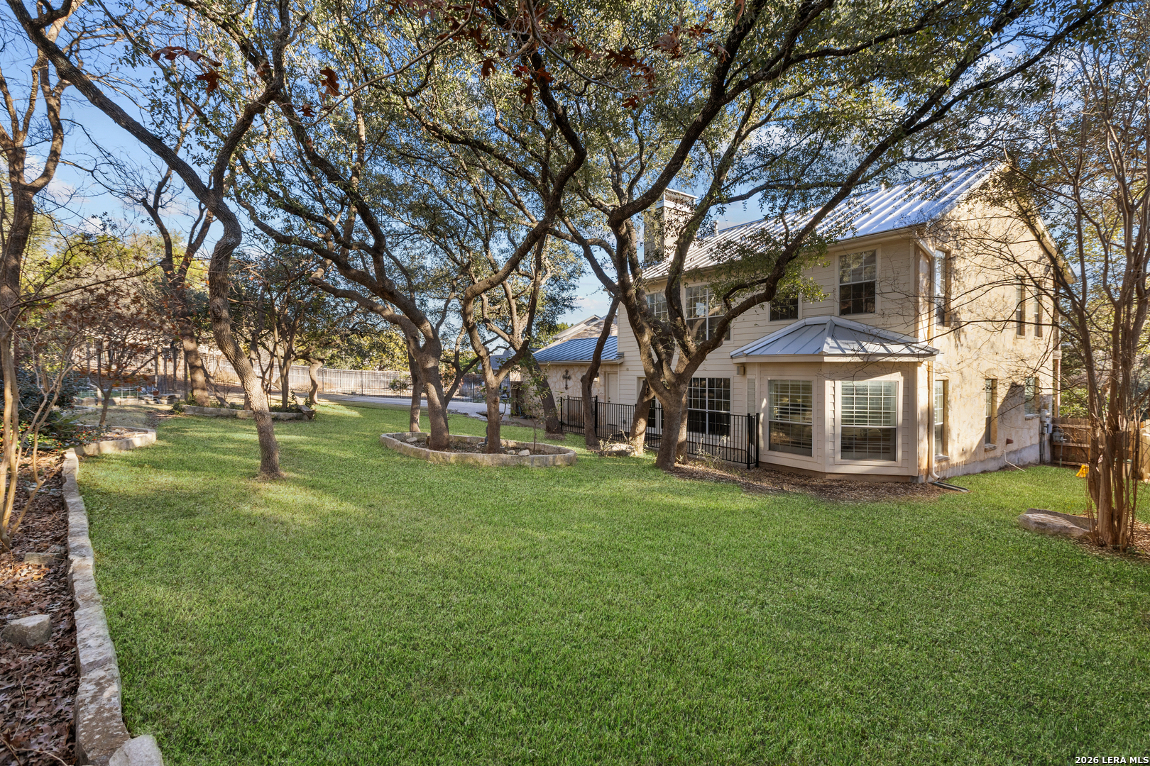 Welcome to Crownridge, one of San Antonio's most desirable communities located just minutes from La Cantera, the Rim, UTSA, and some of the city's best dining, shopping, and entertainment. Step inside and experience soaring ceilings, expansive windows, and an abundance of natural light for an open, inviting atmosphere. The living room is anchored by a striking stone fireplace, offering warmth and architectural charm while connecting to the dining area for entertaining. Quartz countertops, stainless steel appliances, and ample cabinetry and prep space enhance the impressive kitchen and breakfast room. The first-floor primary bedroom offers privacy and comfort with a sitting area and an ensuite bath featuring granite countertops, travertine floors, double vanities, shower, jetted tub, and built-in storage. Upstairs, a spacious game room, provides additional living space, leading to three generously sized bedrooms and a Hollywood bath layout. Rich hardwood floors and plantation shutters flow throughout the home adding warmth, elegance, and timeless appeal. A rock exterior and standing-seam metal roof reflect the Texas Hill Country style, while the driveway with electronic gate leads to a side-entry garage and additional secure parking options. The oversized backyard is framed by mature trees, offering shade, privacy, and room to enjoy the outdoors. If you are searching for refined living, this four-bedroom home delivers luxury. Schedule your private showing today and experience it in person.
