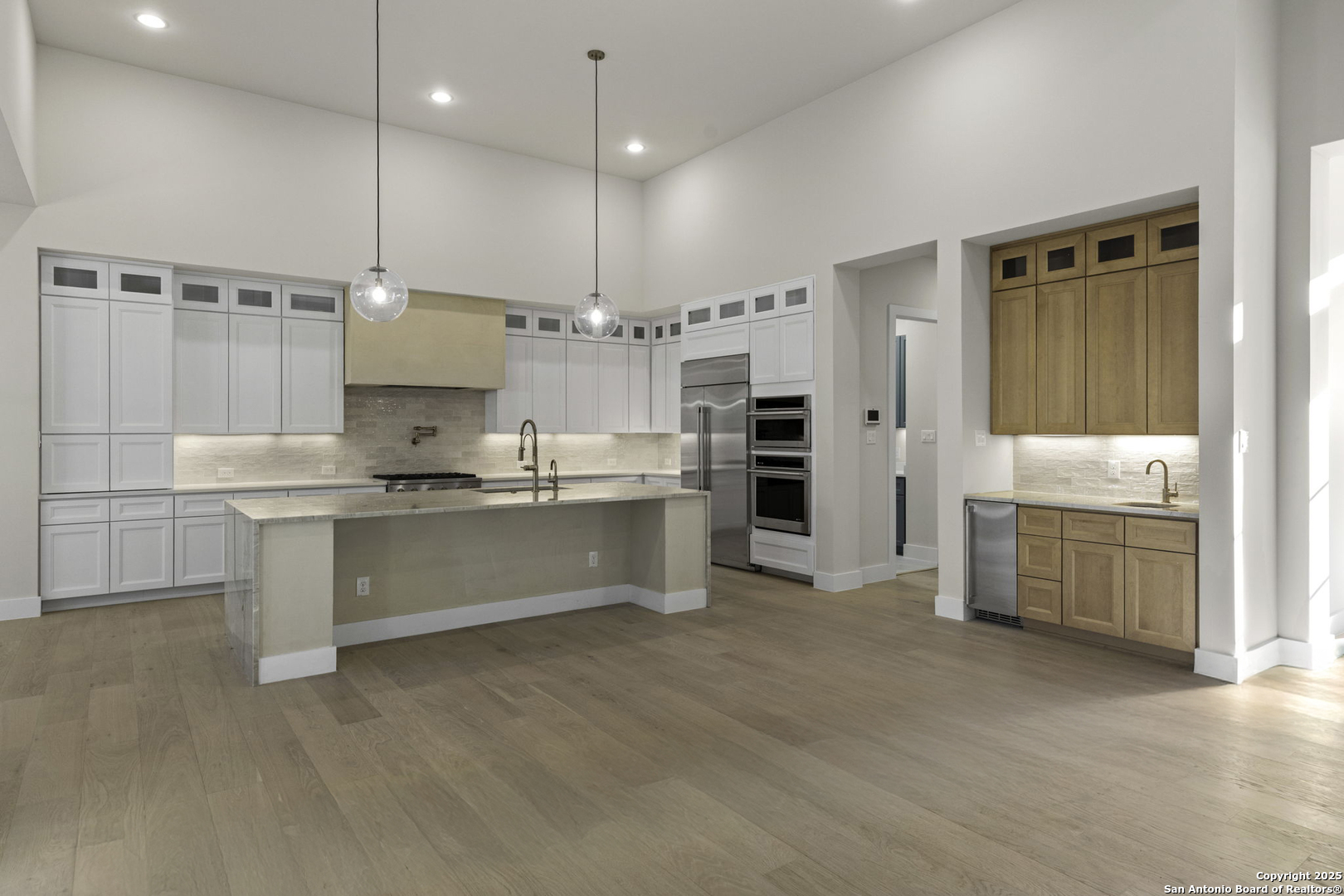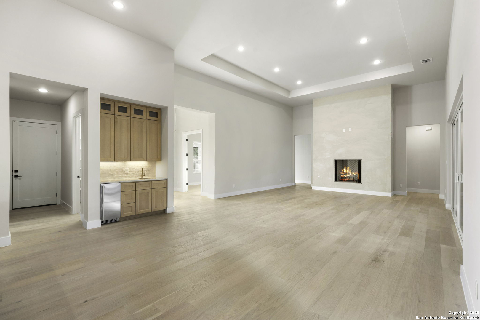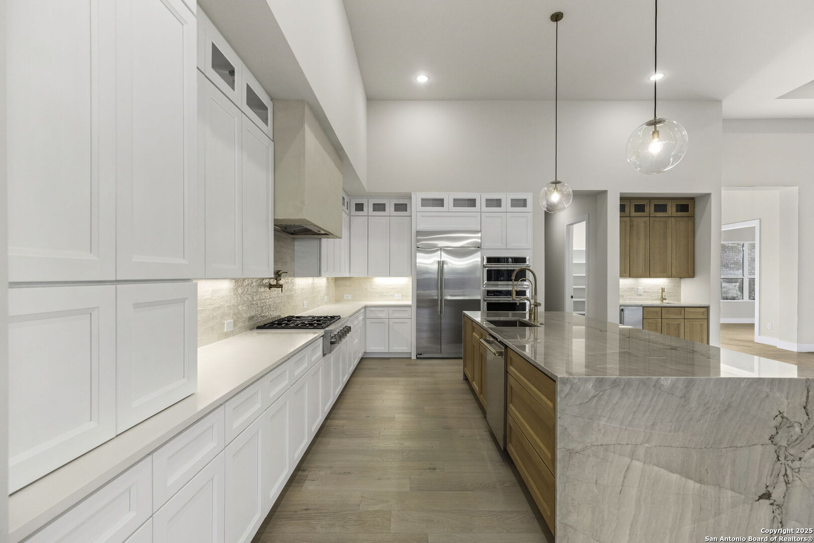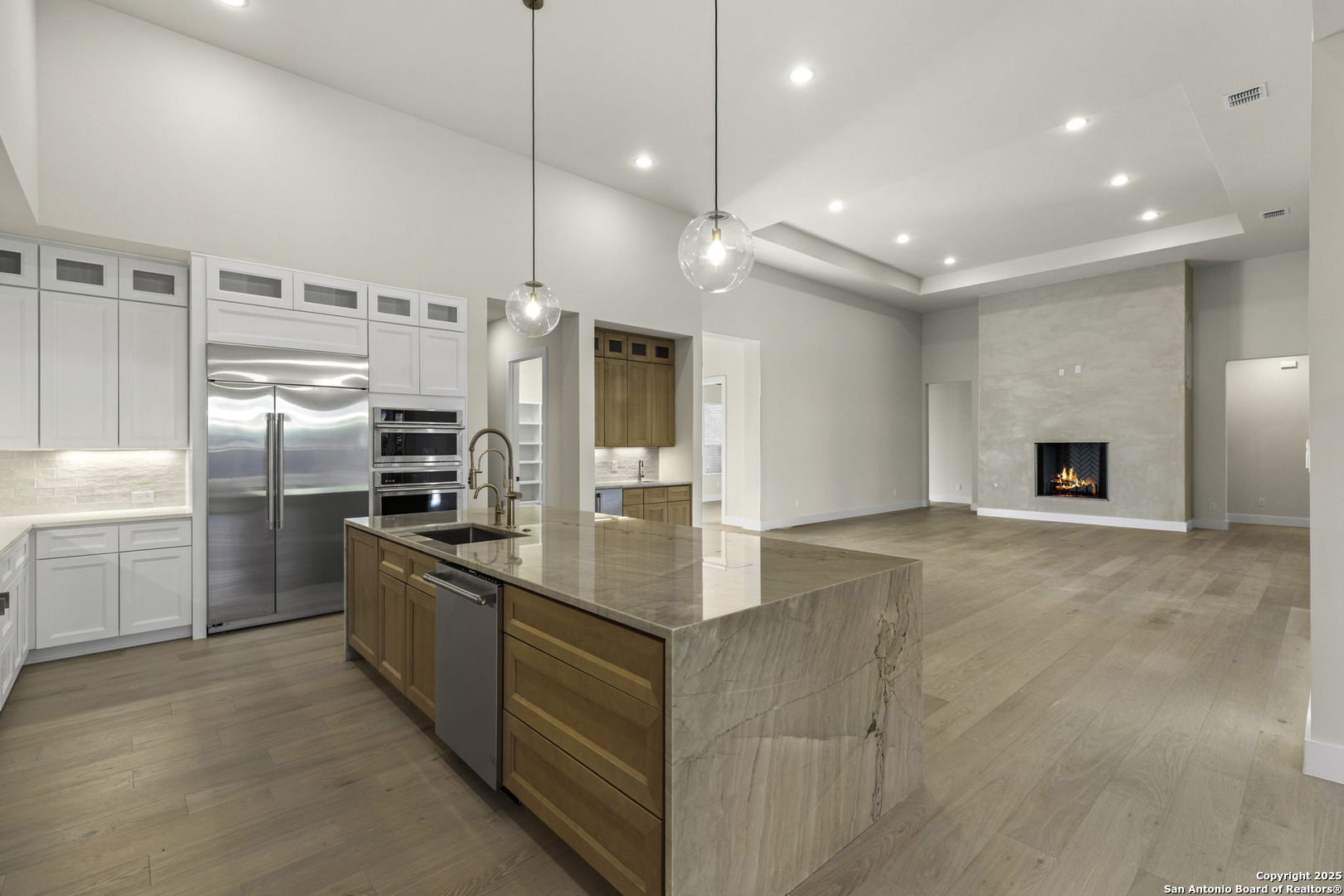 Nestled within the prestigious, guard-gated Dominion community, this exceptional single-story residence offers refined living with timeless elegance. Spanning 3,030 square feet, the home features 3 bedrooms and 3 full baths, including an extra versatile secondary bedroom ideal for a private office or study. Rich wood flooring, solid-core wood doors, and soaring ceilings create a sophisticated yet inviting atmosphere throughout. The expansive living spaces are anchored by a fireplace and complemented by a well-appointed kitchen with double ovens, custom cabinets, large island and a wet bar with sink-perfect for upscale entertaining. Outdoors you have an oversized back patio with a gas hook up and plenty of room to create the perfect outdoor living space. Tucked away on a quiet cul-de-sac, you will love the minute golf cart ride to the Dominion Golf Course. Residents of The Dominion enjoy world-class amenities including a guarded entrance, private clubhouse, on-site restaurant, and championship golf course, offering an unparalleled luxury lifestyle in one of San Antonio's most exclusive neighborhoods.
