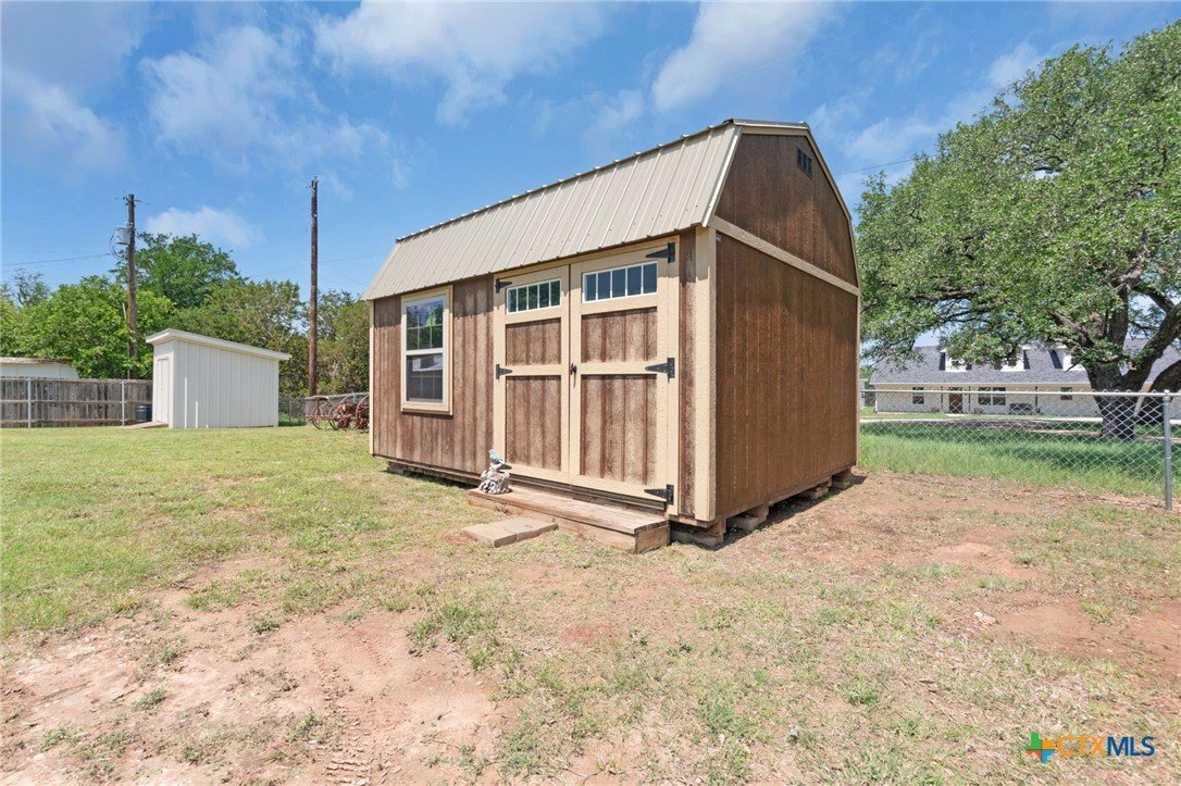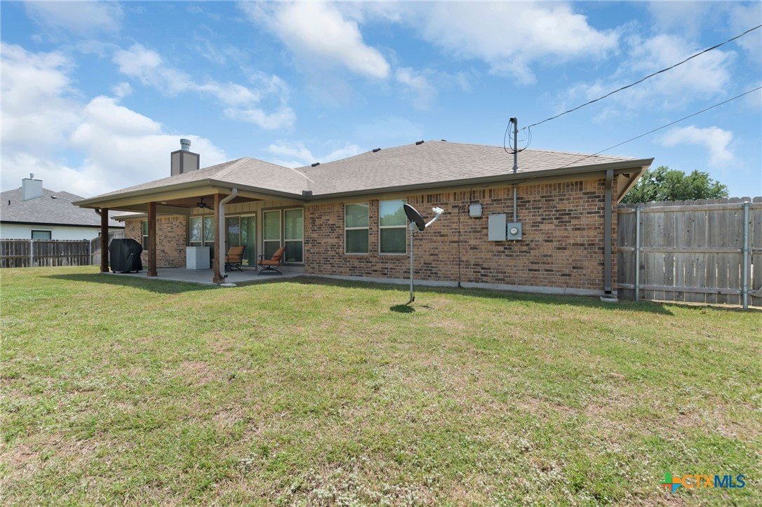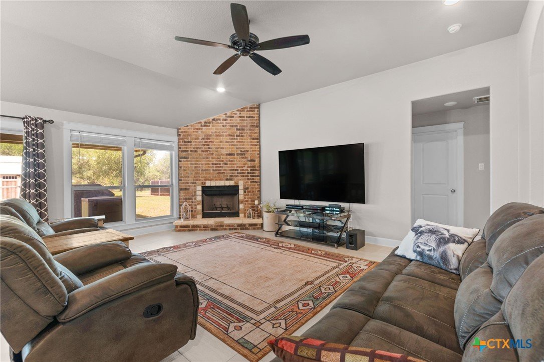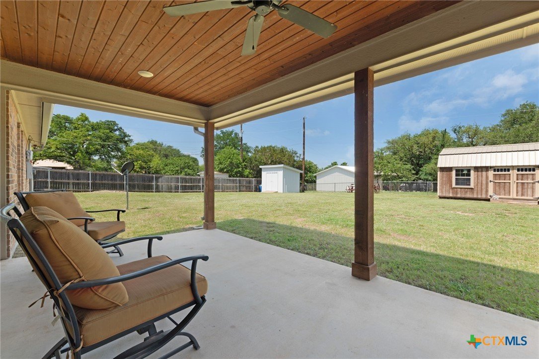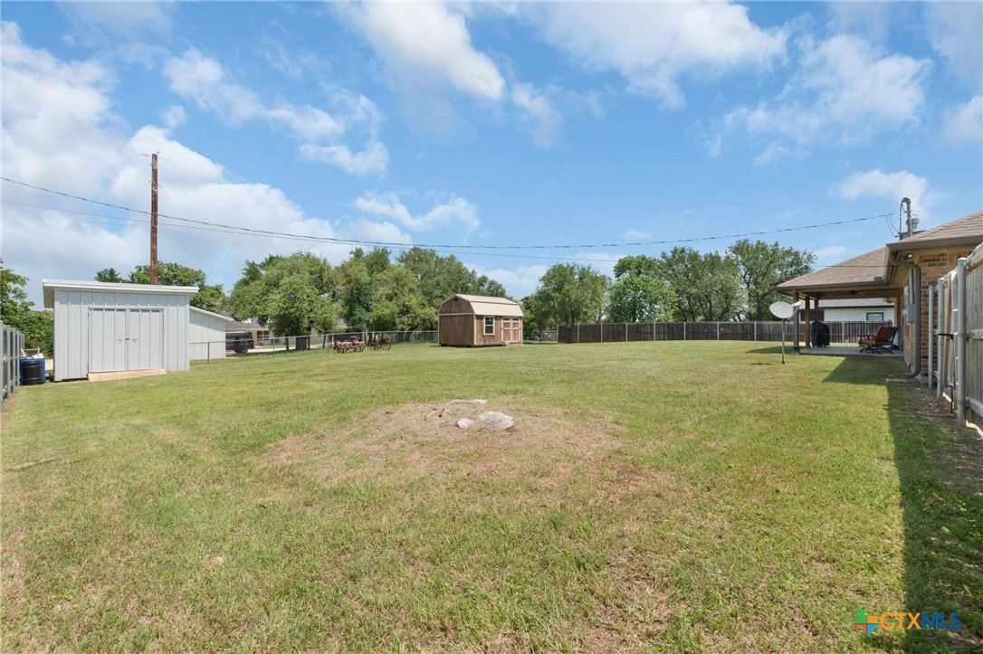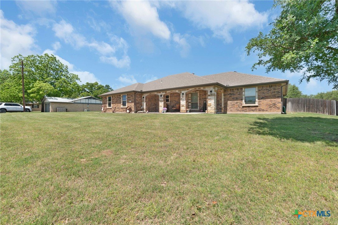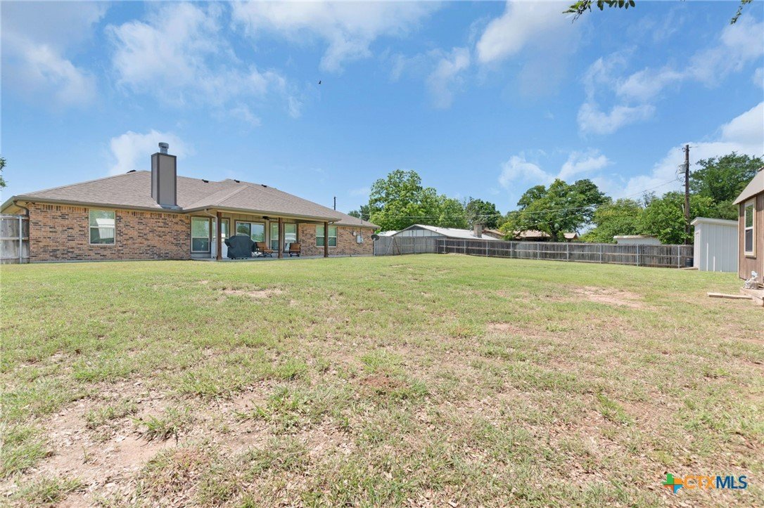 Built in 2020 by Atkinson-Wilson Homes, this well-crafted home in Lampasas sits on a spacious half-acre lot. The brick exterior with rock accents and composition roof offers timeless curb appeal, while the fully fenced backyard includes two storage buildings for added functionality. A 2-car garage completes the exterior. Inside, the 2,071 sq ft layout features 3 bedrooms and 2 bathrooms with an open-concept living, dining, and kitchen area plus a breakfast room. The living room features a cozy fireplace, and tile flooring runs throughout the main areas, with carpet in the bedrooms. The kitchen includes granite countertops and flows seamlessly into the main living space. The primary suite offers dual sinks, a soaking tub, separate walk-in shower, and a walk-in closet. The secondary bath includes a tub with tile surround. A utility room with sink adds convenience to this move-in ready home.