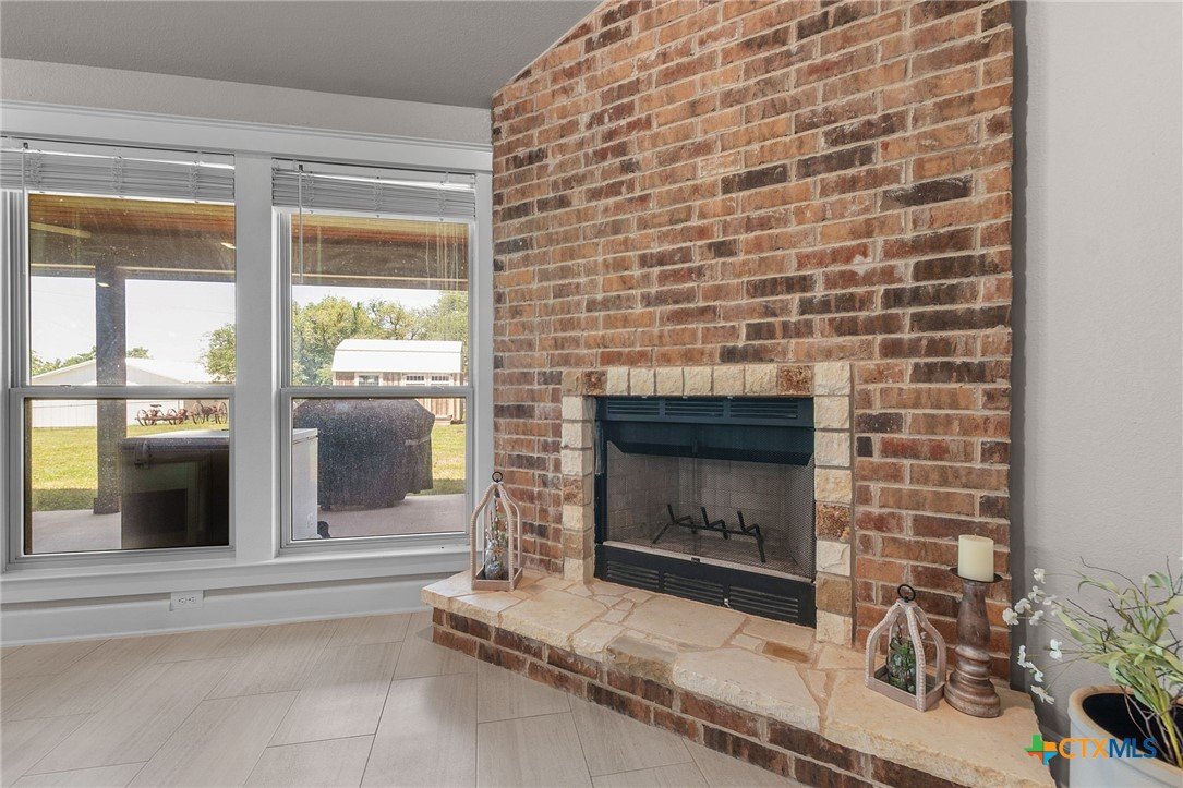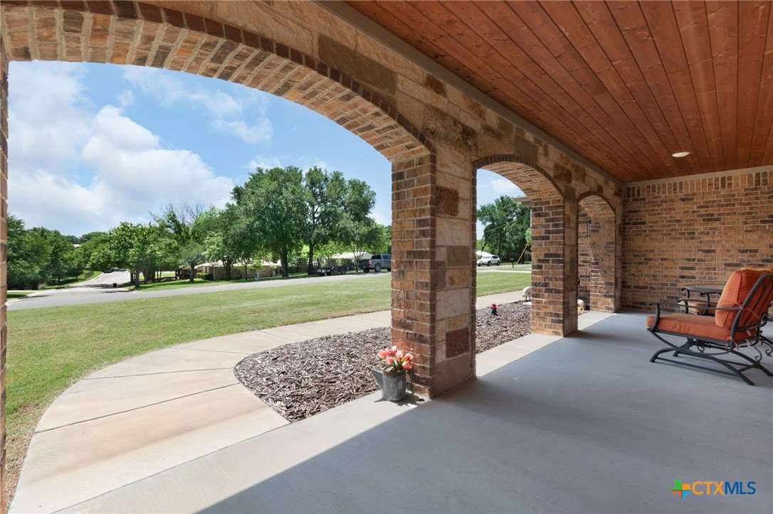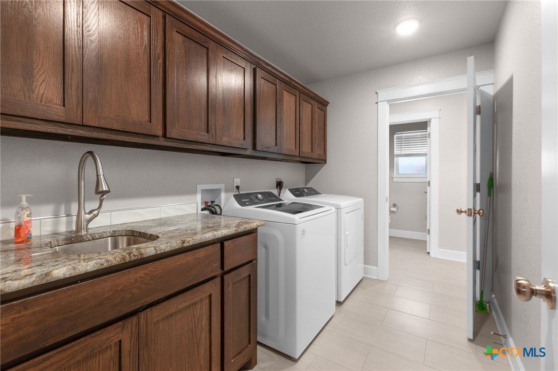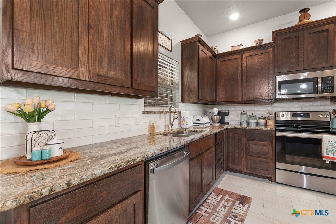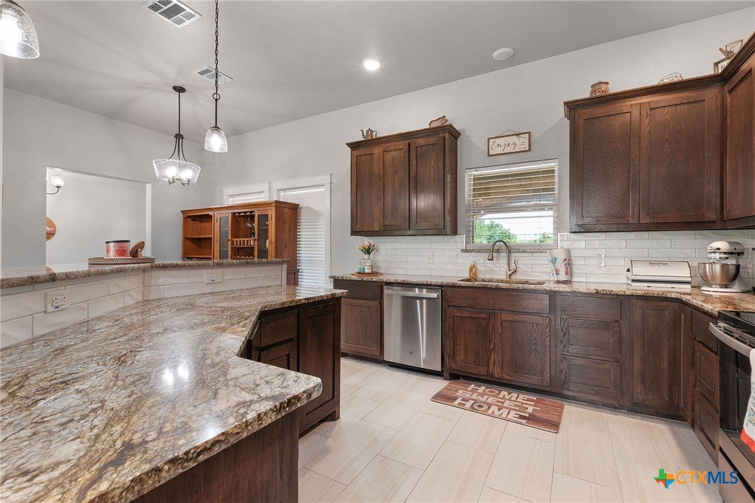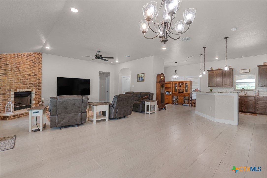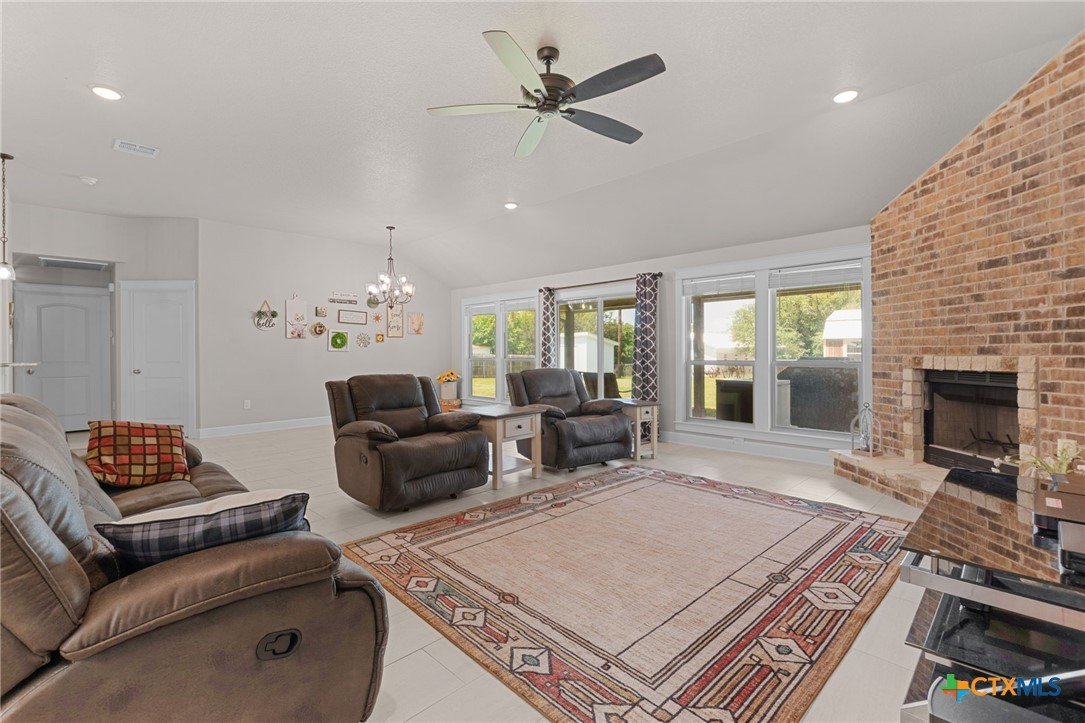 Built in 2020 by Atkinson-Wilson Homes, this well-crafted home in Lampasas sits on a spacious half-acre lot. The brick exterior with rock accents and composition roof offers timeless curb appeal, while the fully fenced backyard includes two storage buildings for added functionality. A 2-car garage completes the exterior. Inside, the 2,071 sq ft layout features 3 bedrooms and 2 bathrooms with an open-concept living, dining, and kitchen area plus a breakfast room. The living room features a cozy fireplace, and tile flooring runs throughout the main areas, with carpet in the bedrooms. The kitchen includes granite countertops and flows seamlessly into the main living space. The primary suite offers dual sinks, a soaking tub, separate walk-in shower, and a walk-in closet. The secondary bath includes a tub with tile surround. A utility room with sink adds convenience to this move-in ready home.