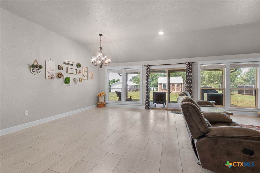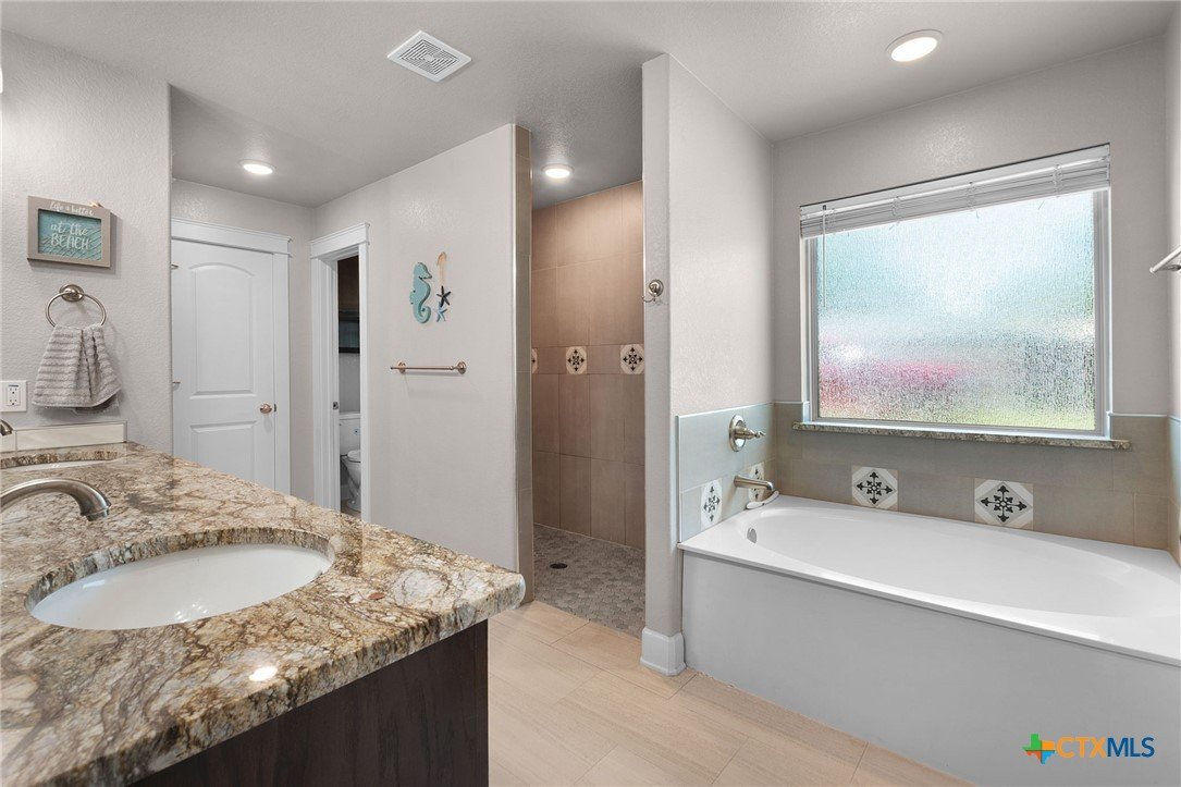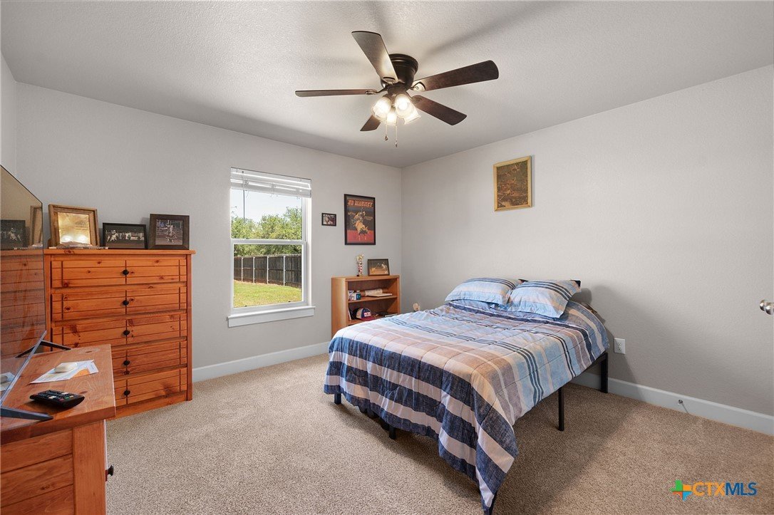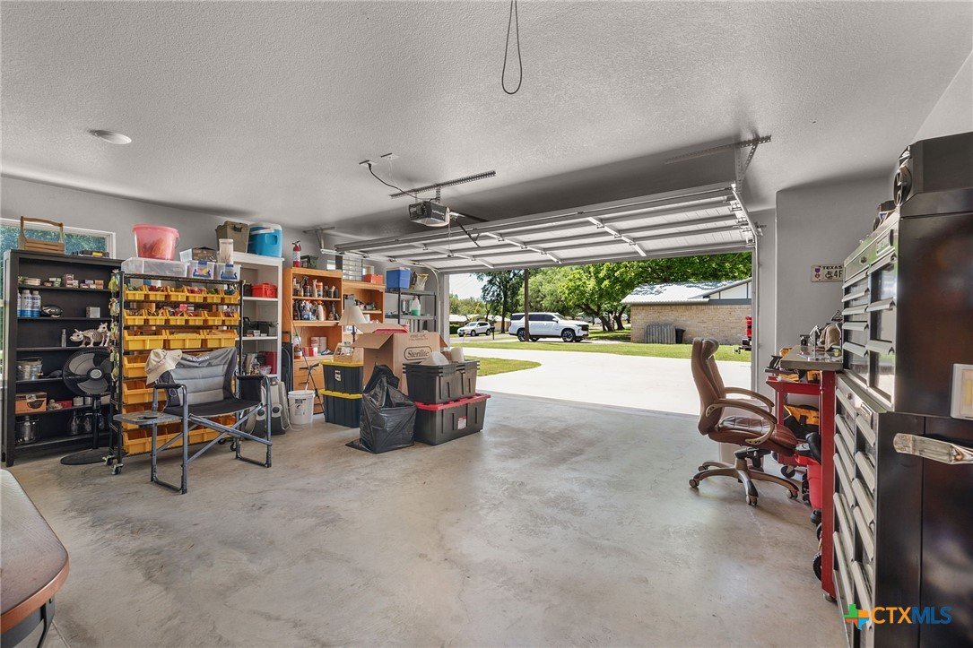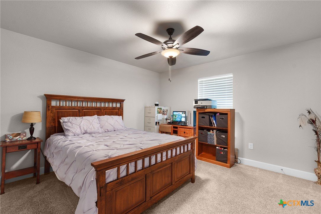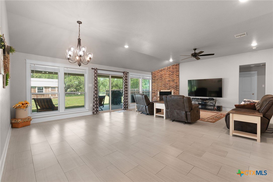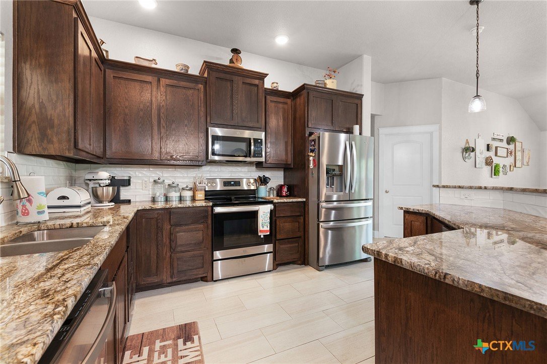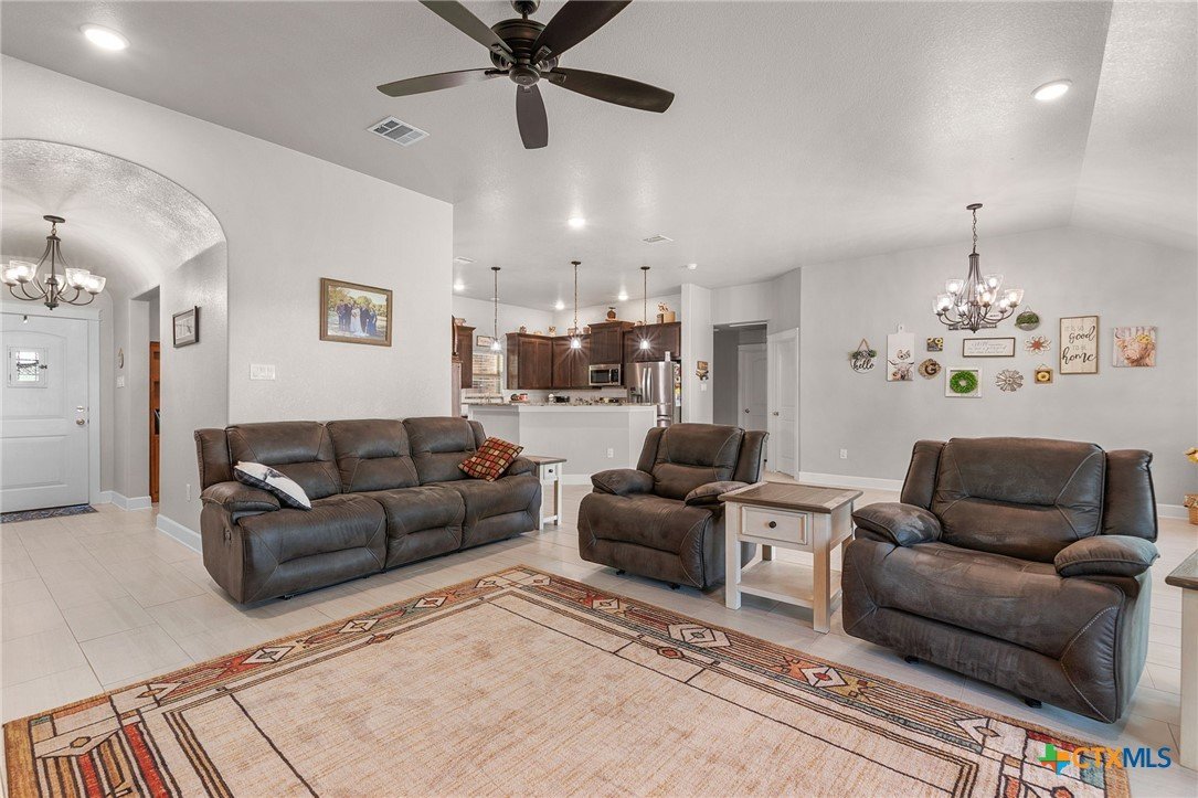 Built in 2020 by Atkinson-Wilson Homes, this well-crafted home in Lampasas sits on a spacious half-acre lot. The brick exterior with rock accents and composition roof offers timeless curb appeal, while the fully fenced backyard includes two storage buildings for added functionality. A 2-car garage completes the exterior. Inside, the 2,071 sq ft layout features 3 bedrooms and 2 bathrooms with an open-concept living, dining, and kitchen area plus a breakfast room. The living room features a cozy fireplace, and tile flooring runs throughout the main areas, with carpet in the bedrooms. The kitchen includes granite countertops and flows seamlessly into the main living space. The primary suite offers dual sinks, a soaking tub, separate walk-in shower, and a walk-in closet. The secondary bath includes a tub with tile surround. A utility room with sink adds convenience to this move-in ready home.