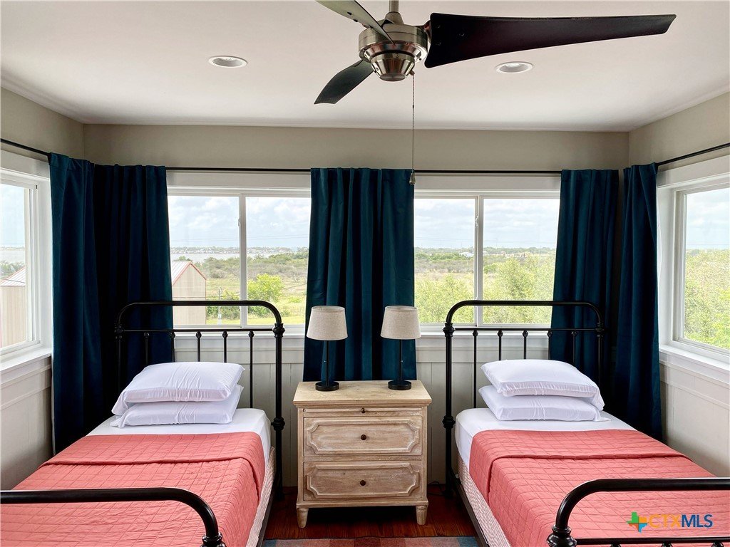 Enjoy coastal breezes and beautiful sunsets sitting on the covered deck of this custom, three level Coastal Home overlooking San Antonio Bay with wet canal (not always accessible) and docking area in back. This property offers hardwood floors upstairs, concrete countertops in kitchen, stainless steel appliances and open concept kitchen living area. Custom wood eating bar, backsplash in kitchen. Stained wooden ceiling beams throughout the main level. Updated master bath vanity and tile flooring. Master bedroom has walk in closet, other bedrooms/loft do not have closets. Powder room located under stairs to third level. Third level enclosed for additional sleeping area or office with windows on three sides affording great water views. (No closet in this area) Downstairs has sitting/sleeping area, utility room with build in shelving, bathroom and second bedroom(No closet). The covered parking area under house will accommodate most bay boats with an enclosed storage both in house and a detached storage/wellhouse. Furnishings available for purchase.