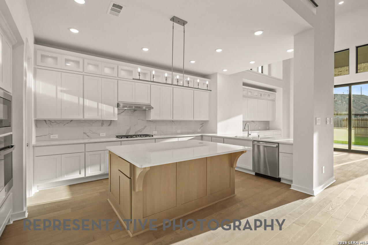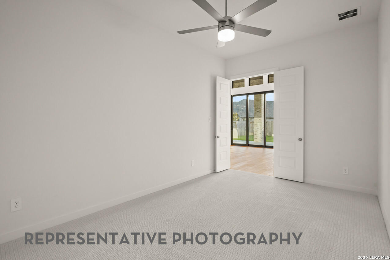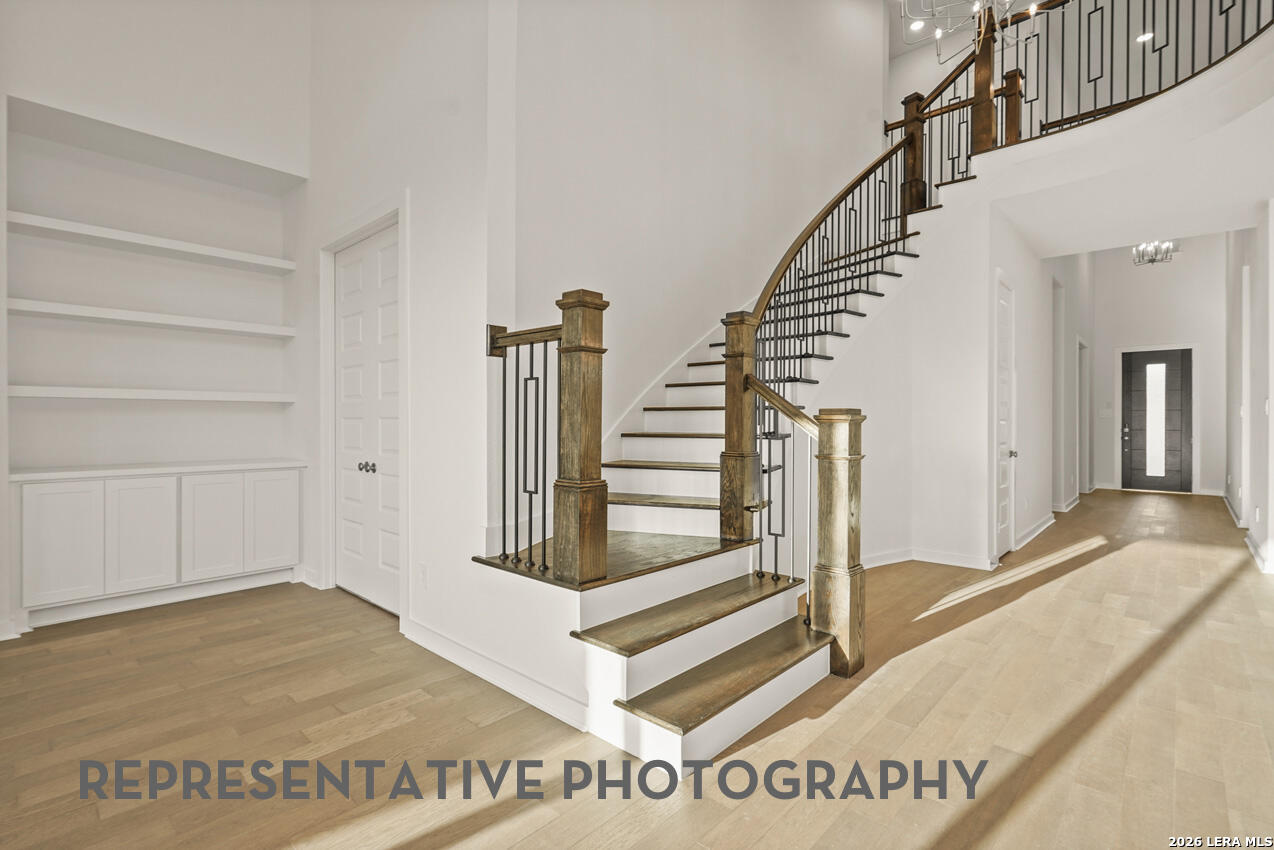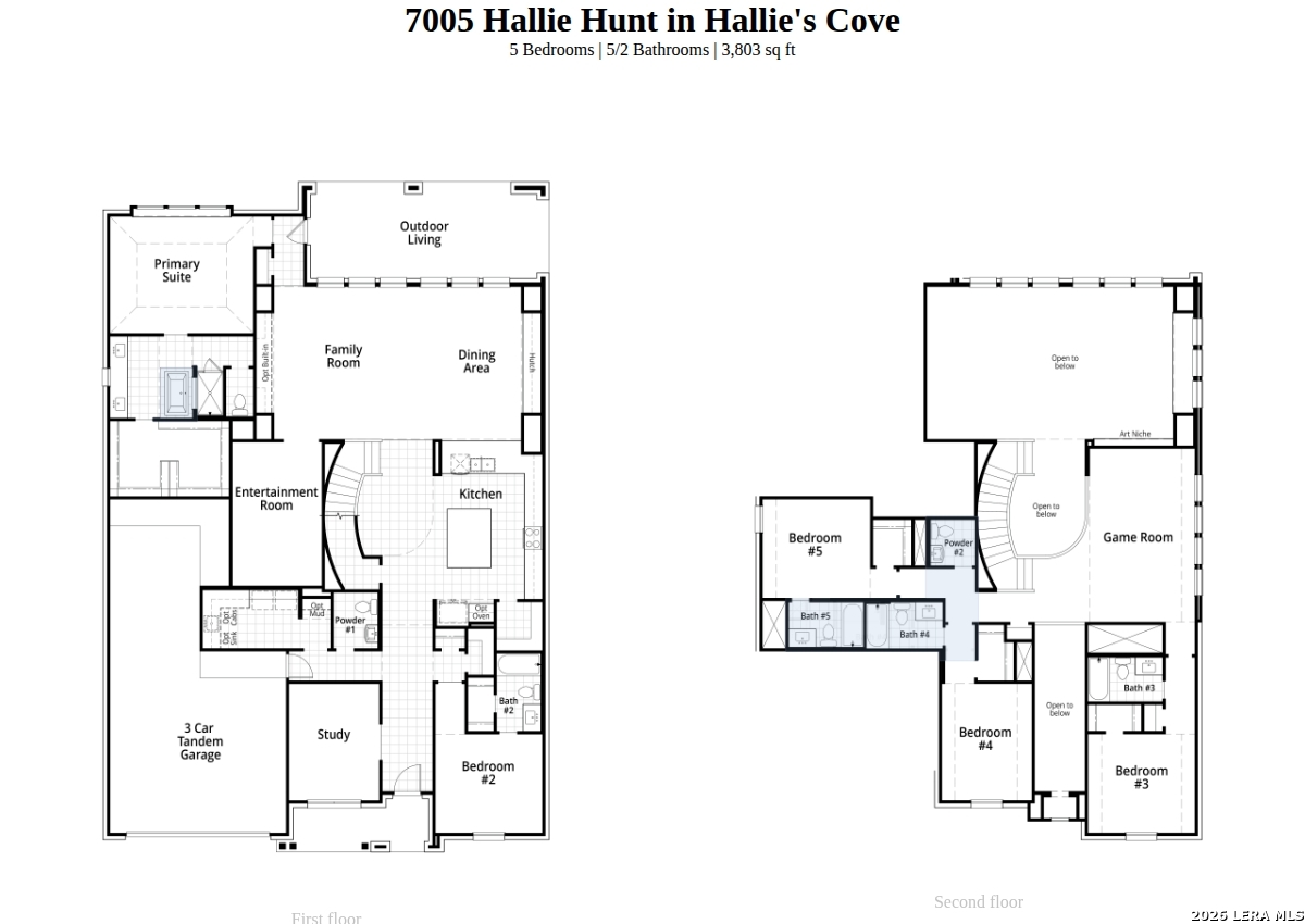 Stunning two-story home featuring 5 bdrms, each with its own private en-suite bath, plus 2 convenient powder baths. Designed for both comfort and entertaining, this home offers 2 bedrooms on the main level and additional spacious bedrooms upstairs. Enjoy a private study and entertainment room upstairs with gameroom upstairs- perfect for work and play. The open concept family and dining areas showcase impressive 20' ceilings, creating an airy atmosphere. The chef's kitchen flows seamlessly into the living spaces, ideal for gatherings. Additional highlights include a 4 car tandem garage, covered patio for outdoor living, and an expansive 88' wide homesite.