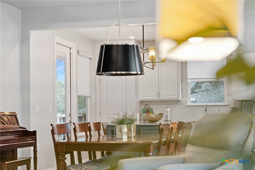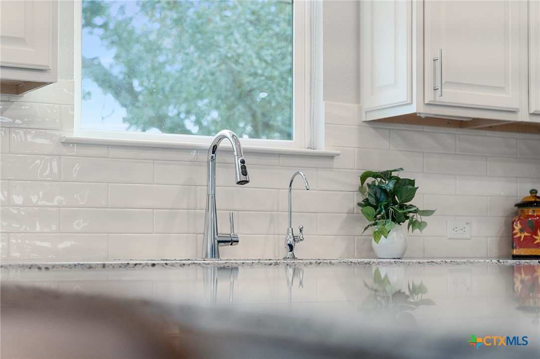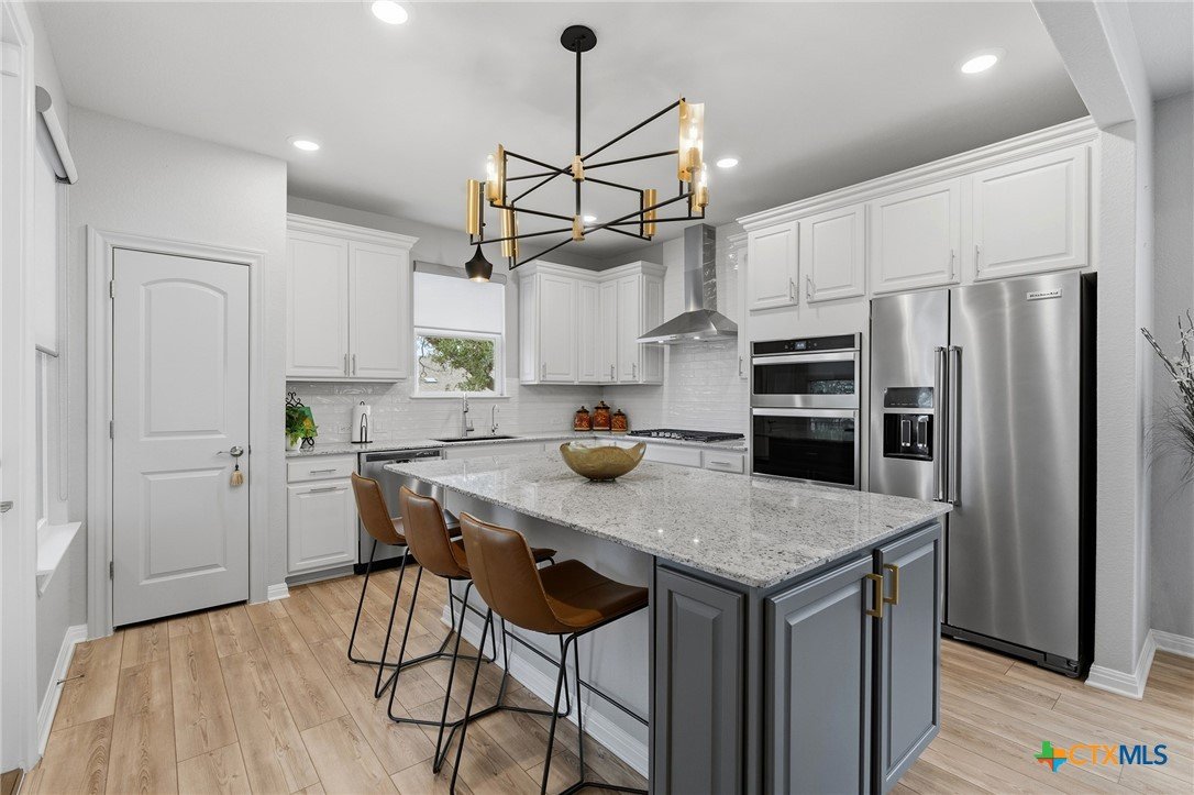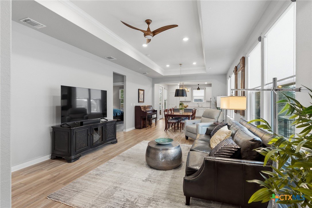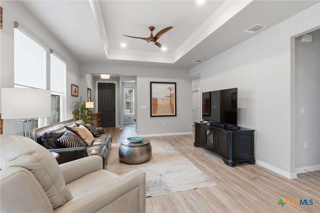 Located at 703 Saratoga Ln in Sun City, a 55+ Community, Single-story, this beautifully maintained single-story home, built in 2022, offers the perfect blend of modern design, comfort, and functionality. Featuring 2 bedrooms, 2 bathrooms, a dedicated study, and a 2-car garage, this thoughtfully designed residence is ideal for both everyday living and entertaining. The chef-inspired kitchen is the heart of the home, showcasing sleek granite countertops, a stylish tiled backsplash, and an oversized center island with customer lighting and breakfast bar seating. High-end appliances—including a built in oven and microwave, cooktop, wall-mounted chimney hood—combine performance with elevated style. The open living area is warm and inviting, highlighted by crown molding and a tray ceiling that enhances the spacious feel. The private primary suite offers a relaxing retreat with refined finishes, a generous walk-in closet, and an ensuite bath featuring a double vanity and tiled walk-in shower with frameless glass. A secondary bedroom and full bath provide comfortable accommodations for guests, while the dedicated study offers flexibility for a home office or additional living space. Additional conveniences include a separate laundry room with additional cabinet storage and a spacious 2-car garage. Step outside to enjoy the covered patio and beautifully landscaped and maintained backyard, complete with stone walkway and garden beds and a wrought iron fence that adds charm—perfect for relaxing evenings or hosting gatherings. With its combination of modern finishes, custom lighting, custom window shades and ceiling fans throughout, whole water filtration system, thoughtful layout, and desirable Georgetown location, this home delivers a sophisticated and low-maintenance lifestyle.