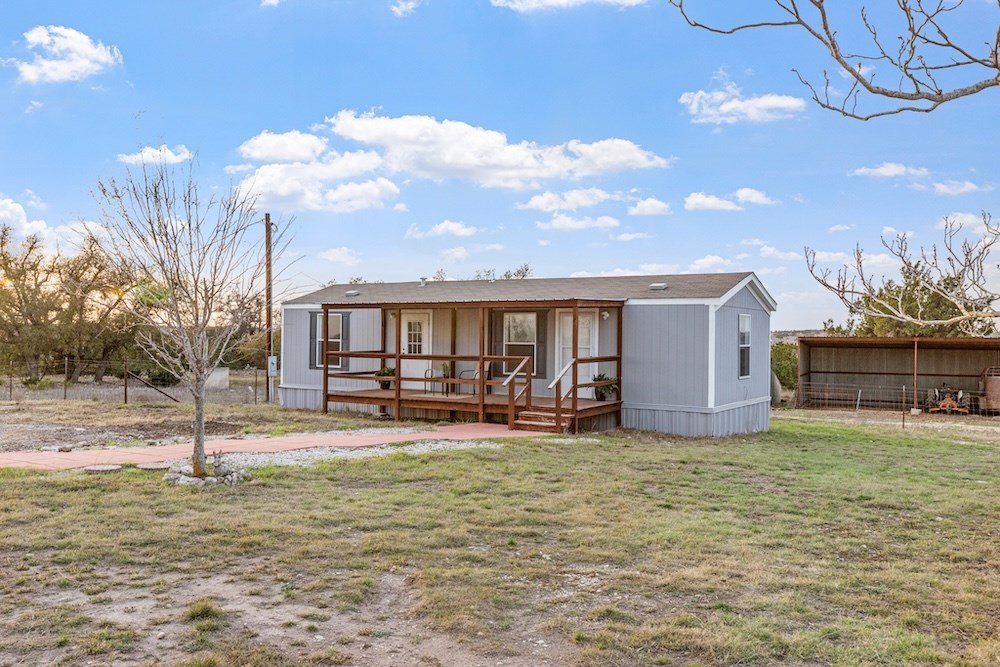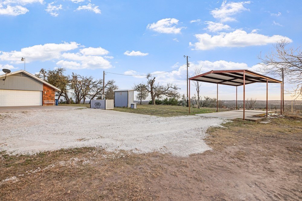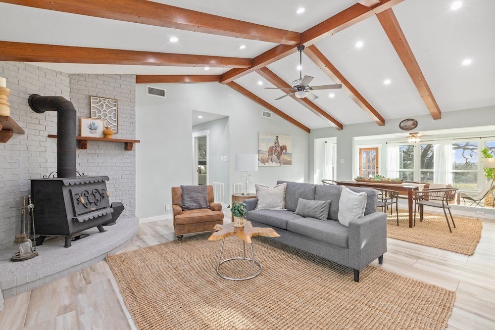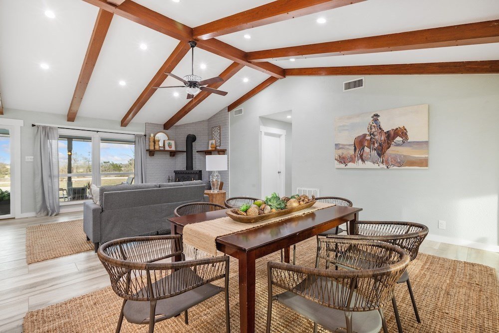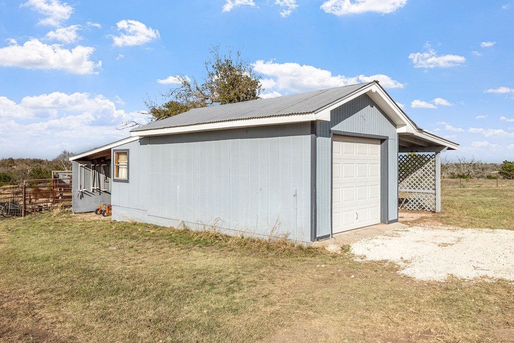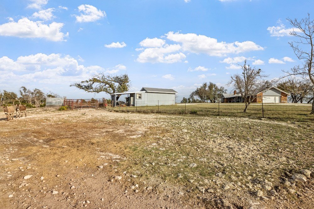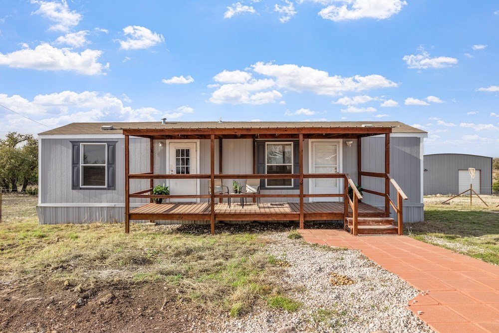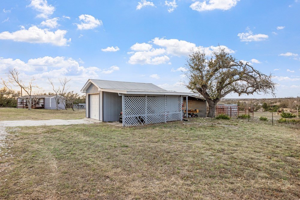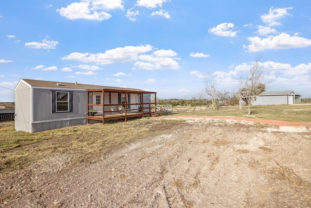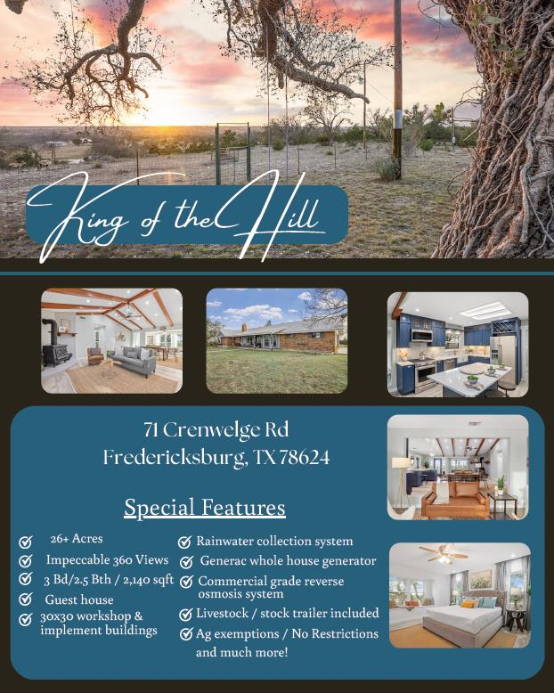 KING OF THE HILL – Imagine waking up to breathtaking panoramic views from your own private hilltop retreat. Set on 26.62 acres, this newly renovated 2,566 sq ft home turns everyday living into an extraordinary experience. Inside you will love the natural light flooding the living space. The great room steals the show with its soaring vaulted ceilings, exposed wood beams, and a cozy wood-burning stove, making it nice and cozy on chilly nights. The beautifully updated kitchen features premium cabinetry, stunning countertops, and a farmhouse sink positioned perfectly to let you drink in miles of countryside views while you cook. An open-concept layout seamlessly connects the kitchen, dining, and living areas, making entertaining a breeze. The master bedroom feels like a luxury hotel room, with wraparound windows that frame the spectacular gorgeous property views, along with a nicely updated bathroom with a walk-in shower and generous walk-in closet. The two guest bedrooms are equally spacious, while the shared guest bath also boasts beautiful updates and a nice walk-in shower. Plus, the home office just off the living room, gives the flexibility to convert to a 4th bedroom. That's just the beginning. This property is built for both comfort and practicality, equipped with an oversized utility room with half bath right off the kitchen and connected to the garage and offers additional storage. You will also love spending time in the sun-drenched den, perfect for reading and relaxing with a cup of coffee or evening beverage. The den could even be converted to an art studio for those with creative pursuits.. you name it! But wait there's more! The home is equipped with a Generac whole house generator in place with dedicated LP tank, 2,500 gallon rainwater collection system, water softener system, commercial grade reverse osmosis system and standing seam metal roof providing years of low maintenance. Also, Livestock is included to keep ag exemption and your taxes low along with a stock trailer. OUTSIDE – Did I mention the views that can be had anywhere on the hill top! The outdoor amenities are just as impressive, including a 3030 workshop with a roll up door – perfect for car enthusiasts. There is also a great implement barn and lean-to shed for livestock. In addition, there is a third stage building and workshop making for no shortage of space for all your toys and precious items. The covered RV parking area is equipped with water and power supply in place. GUEST HOUSE/STR OPPORTUNITY – Another bonus is the 1-bedroom, 1-bathroom mobile home on site which makes a great guest house for anyone making an extended stay or allowing the option to convert into a short-term rental. Even the mobile home offers amazing views from the front porch. If you are into the short-term rental business, the property includes two septics in place, one of which is tied into the existing mobile home but could be made to serve an additional bed and breakfast unit converting the place to a STR complex! You'll love spending time outside watching the multitude of wildlife transverse your property making the morning coffee routine something to be savored. Come take a look at everything this property has to offer and you will truly feel like the King of the Hill!