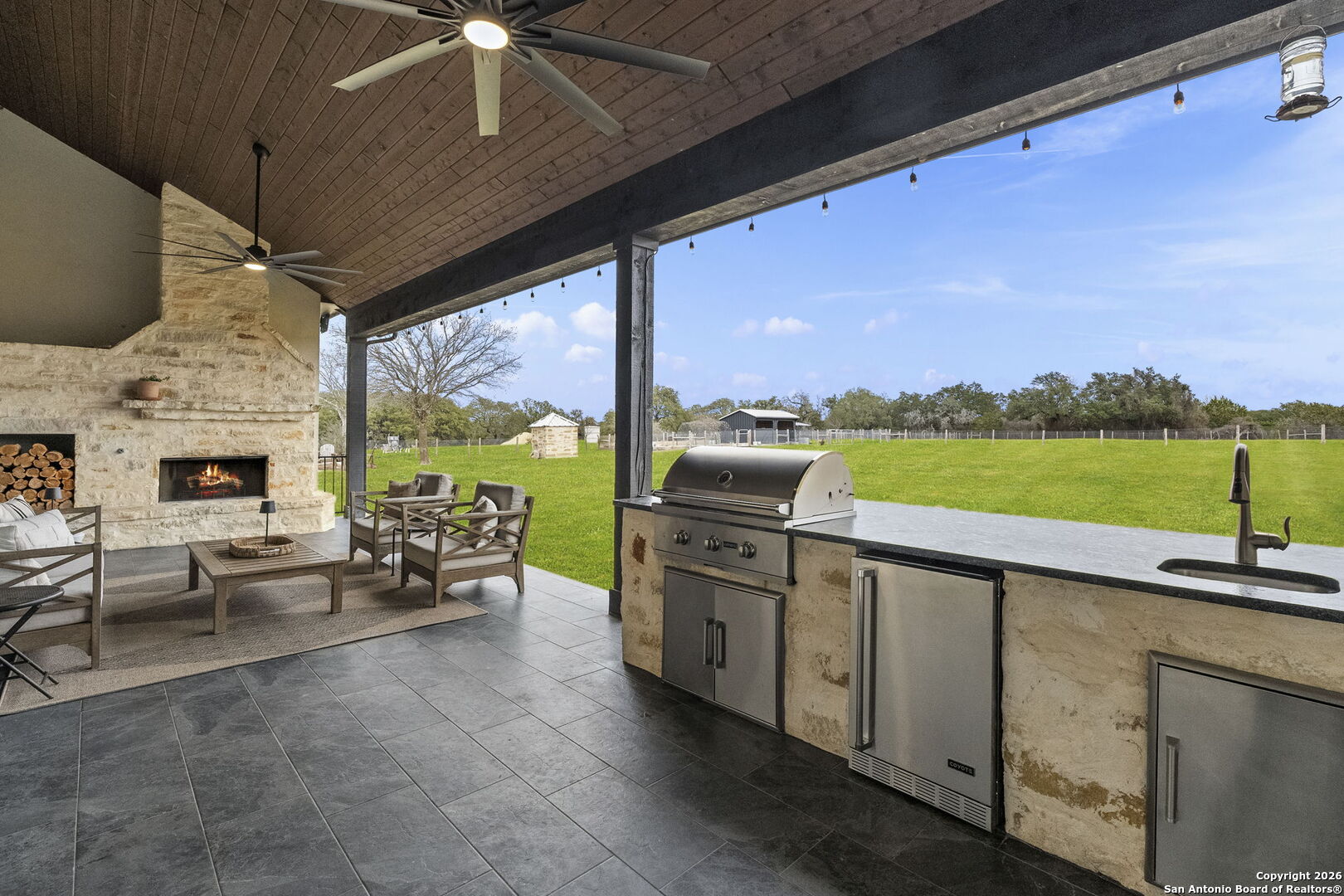 Modern ranch-style custom home on 4.21 acres in the gated community of Sabinas Creek Ranch, sits just outside of Boerne. This beautifully designed home features high ceilings, an open-concept layout, and a modern kitchen with a huge island, ideal for entertaining. Enjoy outdoor living on the back patio with a cozy outdoor fireplace overlooking your private field with expansive views. A rare blend of modern finishes, privacy, and Hill Country living, Horses and other animals welcome! Three car insulated garage with is own dedicated HVAC Unit.