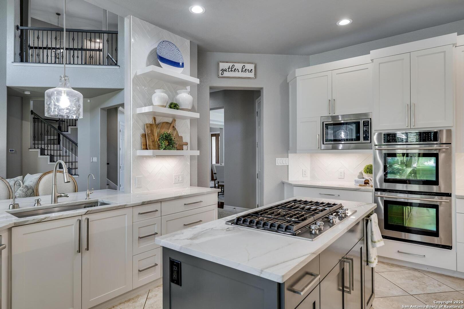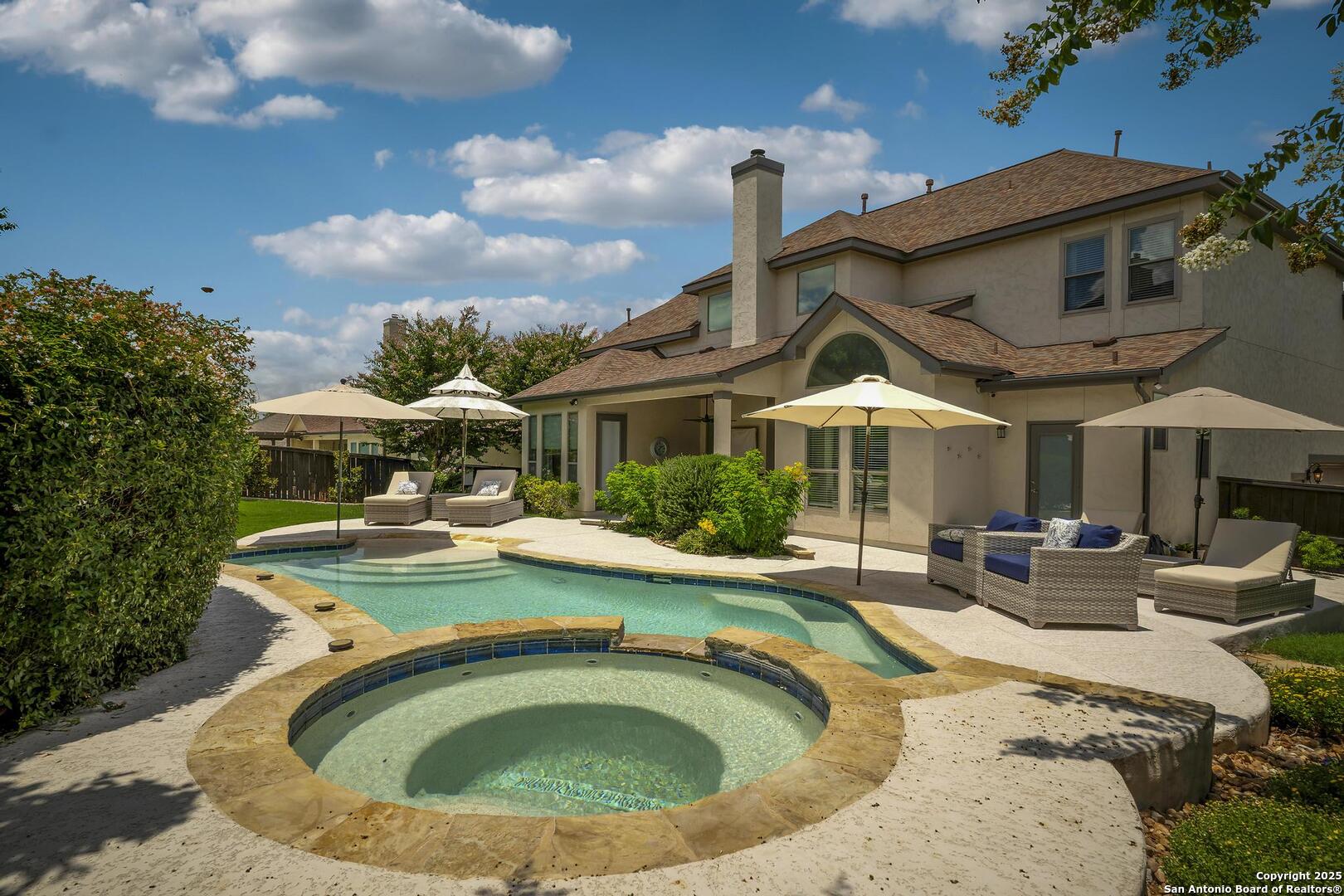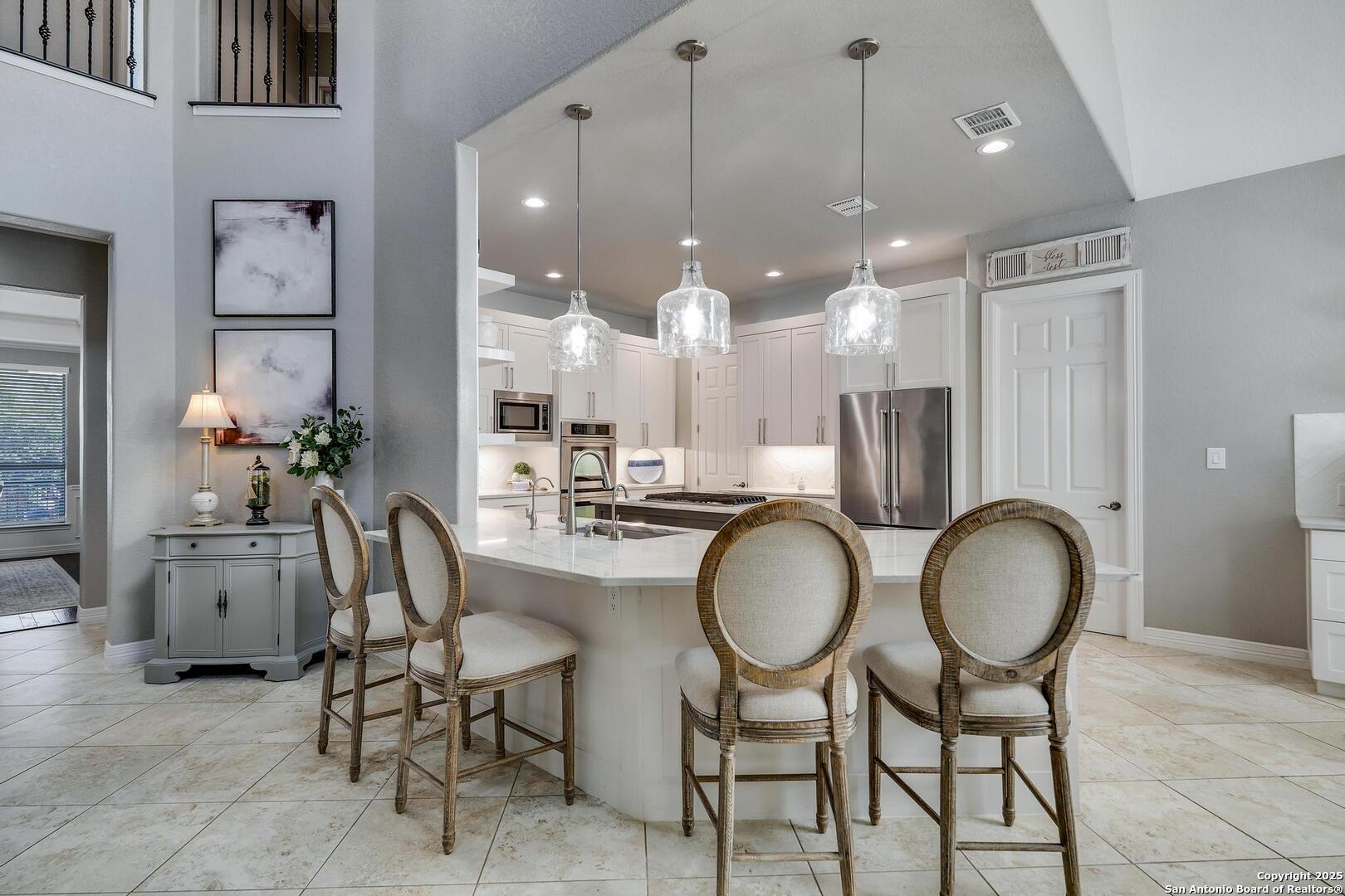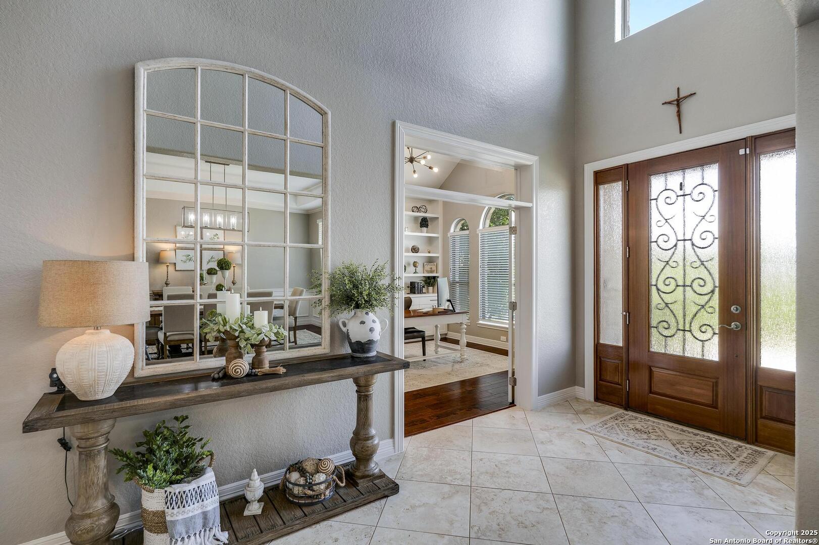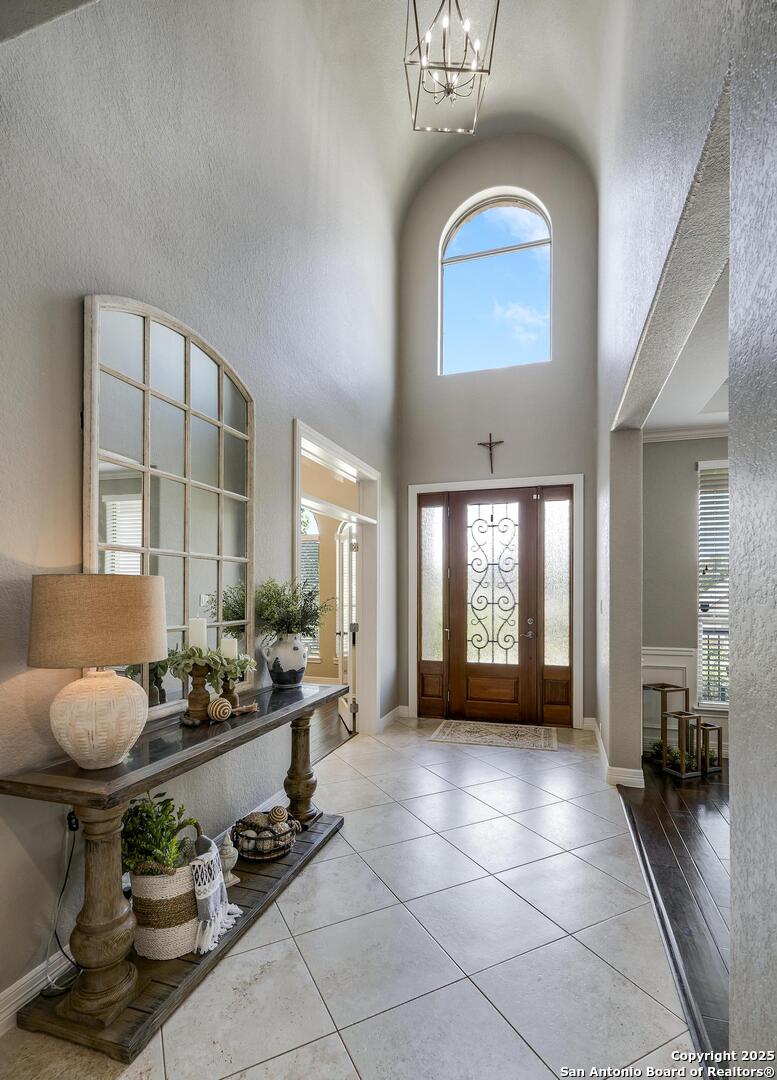 This Magnificent Mediterranean home is located in the boutique neighborhood of Mesas at Canyon Springs. Boasting 2 stories with soaring ceilings & nestled on a third-of-an-acre, you'll spend many hours swimming and lounging in the newly resurfaced, sparkling, salt-water pool & spa. This home is filled with many designer touches and a neutral palette with a timeless interior and was exquisitely updated in 2022. A few of the updates include - A state-of-the-art kitchen designed with affluent comfort including Mont Blanc Quartzite countertops, soft close cabinets, Herringbone Oyster backsplash, a coffee/beverage bar with a 44 bottle wine cooler, Kitchen Aid Cooktop with 5 gas burners, Reme Halo whole home in-duct air purifier for the freshest air, a Mistaway Mosquito Control System in the backyard, a laundry room with ample storage and adjoining pool, powder bath and a new roof was installed in 2021. You will love, the peaceful, expansive Master suite with outdoor access to the covered patio. The upgraded home office with built-ins make it the ideal space to work from home. 3 generously sized additional bedrooms are upstairs. The second floor is completed with a spacious game room for recreation and entertainment & a full wet bar. The Covered patio leads to the spacious, serene, manicured backyard. Once you see this thoughtfully designed home, you'll want to immerse yourself in the refined lifestyle it has to offer. Come in take a look around and stay for awhile or stay forever.