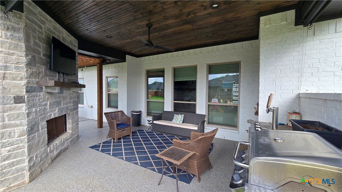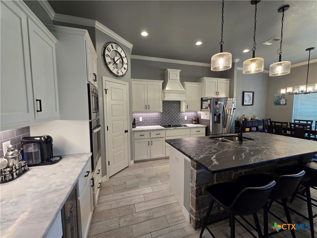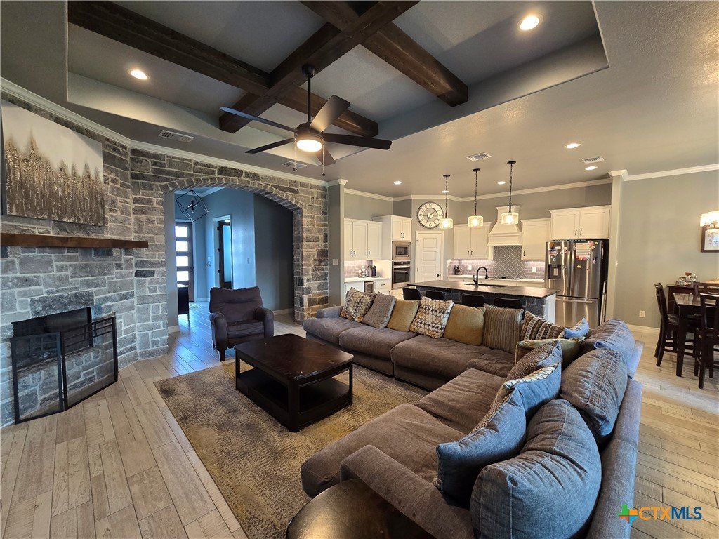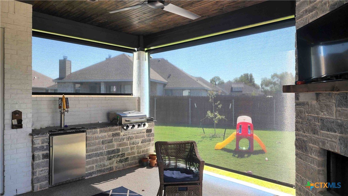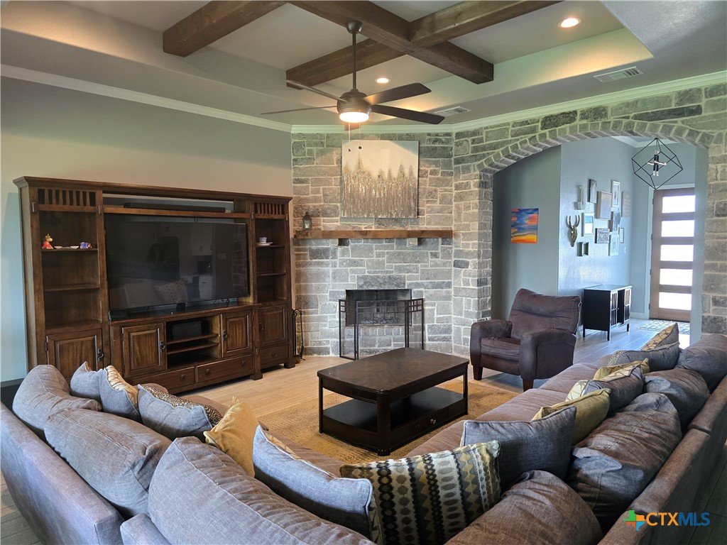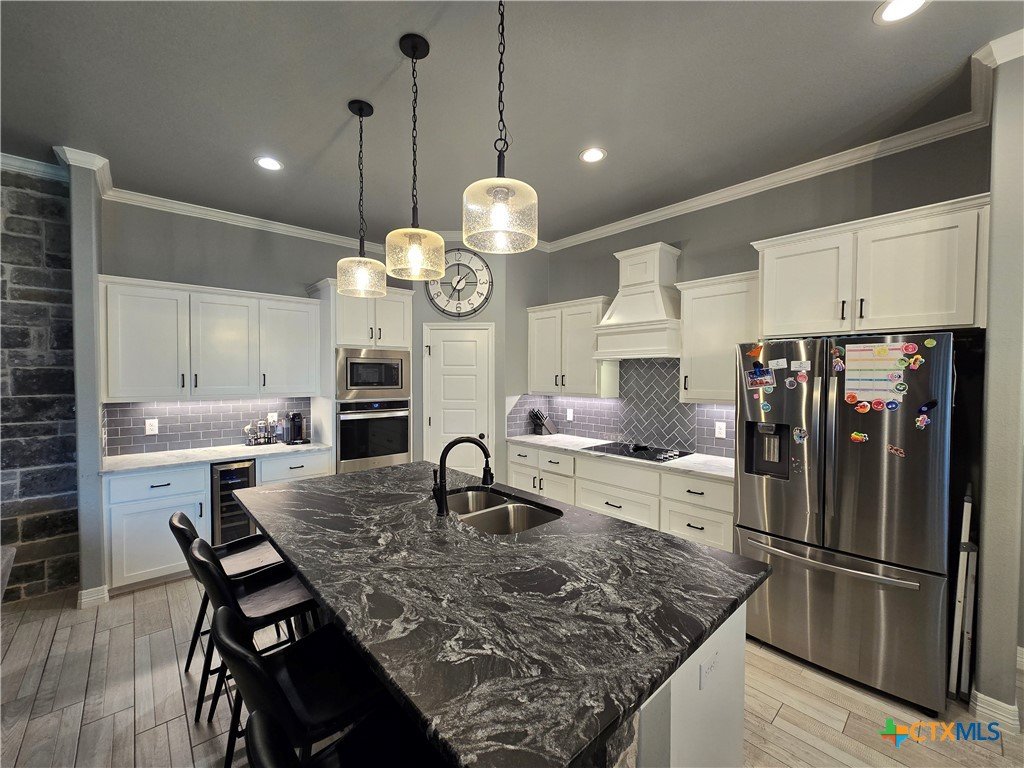 Welcome to Valley Ranch! Step inside this Cul-de-sac located, custom built, Eagle Ridge home, with the perfect blend of modern and Texas Hill Country styles. Includes 4 bedrooms, 3 full bathrooms and an office. Walk through the stone archway into the spacious open concept living area, featuring a trayed ceiling with large wood beams and a stone wood burning fireplace. The kitchen features a large granite topped island, built-in wine cooler, under cabinet lighting and ceramic tile backsplash. Next comes the primary suite, including a trayed ceiling, and beautiful in-suite bathroom with a large soaking tub and separate stone arched shower with sliced stone flooring, as well as a three tiered walk-in closet. The secondary bedrooms share a Jack and Jill full bathroom and the guest bedroom has it’s own full hall bathroom. The backyard boasts plenty of custom features including a large outdoor fireplace, built-in propane grill and a commercial grade triple tap outdoor rated kegerator, as well as a 7-seat spa/hot tub covered by a custom built pergola and roller solar shades. Priced to sell at below tax appraised value. Seller will pay up to 3% in buyer’s concessions. Agent is owner. Call today for a private tour.