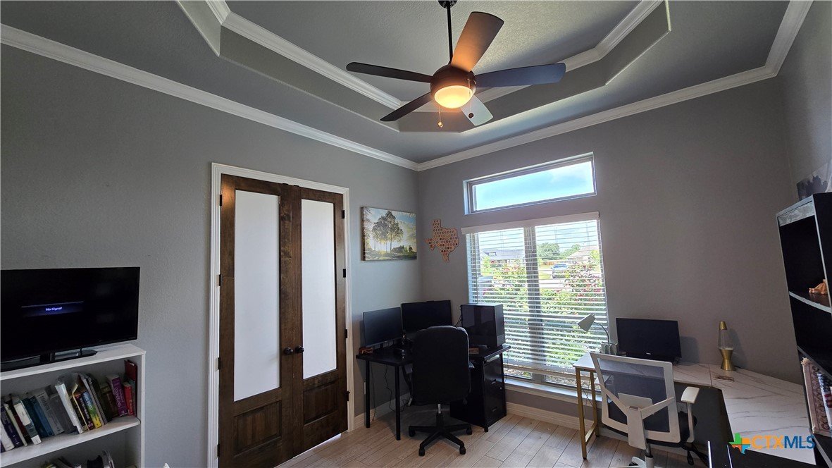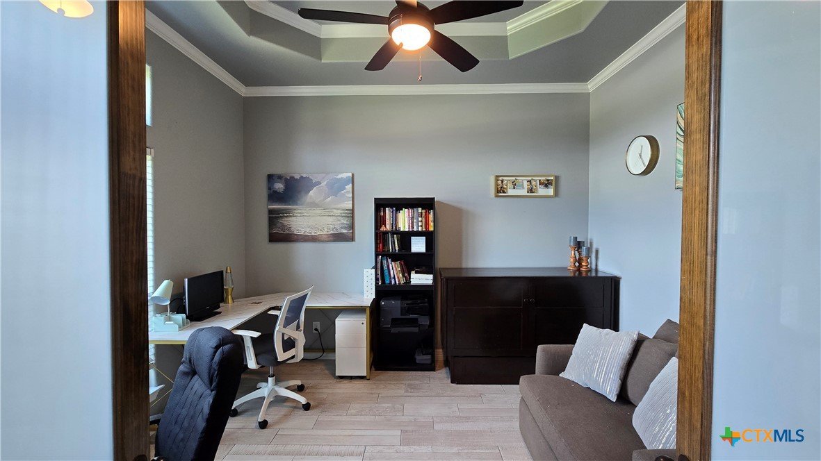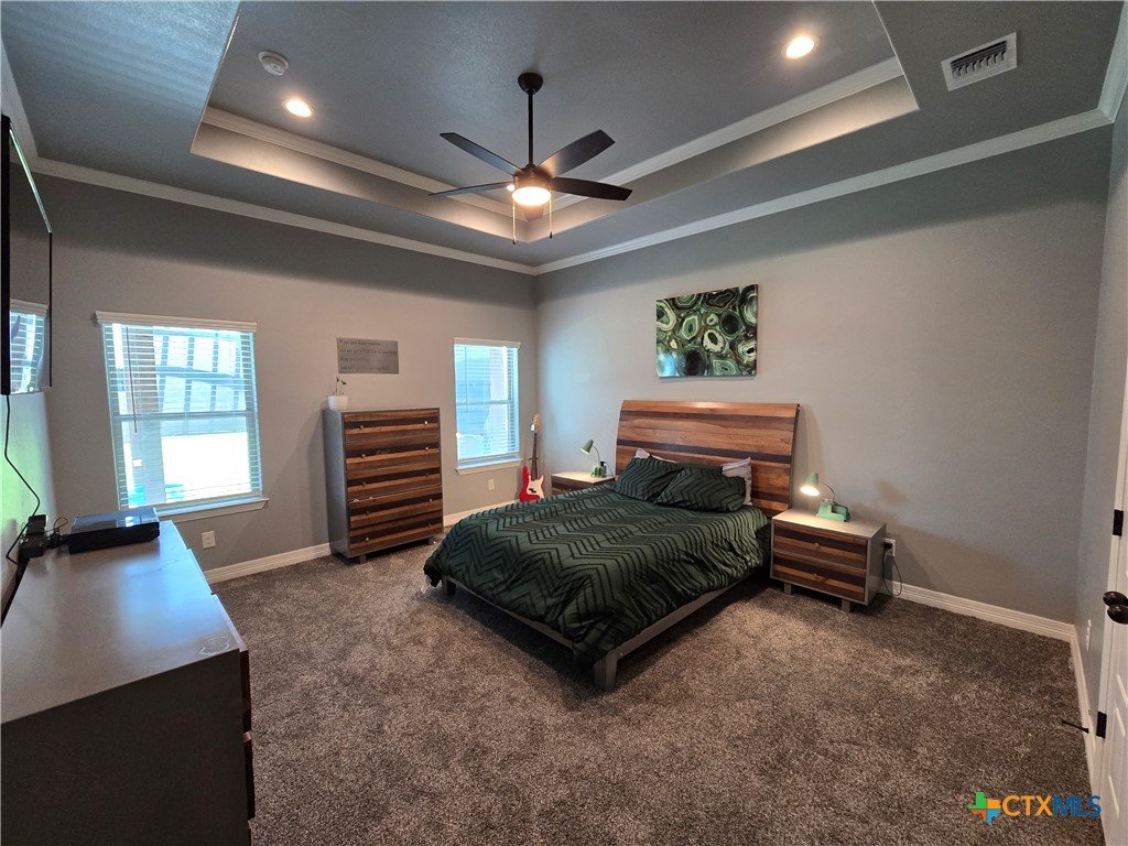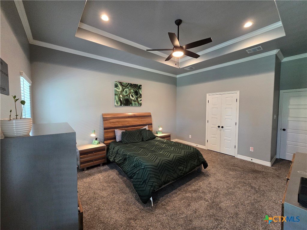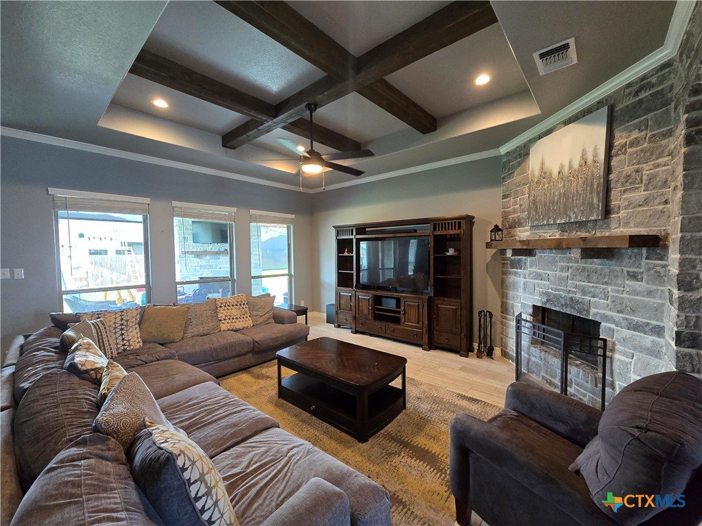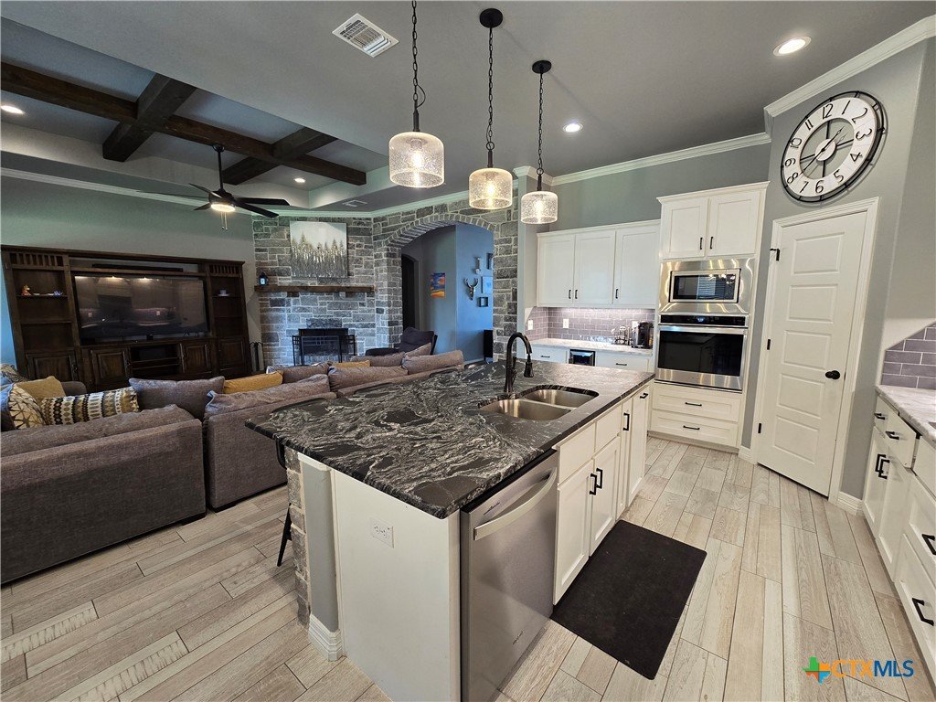 Welcome to Valley Ranch! Step inside this Cul-de-sac located, custom built, Eagle Ridge home, with the perfect blend of modern and Texas Hill Country styles. Includes 4 bedrooms, 3 full bathrooms and an office. Walk through the stone archway into the spacious open concept living area, featuring a trayed ceiling with large wood beams and a stone wood burning fireplace. The kitchen features a large granite topped island, built-in wine cooler, under cabinet lighting and ceramic tile backsplash. Next comes the primary suite, including a trayed ceiling, and beautiful in-suite bathroom with a large soaking tub and separate stone arched shower with sliced stone flooring, as well as a three tiered walk-in closet. The secondary bedrooms share a Jack and Jill full bathroom and the guest bedroom has it’s own full hall bathroom. The backyard boasts plenty of custom features including a large outdoor fireplace, built-in propane grill and a commercial grade triple tap outdoor rated kegerator, as well as a 7-seat spa/hot tub covered by a custom built pergola and roller solar shades. Priced to sell at below tax appraised value. Seller will pay up to 3% in buyer’s concessions. Agent is owner. Call today for a private tour.