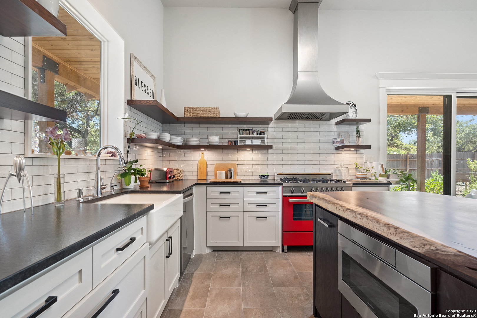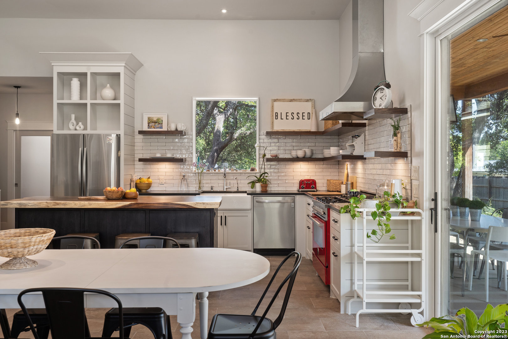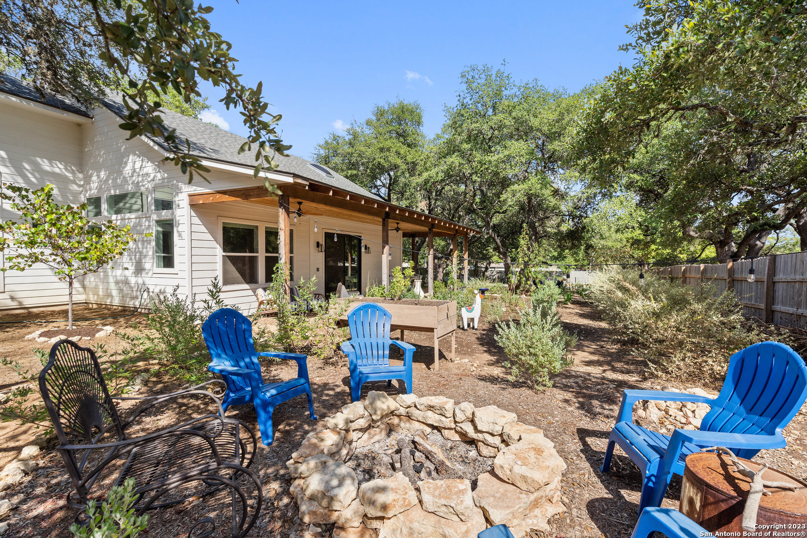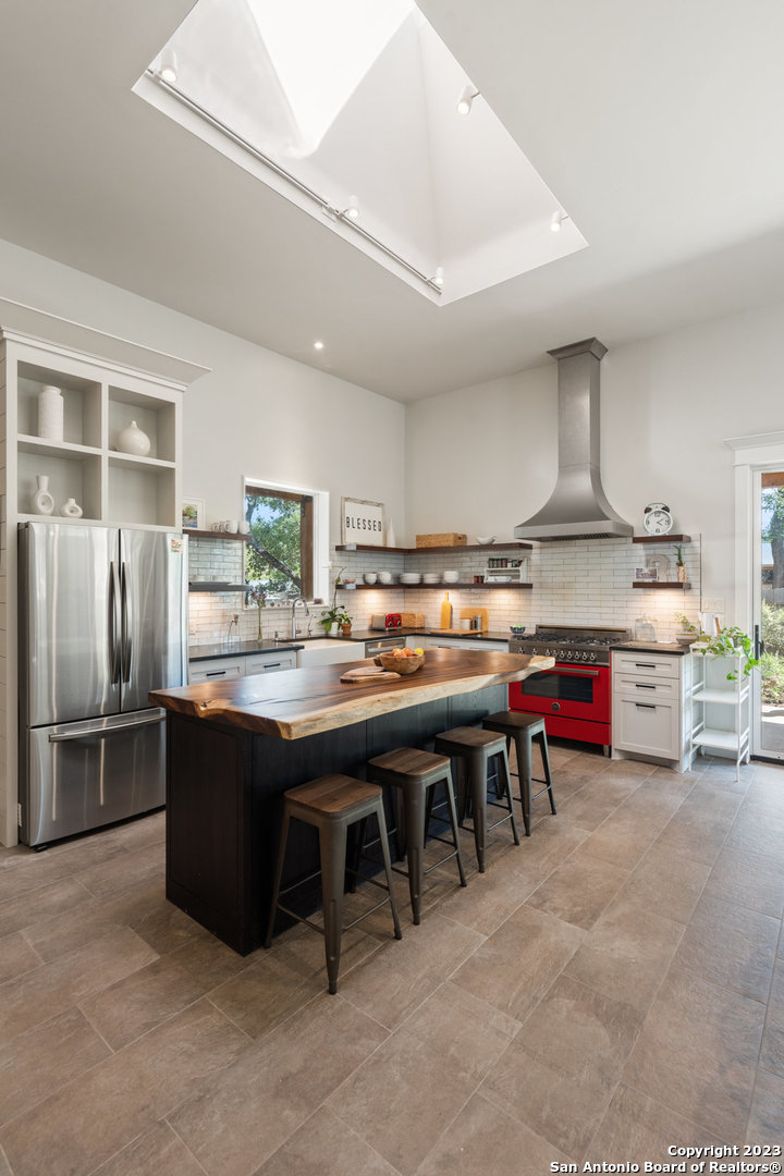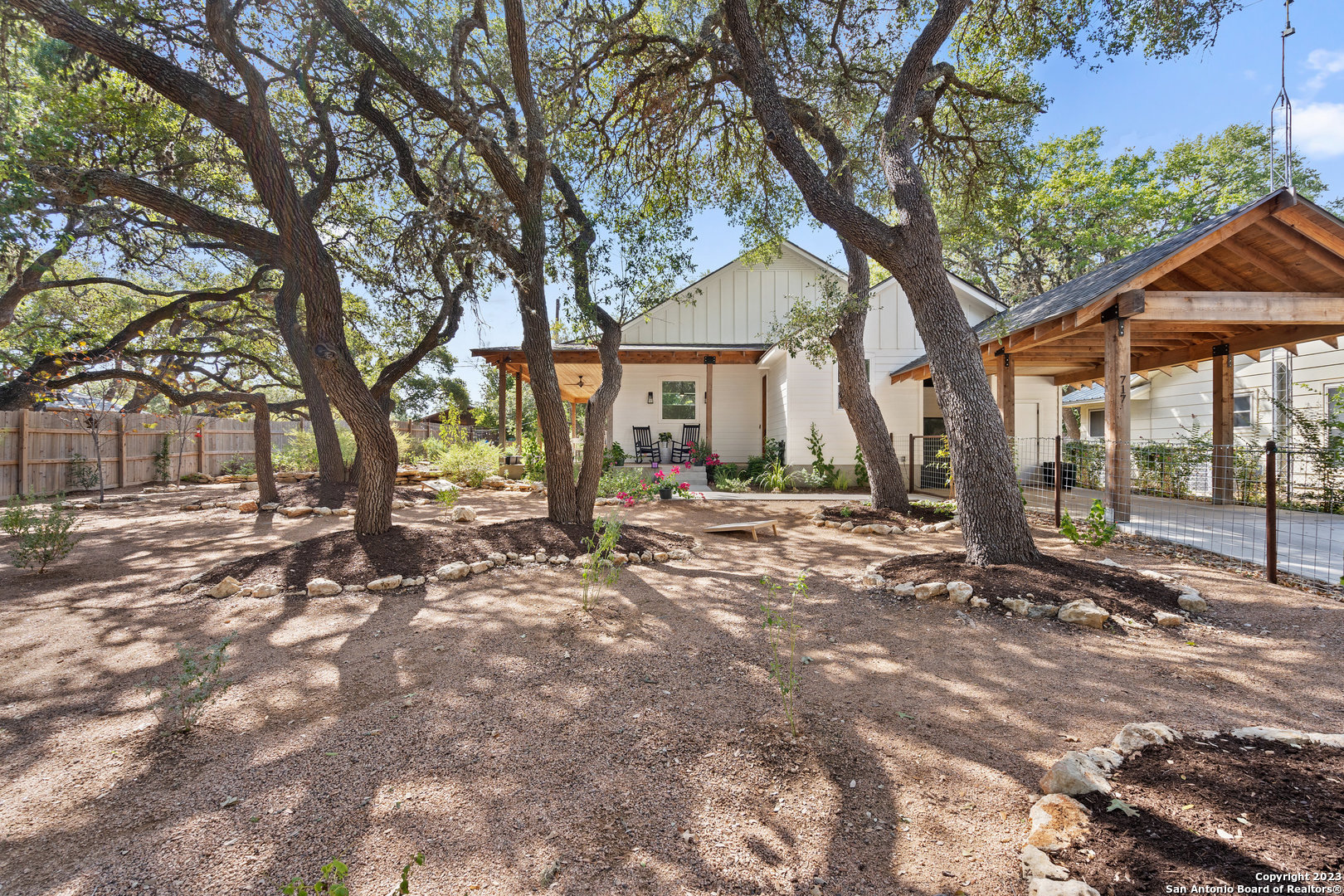 Custom built, modern farmhouse style home nestled among 100-year-old shade trees. Available furnished or unfurnished. Walking distance from downtown restaurants, shopping and the Blanco river. Located in the heart of The Texas Hill Country, but only 40 minutes from two major urban centers (Austin and San Antonio). This home is thoughtfully situated on a beautiful lot completely covered with native xeriscape, butterfly and herb gardens. Crushed granite walkways, small grass area for pet, two outdoor fire pit areas and custom ranch style metal fence adds to the Texas farmhouse charm. The home offers 3 Bedrooms, 2 full baths with a luxurious kitchen that comes with pearl white subway tile, floating mahogany shelves with recess lighting and durable black granite countertops. New stainless steel french door fridge with ice maker. The oversized, beautiful parota wood kitchen island seats four comfortably. Artful, chimney style skylight with track lighting illuminates the kitchen during the day and night. Chef-style, red Italian Bertazzoni Professional Series 6 burner gas stove and gas oven will elevate your cooking experience. Enjoy coffee in the morning and wine at happy hour on the cedar, wrap around porch with recess lighting and ceiling fans. 15ft. ceilings, over-sized windows, recess lighting, built in cabinets and modern ceiling fans throughout this gallery style home. Private, spacious master bedroom suite with large windows adds to the zen like design. Spacious master bathroom with oversized bathtub, walk in shower, private toilet room and huge walk in closet with custom built shelves and storage. Life in The Texas Hill Country never looked or felt better. Slate grey floors throughout the house. Custom fit, high end Hunter-Douglas Duette Cellular Shades illuminate sunlight, keep the house cool and add privacy.