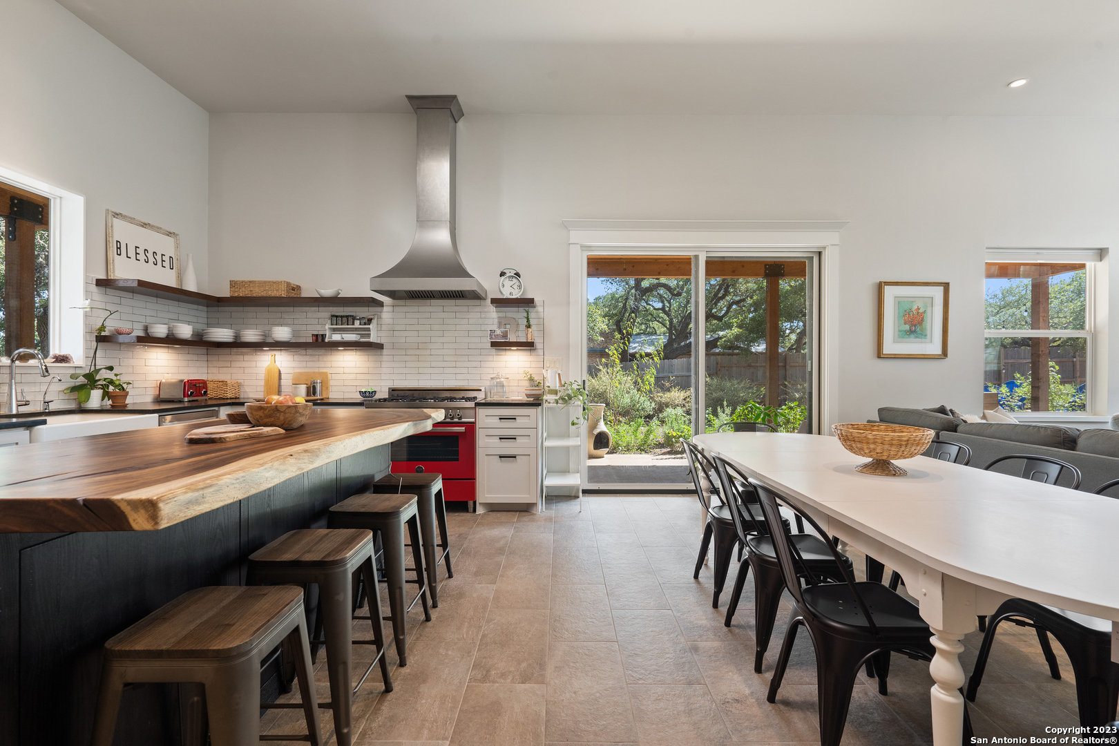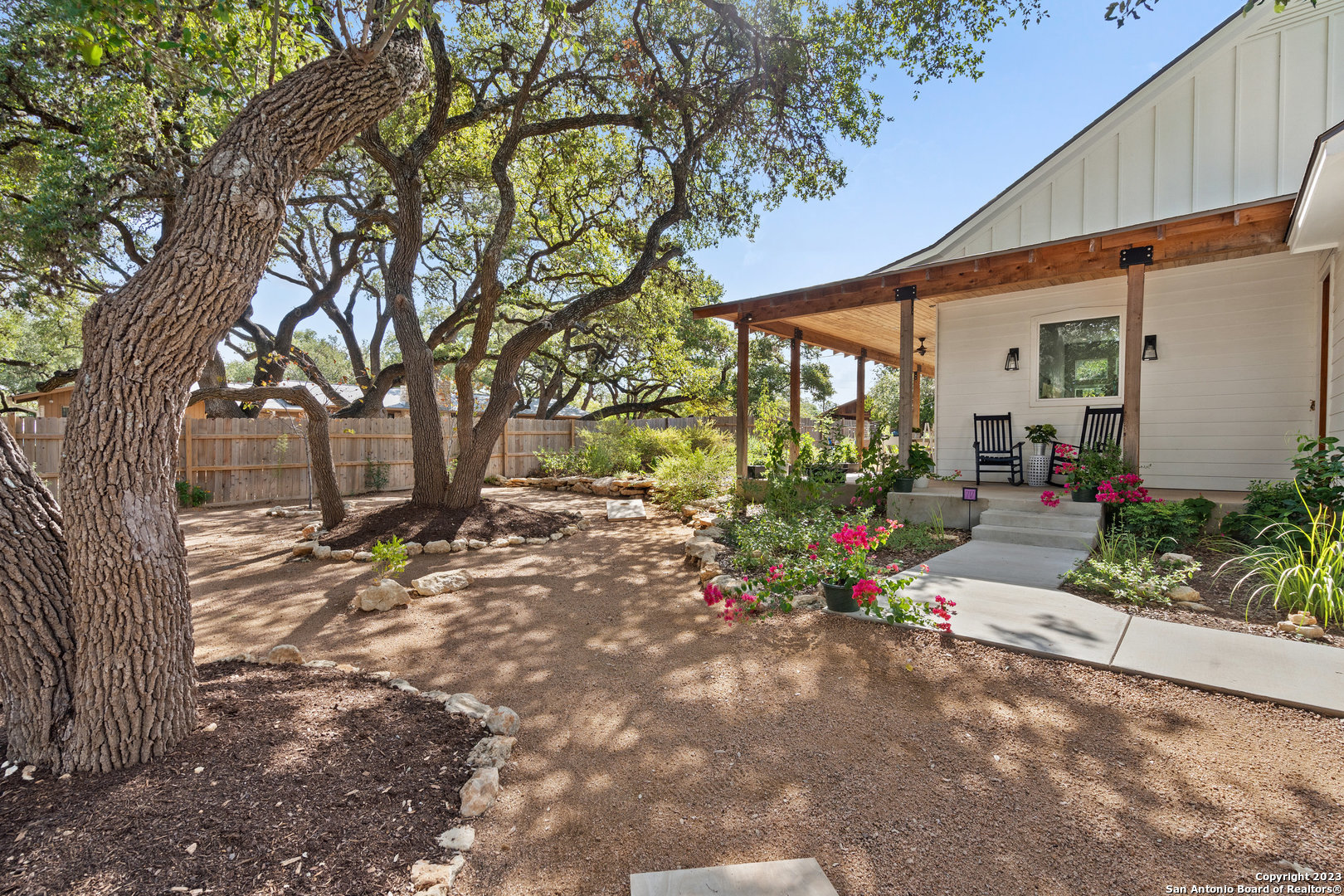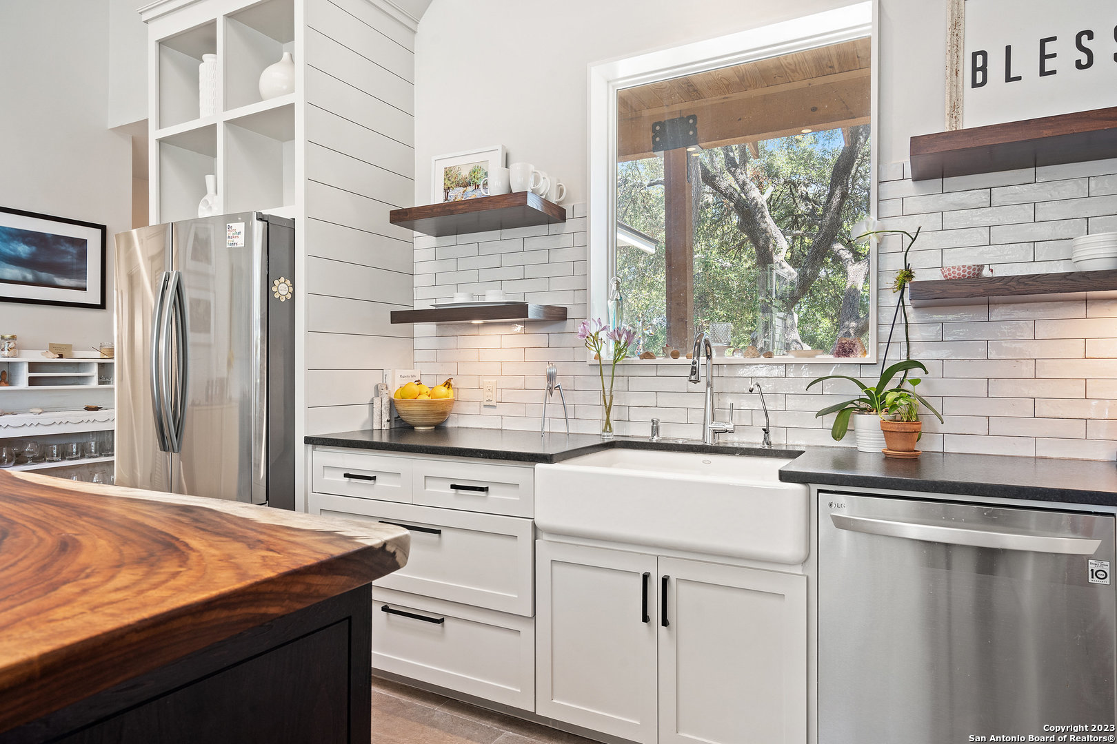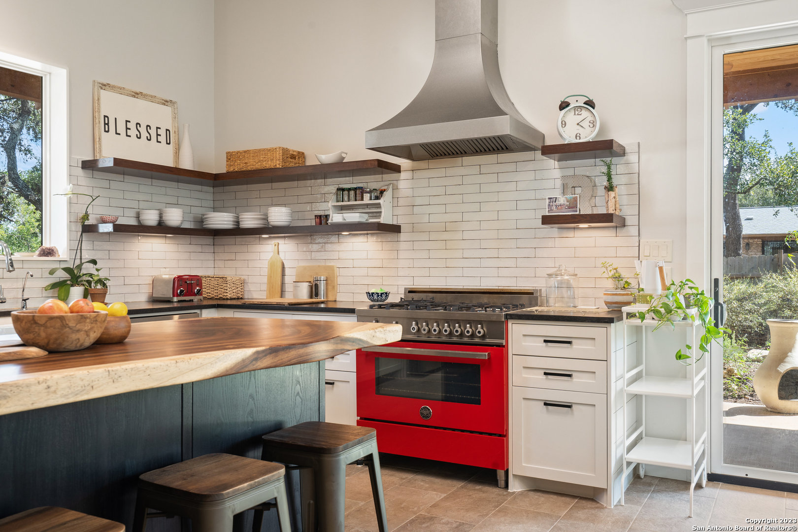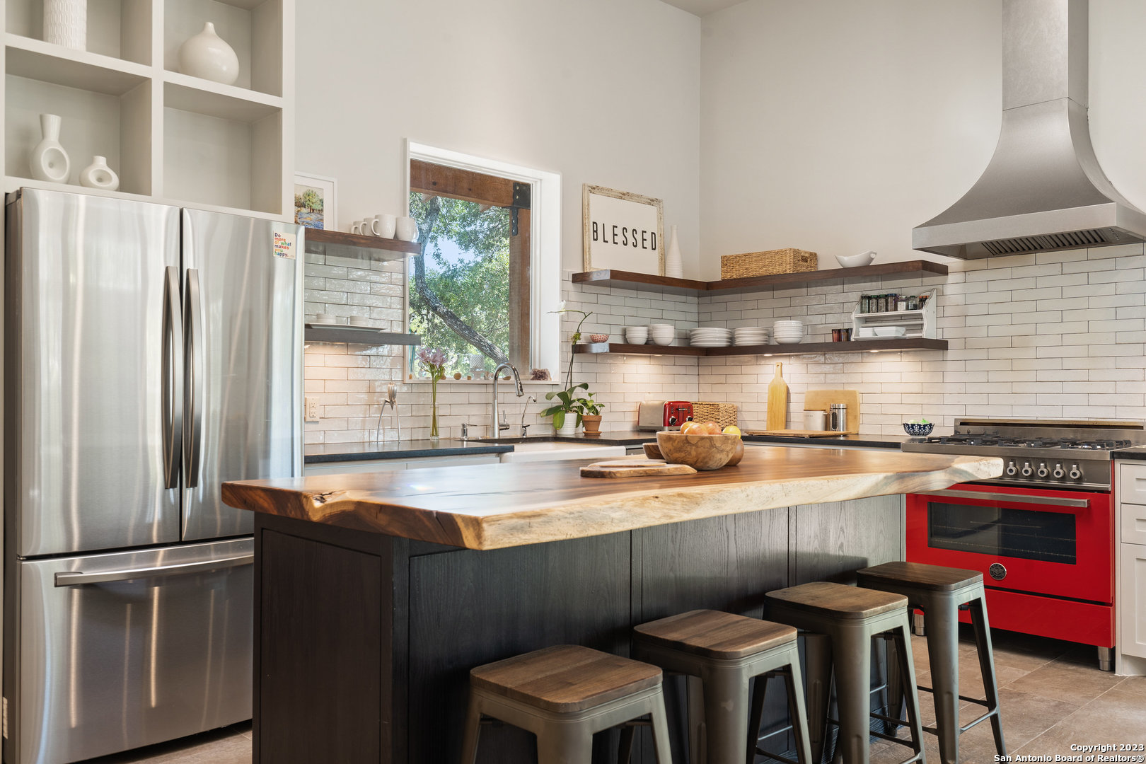 Custom built, modern farmhouse style home nestled among 100-year-old shade trees. Available furnished or unfurnished. Walking distance from downtown restaurants, shopping and the Blanco river. Located in the heart of The Texas Hill Country, but only 40 minutes from two major urban centers (Austin and San Antonio). This home is thoughtfully situated on a beautiful lot completely covered with native xeriscape, butterfly and herb gardens. Crushed granite walkways, small grass area for pet, two outdoor fire pit areas and custom ranch style metal fence adds to the Texas farmhouse charm. The home offers 3 Bedrooms, 2 full baths with a luxurious kitchen that comes with pearl white subway tile, floating mahogany shelves with recess lighting and durable black granite countertops. New stainless steel french door fridge with ice maker. The oversized, beautiful parota wood kitchen island seats four comfortably. Artful, chimney style skylight with track lighting illuminates the kitchen during the day and night. Chef-style, red Italian Bertazzoni Professional Series 6 burner gas stove and gas oven will elevate your cooking experience. Enjoy coffee in the morning and wine at happy hour on the cedar, wrap around porch with recess lighting and ceiling fans. 15ft. ceilings, over-sized windows, recess lighting, built in cabinets and modern ceiling fans throughout this gallery style home. Private, spacious master bedroom suite with large windows adds to the zen like design. Spacious master bathroom with oversized bathtub, walk in shower, private toilet room and huge walk in closet with custom built shelves and storage. Life in The Texas Hill Country never looked or felt better. Slate grey floors throughout the house. Custom fit, high end Hunter-Douglas Duette Cellular Shades illuminate sunlight, keep the house cool and add privacy.
