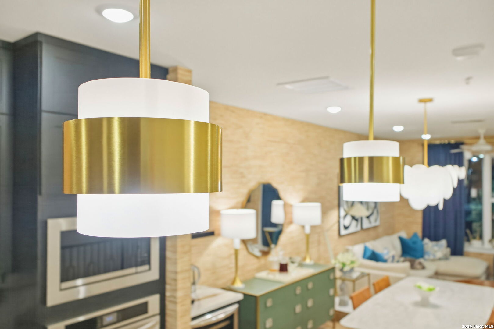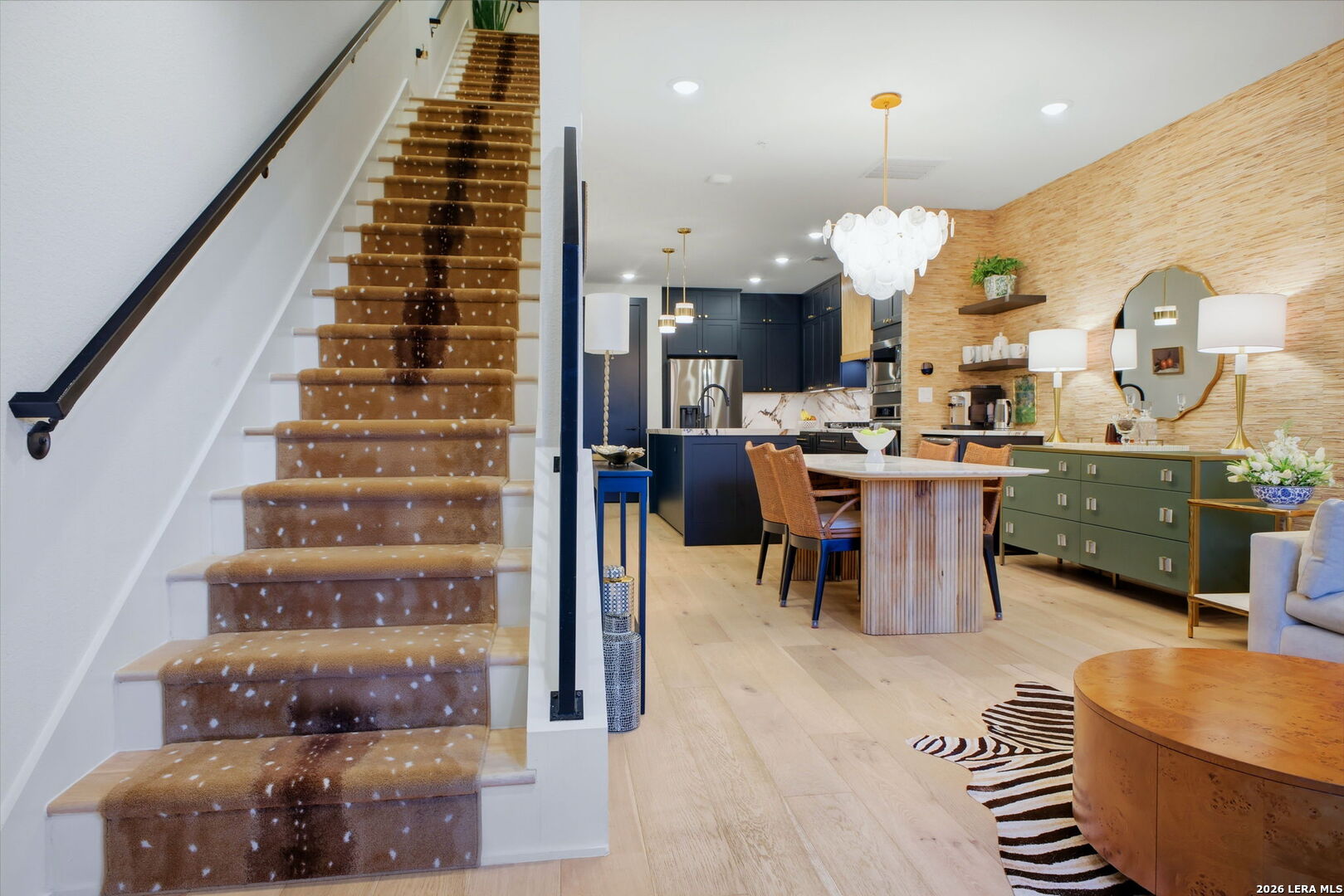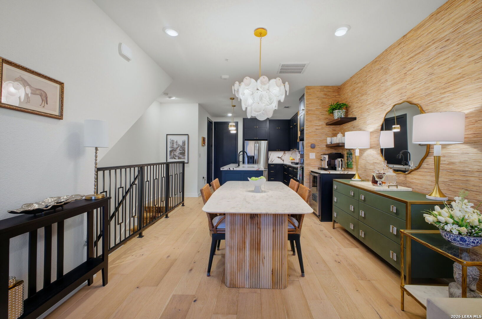 Experience refined urban living in this beautifully updated townhouse at Grayson House, just blocks from the Pearl. Though newly constructed, this home has been significantly upgraded with high-end finishes and thoughtful design throughout. Wired-brushed natural European oak engineered wood floors set the tone for the elegant interior. The kitchen has been completely refreshed with black shaker wood cabinetry, porcelain countertops and backsplash, updated hardware, sink, under-mount lighting, vent hood, and appliances. Designer touches continue into the living room with grasscloth wallpaper, a statement chandelier, and electrical enhancements. Upstairs and throughout the home, you'll find extensive improvements including new paint, wallpaper accents, added outlets, ceiling fans, and an eye-catching axis deer carpet runner on the stairs. Bathrooms feature Toto bidet toilets, updated vanities, mirrors, backsplashes, floating shelves, and stylish finishes. A Kinetico Premier Series water softener with reverse osmosis drinking water station adds comfort and quality to everyday living. Located within walking distance to the Pearl-area's exciting residential, retail, and dining growth, Grayson House offers a rare blend of modern luxury and urban convenience near the Historic Pearl District, Downtown San Antonio, St. Mary's Strip, and I-35.