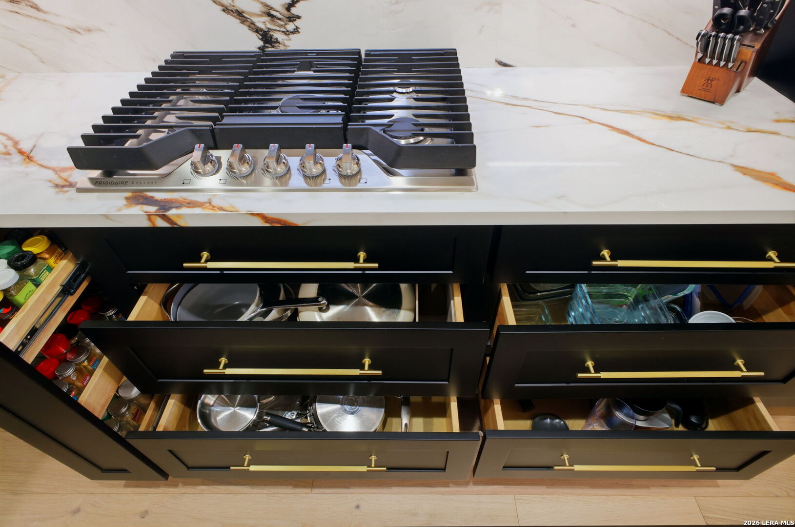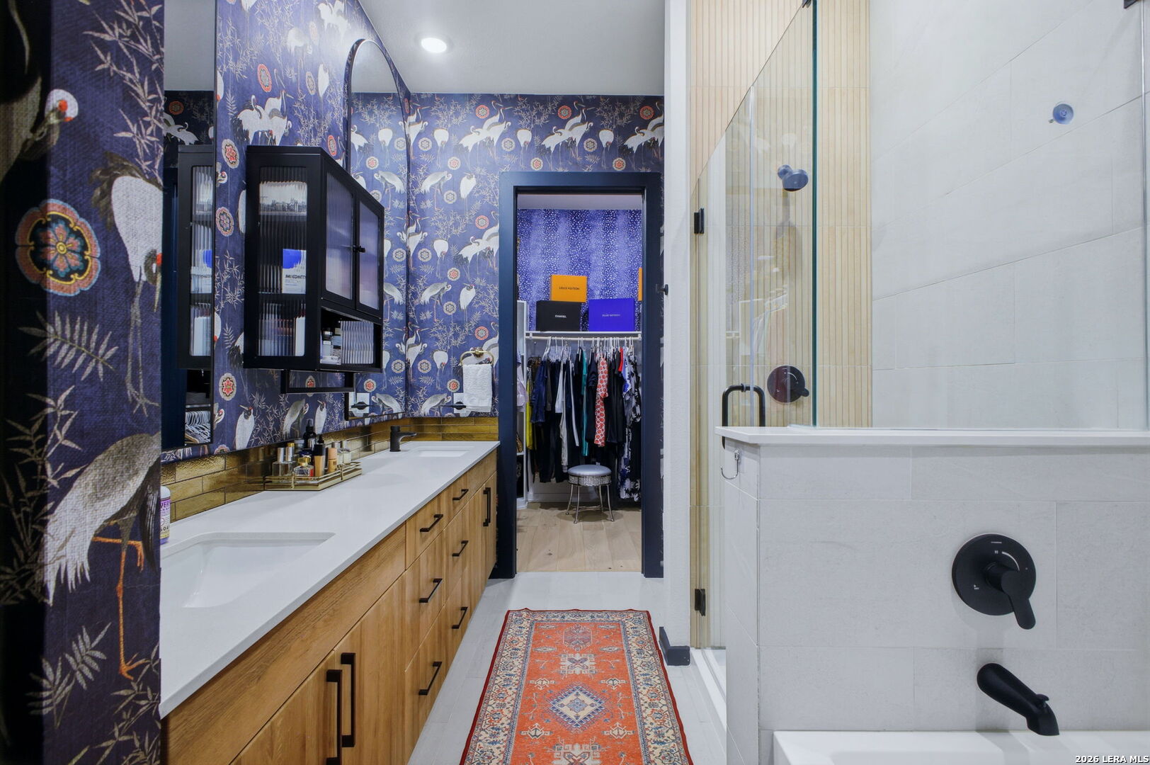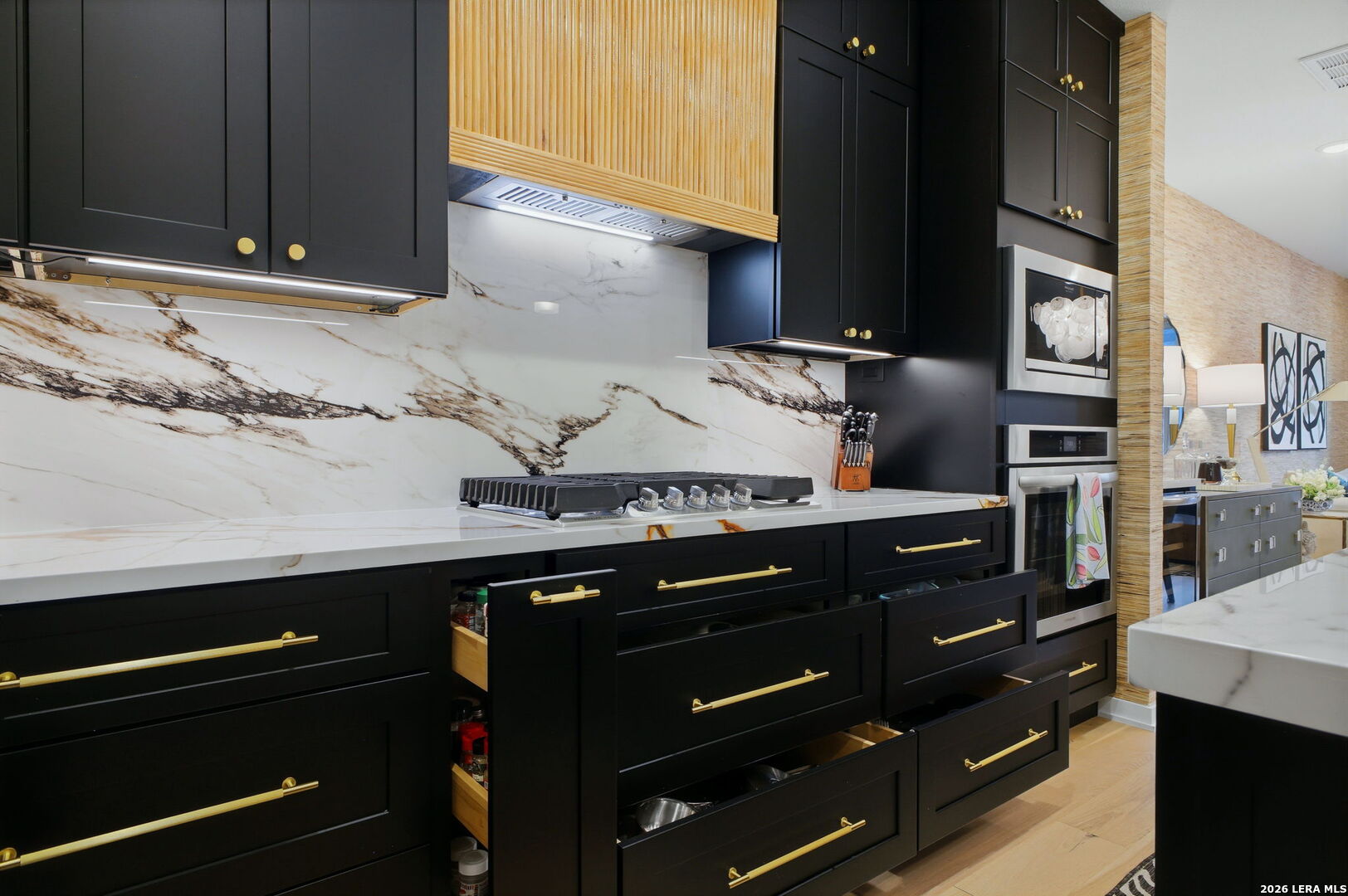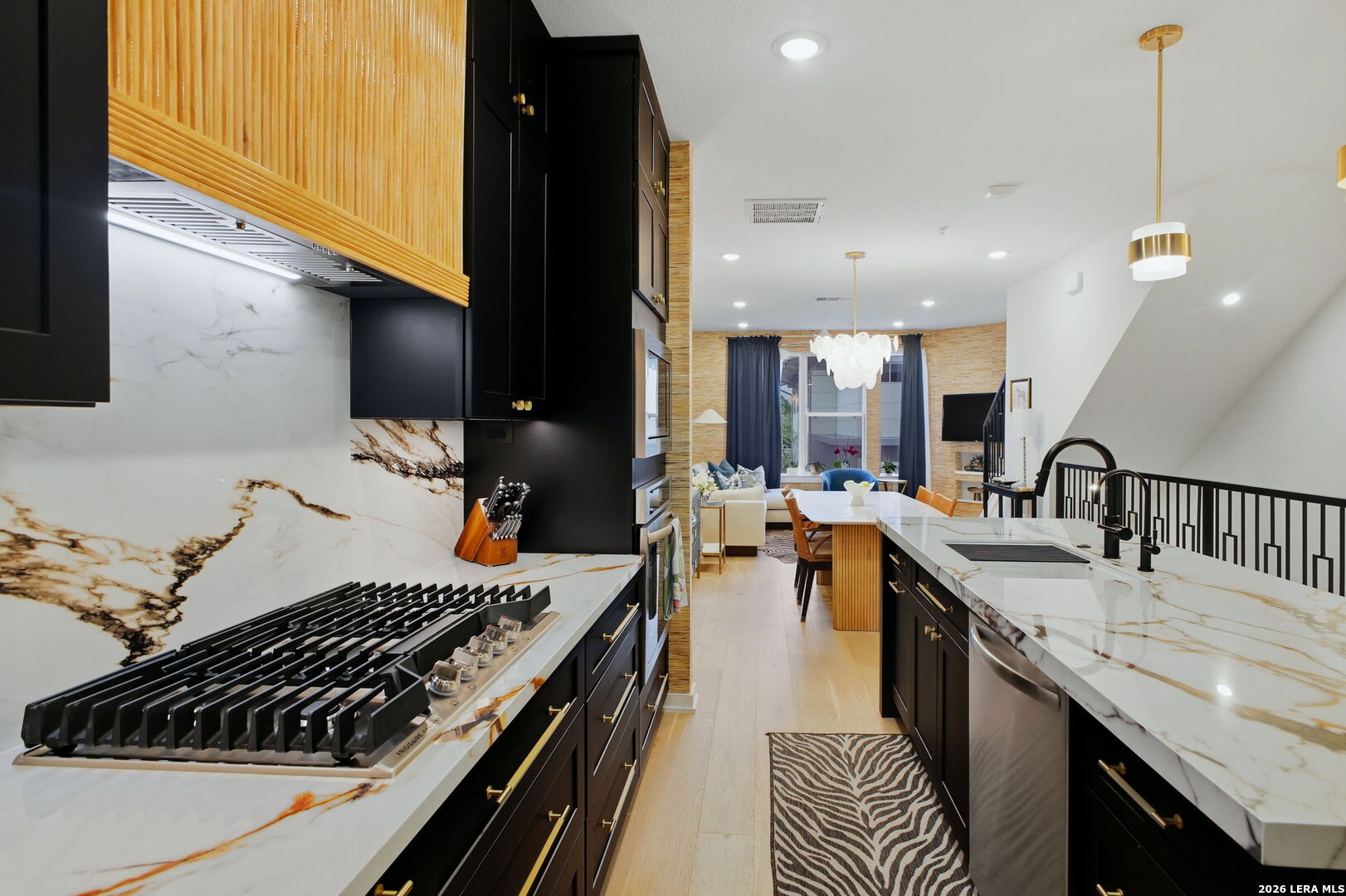 Experience refined urban living in this beautifully updated townhouse at Grayson House, just blocks from the Pearl. Though newly constructed, this home has been significantly upgraded with high-end finishes and thoughtful design throughout. Wired-brushed natural European oak engineered wood floors set the tone for the elegant interior. The kitchen has been completely refreshed with black shaker wood cabinetry, porcelain countertops and backsplash, updated hardware, sink, under-mount lighting, vent hood, and appliances. Designer touches continue into the living room with grasscloth wallpaper, a statement chandelier, and electrical enhancements. Upstairs and throughout the home, you'll find extensive improvements including new paint, wallpaper accents, added outlets, ceiling fans, and an eye-catching axis deer carpet runner on the stairs. Bathrooms feature Toto bidet toilets, updated vanities, mirrors, backsplashes, floating shelves, and stylish finishes. A Kinetico Premier Series water softener with reverse osmosis drinking water station adds comfort and quality to everyday living. Located within walking distance to the Pearl-area's exciting residential, retail, and dining growth, Grayson House offers a rare blend of modern luxury and urban convenience near the Historic Pearl District, Downtown San Antonio, St. Mary's Strip, and I-35.