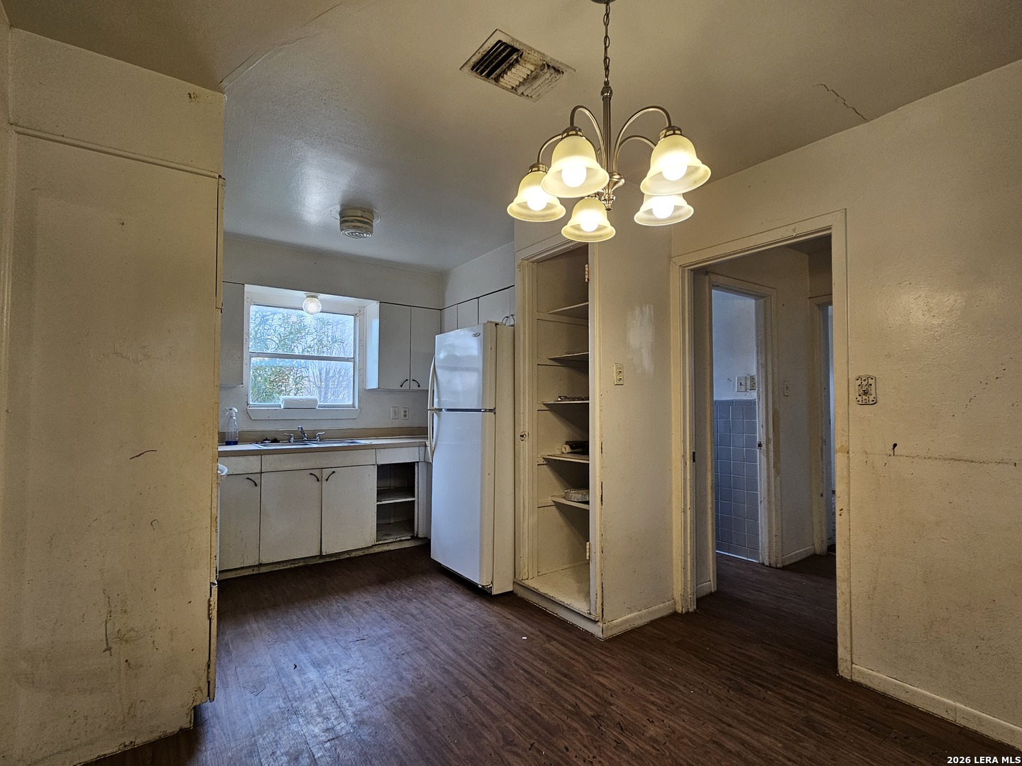 Four bedroom one full bath and a sink and shower room off the converted garage. This property has been a rental for several years. Recent roof. Needs paint and interior repairs. Good floor plan. Refrigerator stays. Good investment property for a buyer who doesn't mind putting a little work into the place.