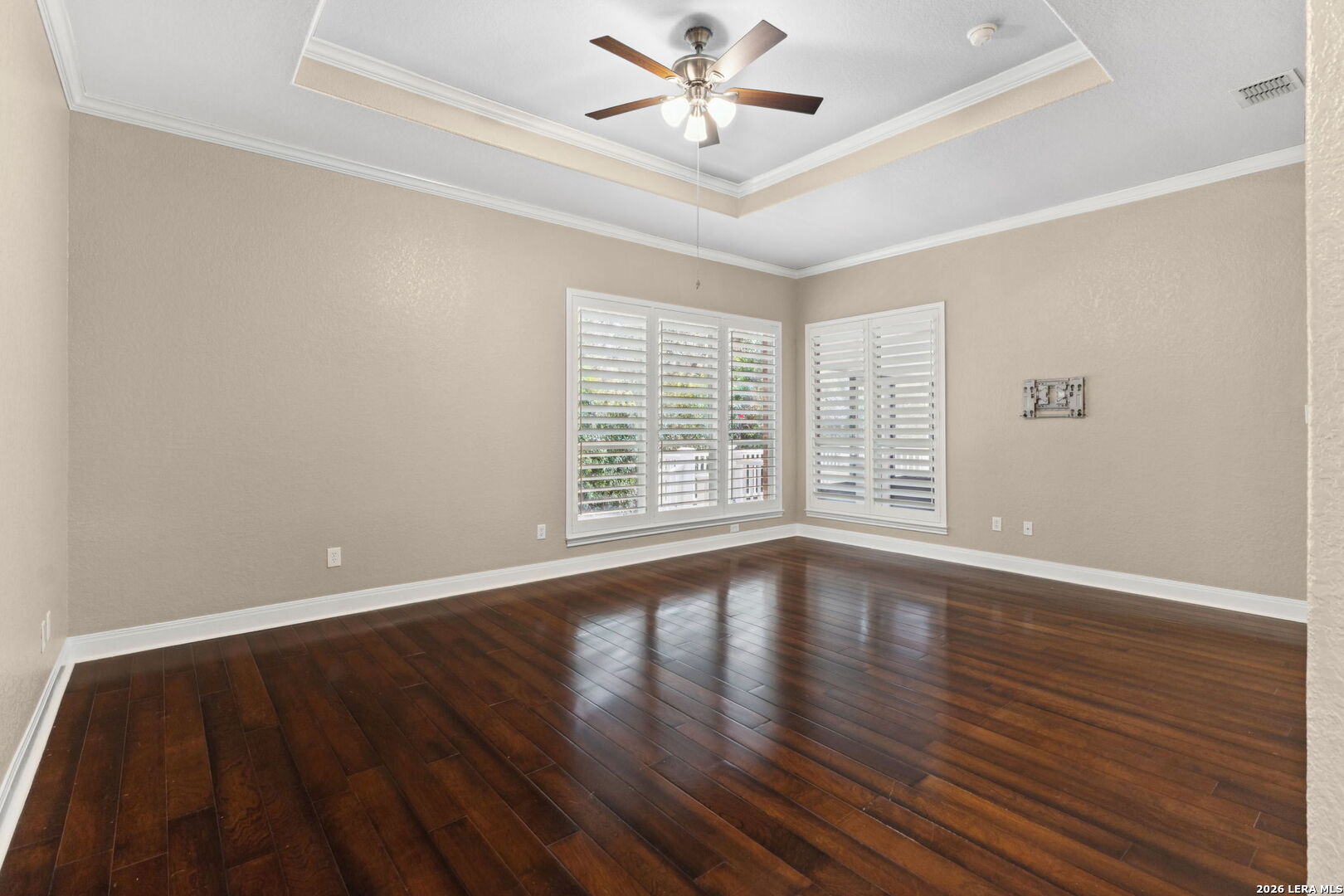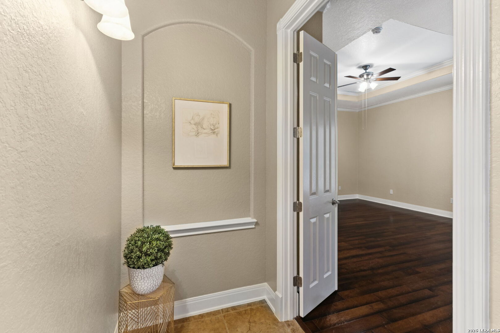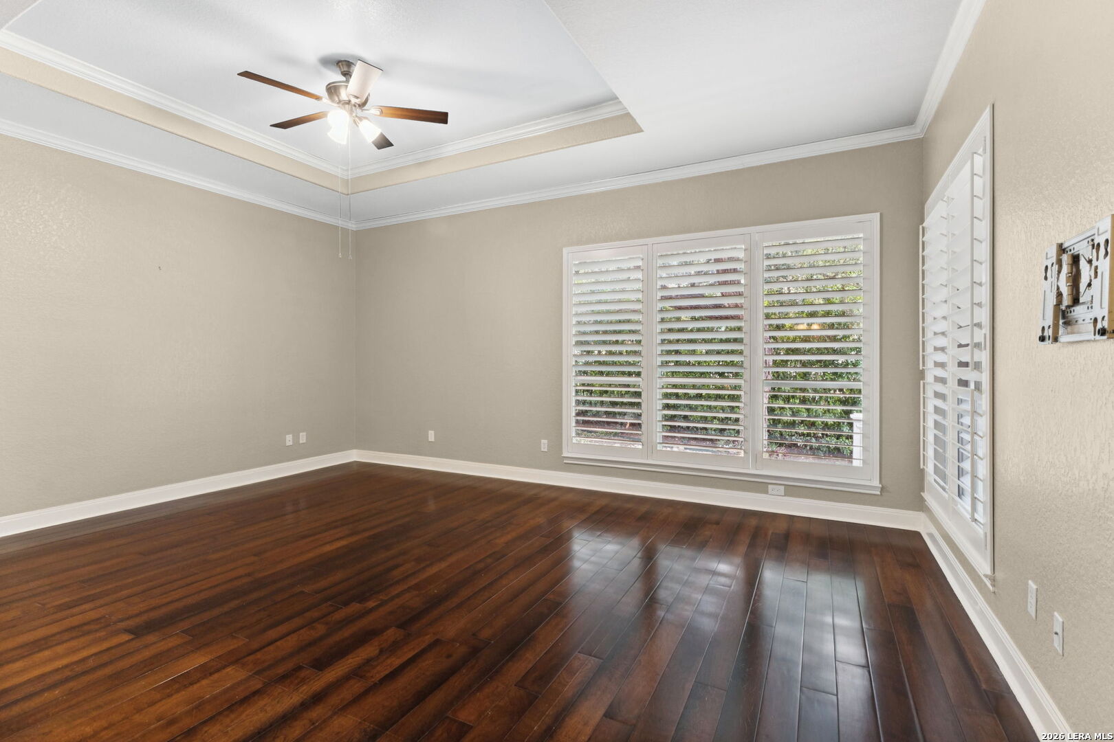NEW PRICE...Best VALUE in The Dominion. Located in the prestigious, guard-gated Dominion Reserve, this upgraded Toll Brothers home offers timeless design, generous space, and an elevated lifestyle. The brick-and-stone exterior, private courtyard entry, and side-entry three-car garage create a strong first impression. Inside, enjoy soaring ceilings, hardwood floors, plantation shutters, and abundant natural light. The open floor plan features formal living and dining areas, a spacious family room with gas fireplace, and a chef's kitchen with granite countertops, oversized island, gas cooking, commercial-grade appliances, double ovens, pantry, and butler's pantry. The main-level primary suite includes dual quartz vanities, jetted tub, oversized walk-in shower, and two walk-in closets. A first-floor en-suite bedroom offers flexibility for guests or a home office. Upstairs includes a game room, impressive home theater, loft with built-ins, and two additional en-suite bedrooms. Outdoor living offers a screened porch, extended deck with pergola, and mature landscaping. Car enthusiasts will love the side-entry three-car garage with epoxy floors and custom luxury car murals. Meticulously maintained and move-in ready. Optional Dominion Country Club membership. Easy access to I-10, La Cantera, and The Rim.