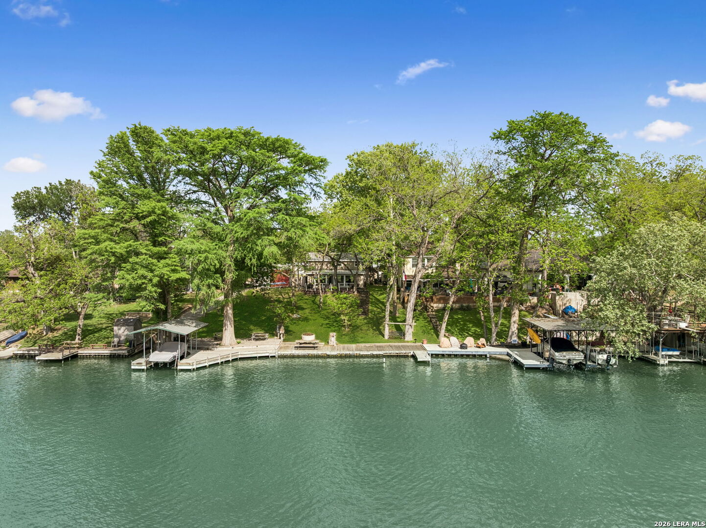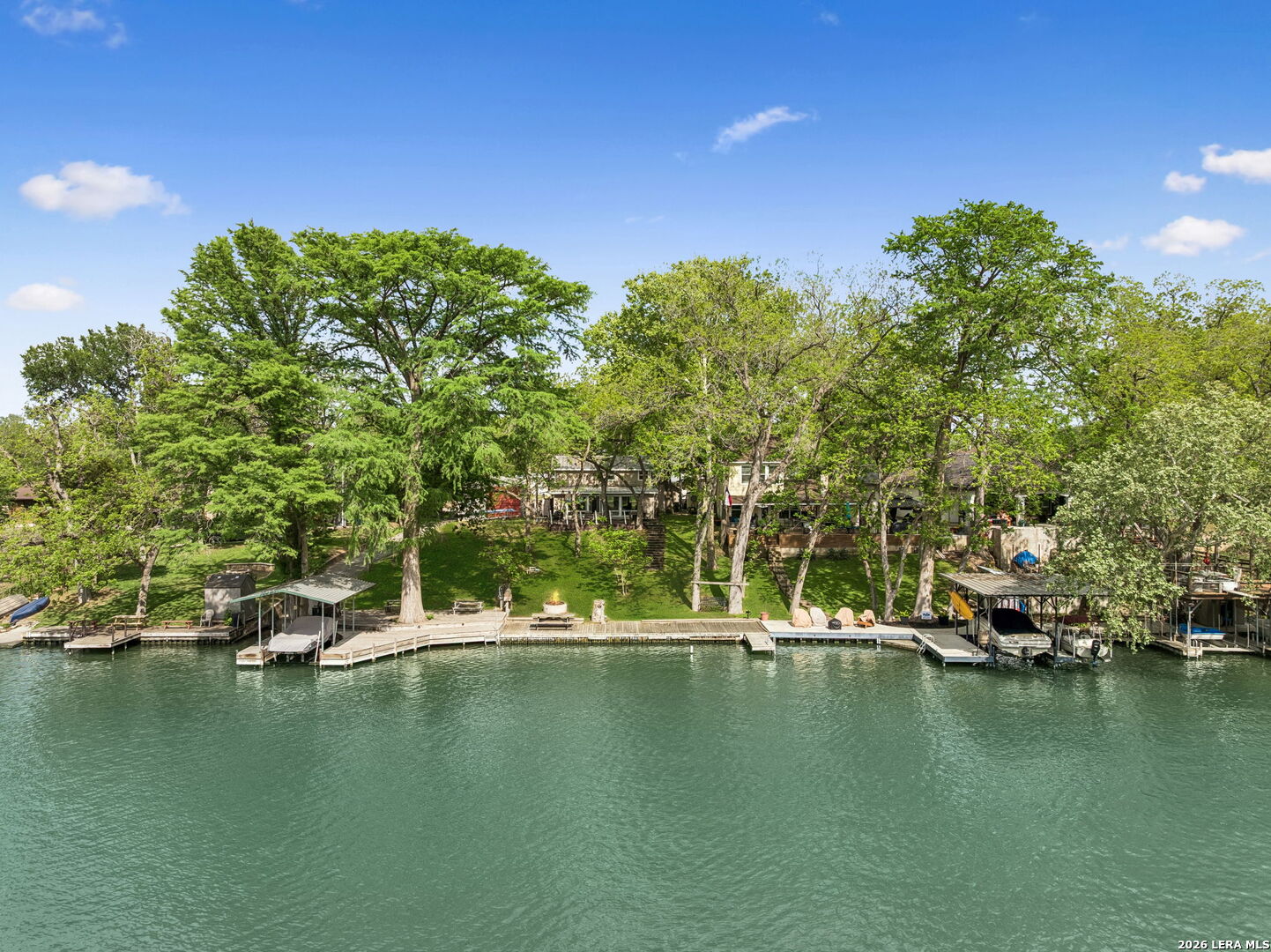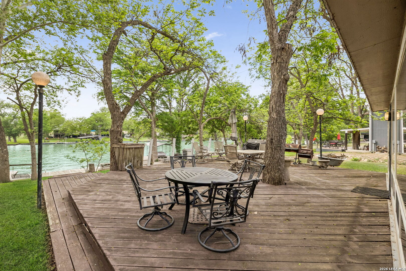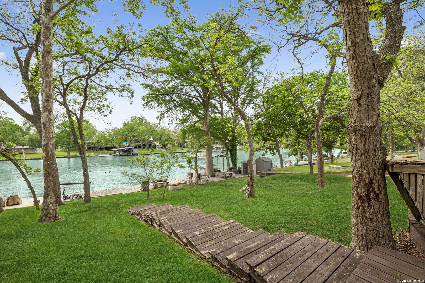 Located on a desirable stretch of Lake Dunlap, this waterfront property offers easy lake access, a gentle slope to the water, and a wood dock designed for boating, swimming, and everyday lake enjoyment. The outdoor setting features a spacious wood deck for entertaining, private swimming area, outdoor lighting, mature trees providing shade, and an outdoor shower for convenience after lake activities. Stairs lead directly to the water, creating simple and reliable access to the shoreline. Inside, the home offers comfortable living spaces with Saltillo tile flooring, abundant natural light, and scenic lake views from multiple rooms. The layout includes both living and family rooms, providing flexibility for gatherings and everyday living. A loft-style bedroom upstairs offers private guest accommodations with a half bath and elevated lake views. Additional features include a detached workshop and storage building with washer and dryer connections, built-in shelving, and concrete slab foundation.
