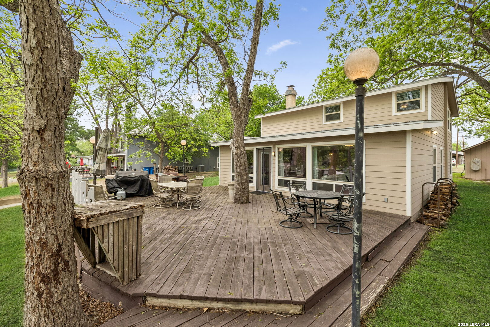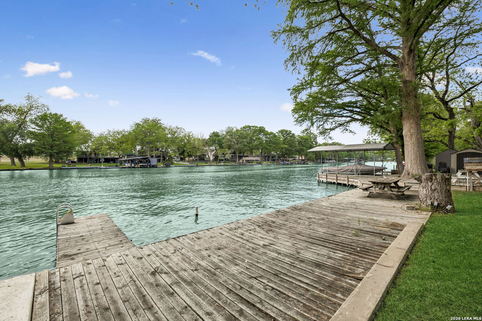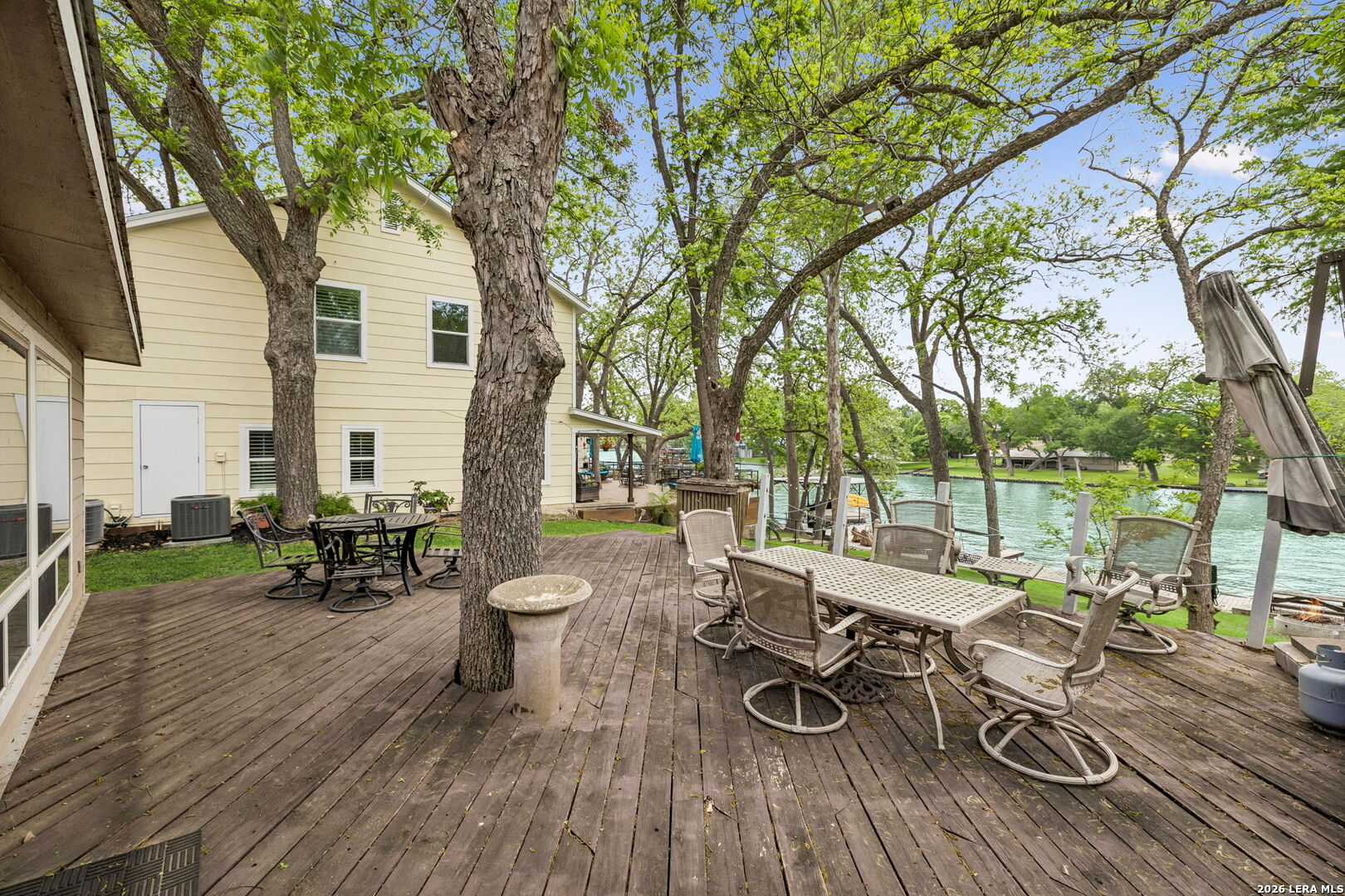 Located on a desirable stretch of Lake Dunlap, this waterfront property offers easy lake access, a gentle slope to the water, and a wood dock designed for boating, swimming, and everyday lake enjoyment. The outdoor setting features a spacious wood deck for entertaining, private swimming area, outdoor lighting, mature trees providing shade, and an outdoor shower for convenience after lake activities. Stairs lead directly to the water, creating simple and reliable access to the shoreline. Inside, the home offers comfortable living spaces with Saltillo tile flooring, abundant natural light, and scenic lake views from multiple rooms. The layout includes both living and family rooms, providing flexibility for gatherings and everyday living. A loft-style bedroom upstairs offers private guest accommodations with a half bath and elevated lake views. Additional features include a detached workshop and storage building with washer and dryer connections, built-in shelving, and concrete slab foundation.