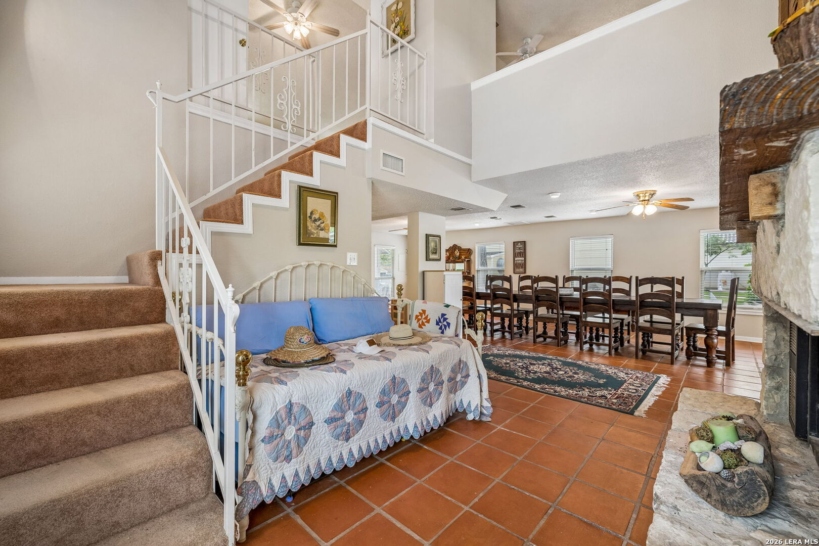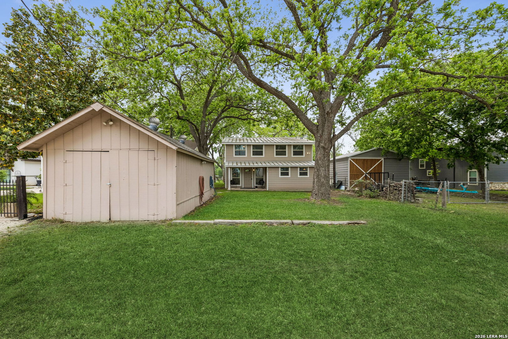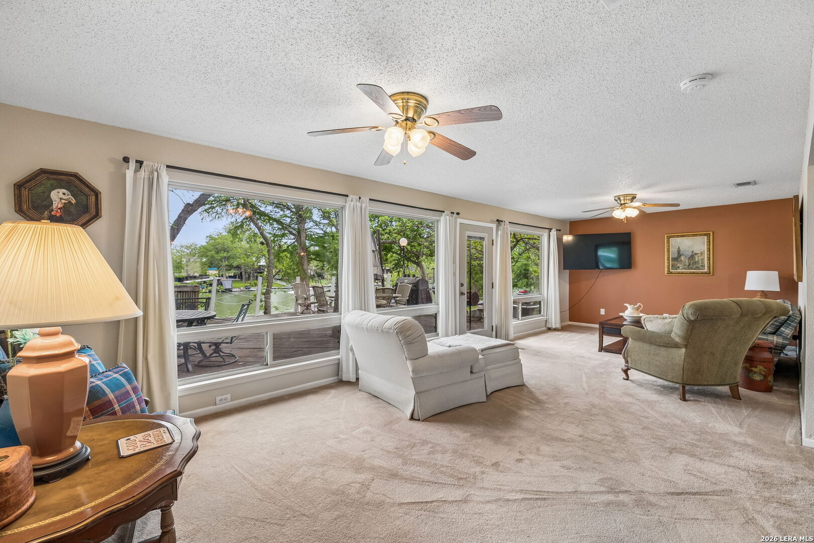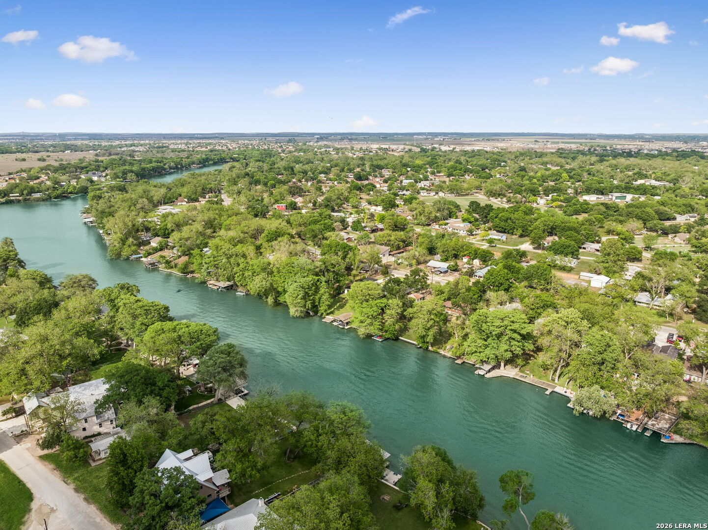 Located on a desirable stretch of Lake Dunlap, this waterfront property offers easy lake access, a gentle slope to the water, and a wood dock designed for boating, swimming, and everyday lake enjoyment. The outdoor setting features a spacious wood deck for entertaining, private swimming area, outdoor lighting, mature trees providing shade, and an outdoor shower for convenience after lake activities. Stairs lead directly to the water, creating simple and reliable access to the shoreline. Inside, the home offers comfortable living spaces with Saltillo tile flooring, abundant natural light, and scenic lake views from multiple rooms. The layout includes both living and family rooms, providing flexibility for gatherings and everyday living. A loft-style bedroom upstairs offers private guest accommodations with a half bath and elevated lake views. Additional features include a detached workshop and storage building with washer and dryer connections, built-in shelving, and concrete slab foundation.
