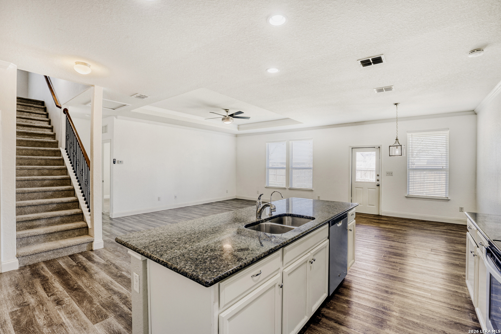 Take pride in owning this stylish and spacious Centex-built home offering over 2,700 square feet of thoughtfully designed living space in the desirable Horizon Pointe community. With four bedrooms, two full bathrooms, and a two-car garage, this residence blends modern updates with a functional layout ideal for everyday living and entertaining. Step inside to an inviting open-concept floor plan enhanced by 16x16-inch tile flooring throughout the main and wet areas, creating a seamless and polished look. Crown molding adds an elegant touch, while abundant natural light highlights the home's contemporary finishes. The island kitchen serves as the heart of the home, featuring sleek white cabinetry with 42-inch uppers, stainless steel appliances, and stunning granite countertops. The expansive island provides ample prep space and overlooks the living and dining areas, making it perfect for hosting gatherings or enjoying casual meals. Conveniently located on the first floor, the private primary suite offers a relaxing retreat with generous space and comfort. A dedicated study on the main level provides flexibility for a home office, hobby room, or additional lounge space. The staircase, accented with wrought iron balusters, leads to a spacious upstairs game room that creates the perfect setting for movie nights, play space, or entertaining guests. Three additional bedrooms and a full bathroom upstairs ensure plenty of room for family and visitors. Step outside to the covered patio, ideal for outdoor dining or simply unwinding at the end of the day. Situated close to area amenities, this beautifully updated home delivers style, space, and convenience in one exceptional package.