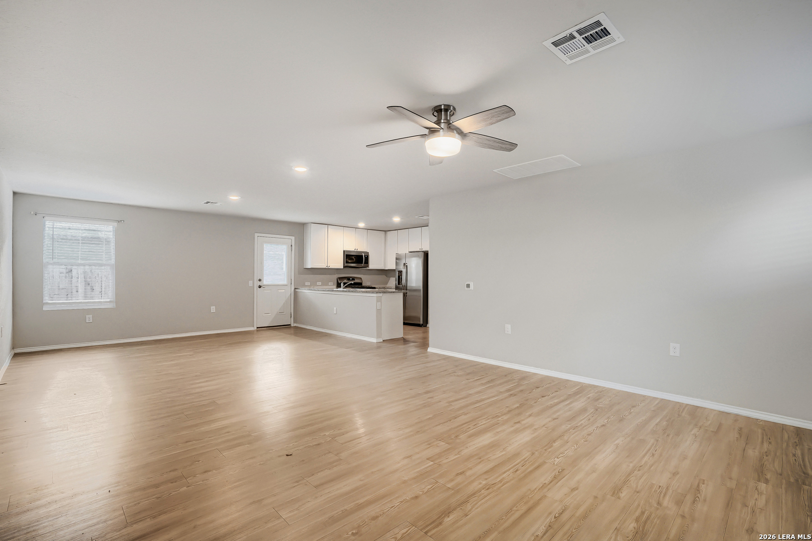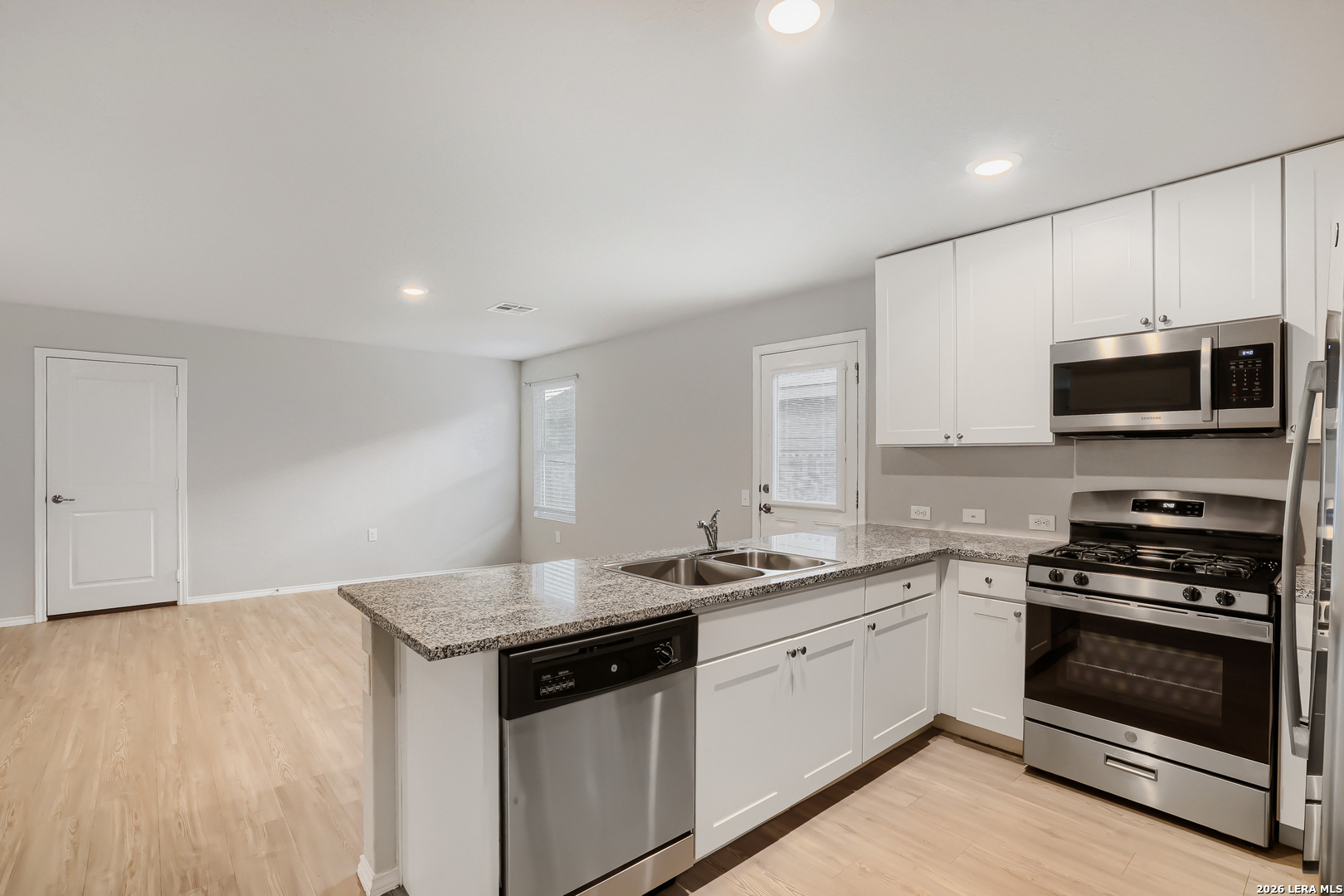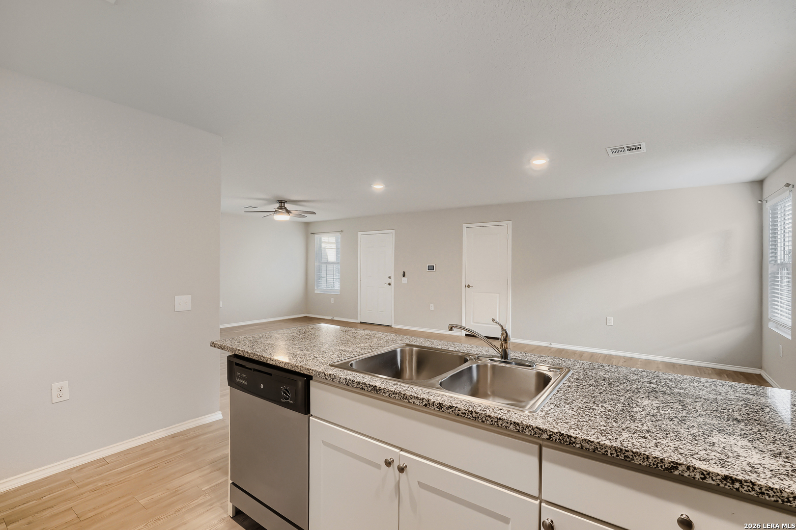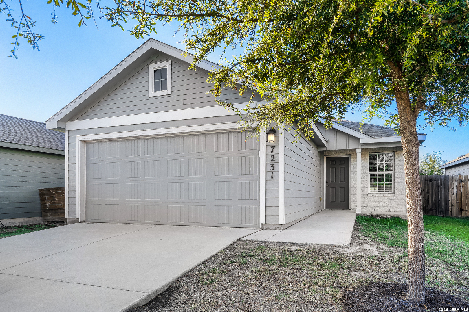 Three-bedroom, two-bathroom home in San Antonio. The property features an open-concept layout connecting the living, dining, and kitchen areas, which include stainless steel appliances and granite countertops. The home offers a spacious primary suite with a walk-in closet, two additional bedrooms, and a two-car garage. Outside, the low-maintenance backyard includes a 10' x 20' concrete patio and custom stone landscaping. Strategically located for military and medical professionals near Loop 410 and downtown, the home is approximately 5 miles from BAMC, 6 miles from JBSA-Fort Sam Houston, and 8 miles from Randolph AFB. The community also features a local park.