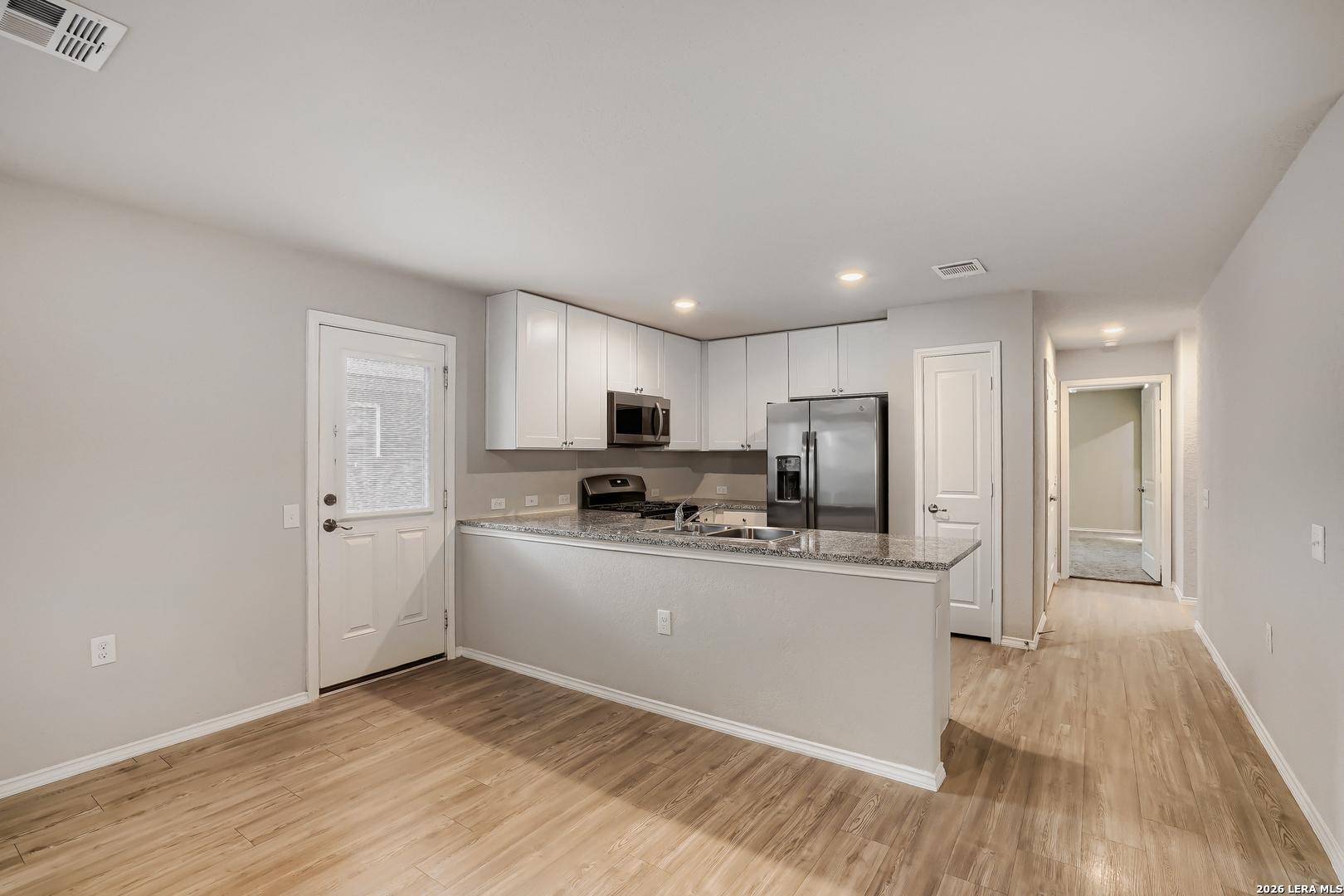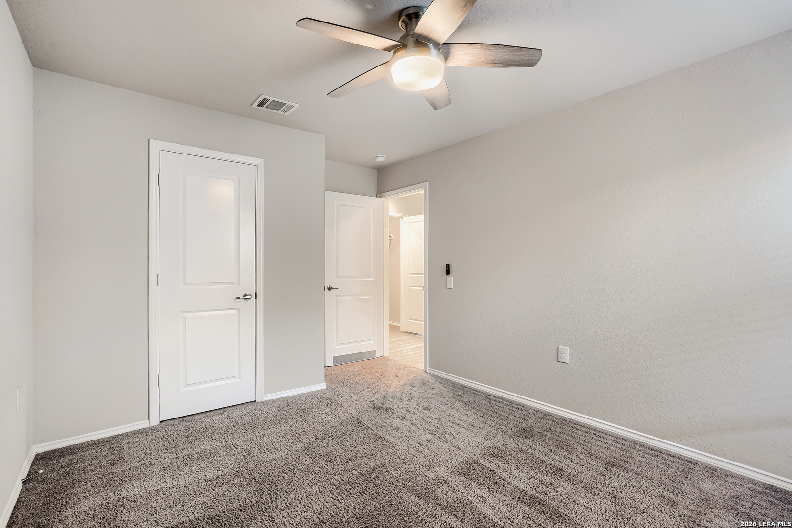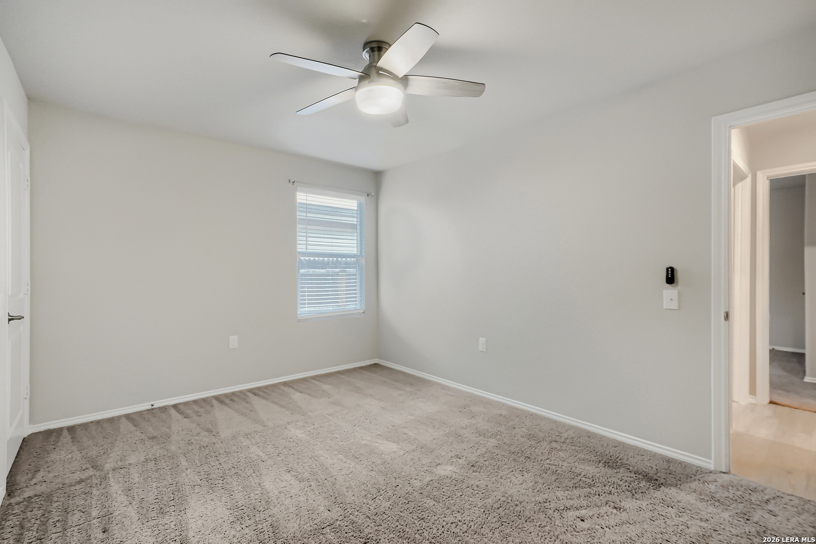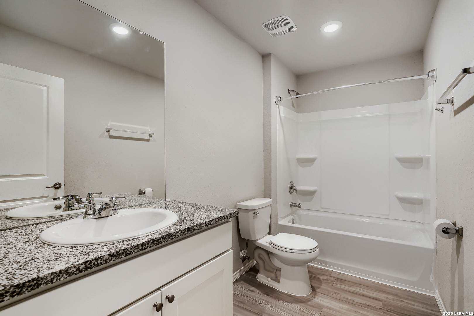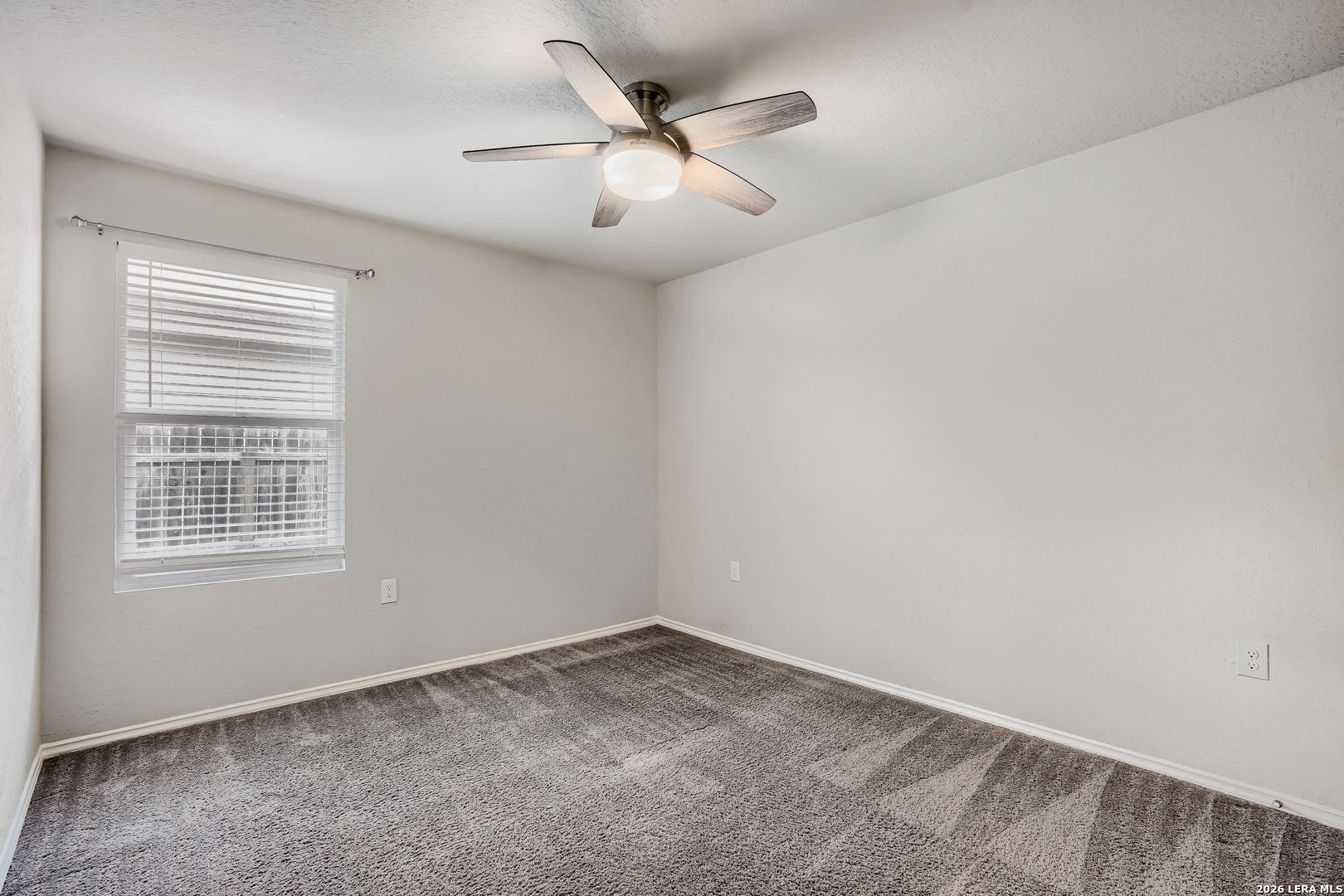 Three-bedroom, two-bathroom home in San Antonio. The property features an open-concept layout connecting the living, dining, and kitchen areas, which include stainless steel appliances and granite countertops. The home offers a spacious primary suite with a walk-in closet, two additional bedrooms, and a two-car garage. Outside, the low-maintenance backyard includes a 10' x 20' concrete patio and custom stone landscaping. Strategically located for military and medical professionals near Loop 410 and downtown, the home is approximately 5 miles from BAMC, 6 miles from JBSA-Fort Sam Houston, and 8 miles from Randolph AFB. The community also features a local park.
