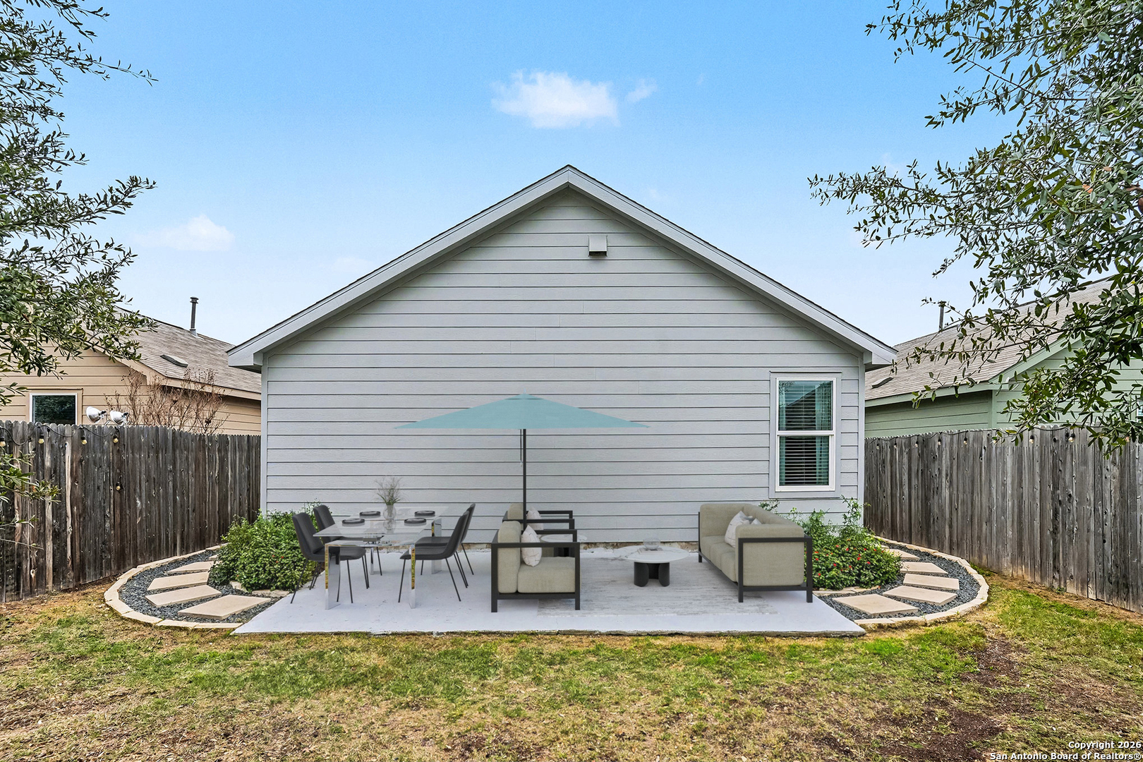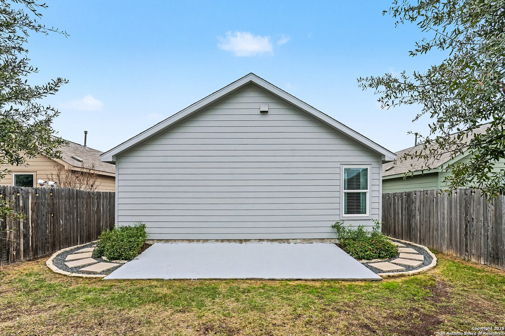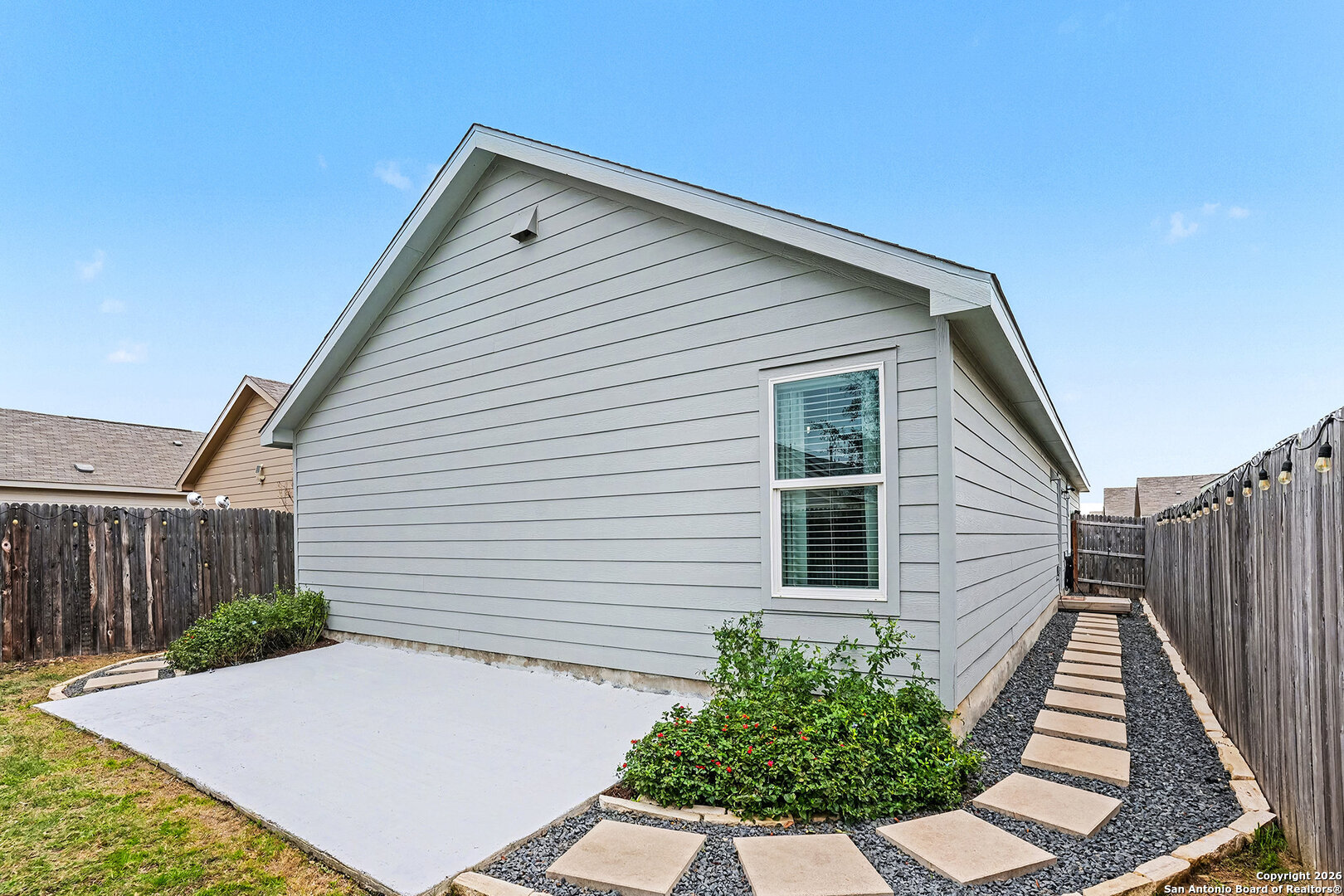 An assumable interest rate may be available, offering a valuable opportunity for qualified buyers. Discover comfortable and convenient living in this charming three-bedroom, two-bath home designed with an open-concept floor plan that seamlessly connects the kitchen, dining, and living areas. The move-in-ready kitchen is fully equipped with stainless steel refrigerator, stove, and microwave, along with beautiful granite countertops that offer both style and functionality for everyday living and entertaining. The spacious primary owner's suite provides a relaxing retreat with a private ensuite bathroom and a large walk-in closet, while two additional bedrooms are thoughtfully located nearby for a practical and cohesive layout. A two-car garage adds everyday convenience and storage. Step outside to a beautifully enhanced backyard featuring a 10' x 20' concrete patio, perfect for outdoor dining or relaxing. Custom landscaping includes pavers and stone lining along both sides of the home, with river rock thoughtfully placed along the back fence, creating a clean, finished look with low-maintenance appeal. Located in a welcoming community with a kid-friendly park, this home offers easy access to Loop 410, downtown San Antonio, military bases, H-E-B, Walmart, shopping, dining, and everyday essentials. This well-maintained home blends comfort, convenience, and thoughtful upgrades in a prime San Antonio location.