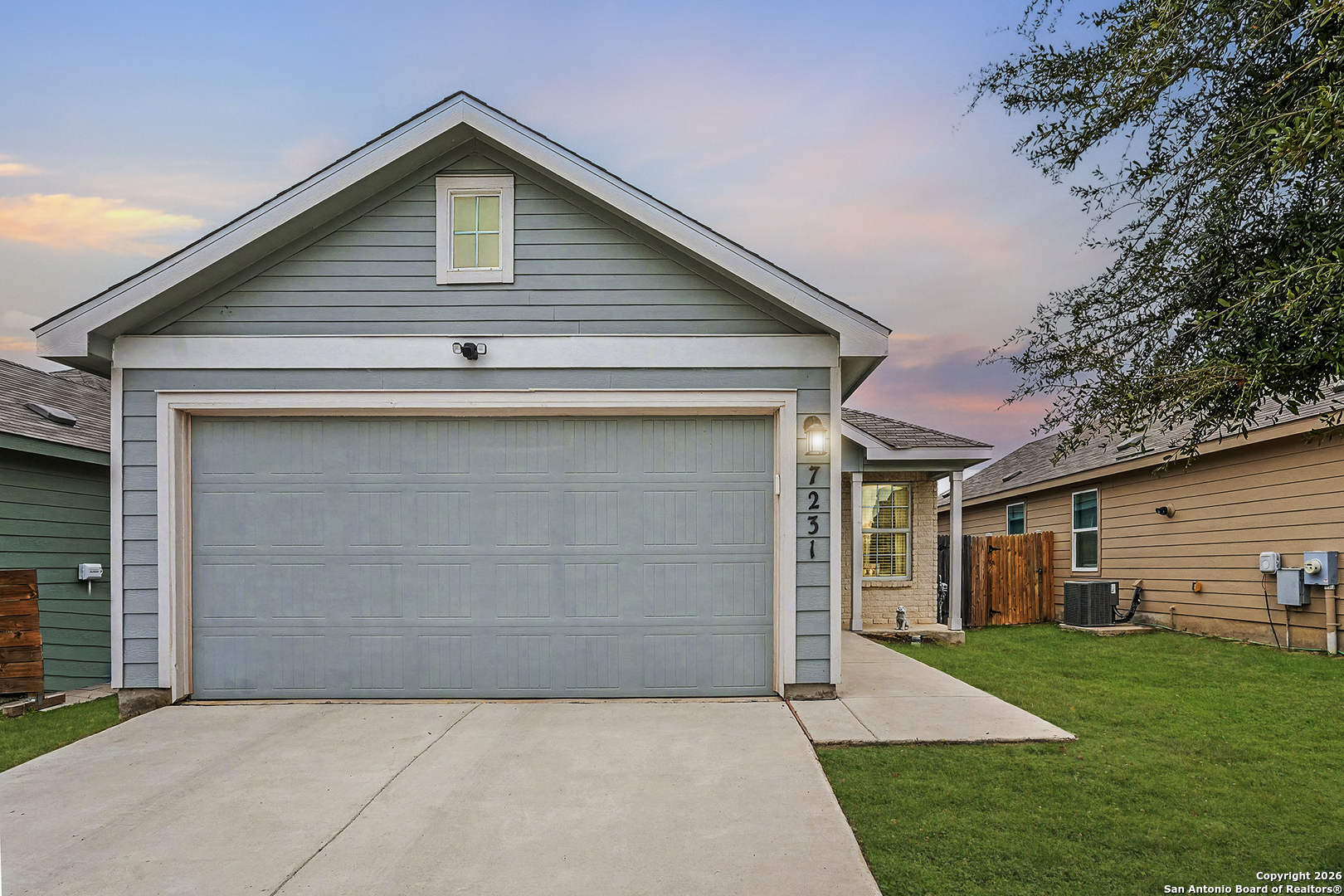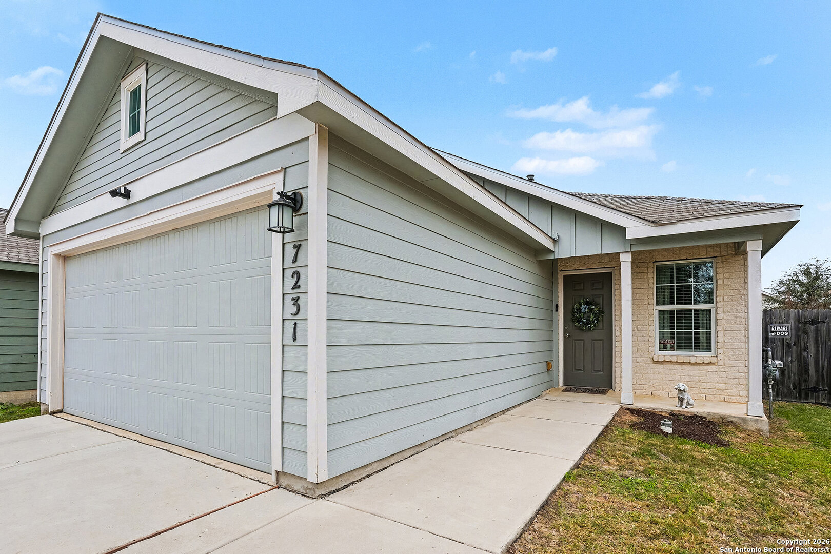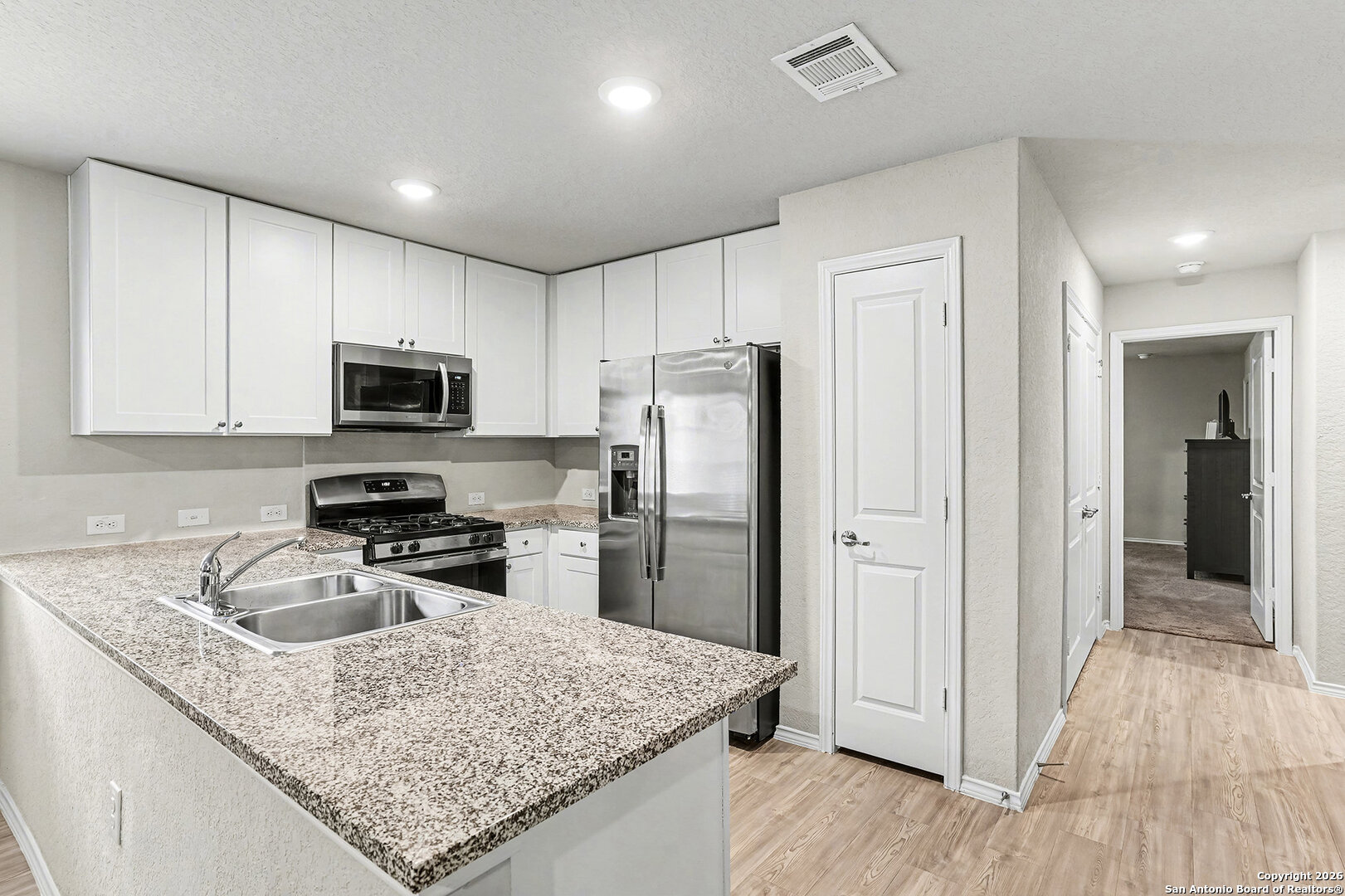 An assumable interest rate may be available, offering a valuable opportunity for qualified buyers. Discover comfortable and convenient living in this charming three-bedroom, two-bath home designed with an open-concept floor plan that seamlessly connects the kitchen, dining, and living areas. The move-in-ready kitchen is fully equipped with stainless steel refrigerator, stove, and microwave, along with beautiful granite countertops that offer both style and functionality for everyday living and entertaining. The spacious primary owner's suite provides a relaxing retreat with a private ensuite bathroom and a large walk-in closet, while two additional bedrooms are thoughtfully located nearby for a practical and cohesive layout. A two-car garage adds everyday convenience and storage. Step outside to a beautifully enhanced backyard featuring a 10' x 20' concrete patio, perfect for outdoor dining or relaxing. Custom landscaping includes pavers and stone lining along both sides of the home, with river rock thoughtfully placed along the back fence, creating a clean, finished look with low-maintenance appeal. Located in a welcoming community with a kid-friendly park, this home offers easy access to Loop 410, downtown San Antonio, military bases, H-E-B, Walmart, shopping, dining, and everyday essentials. This well-maintained home blends comfort, convenience, and thoughtful upgrades in a prime San Antonio location.