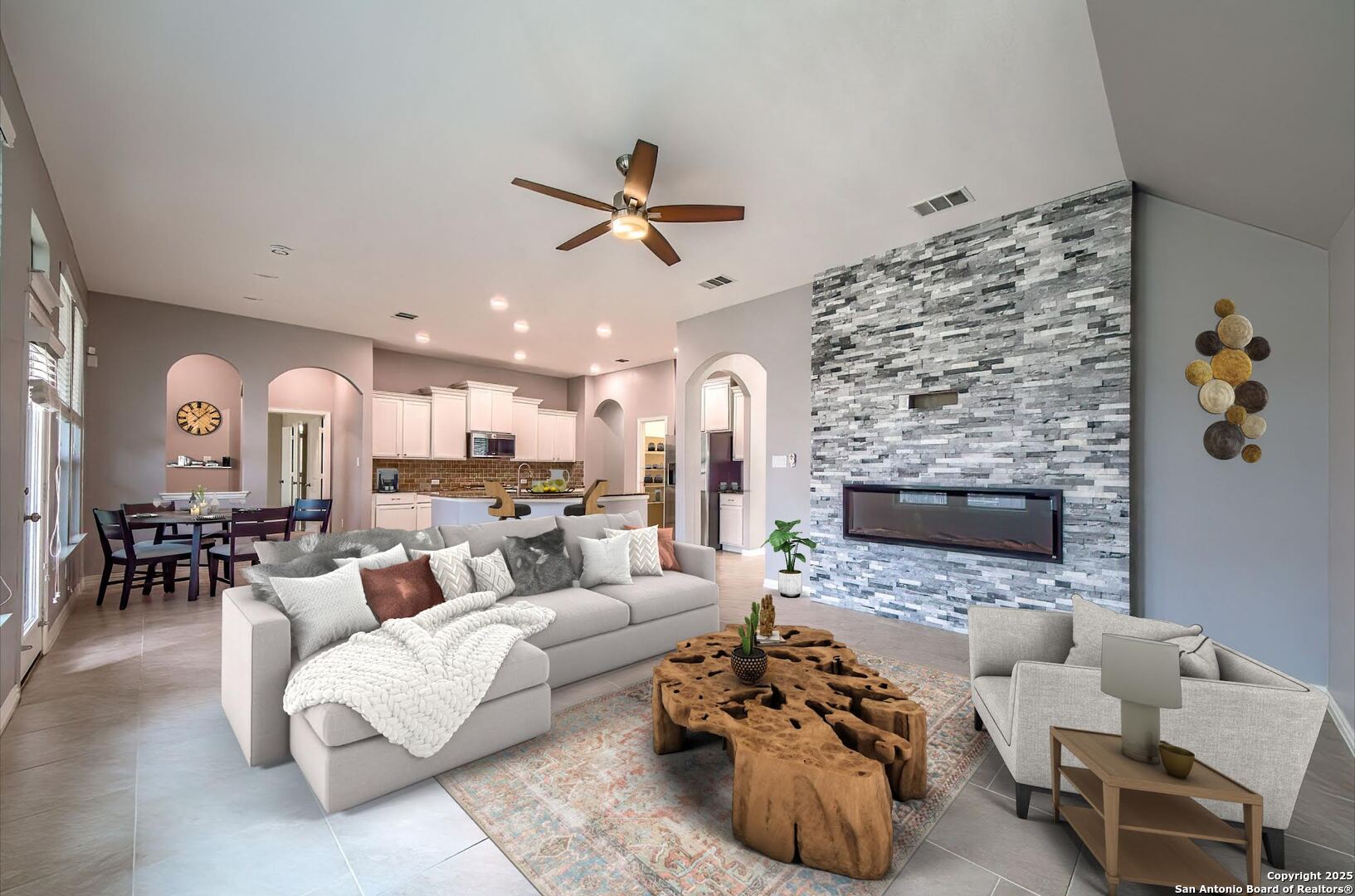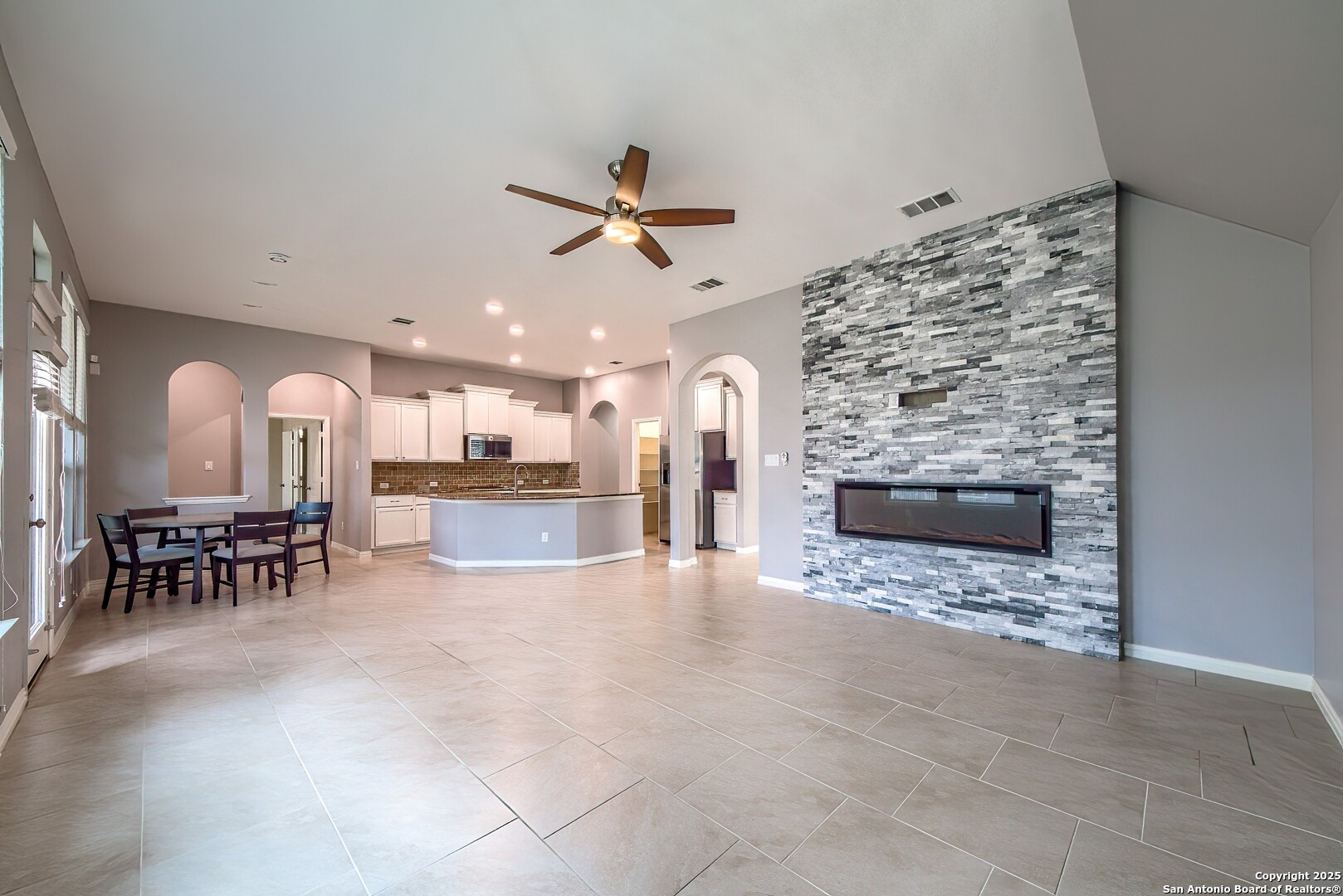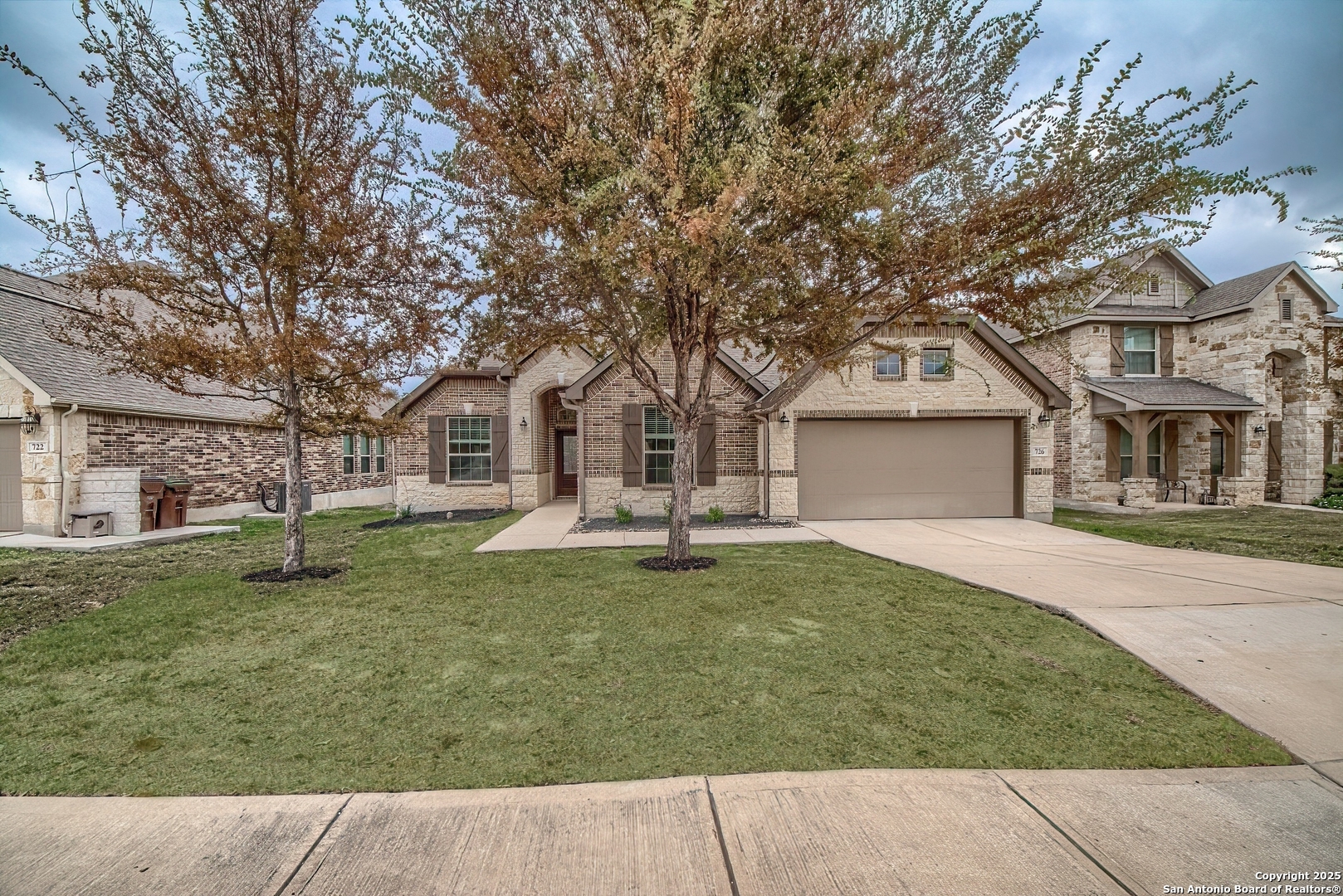 Welcome to 726 Firenze Ave, a beautifully maintained four bedroom home in the gated Potranco Run community. This inviting one story layout offers a spacious open floor plan with a bright living area, dedicated dining space and a modern kitchen with granite counters, stainless steel appliances, rich cabinetry and natural gas cooking. The home also features natural gas heating and an electric fireplace for added comfort and style. The primary suite is tucked privately at the back of the home and includes a walk in closet, dual vanity, soaking tub and separate shower. Three additional bedrooms at the front offer room for guests, an office or hobbies. Enjoy a covered patio overlooking a large fenced backyard with mature trees. The home includes full gutters, an irrigation system and a water softener for easy living. Potranco Run is a quiet gated community with quick access to Potranco Road, Highway 211, shopping, dining and Lackland AFB. The area also benefits from no city taxes. A move in ready home with upgrades, space and a desirable location in west San Antonio.