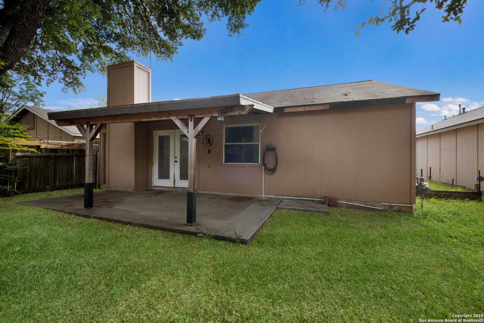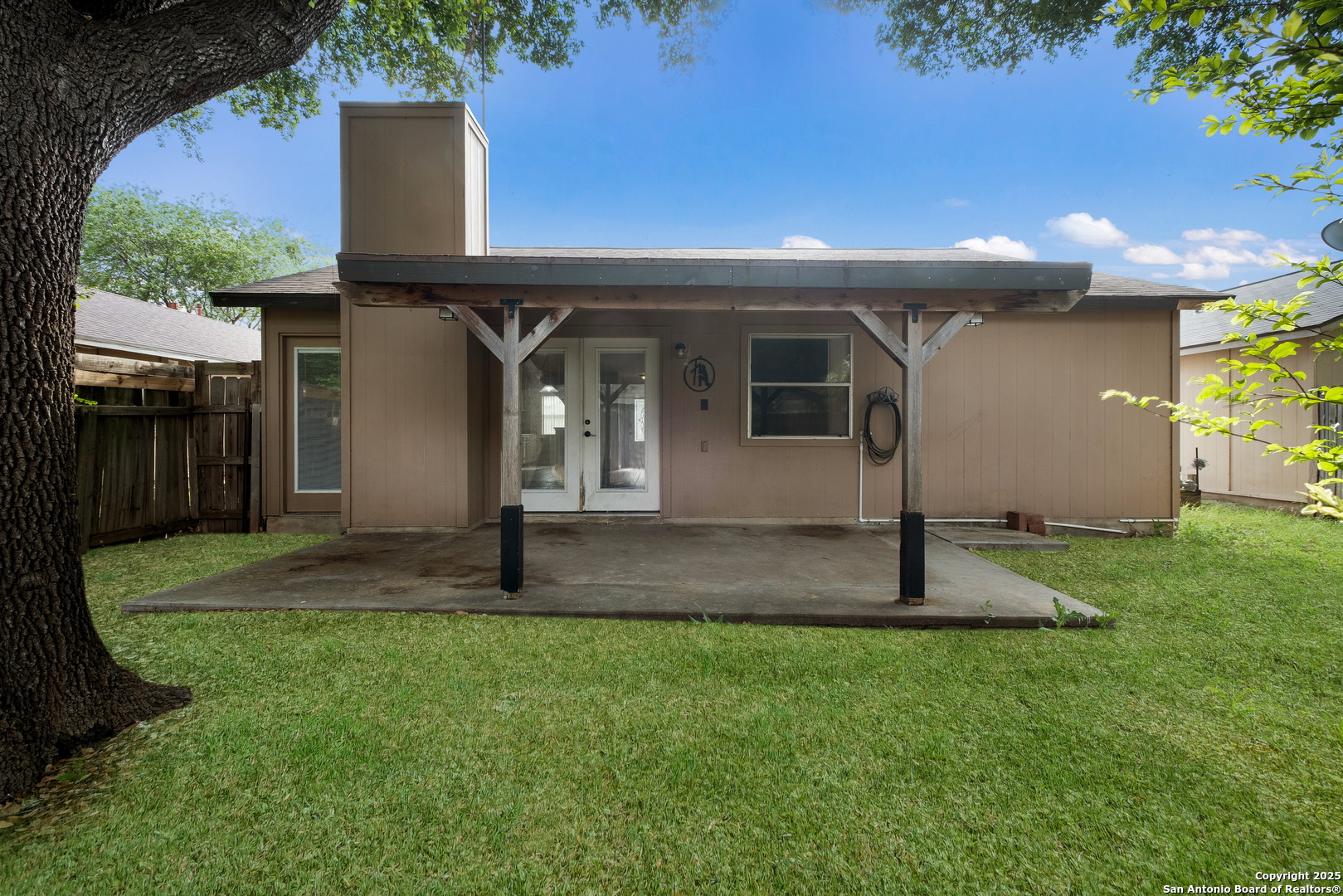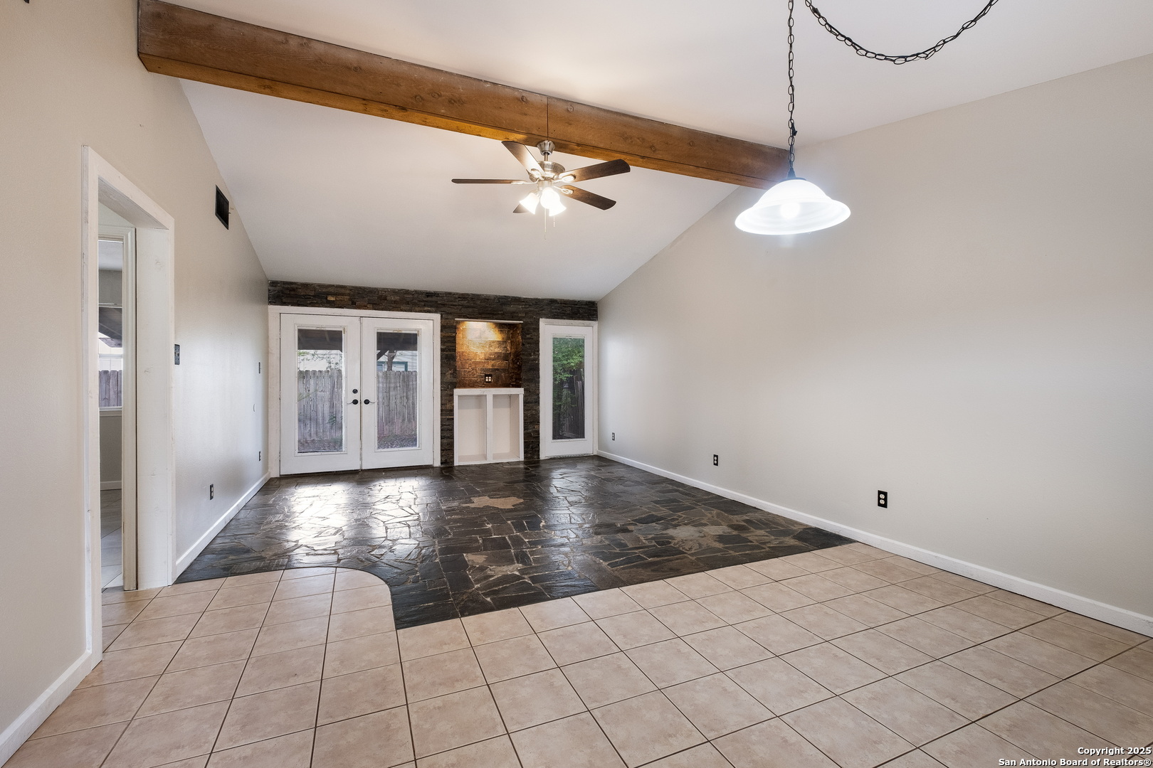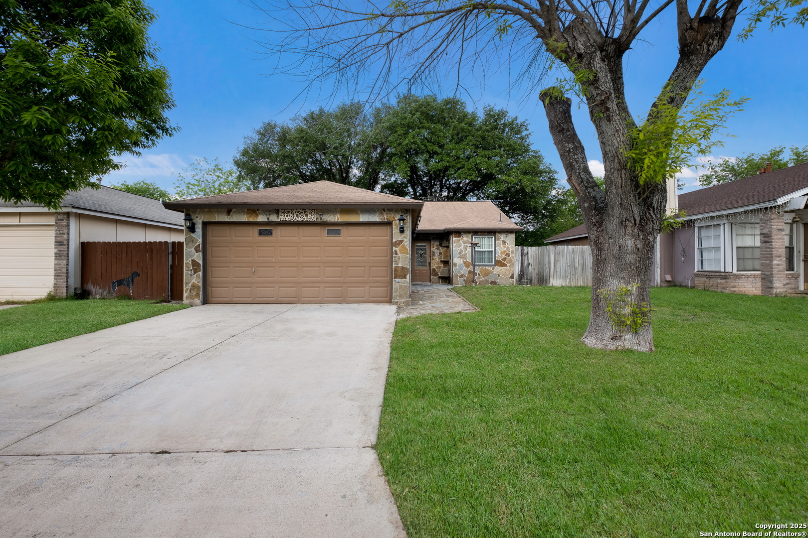 Step into a home that's anything but average for the neighborhood! This rare gem offers a full 2-car garage, 2 full bathrooms, and a spacious, covered patio-a true standout in the area-and welcomes you with soaring ceilings in the open-concept living and dining space. The living room is a showstopper with custom stone flooring, a cedar beam accent, and French doors that open up to a covered patio, perfect for relaxing or entertaining. Inside, you'll find 3 bedrooms and 2 full bathrooms, including a primary suite with a walk-in shower and 2 closets. There's no carpet anywhere-just clean, low-maintenance surfaces throughout. The exterior also features custom stonework, adding to the home's curb appeal and unique character. Conveniently located within walking distance to the amenity center and a quick drive to the Alamo Ranch shopping/restaurant area and 1604 and 151 for easy commutes to Lackland AFB or around the city.