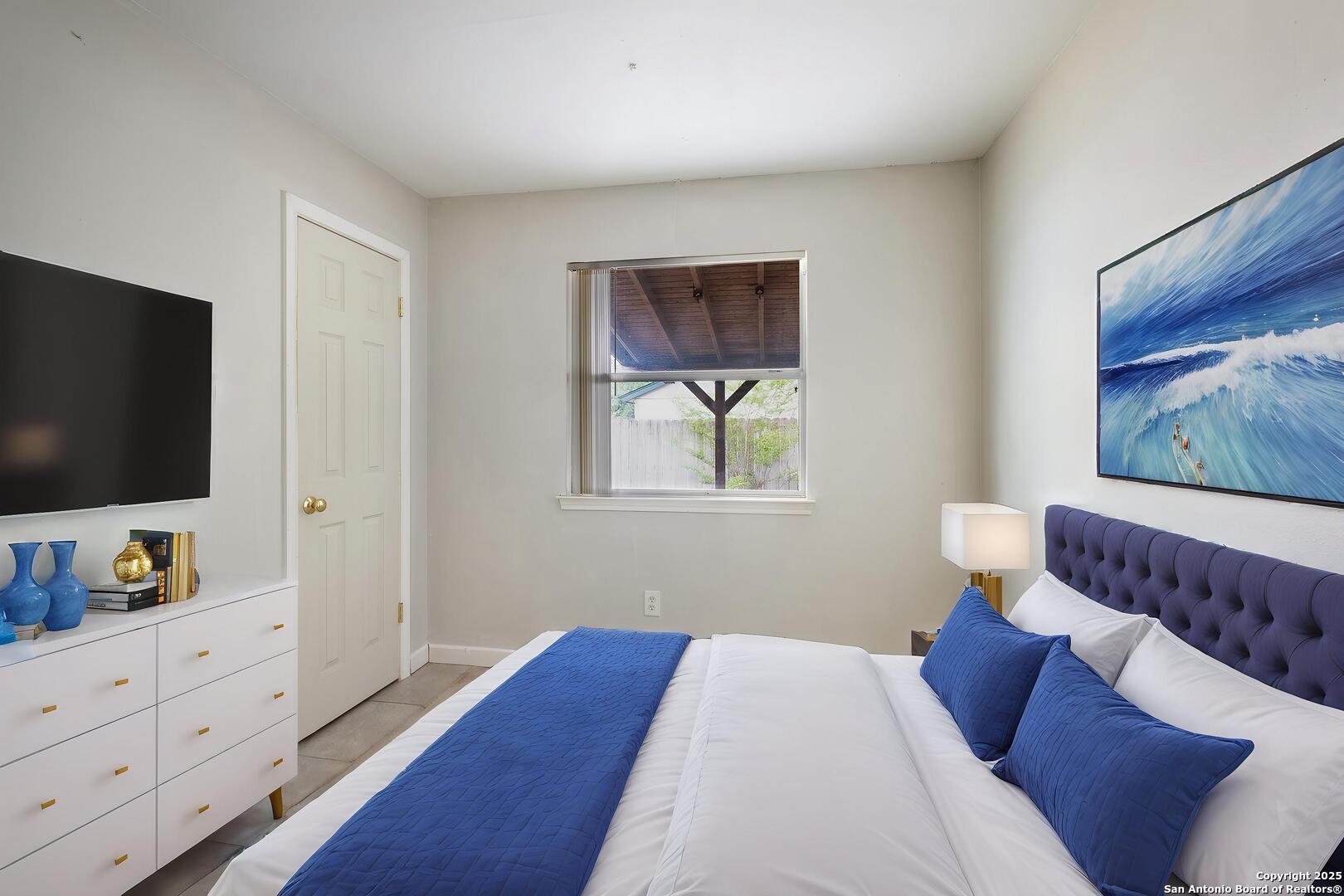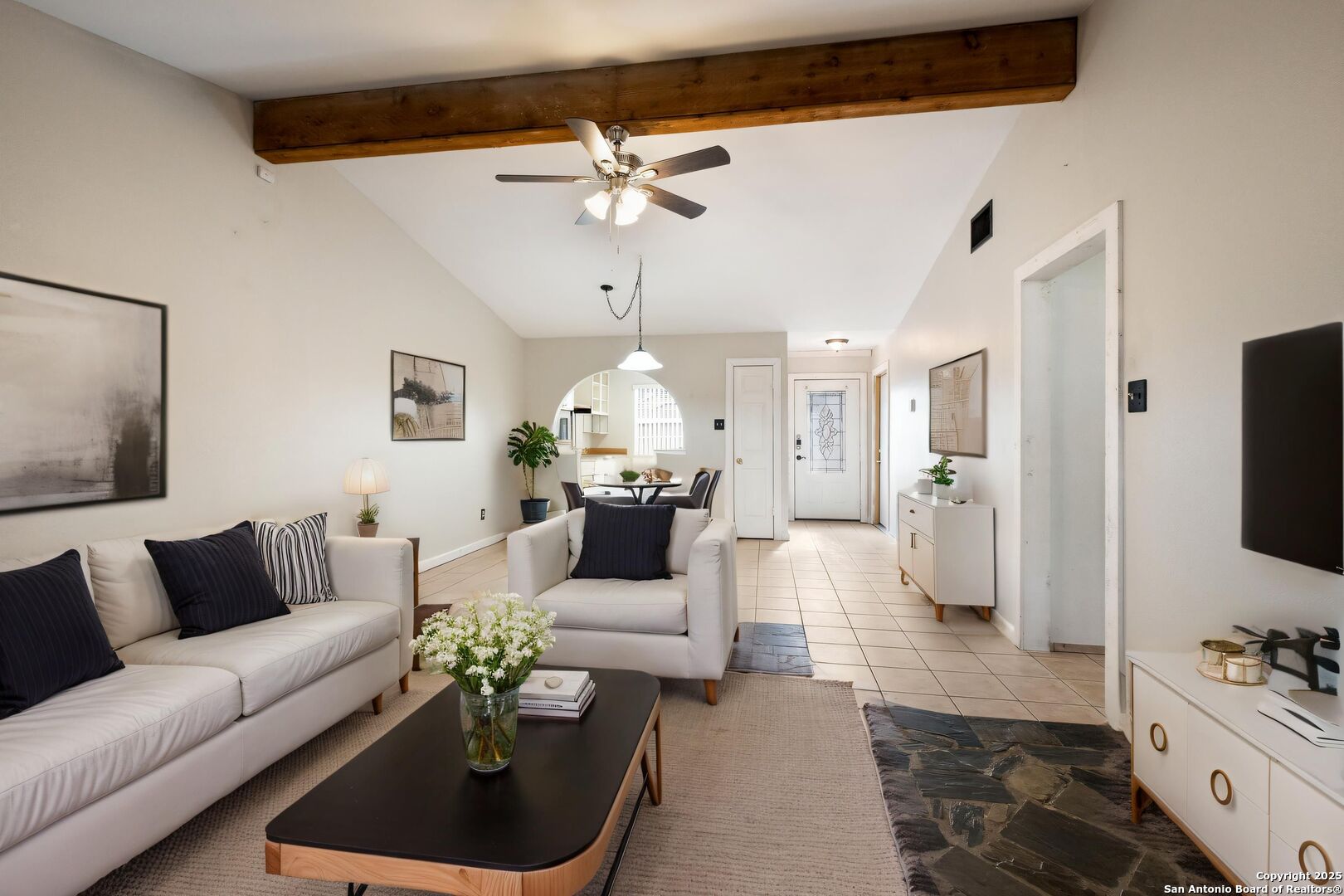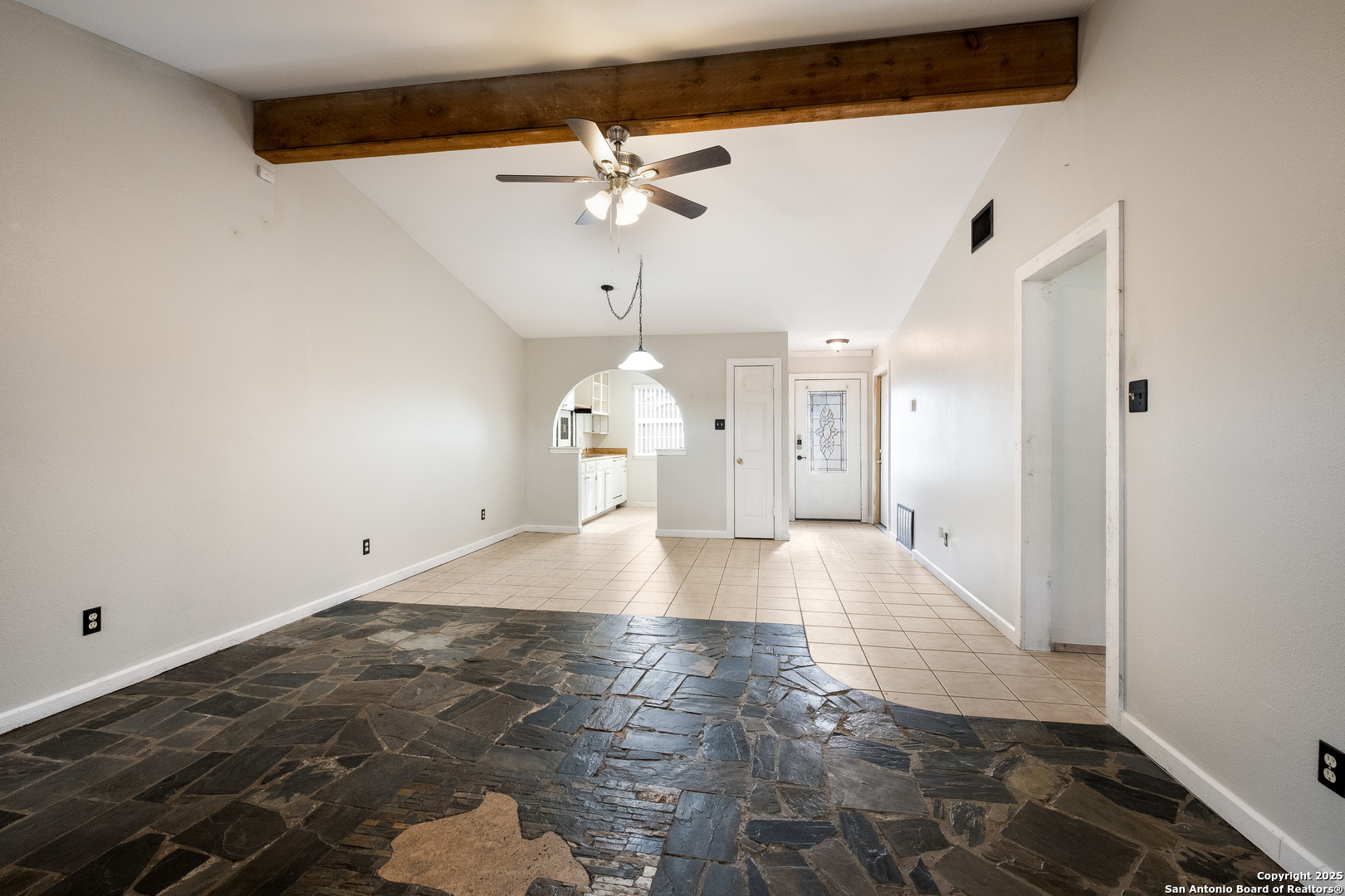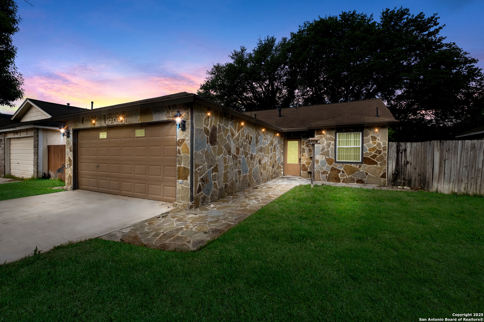 Step into a home that's anything but average for the neighborhood! This rare gem offers a full 2-car garage, 2 full bathrooms, and a spacious, covered patio-a true standout in the area-and welcomes you with soaring ceilings in the open-concept living and dining space. The living room is a showstopper with custom stone flooring, a cedar beam accent, and French doors that open up to a covered patio, perfect for relaxing or entertaining. Inside, you'll find 3 bedrooms and 2 full bathrooms, including a primary suite with a walk-in shower and 2 closets. There's no carpet anywhere-just clean, low-maintenance surfaces throughout. The exterior also features custom stonework, adding to the home's curb appeal and unique character. Conveniently located within walking distance to the amenity center and a quick drive to the Alamo Ranch shopping/restaurant area and 1604 and 151 for easy commutes to Lackland AFB or around the city.