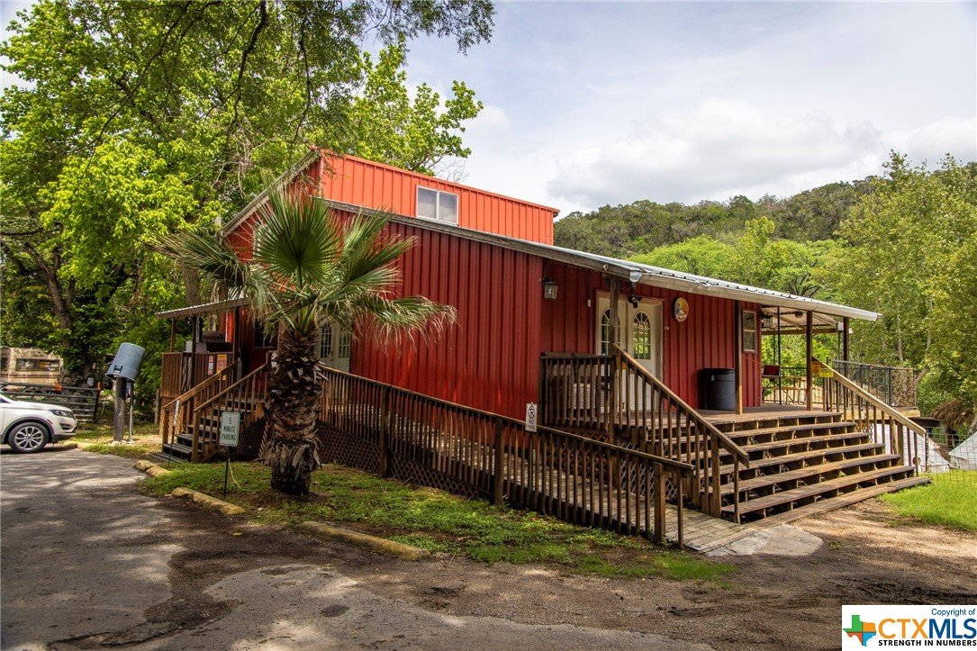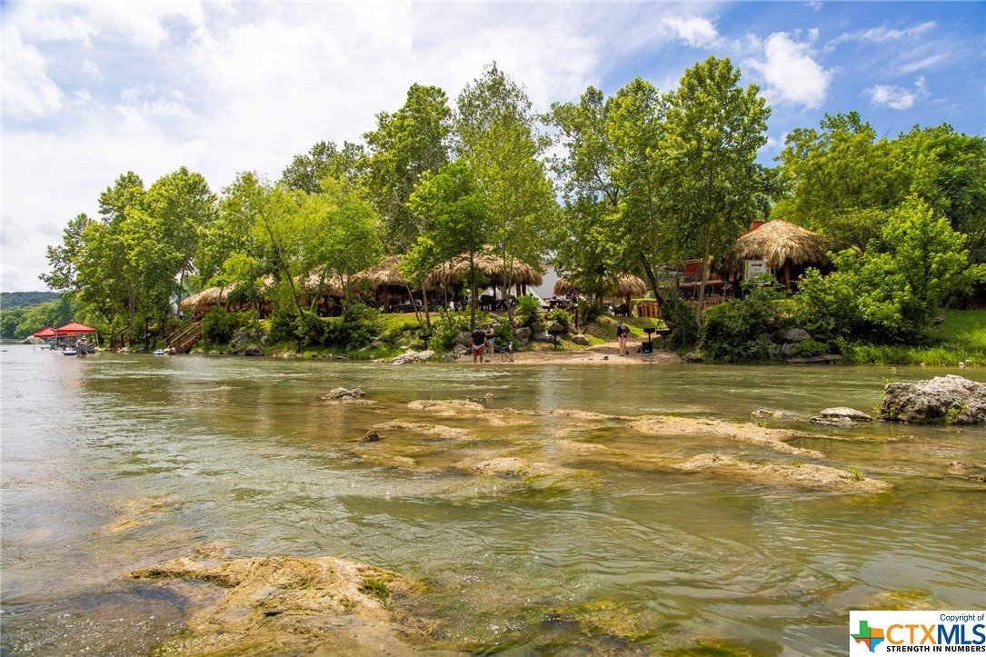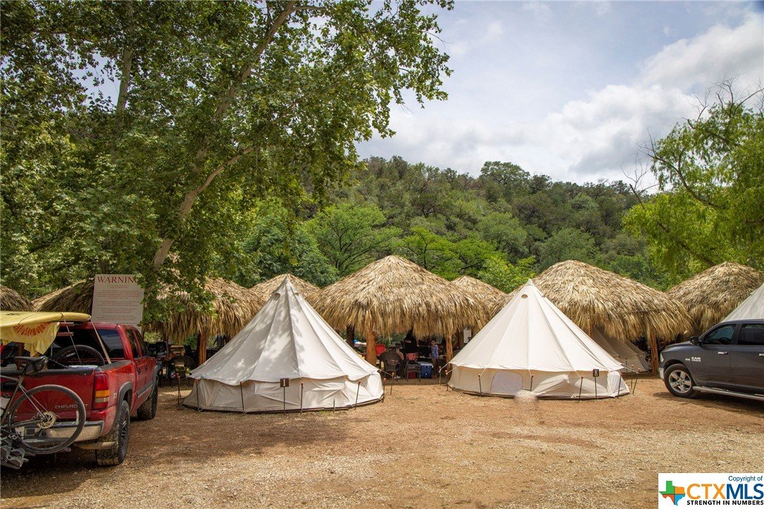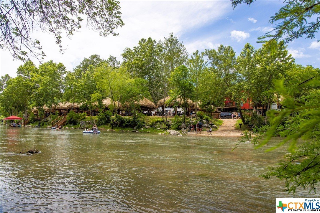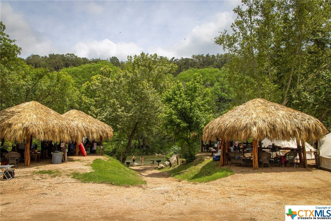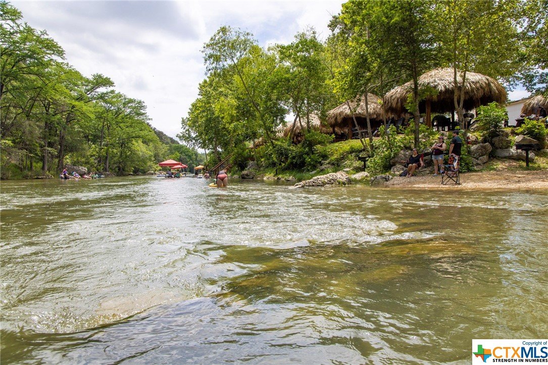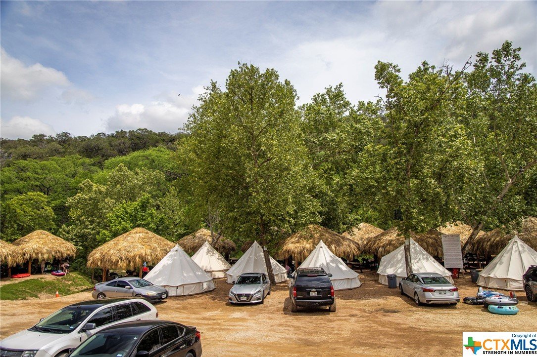 1.76 ACRES WITH OVER 345 FT ALONG THE GUADALUPE RIVER. RECREATIONAL BUSINESS OPPORTUNITY BETWEEN NEW BRAUNFELS AND CANYON LAKE. PROPERTY CONSISTS OF 3 BUILDINGS, 22 THATCH ROOF CABANAS, AND 15 GLAMPING TENTS. Red building contains office/check-in, bar and retail area, half bath, and upstairs bunkroom. Silver building houses the 5 bay bathroom/shower trailer, and features downstairs and upstairs storage for tubes, etc. The 2 story blue building would make a great 2 unit apartment with water facing views.
