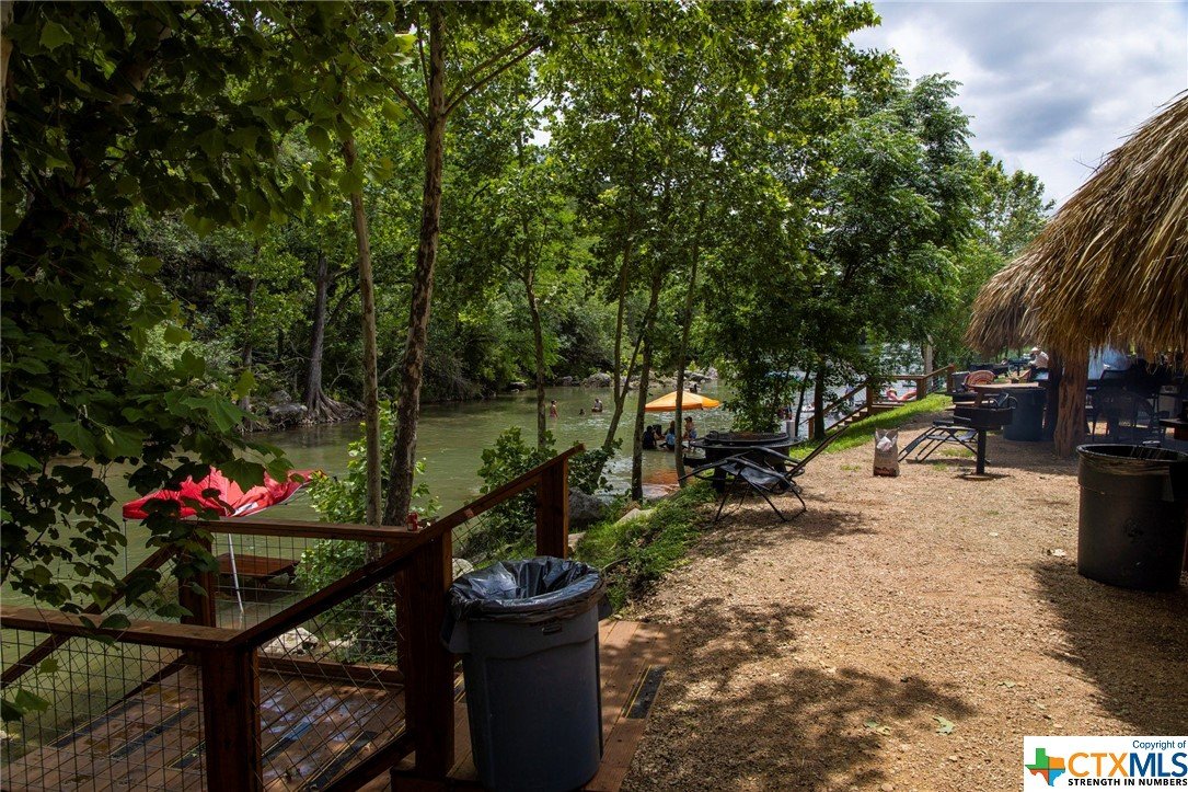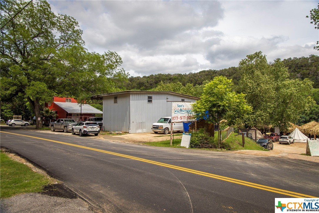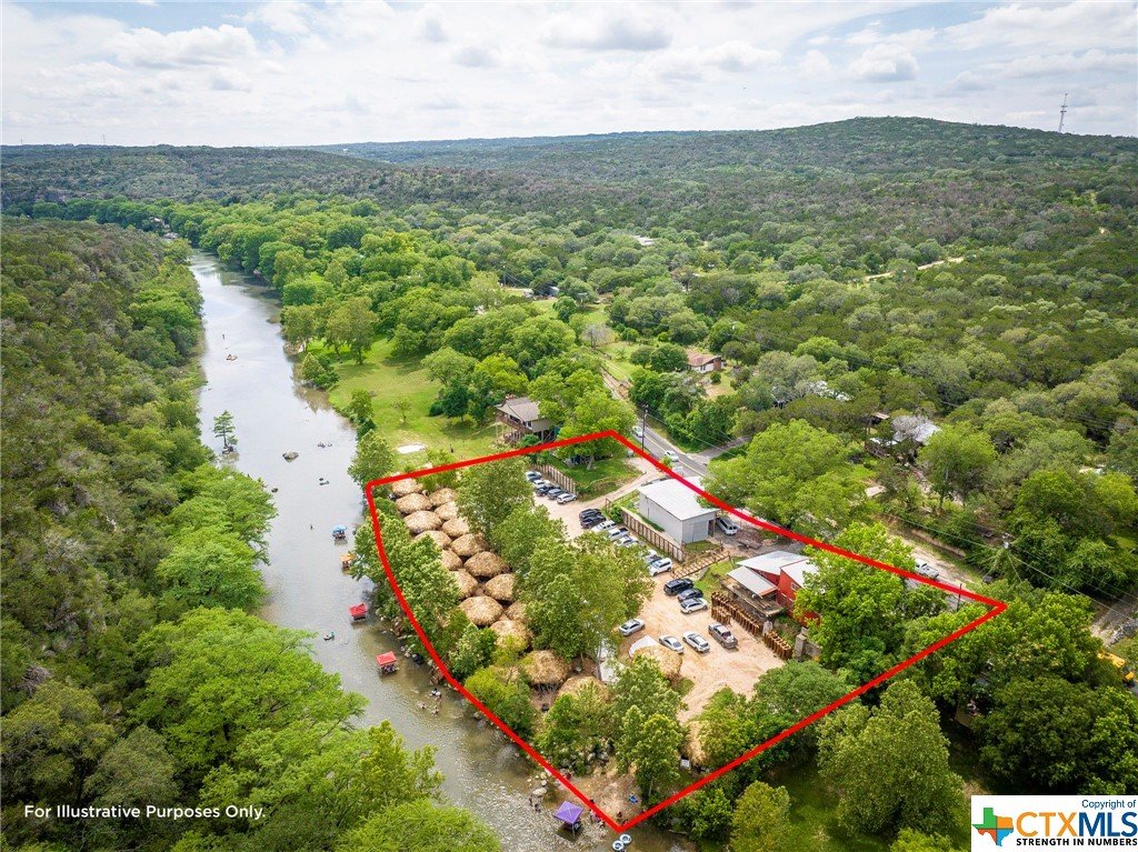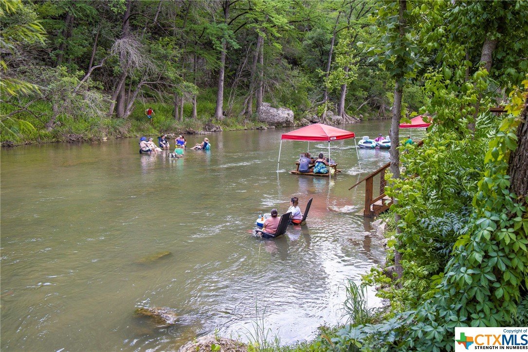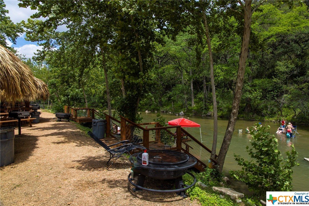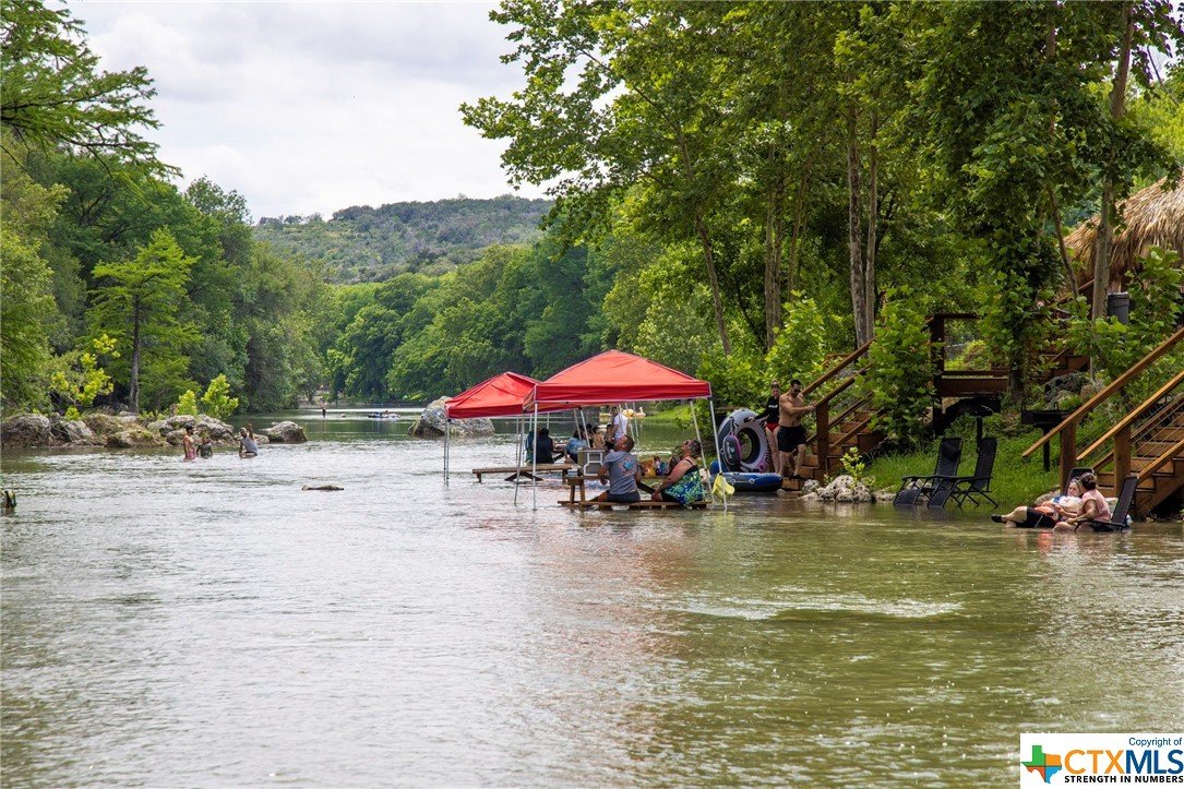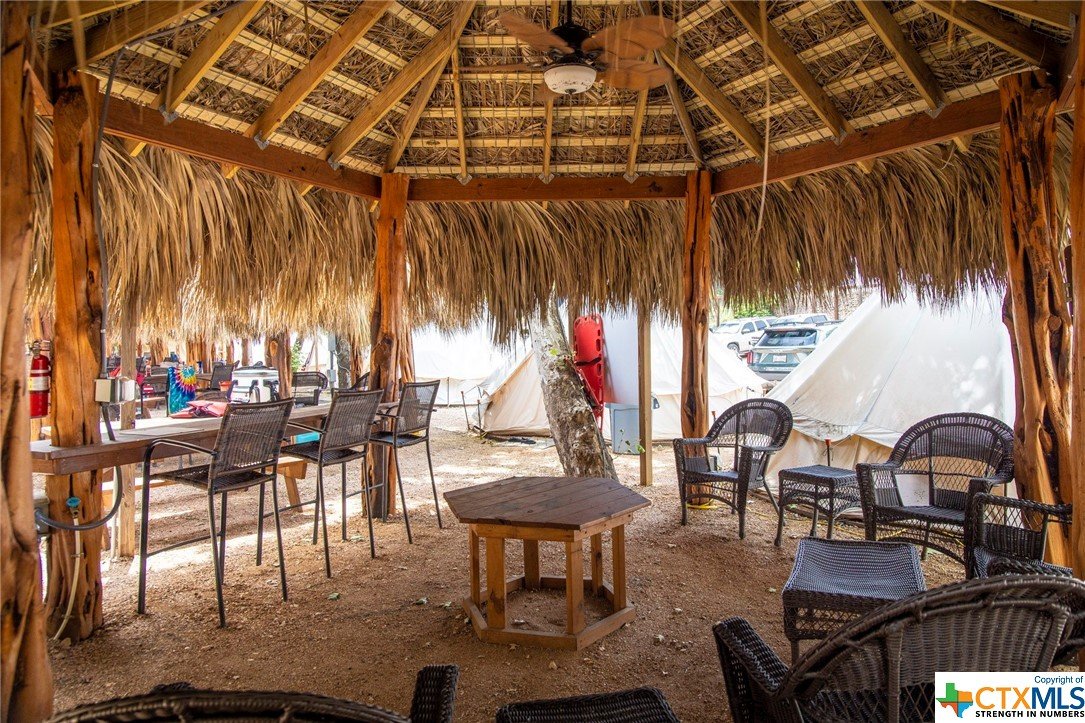 1.76 ACRES WITH OVER 345 FT ALONG THE GUADALUPE RIVER. RECREATIONAL BUSINESS OPPORTUNITY BETWEEN NEW BRAUNFELS AND CANYON LAKE. PROPERTY CONSISTS OF 3 BUILDINGS, 22 THATCH ROOF CABANAS, AND 15 GLAMPING TENTS. Red building contains office/check-in, bar and retail area, half bath, and upstairs bunkroom. Silver building houses the 5 bay bathroom/shower trailer, and features downstairs and upstairs storage for tubes, etc. The 2 story blue building would make a great 2 unit apartment with water facing views.