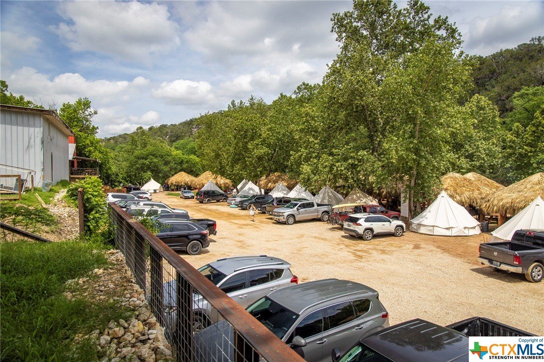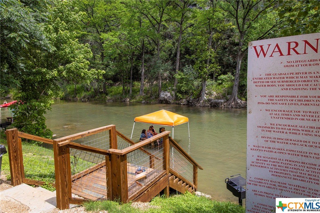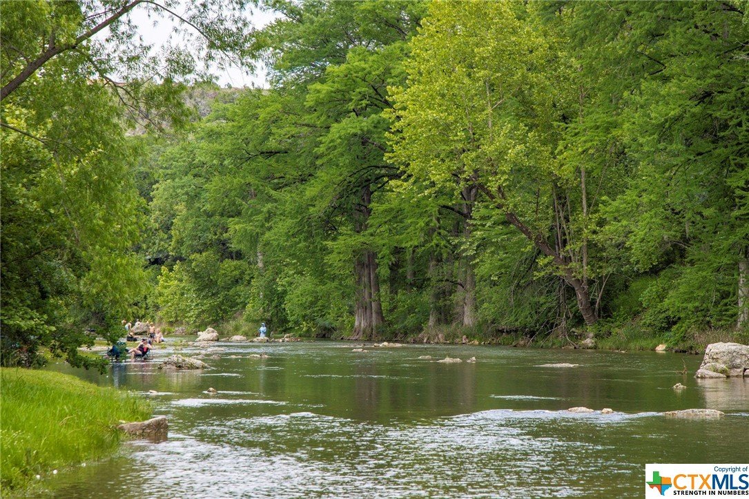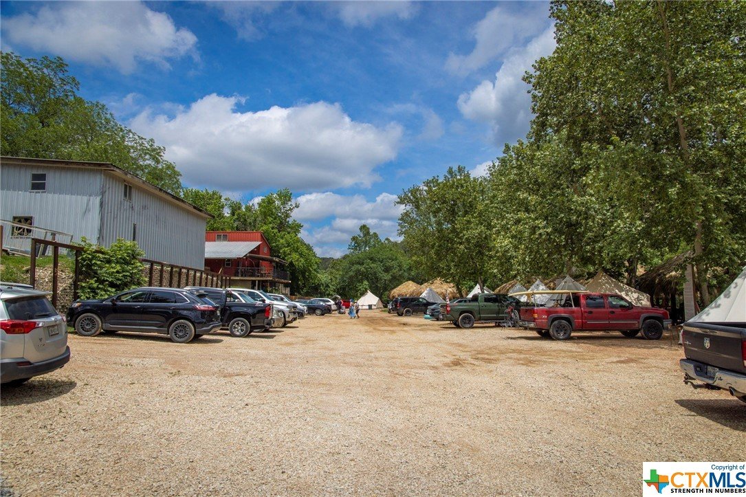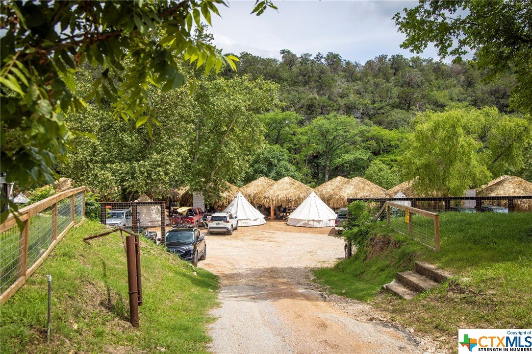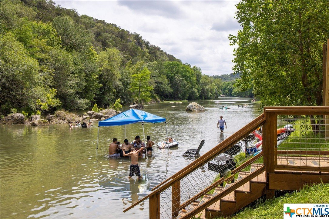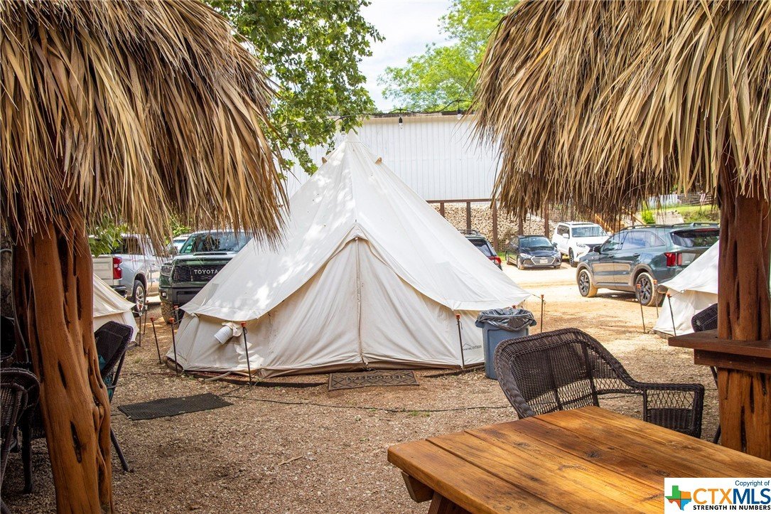 1.76 ACRES WITH OVER 345 FT ALONG THE GUADALUPE RIVER. RECREATIONAL BUSINESS OPPORTUNITY BETWEEN NEW BRAUNFELS AND CANYON LAKE. PROPERTY CONSISTS OF 3 BUILDINGS, 22 THATCH ROOF CABANAS, AND 15 GLAMPING TENTS. Red building contains office/check-in, bar and retail area, half bath, and upstairs bunkroom. Silver building houses the 5 bay bathroom/shower trailer, and features downstairs and upstairs storage for tubes, etc. The 2 story blue building would make a great 2 unit apartment with water facing views.