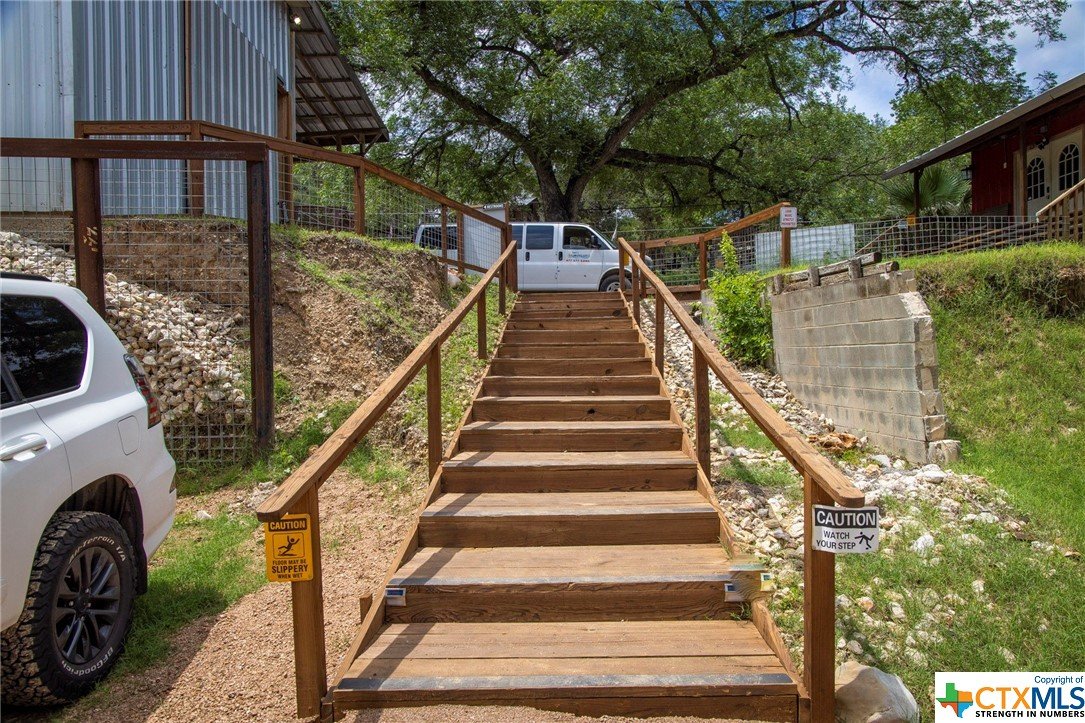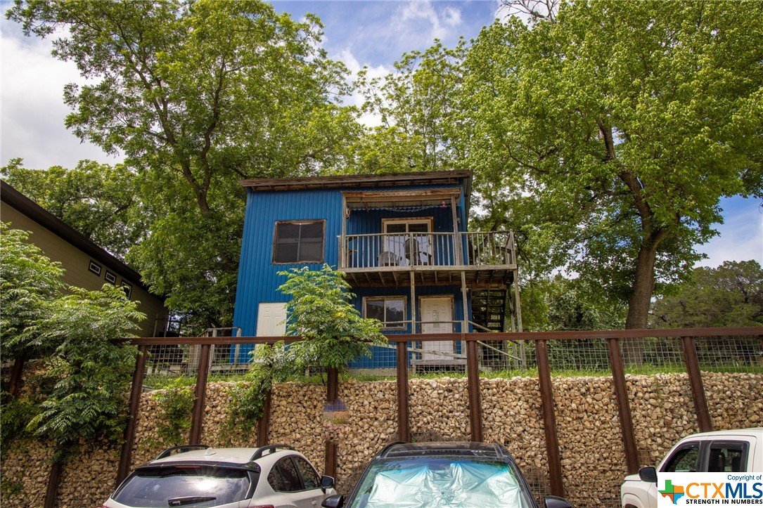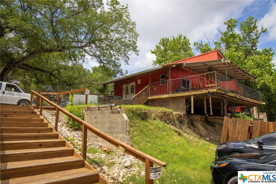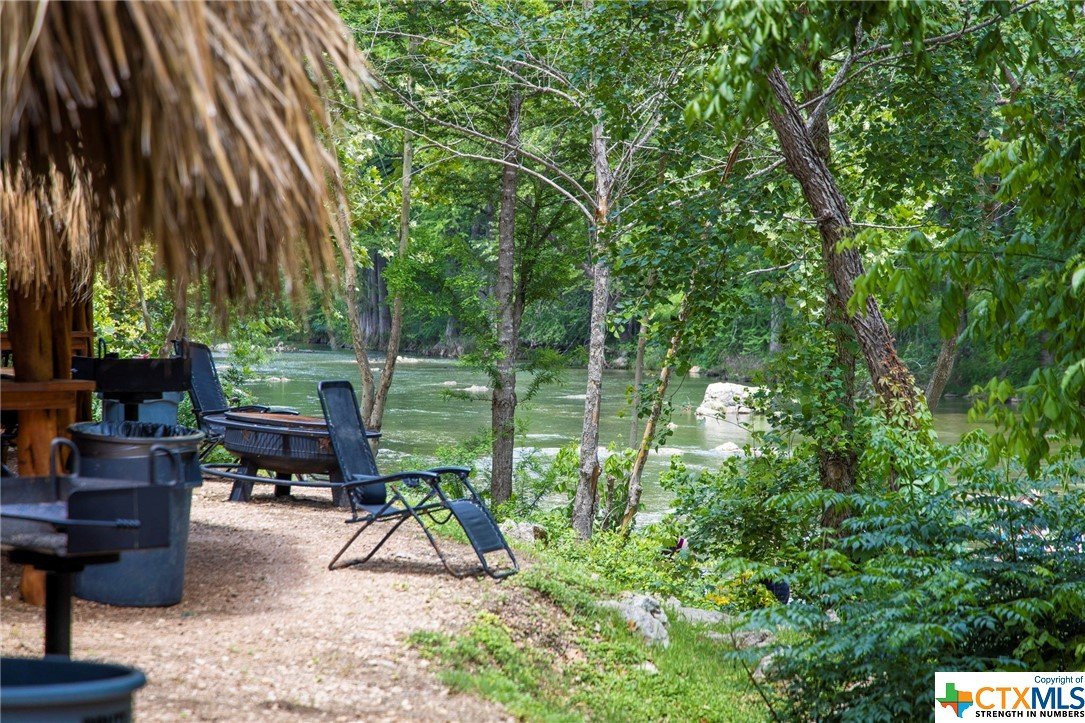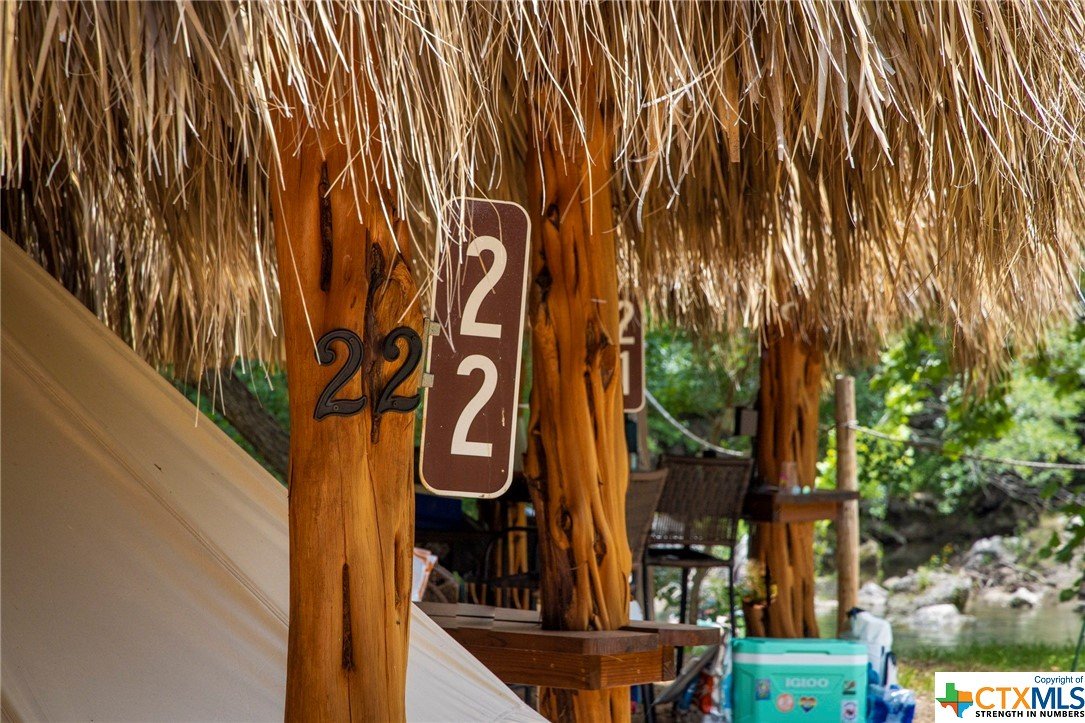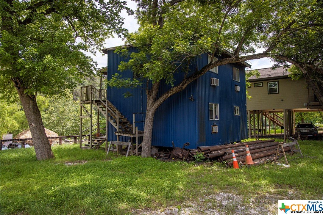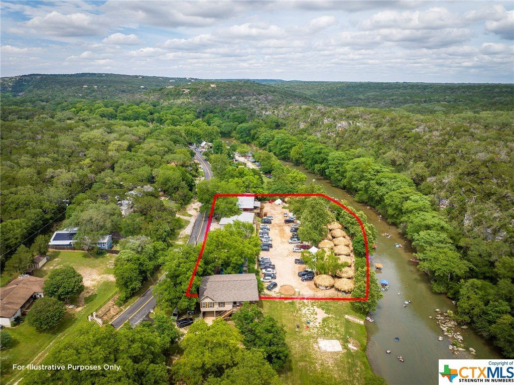 1.76 ACRES WITH OVER 345 FT ALONG THE GUADALUPE RIVER. RECREATIONAL BUSINESS OPPORTUNITY BETWEEN NEW BRAUNFELS AND CANYON LAKE. PROPERTY CONSISTS OF 3 BUILDINGS, 22 THATCH ROOF CABANAS, AND 15 GLAMPING TENTS. Red building contains office/check-in, bar and retail area, half bath, and upstairs bunkroom. Silver building houses the 5 bay bathroom/shower trailer, and features downstairs and upstairs storage for tubes, etc. The 2 story blue building would make a great 2 unit apartment with water facing views.