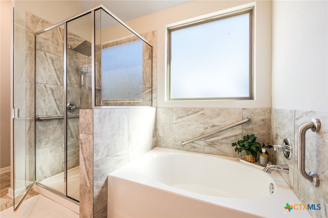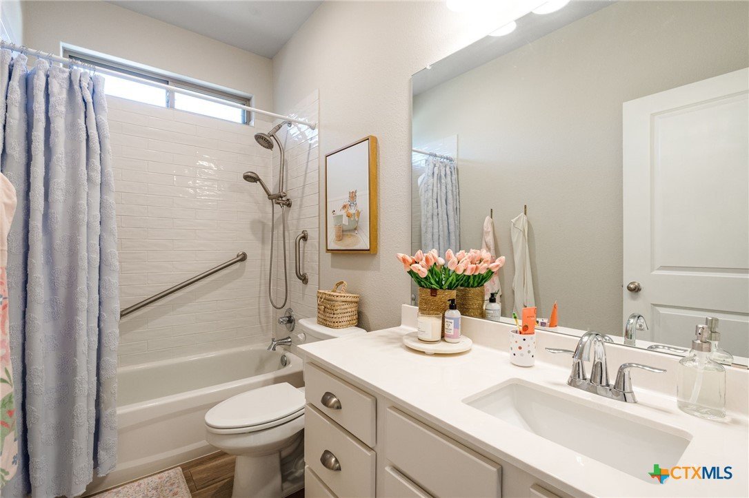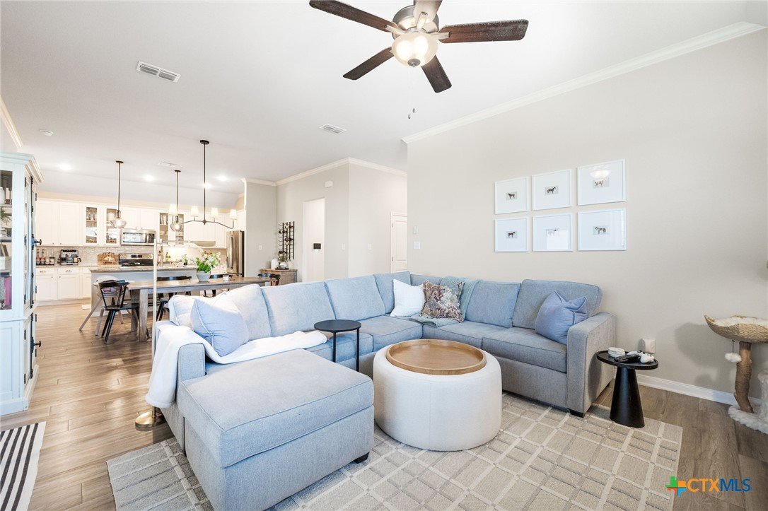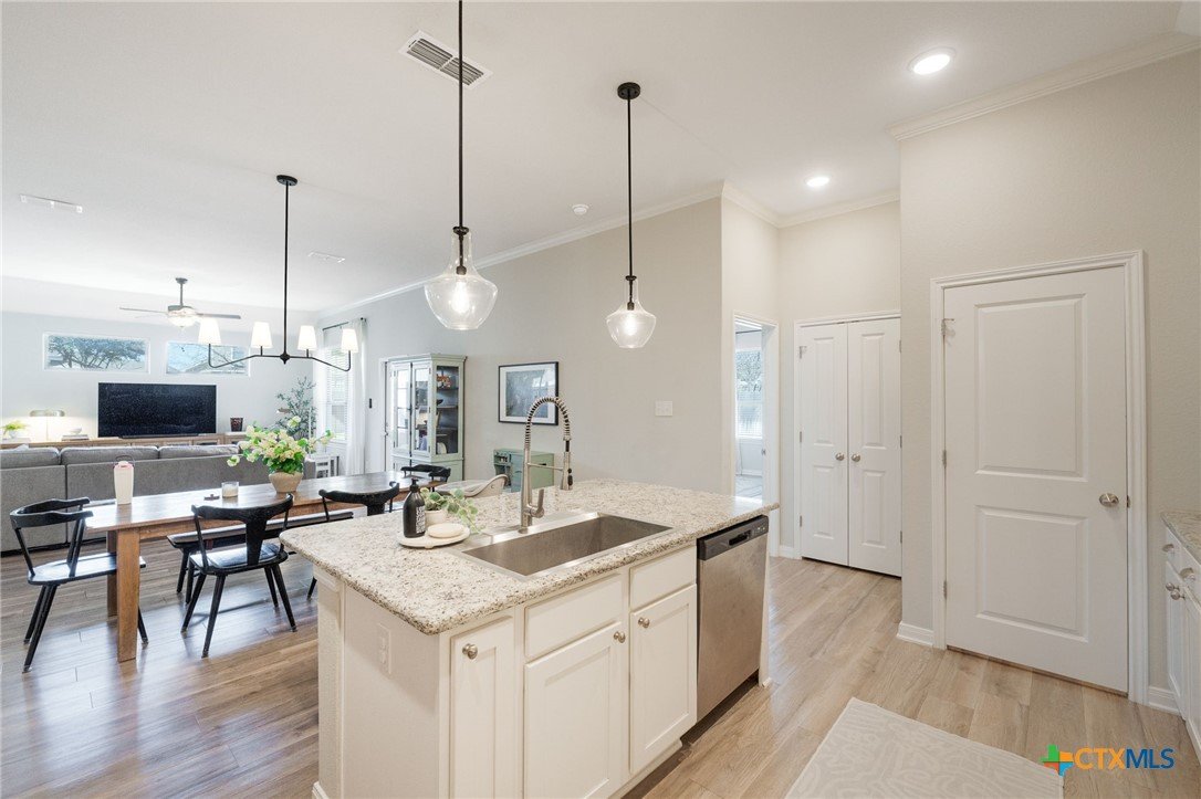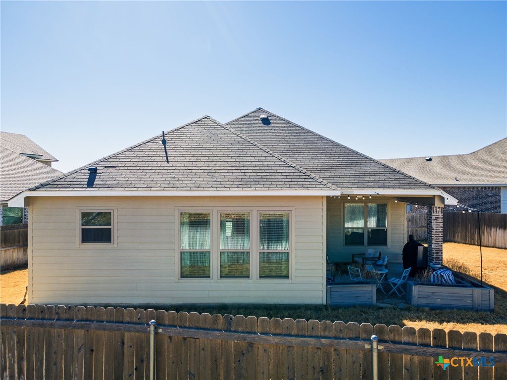 Must-see open-concept home in Belton ISD! This beautifully maintained 3-bedroom, 2-bath home, offers a convenient location near schools and shopping. The interior is filled with natural light and features a spacious eat-in center island, enhanced vinyl plank flooring, tile in wet areas, high ceilings, crown molding, granite countertops, stainless steel appliances, and double-pane windows. The primary suite offers a generous walk-in closet, while the ensuite bath includes dual vanities, a separate garden tub, and a walk-in shower. The kitchen includes thoughtful upgrades such as custom cabinetry, pull-out trash bins and a pull-out spice rack for added functionality. Additional features include Solar Panels on the home that get a credit back for your electric bill! A Smart Home system that will convey with the home, electric blinds are installed on the upper windows above the living room TV. Enjoy outdoor living with a backyard that backs to a green space and an extended covered patio featuring a ceiling fan and sunshade—ideal for relaxing or entertaining. Schedule your showing today to see everything this home has to offer!