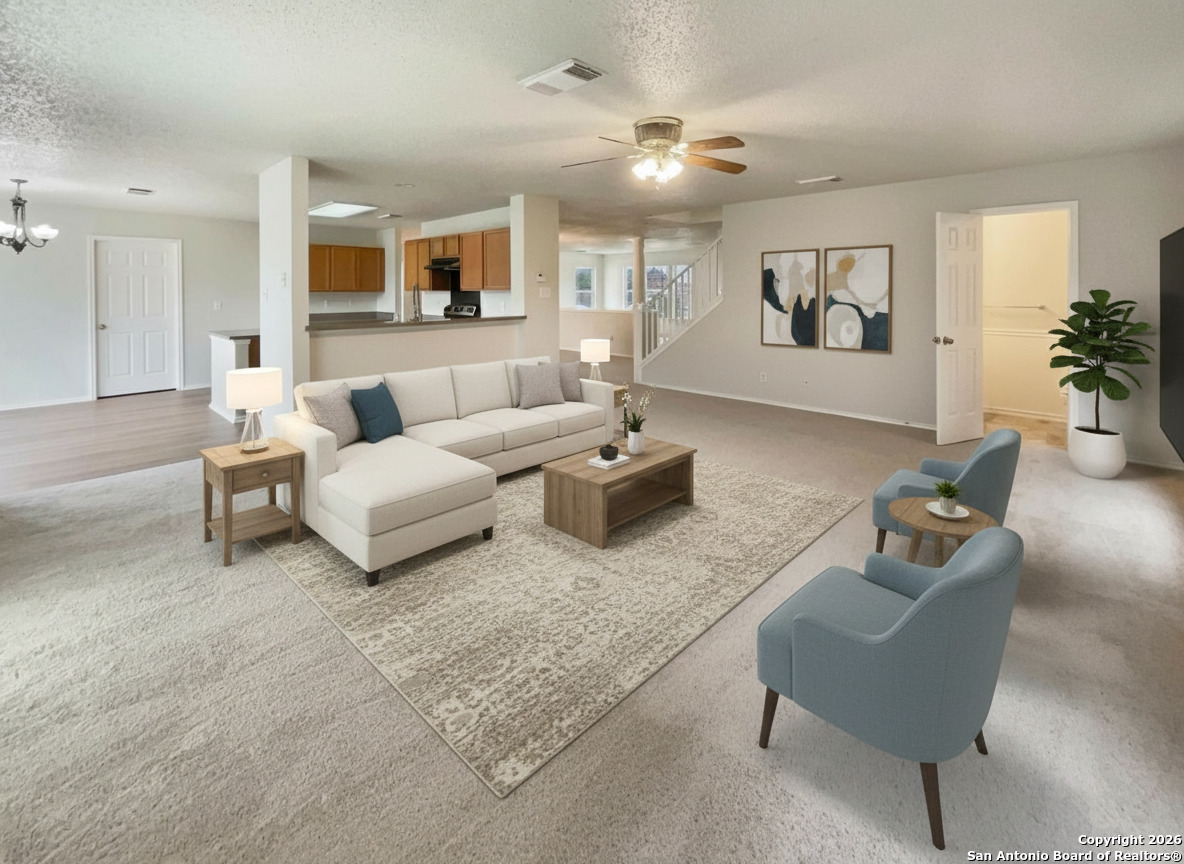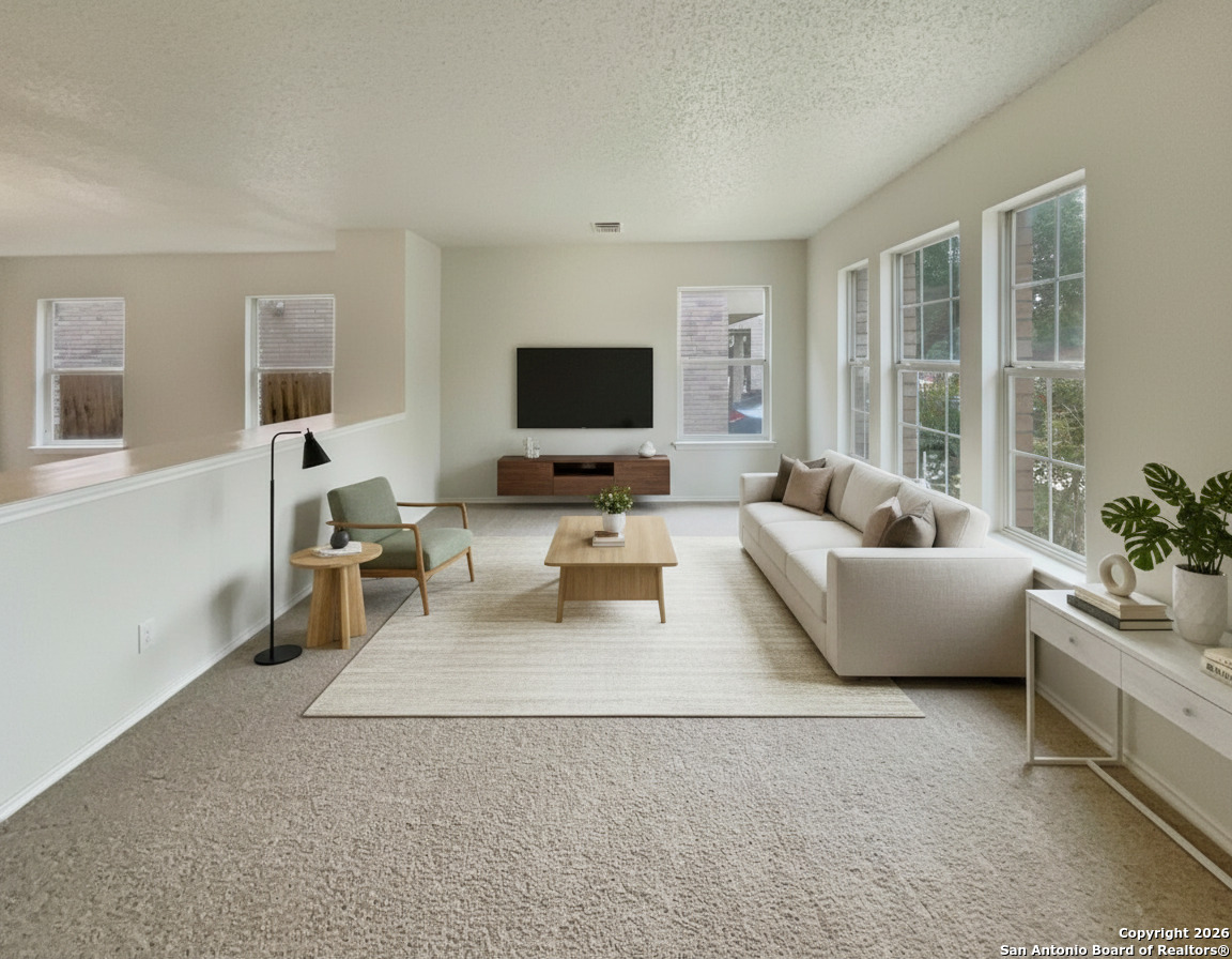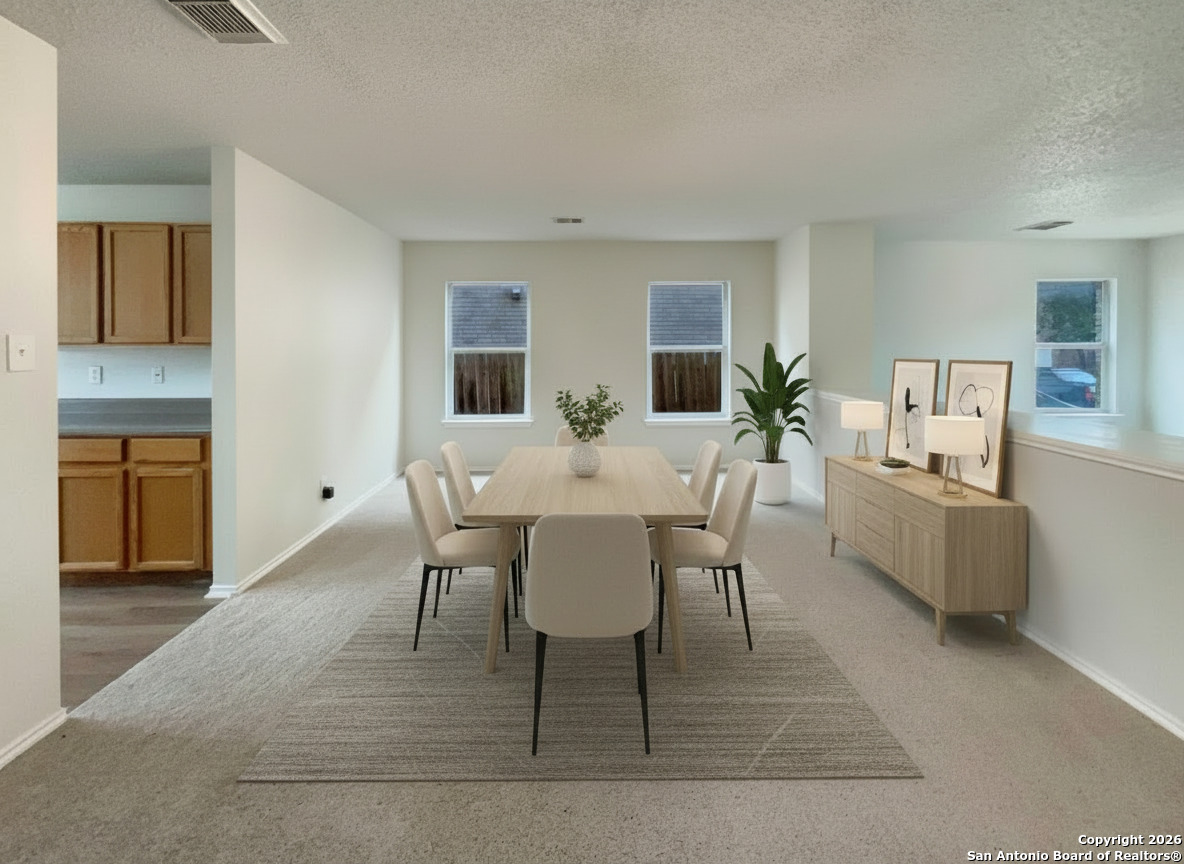 Welcome to 7327 Caddington Drive, a beautifully updated 4-bedroom, 2.5-bath home offering over 3,200 square feet of living space in the desirable Northampton community! This move-in-ready gem boasts fresh interior paint and new flooring throughout (Nov 2025), giving it a clean, modern feel from the moment you walk in. Enjoy three large living areas, including a versatile upstairs loft and a formal dining room perfect for family gatherings or entertaining. The open-concept kitchen flows easily into the main living space, creating an inviting atmosphere filled with natural light. Energy savings come easy with paid-off solar panels, keeping utility costs low year-round. The primary suite features ample space for a sitting area and an en-suite bath with a walk-in shower and soaking tub. All secondary bedrooms are generously sized, offering room for everyone. Outside, you'll find a spacious backyard ready for your personal touch-ideal for outdoor dining, play, or pets. Conveniently located near schools, shopping, and Randolph AFB, this home offers the perfect combination of comfort, efficiency, and space.