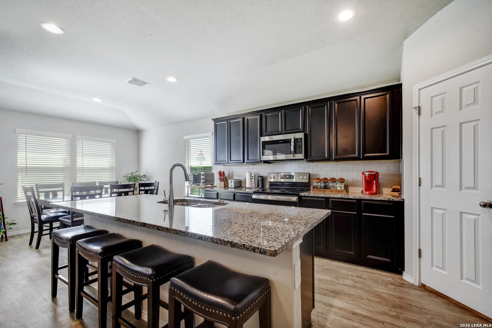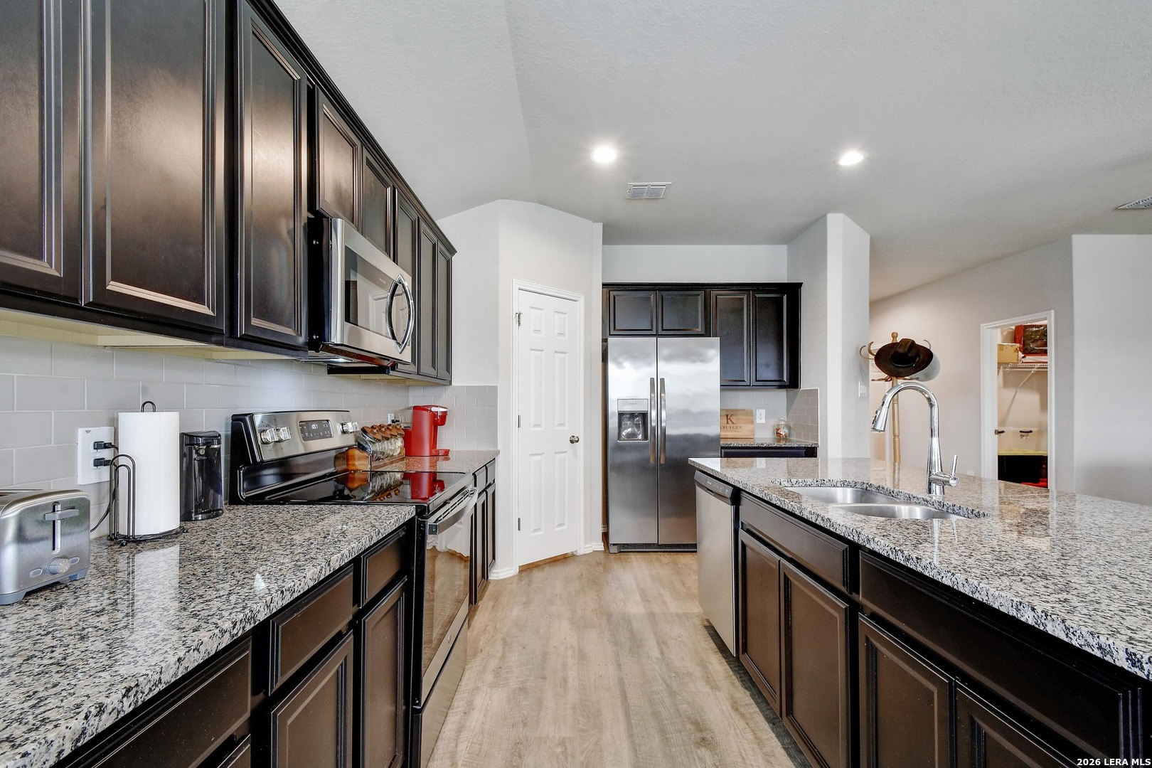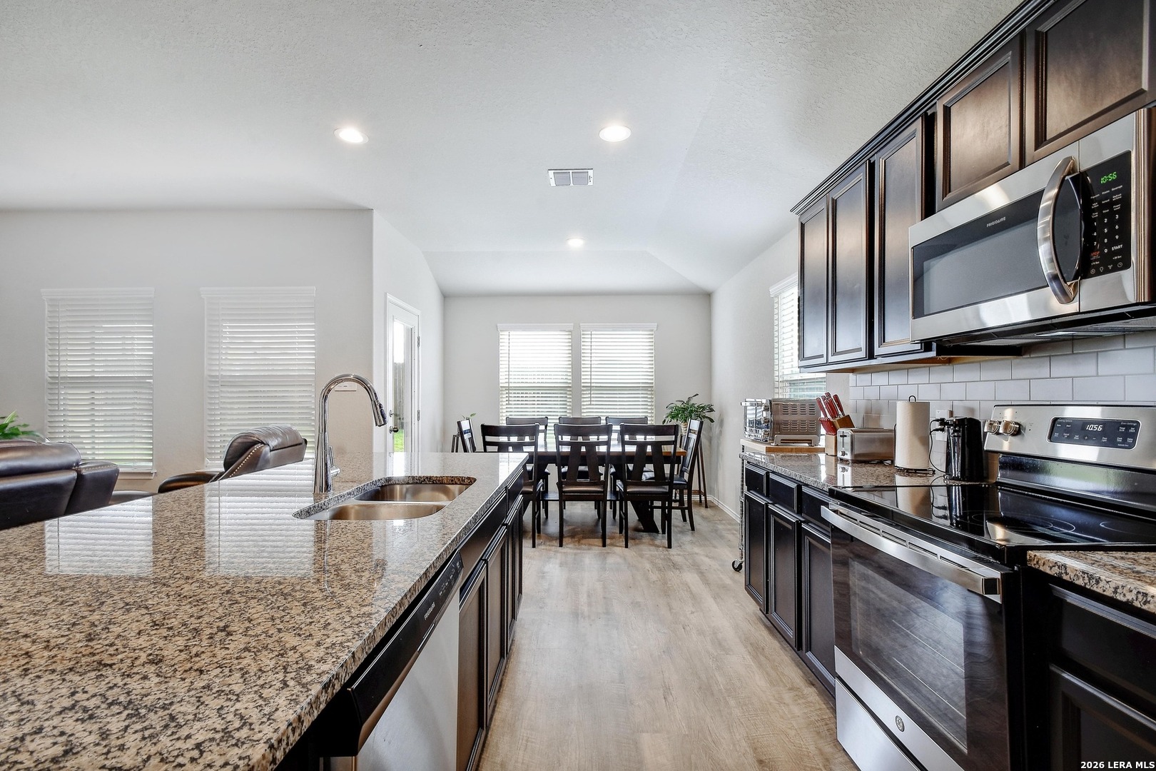 This beautifully maintained home is in pristine condition and features a modern, neutral color palette with an open-concept floor plan that's perfect for entertaining or relaxing. With three spacious bedrooms and two full bathrooms, this layout offers both comfort and privacy. The kitchen is a chef's dream with a large center island, abundant counter space, gorgeous granite countertops, a stylish backsplash, stainless steel appliances, and a walk-in pantry. The guest bedrooms are thoughtfully separated from the primary suite, ensuring privacy for visitors. The primary bedroom includes a luxurious en-suite bath with a double vanity and a large walk-in closet. Additional highlights include a walk-in storage closet in the hallway-ideal for storing holiday decorations, seasonal items, or even converting into a small playroom or hobby space. Enjoy outdoor living in the spacious backyard with a covered patio and a wooden privacy fence-perfect for gatherings or quiet evenings. Located in a well-kept neighborhood with an easy commute to San Antonio, San Marcos, Seguin, and New Braunfels, this home truly has it all!