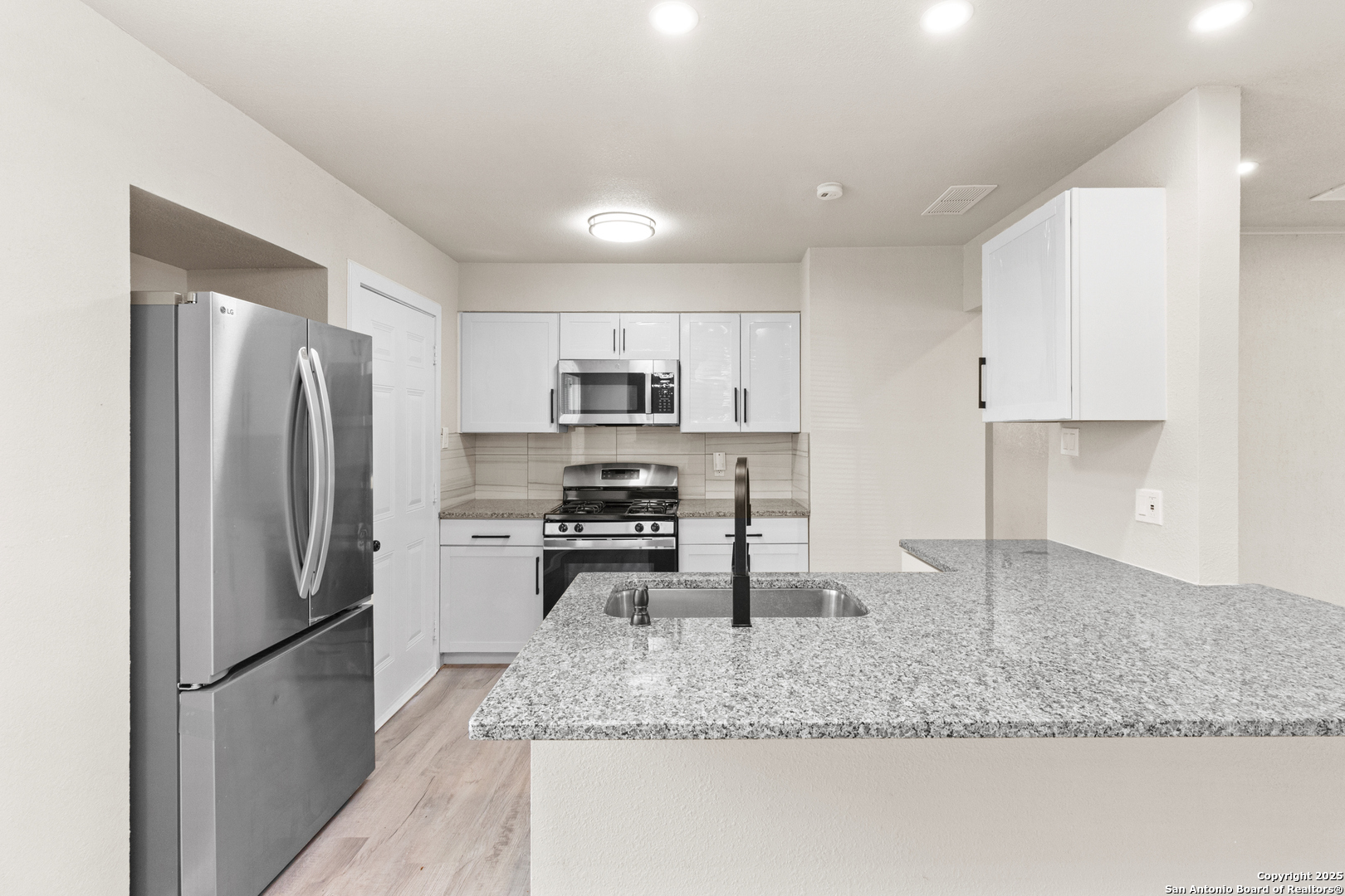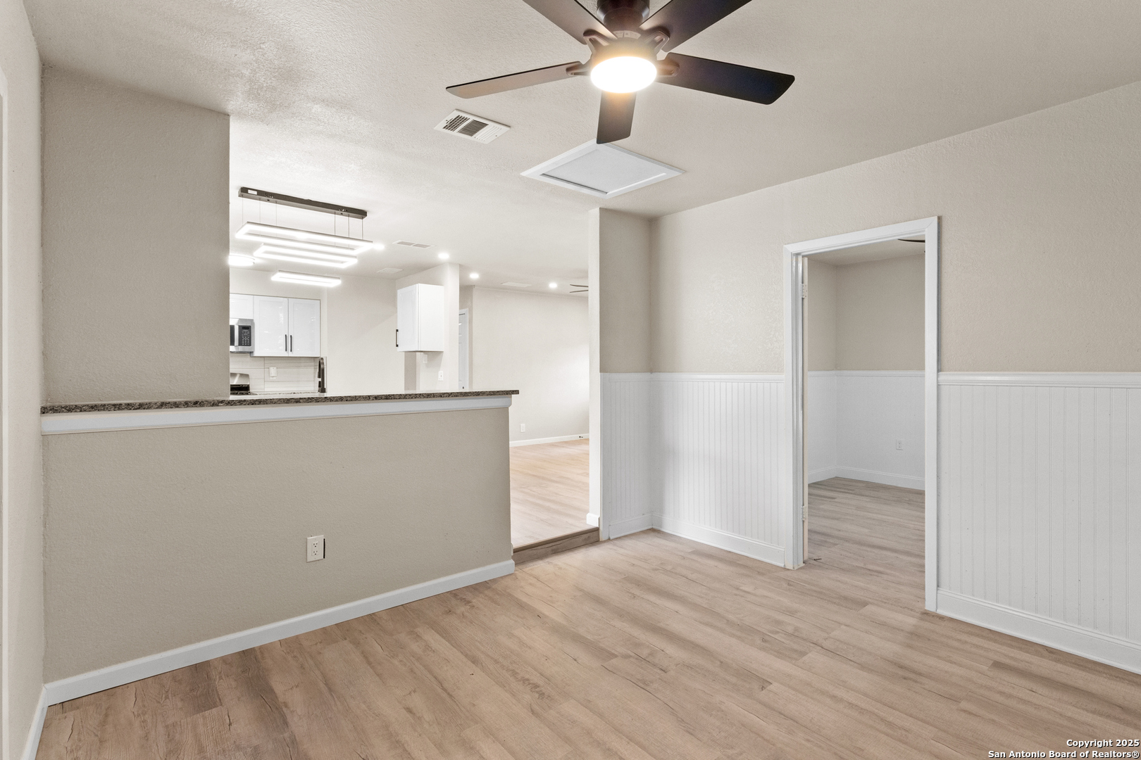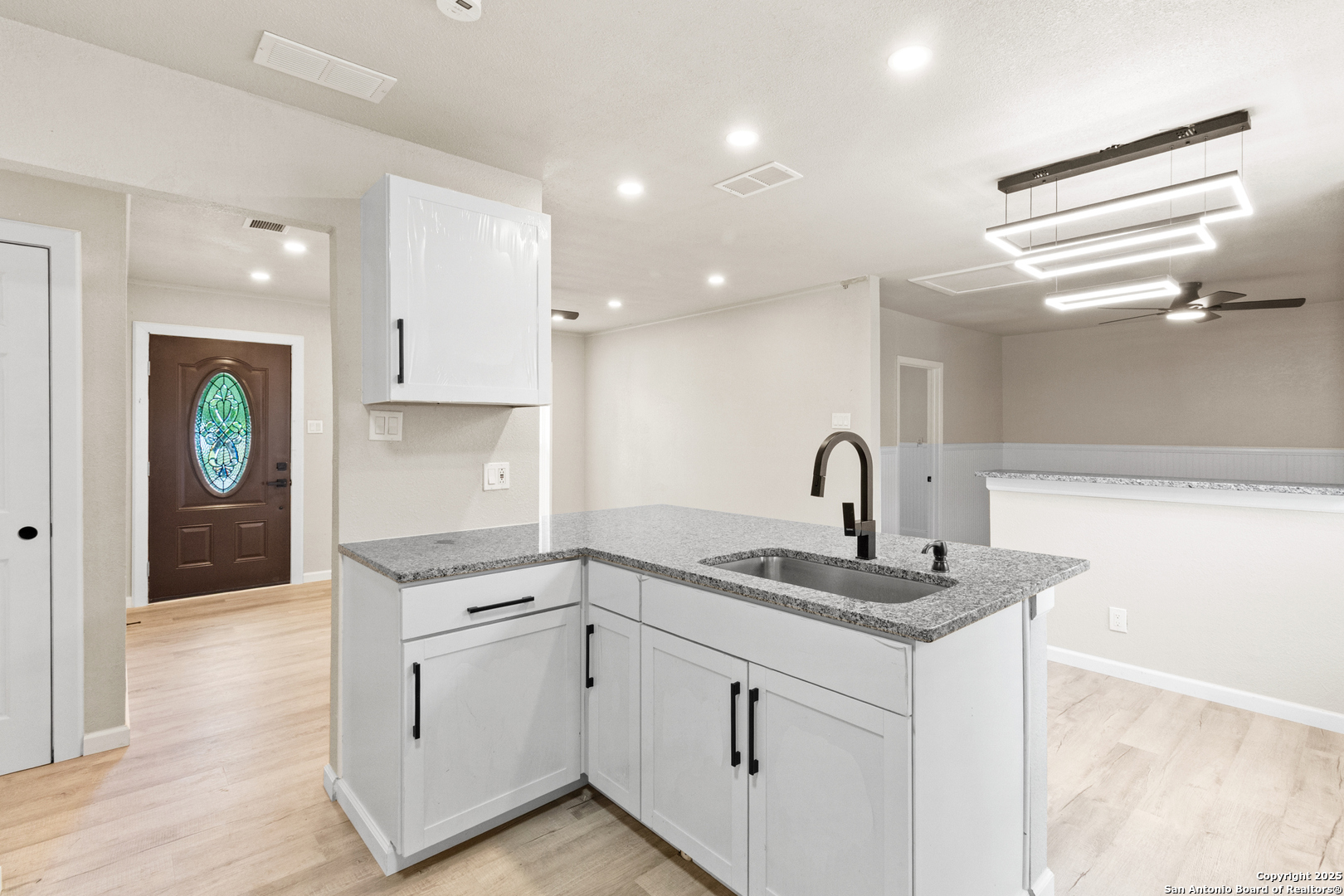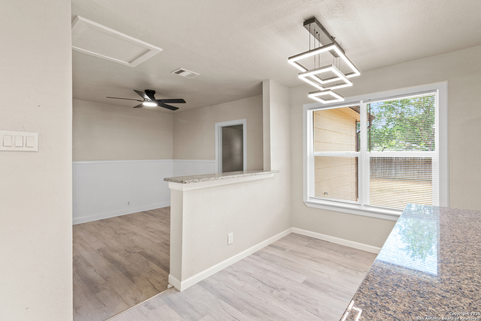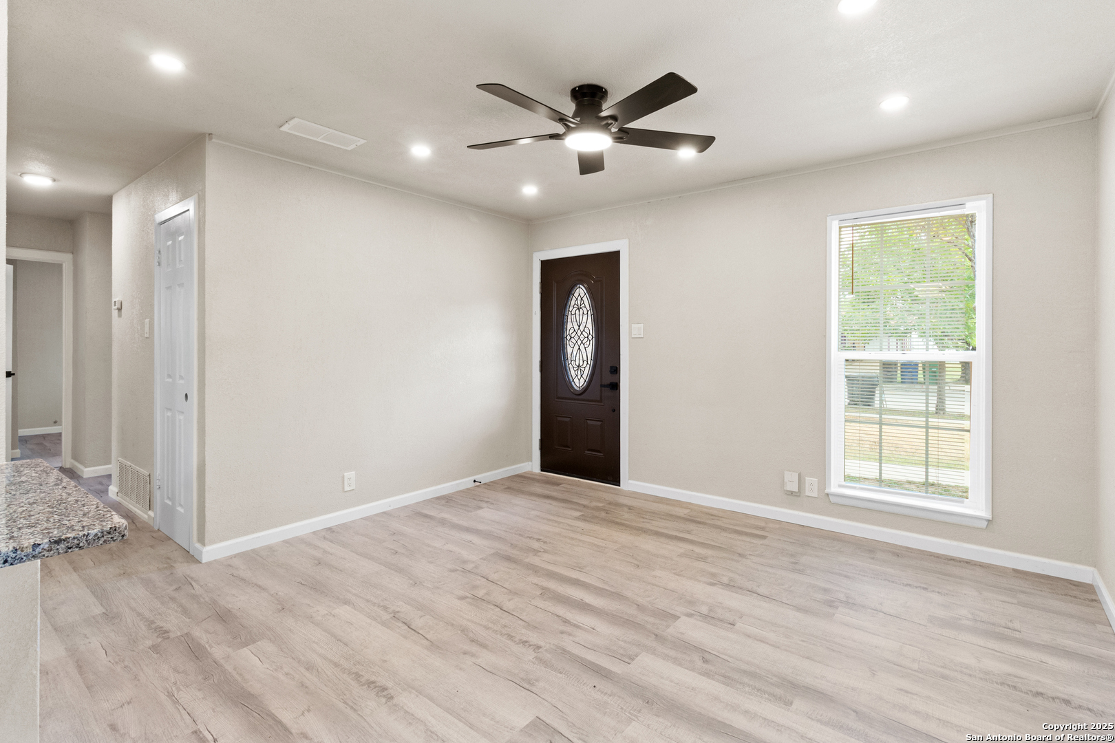Fully Remodeled Gem in the Heart of Northwest San Antonio! Step into this stunning one-story home that has been completely transformed from top to bottom! With brand new paint, brand new kitchen, brand new laminate flooring, and granite countertops - this home truly offers the full makeover experience. No detail was overlooked! You'll love the open floor plan that flows effortlessly from the living area to the sparkling kitchen, perfect for entertaining and everyday living. The oversized utility room gives you the extra space you need, and the garage has been enclosed - offering the flexibility of a spacious game room, media room, or an additional bedroom - increasing your livable square footage. Nestled among mature trees in a well-established neighborhood on the Northwest Side, this home is just minutes from major shopping centers, dining, and entertainment. It's the ideal starter home for any family looking for modern upgrades and unbeatable convenience. Don't miss your chance to own this move-in-ready beauty - where everything is new and all that's missing is you! Buyer to verify square footage due to garage conversion.